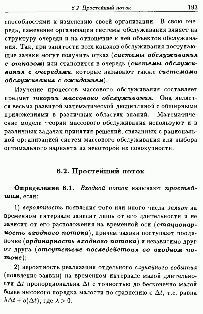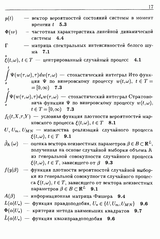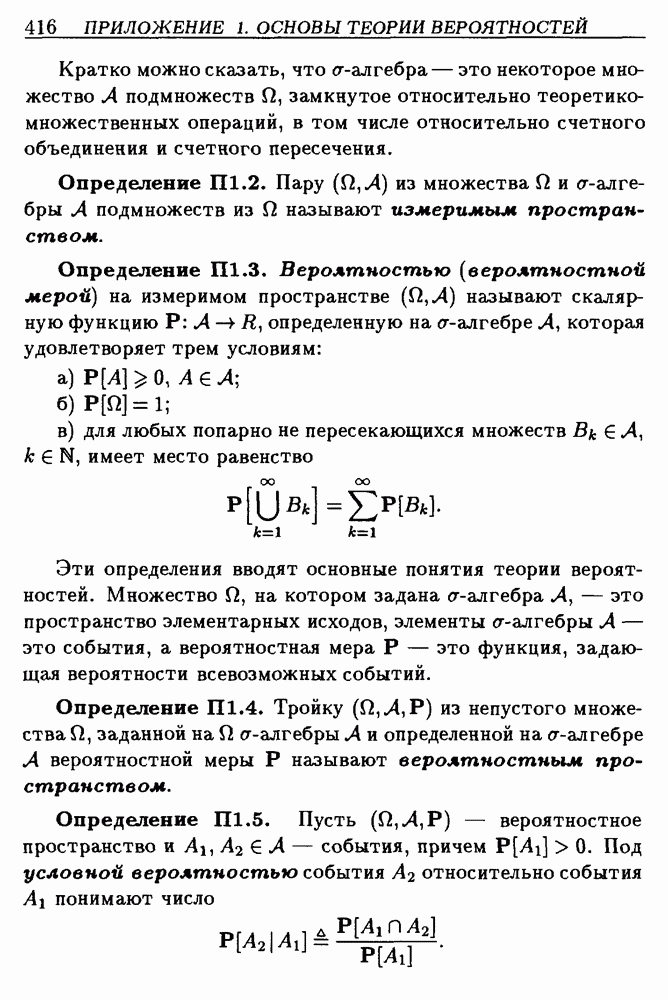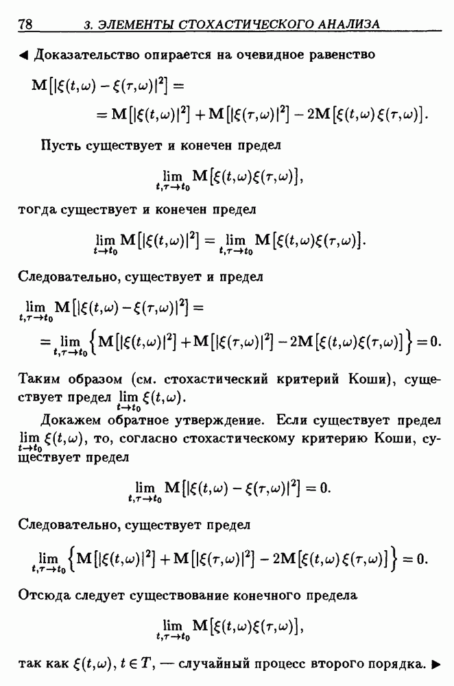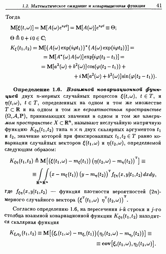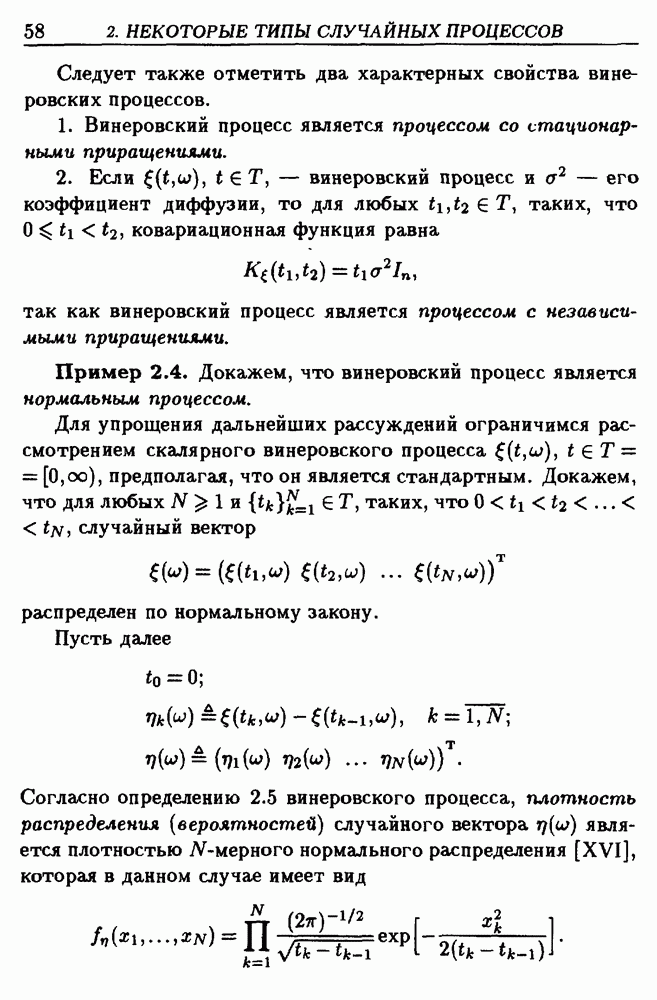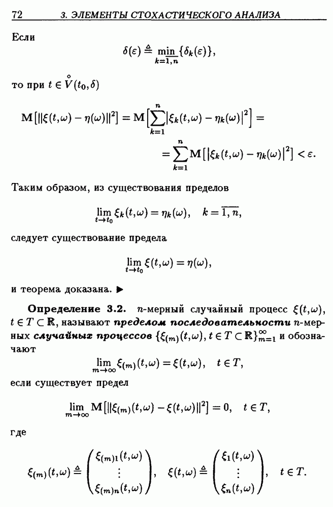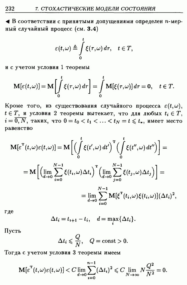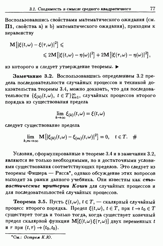 ВВЕДЕНИЕСодержание выпуска относится к одному из специальных курсов высшей математики, который является составной частью теории вероятностей. В процессе развития теории вероятностей как науки можно условно выделить три этапа, первый из которых связан с понятием случайного события, второй — с понятием случайной величины, а третий — с понятием случайной функции. При этом начало первого этапа относится к середине XVII в., второго — к середине XIX в., а третьего — к 20-30 гг. XX в., и начало каждого следующего этапа, в принципе, не связано с завершением предыдущего. Теория случайных процессов возникла вследствие практической необходимости математического моделирования реальных процессов различной природы, состояние каждого из которых в любой фиксированный момент времени представляет собой случайный вектор соответствующей размерности. Примером случайного процесса является процесс изменения во времени пространственных координат частицы, совершающей броуновское движение. Другими примерами случайных процессов являются: процесс стабилизации полета самолета в реальных условиях, когда он находится под постоянным воздействием случайных изменений вектора скорости ветра и других параметров турбулентной атмосферы; процесс развития неоднородной популяции с несколькими типами индивидуумов; процессы спроса и предложения на рынке товаров и т.д. Фактически теория случайных процессов занимается изучением различных семейств случайных величин, эволюционирующих во времени. При этом логически корректное определение основных понятий теории случайных процессов в рамках аксиоматики теории вероятностей создавало и создает много трудностей теоретико-множественного характера. Они связаны, например, с определениями непрерывности, дифференцируемости, интегрируемости и других свойств случайных процессов. Именно поэтому в монографиях по теории случайных процессов значительное место занимает анализ развития теоретикомножественных конструкций. Они написаны на высоком теоретическом уровне и, как правило, сложны для понимания специалистов, занимающихся прикладными проблемами в различных областях человеческой деятельности, решение которых предполагает широкое использование методов теории случайных процессов. А так как литература по прикладным аспектам теории случайных процессов, доступная для понимания широкому кругу студентов, аспирантов и научных работников, имеющих математическую подготовку в объеме стандартного курса высшей математики, весьма немногочисленна, то возникла необходимость в написании этой книги. Основной целью написания предлагаемого учебника явилось систематическое изложение элементов теории случайных процессов, усвоение которых должно способствовать активному овладению ее прикладными методами при решении практических задач. Различный уровень общей математической подготовки читателей и разнообразие их запросов авторы попытались учесть компоновкой материала по разделам с возрастающими уровнями сложности. Все основные понятия и методы иллюстрированы примерами, а в конце каждой главы приведены контрольные вопросы и упражнения. Отметим, что учебник не содержит библиографии по теории случайных процессов и ее приложениям. В списке рекомендуемой литературы указаны лишь те источники, обращение к ко