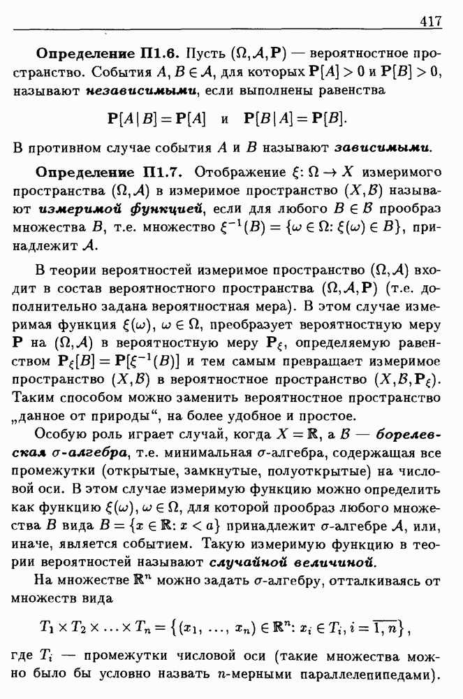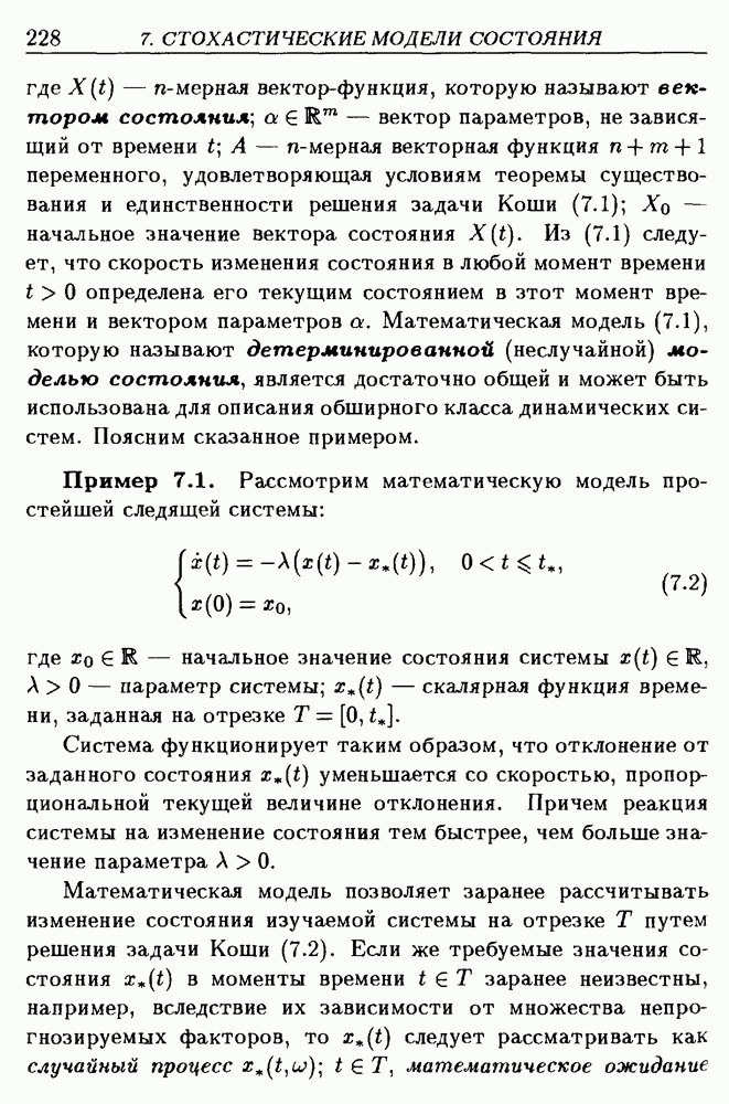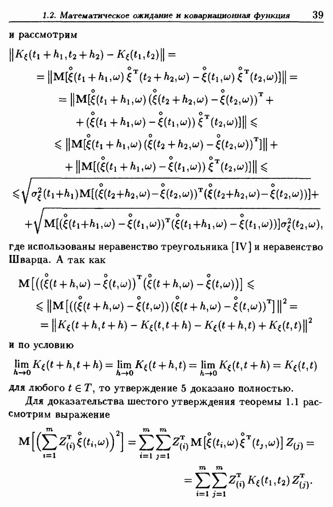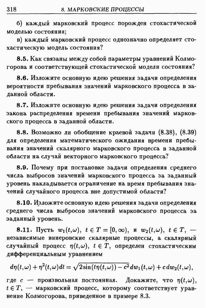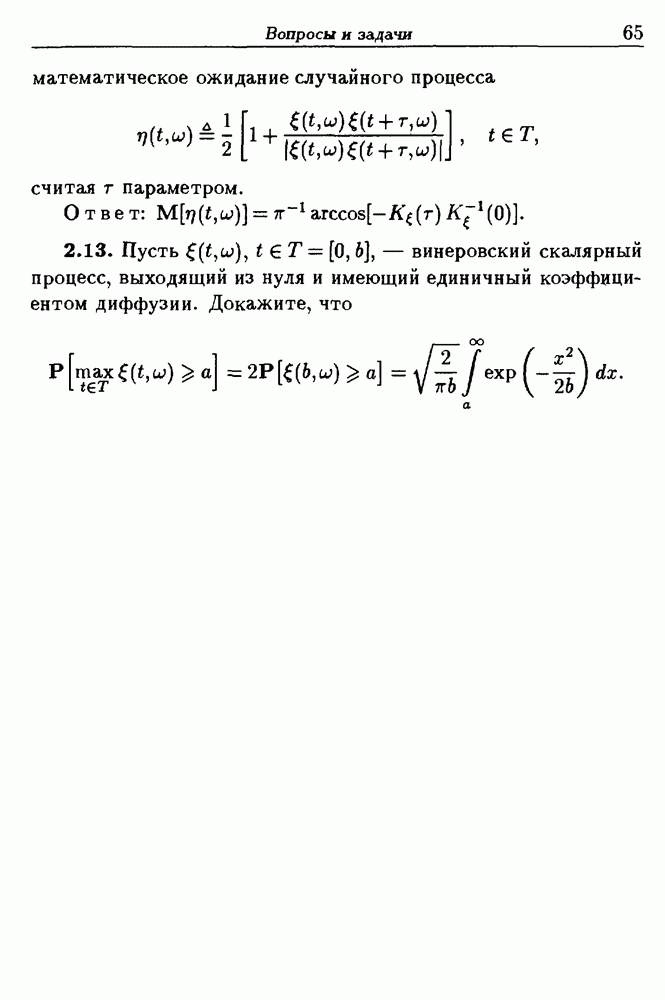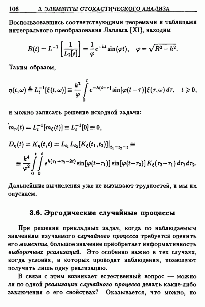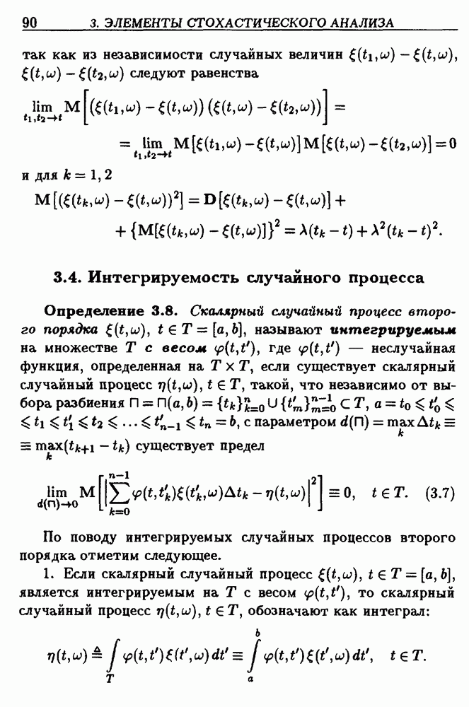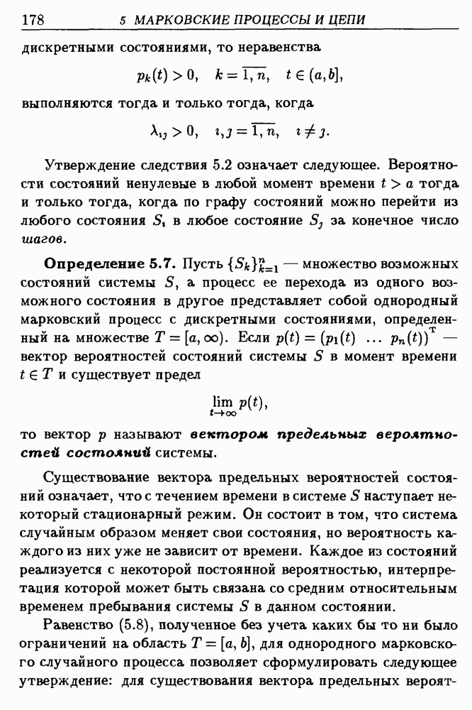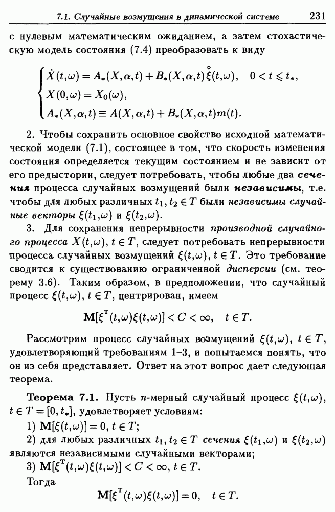 ВВЕДЕНИЕСодержание выпуска относится к одному из специальных курсов высшей математики, который является составной частью теории вероятностей. В процессе развития теории вероятностей как науки можно условно выделить три этапа, первый из которых связан с понятием случайного события, второй — с понятием случайной величины, а третий — с понятием случайной функции. При этом начало первого этапа относится к середине XVII в., второго — к середине XIX в., а третьего — к 20-30 гг. XX в., и начало каждого следующего этапа, в принципе, не связано с завершением предыдущего. Теория случайных процессов возникла вследствие практической необходимости математического моделирования реальных процессов различной природы, состояние каждого из которых в любой фиксированный момент времени представляет собой случайный вектор соответствующей размерности. Примером случайного процесса является процесс изменения во времени пространственных координат частицы, совершающей броуновское движение. Другими примерами случайных процессов являются: процесс стабилизации полета самолета в реальных условиях, когда он находится под постоянным воздействием случайных изменений вектора скорости ветра и других параметров турбулентной атмосферы; процесс развития неоднородной популяции с несколькими типами индивидуумов; процессы спроса и предложения на рынке товаров и т.д. Фактически теория случайных процессов занимается изучением различных семейств случайных величин, эволюционирующих во времени. При этом логически корректное определение основных понятий теории случайных процессов в рамках аксиоматики теории вероятностей создавало и создает много трудностей теоретико-множественного характера. Они связаны, например, с определениями непрерывности, дифференцируемости, интегрируемости и других свойств случайных процессов. Именно поэтому в монографиях по теории случайных процессов значительное место занимает анализ развития теоретикомножественных конструкций. Они написаны на высоком теоретическом уровне и, как правило, сложны для понимания специалистов, занимающихся прикладными проблемами в различных областях человеческой деятельности, решение которых предполагает широкое использование методов теории случайных процессов. А так как литература по прикладным аспектам теории случайных процессов, доступная для понимания широкому кругу студентов, аспирантов и научных работников, имеющих математическую подготовку в объеме стандартного курса высшей математики, весьма немногочисленна, то возникла необходимость в написании этой книги. Основной целью написания предлагаемого учебника явилось систематическое изложение элементов теории случайных процессов, усвоение которых должно способствовать активному овладению ее прикладными методами при решении практических задач. Различный уровень общей математической подготовки читателей и разнообразие их запросов авторы попытались учесть компоновкой материала по разделам с возрастающими уровнями сложности. Все основные понятия и методы иллюстрированы примерами, а в конце каждой главы приведены контрольные вопросы и упражнения. Отметим, что учебник не содержит библиографии по теории случайных процессов и ее приложениям. В списке рекомендуемой литературы указаны лишь те источники, обращение к ко