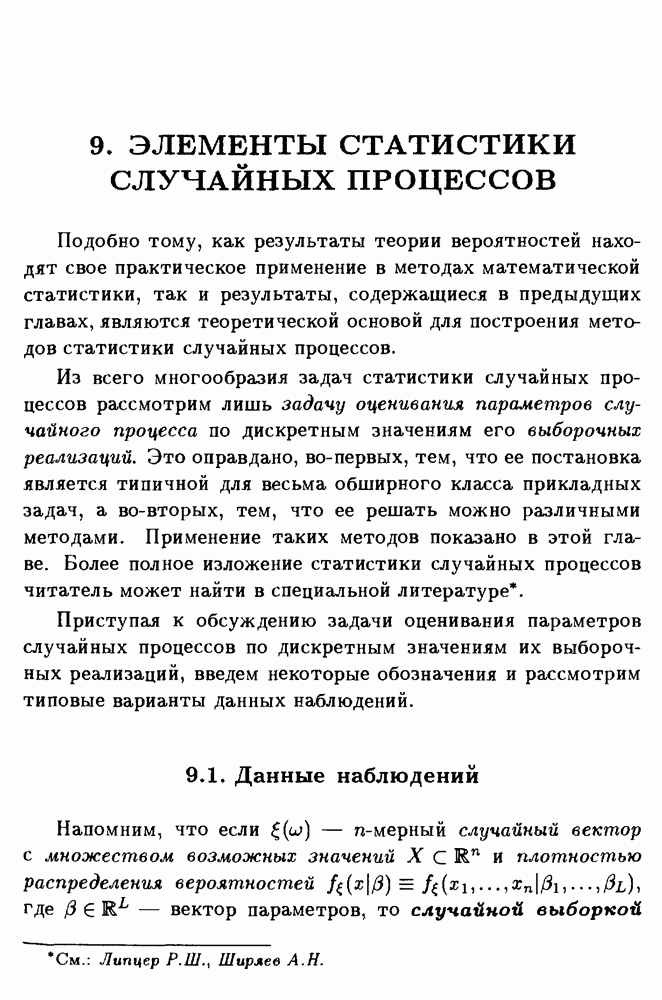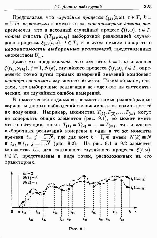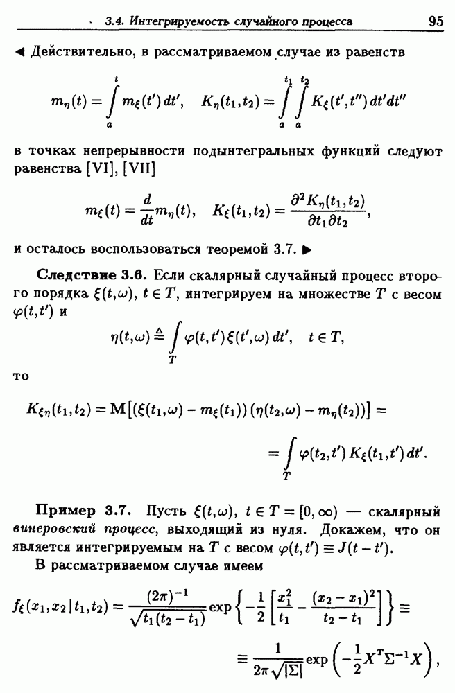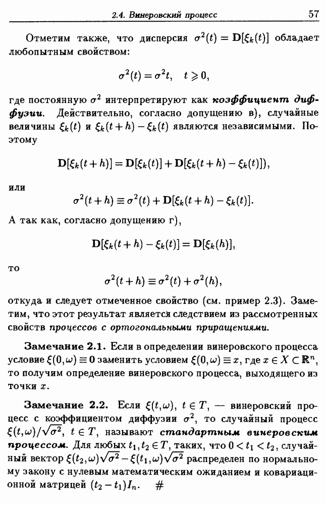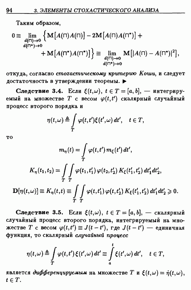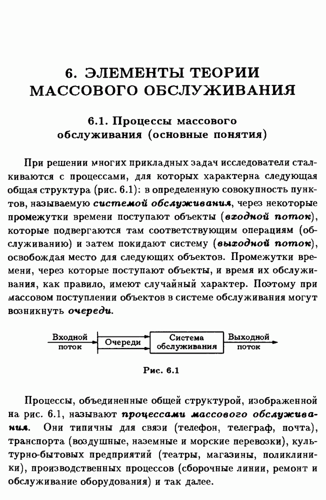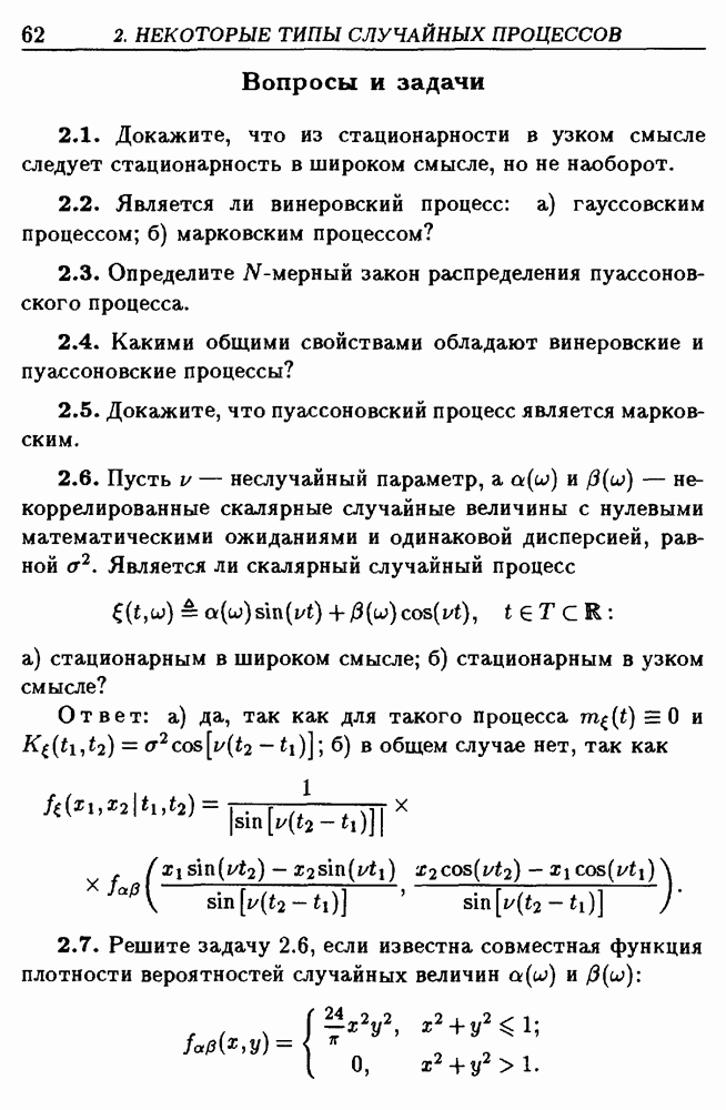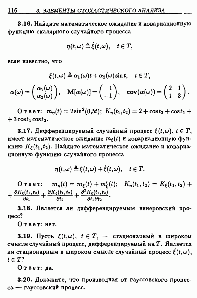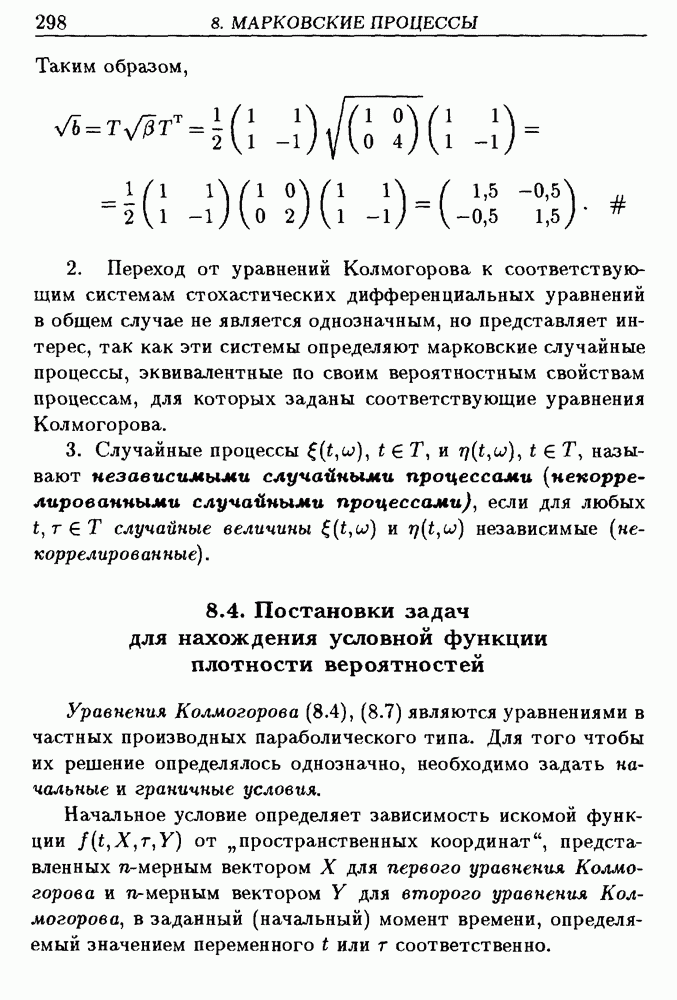 ВВЕДЕНИЕСодержание выпуска относится к одному из специальных курсов высшей математики, который является составной частью теории вероятностей. В процессе развития теории вероятностей как науки можно условно выделить три этапа, первый из которых связан с понятием случайного события, второй — с понятием случайной величины, а третий — с понятием случайной функции. При этом начало первого этапа относится к середине XVII в., второго — к середине XIX в., а третьего — к 20-30 гг. XX в., и начало каждого следующего этапа, в принципе, не связано с завершением предыдущего. Теория случайных процессов возникла вследствие практической необходимости математического моделирования реальных процессов различной природы, состояние каждого из которых в любой фиксированный момент времени представляет собой случайный вектор соответствующей размерности. Примером случайного процесса является процесс изменения во времени пространственных координат частицы, совершающей броуновское движение. Другими примерами случайных процессов являются: процесс стабилизации полета самолета в реальных условиях, когда он находится под постоянным воздействием случайных изменений вектора скорости ветра и других параметров турбулентной атмосферы; процесс развития неоднородной популяции с несколькими типами индивидуумов; процессы спроса и предложения на рынке товаров и т.д. Фактически теория случайных процессов занимается изучением различных семейств случайных величин, эволюционирующих во времени. При этом логически корректное определение основных понятий теории случайных процессов в рамках аксиоматики теории вероятностей создавало и создает много трудностей теоретико-множественного характера. Они связаны, например, с определениями непрерывности, дифференцируемости, интегрируемости и других свойств случайных процессов. Именно поэтому в монографиях по теории случайных процессов значительное место занимает анализ развития теоретикомножественных конструкций. Они написаны на высоком теоретическом уровне и, как правило, сложны для понимания специалистов, занимающихся прикладными проблемами в различных областях человеческой деятельности, решение которых предполагает широкое использование методов теории случайных процессов. А так как литература по прикладным аспектам теории случайных процессов, доступная для понимания широкому кругу студентов, аспирантов и научных работников, имеющих математическую подготовку в объеме стандартного курса высшей математики, весьма немногочисленна, то возникла необходимость в написании этой книги. Основной целью написания предлагаемого учебника явилось систематическое изложение элементов теории случайных процессов, усвоение которых должно способствовать активному овладению ее прикладными методами при решении практических задач. Различный уровень общей математической подготовки читателей и разнообразие их запросов авторы попытались учесть компоновкой материала по разделам с возрастающими уровнями сложности. Все основные понятия и методы иллюстрированы примерами, а в конце каждой главы приведены контрольные вопросы и упражнения. Отметим, что учебник не содержит библиографии по теории случайных процессов и ее приложениям. В списке рекомендуемой литературы указаны лишь те источники, обращение к ко