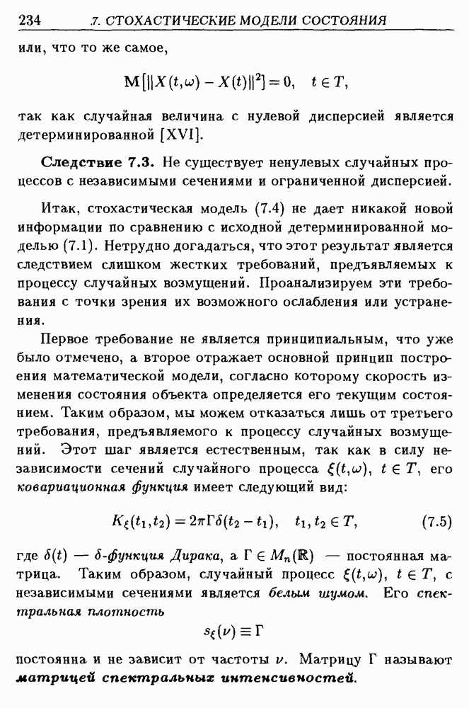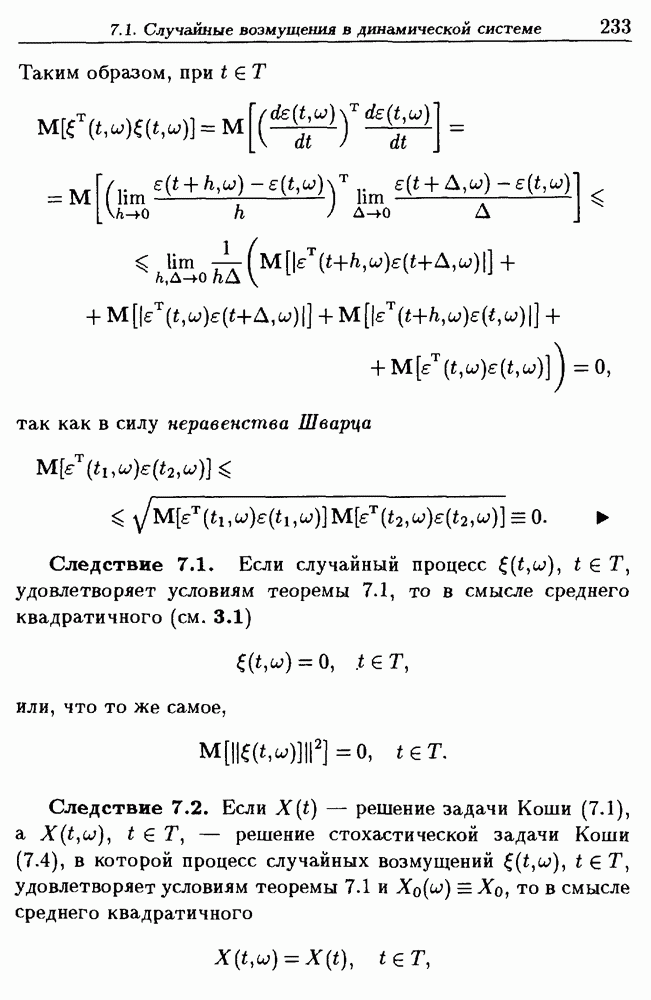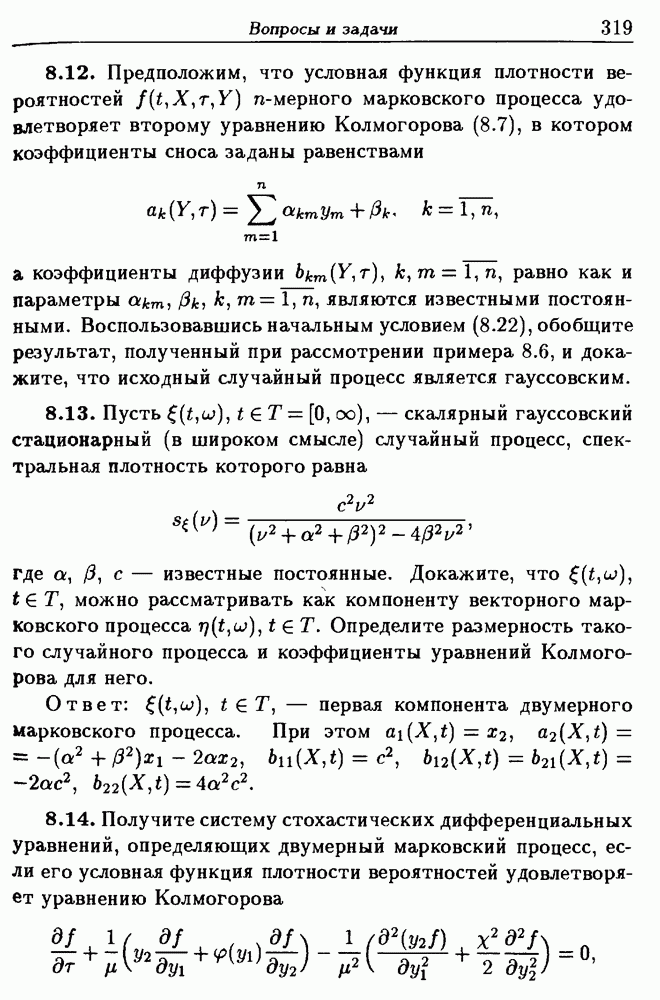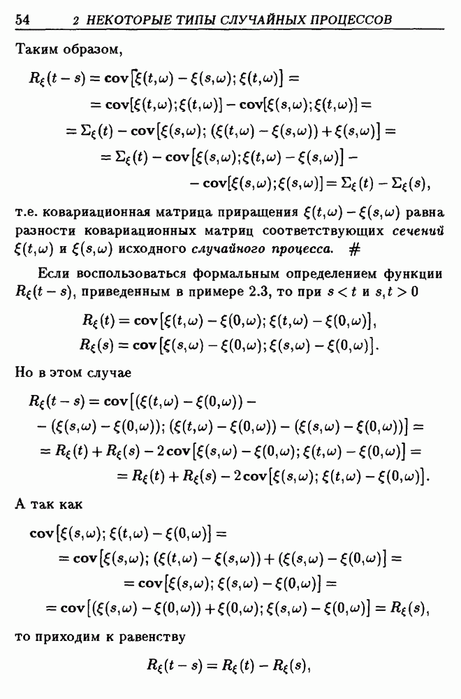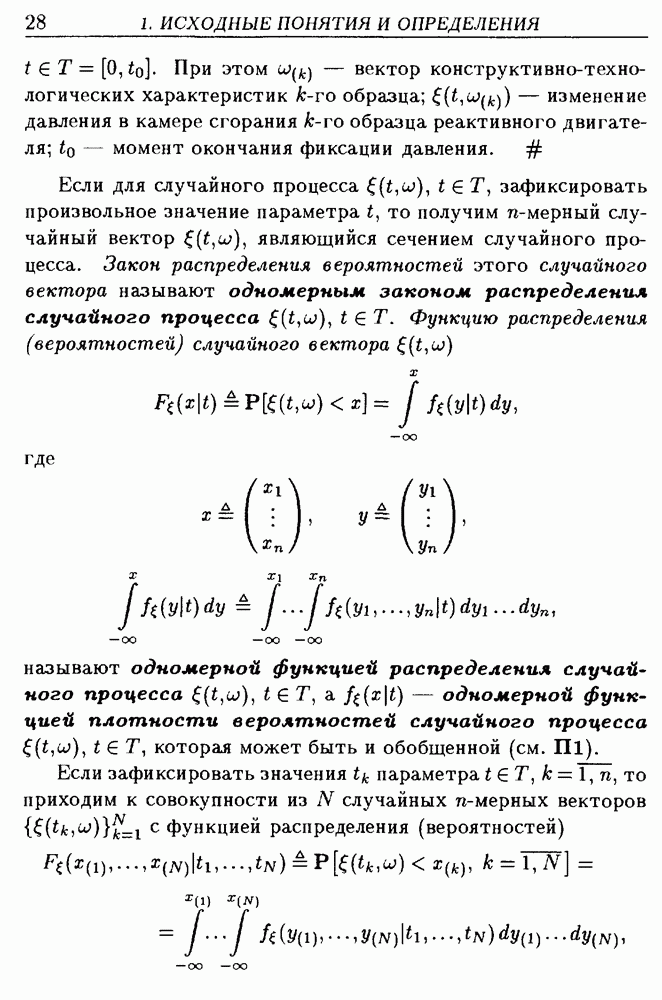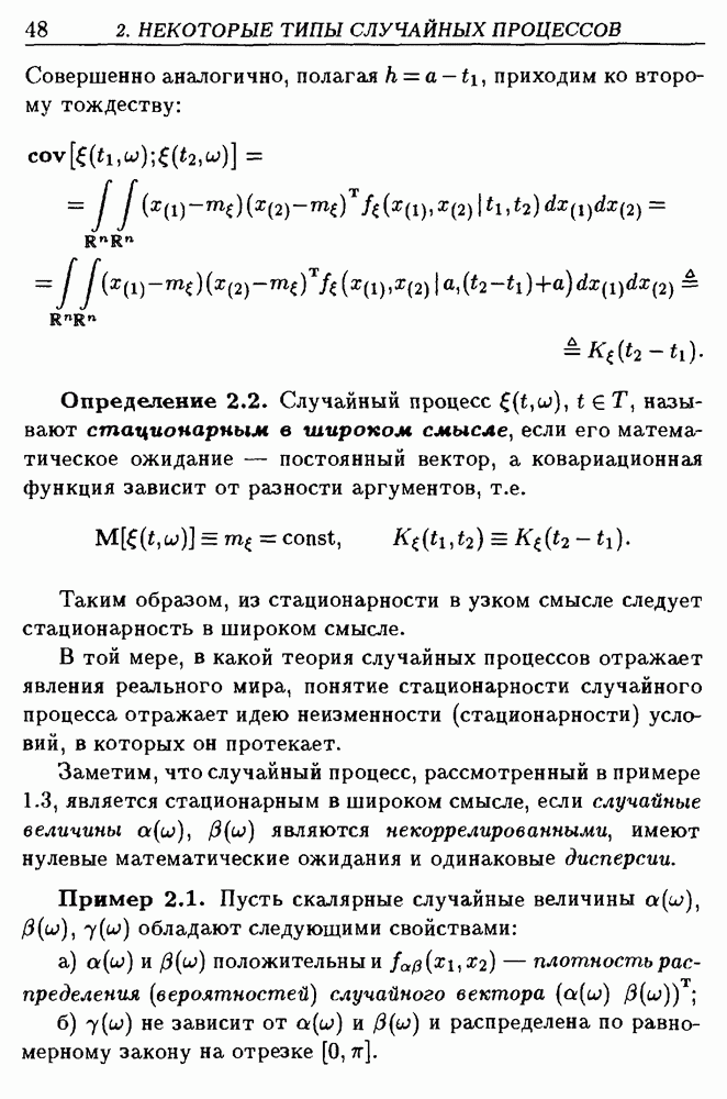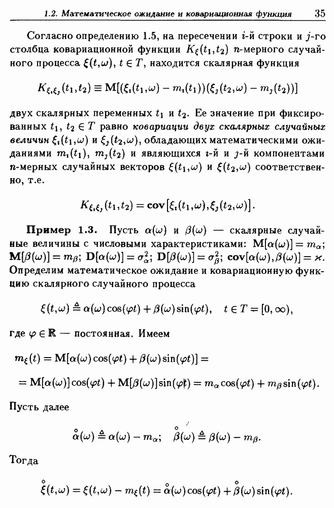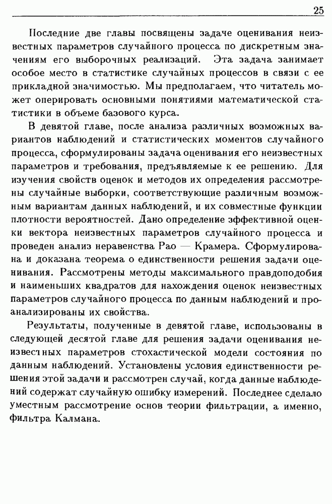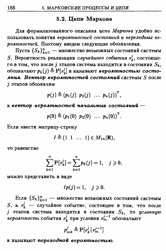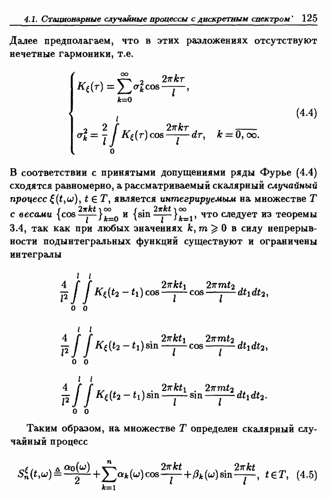 ВВЕДЕНИЕСодержание выпуска относится к одному из специальных курсов высшей математики, который является составной частью теории вероятностей. В процессе развития теории вероятностей как науки можно условно выделить три этапа, первый из которых связан с понятием случайного события, второй — с понятием случайной величины, а третий — с понятием случайной функции. При этом начало первого этапа относится к середине XVII в., второго — к середине XIX в., а третьего — к 20-30 гг. XX в., и начало каждого следующего этапа, в принципе, не связано с завершением предыдущего. Теория случайных процессов возникла вследствие практической необходимости математического моделирования реальных процессов различной природы, состояние каждого из которых в любой фиксированный момент времени представляет собой случайный вектор соответствующей размерности. Примером случайного процесса является процесс изменения во времени пространственных координат частицы, совершающей броуновское движение. Другими примерами случайных процессов являются: процесс стабилизации полета самолета в реальных условиях, когда он находится под постоянным воздействием случайных изменений вектора скорости ветра и других параметров турбулентной атмосферы; процесс развития неоднородной популяции с несколькими типами индивидуумов; процессы спроса и предложения на рынке товаров и т.д. Фактически теория случайных процессов занимается изучением различных семейств случайных величин, эволюционирующих во времени. При этом логически корректное определение основных понятий теории случайных процессов в рамках аксиоматики теории вероятностей создавало и создает много трудностей теоретико-множественного характера. Они связаны, например, с определениями непрерывности, дифференцируемости, интегрируемости и других свойств случайных процессов. Именно поэтому в монографиях по теории случайных процессов значительное место занимает анализ развития теоретикомножественных конструкций. Они написаны на высоком теоретическом уровне и, как правило, сложны для понимания специалистов, занимающихся прикладными проблемами в различных областях человеческой деятельности, решение которых предполагает широкое использование методов теории случайных процессов. А так как литература по прикладным аспектам теории случайных процессов, доступная для понимания широкому кругу студентов, аспирантов и научных работников, имеющих математическую подготовку в объеме стандартного курса высшей математики, весьма немногочисленна, то возникла необходимость в написании этой книги. Основной целью написания предлагаемого учебника явилось систематическое изложение элементов теории случайных процессов, усвоение которых должно способствовать активному овладению ее прикладными методами при решении практических задач. Различный уровень общей математической подготовки читателей и разнообразие их запросов авторы попытались учесть компоновкой материала по разделам с возрастающими уровнями сложности. Все основные понятия и методы иллюстрированы примерами, а в конце каждой главы приведены контрольные вопросы и упражнения. Отметим, что учебник не содержит библиографии по теории случайных процессов и ее приложениям. В списке рекомендуемой литературы указаны лишь те источники, обращение к ко