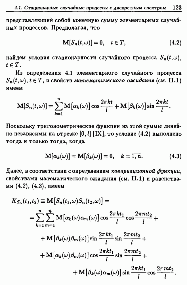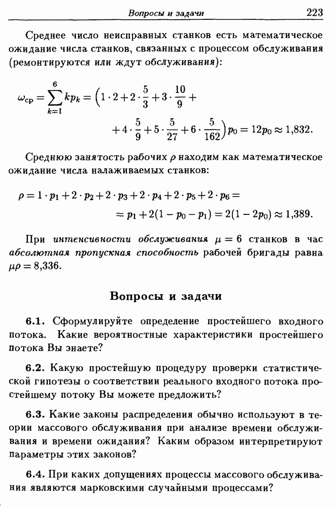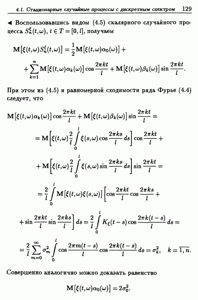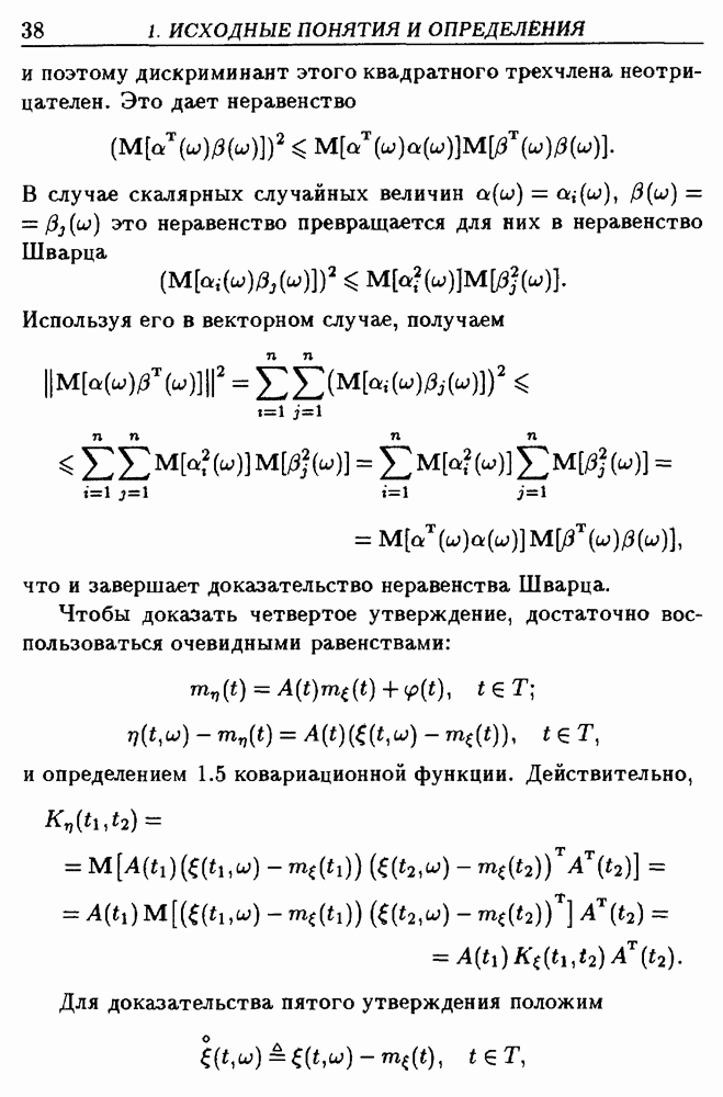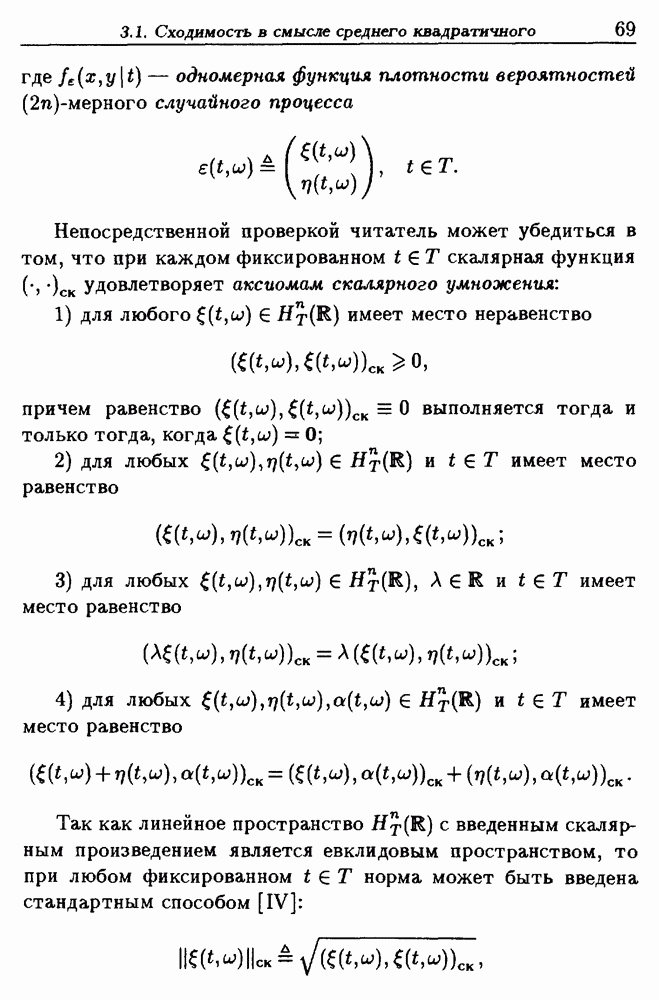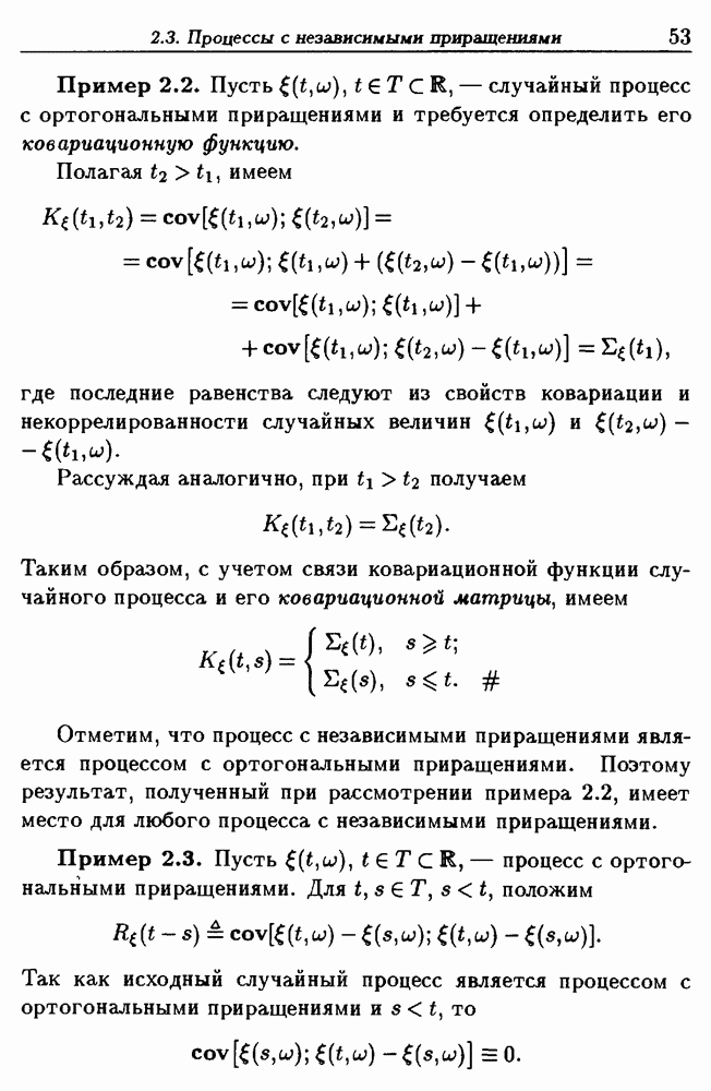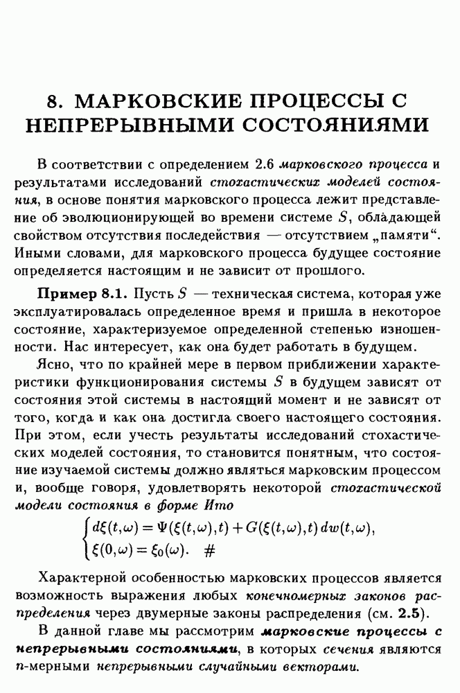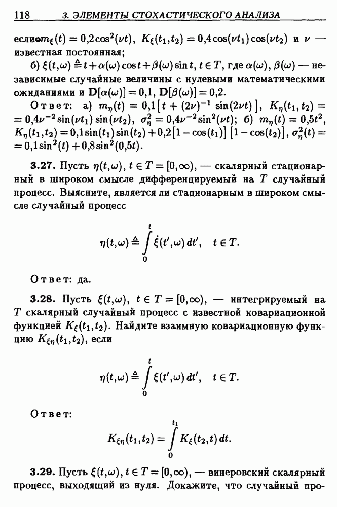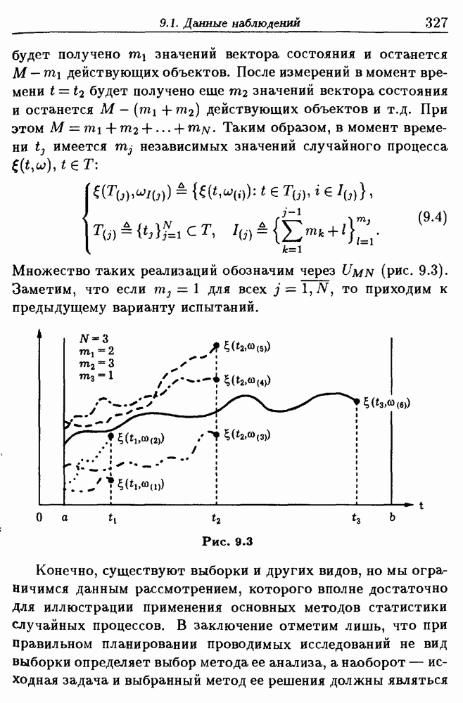 ВВЕДЕНИЕСодержание выпуска относится к одному из специальных курсов высшей математики, который является составной частью теории вероятностей. В процессе развития теории вероятностей как науки можно условно выделить три этапа, первый из которых связан с понятием случайного события, второй — с понятием случайной величины, а третий — с понятием случайной функции. При этом начало первого этапа относится к середине XVII в., второго — к середине XIX в., а третьего — к 20-30 гг. XX в., и начало каждого следующего этапа, в принципе, не связано с завершением предыдущего. Теория случайных процессов возникла вследствие практической необходимости математического моделирования реальных процессов различной природы, состояние каждого из которых в любой фиксированный момент времени представляет собой случайный вектор соответствующей размерности. Примером случайного процесса является процесс изменения во времени пространственных координат частицы, совершающей броуновское движение. Другими примерами случайных процессов являются: процесс стабилизации полета самолета в реальных условиях, когда он находится под постоянным воздействием случайных изменений вектора скорости ветра и других параметров турбулентной атмосферы; процесс развития неоднородной популяции с несколькими типами индивидуумов; процессы спроса и предложения на рынке товаров и т.д. Фактически теория случайных процессов занимается изучением различных семейств случайных величин, эволюционирующих во времени. При этом логически корректное определение основных понятий теории случайных процессов в рамках аксиоматики теории вероятностей создавало и создает много трудностей теоретико-множественного характера. Они связаны, например, с определениями непрерывности, дифференцируемости, интегрируемости и других свойств случайных процессов. Именно поэтому в монографиях по теории случайных процессов значительное место занимает анализ развития теоретикомножественных конструкций. Они написаны на высоком теоретическом уровне и, как правило, сложны для понимания специалистов, занимающихся прикладными проблемами в различных областях человеческой деятельности, решение которых предполагает широкое использование методов теории случайных процессов. А так как литература по прикладным аспектам теории случайных процессов, доступная для понимания широкому кругу студентов, аспирантов и научных работников, имеющих математическую подготовку в объеме стандартного курса высшей математики, весьма немногочисленна, то возникла необходимость в написании этой книги. Основной целью написания предлагаемого учебника явилось систематическое изложение элементов теории случайных процессов, усвоение которых должно способствовать активному овладению ее прикладными методами при решении практических задач. Различный уровень общей математической подготовки читателей и разнообразие их запросов авторы попытались учесть компоновкой материала по разделам с возрастающими уровнями сложности. Все основные понятия и методы иллюстрированы примерами, а в конце каждой главы приведены контрольные вопросы и упражнения. Отметим, что учебник не содержит библиографии по теории случайных процессов и ее приложениям. В списке рекомендуемой литературы указаны лишь те источники, обращение к ко