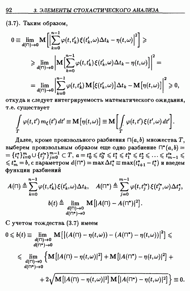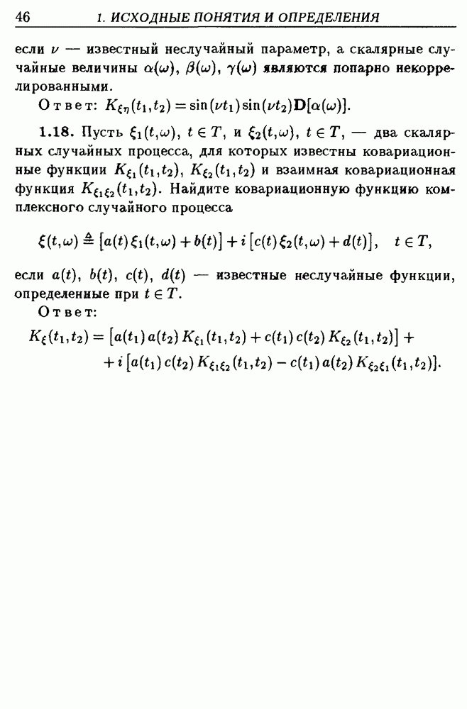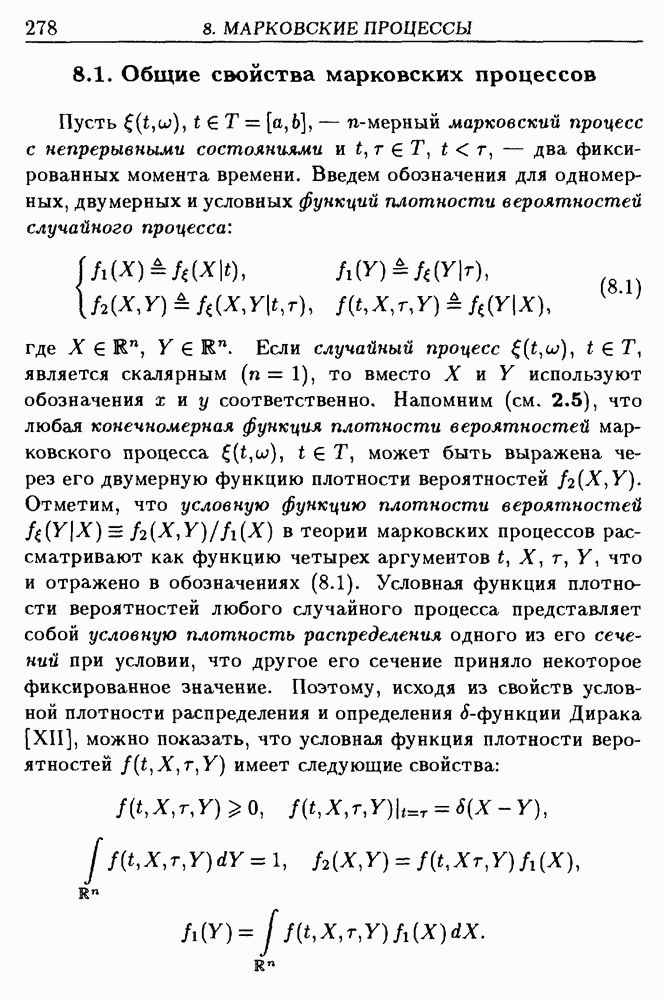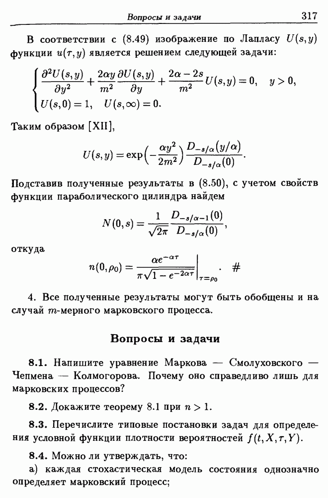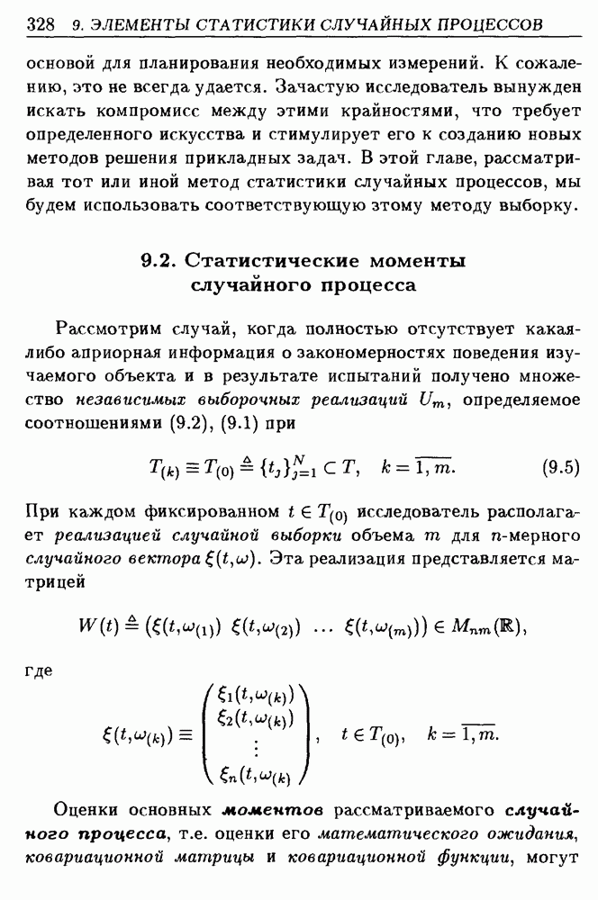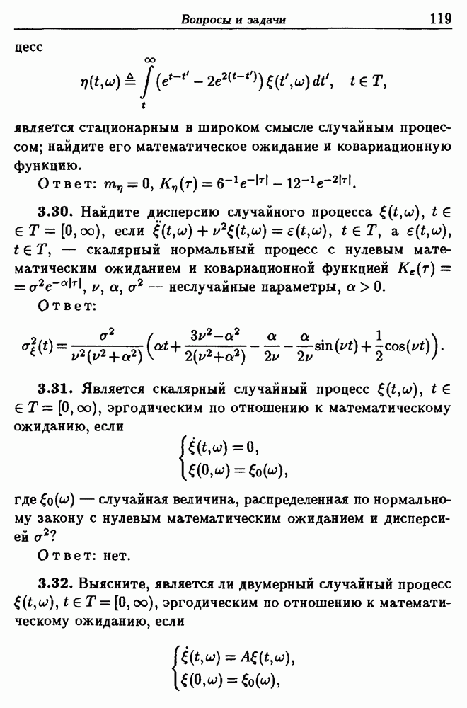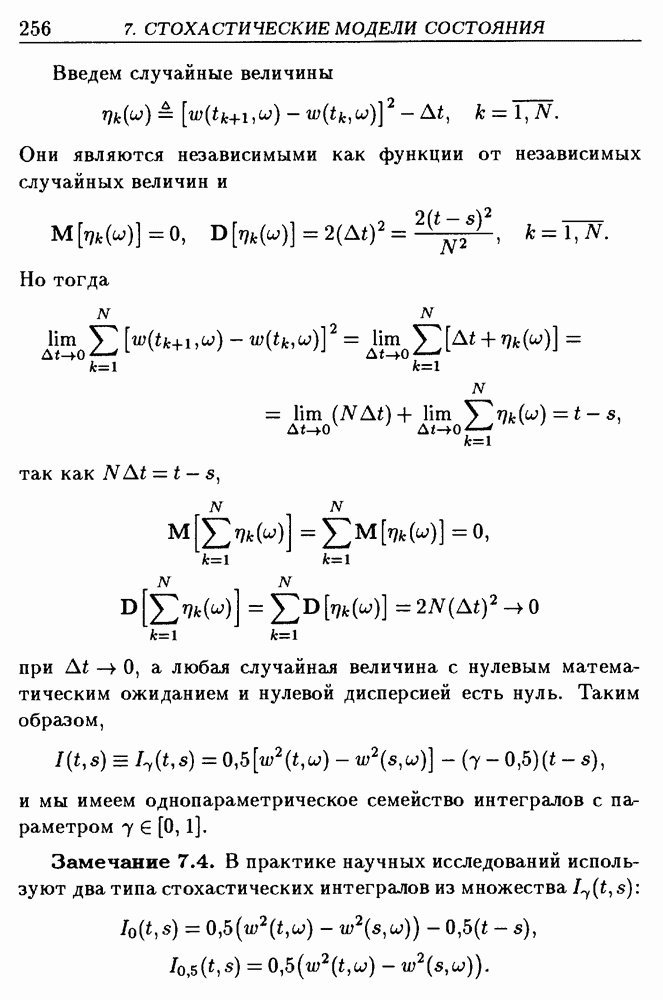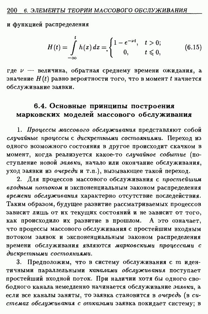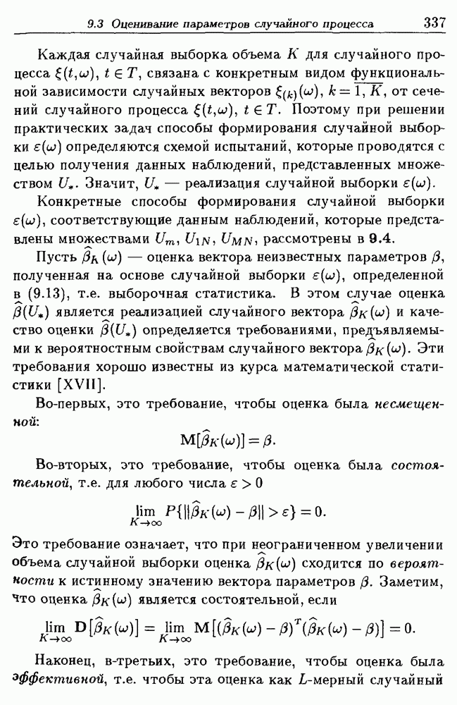 ВВЕДЕНИЕСодержание выпуска относится к одному из специальных курсов высшей математики, который является составной частью теории вероятностей. В процессе развития теории вероятностей как науки можно условно выделить три этапа, первый из которых связан с понятием случайного события, второй — с понятием случайной величины, а третий — с понятием случайной функции. При этом начало первого этапа относится к середине XVII в., второго — к середине XIX в., а третьего — к 20-30 гг. XX в., и начало каждого следующего этапа, в принципе, не связано с завершением предыдущего. Теория случайных процессов возникла вследствие практической необходимости математического моделирования реальных процессов различной природы, состояние каждого из которых в любой фиксированный момент времени представляет собой случайный вектор соответствующей размерности. Примером случайного процесса является процесс изменения во времени пространственных координат частицы, совершающей броуновское движение. Другими примерами случайных процессов являются: процесс стабилизации полета самолета в реальных условиях, когда он находится под постоянным воздействием случайных изменений вектора скорости ветра и других параметров турбулентной атмосферы; процесс развития неоднородной популяции с несколькими типами индивидуумов; процессы спроса и предложения на рынке товаров и т.д. Фактически теория случайных процессов занимается изучением различных семейств случайных величин, эволюционирующих во времени. При этом логически корректное определение основных понятий теории случайных процессов в рамках аксиоматики теории вероятностей создавало и создает много трудностей теоретико-множественного характера. Они связаны, например, с определениями непрерывности, дифференцируемости, интегрируемости и других свойств случайных процессов. Именно поэтому в монографиях по теории случайных процессов значительное место занимает анализ развития теоретикомножественных конструкций. Они написаны на высоком теоретическом уровне и, как правило, сложны для понимания специалистов, занимающихся прикладными проблемами в различных областях человеческой деятельности, решение которых предполагает широкое использование методов теории случайных процессов. А так как литература по прикладным аспектам теории случайных процессов, доступная для понимания широкому кругу студентов, аспирантов и научных работников, имеющих математическую подготовку в объеме стандартного курса высшей математики, весьма немногочисленна, то возникла необходимость в написании этой книги. Основной целью написания предлагаемого учебника явилось систематическое изложение элементов теории случайных процессов, усвоение которых должно способствовать активному овладению ее прикладными методами при решении практических задач. Различный уровень общей математической подготовки читателей и разнообразие их запросов авторы попытались учесть компоновкой материала по разделам с возрастающими уровнями сложности. Все основные понятия и методы иллюстрированы примерами, а в конце каждой главы приведены контрольные вопросы и упражнения. Отметим, что учебник не содержит библиографии по теории случайных процессов и ее приложениям. В списке рекомендуемой литературы указаны лишь те источники, обращение к ко