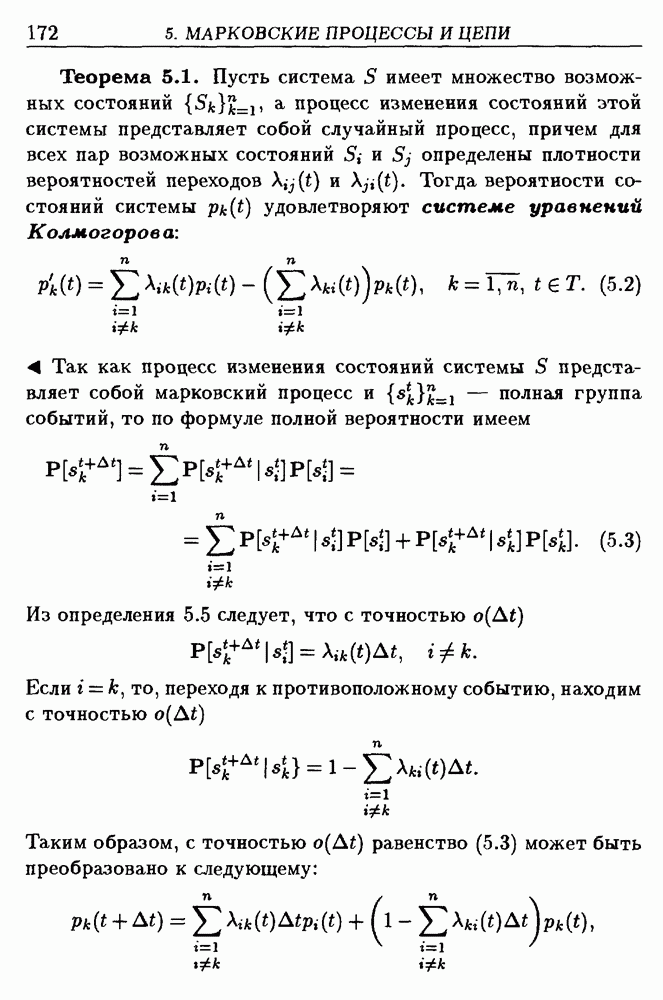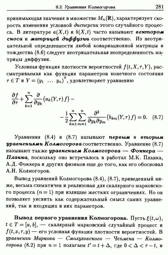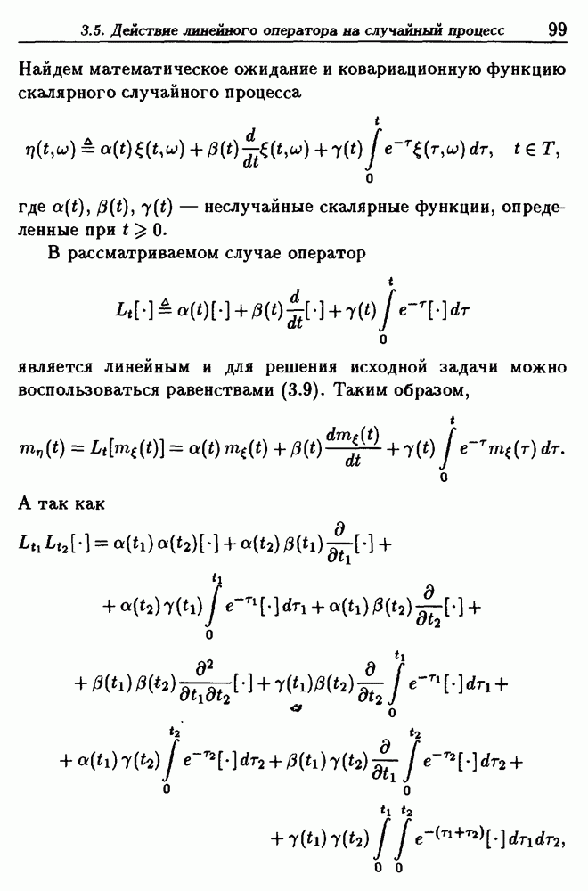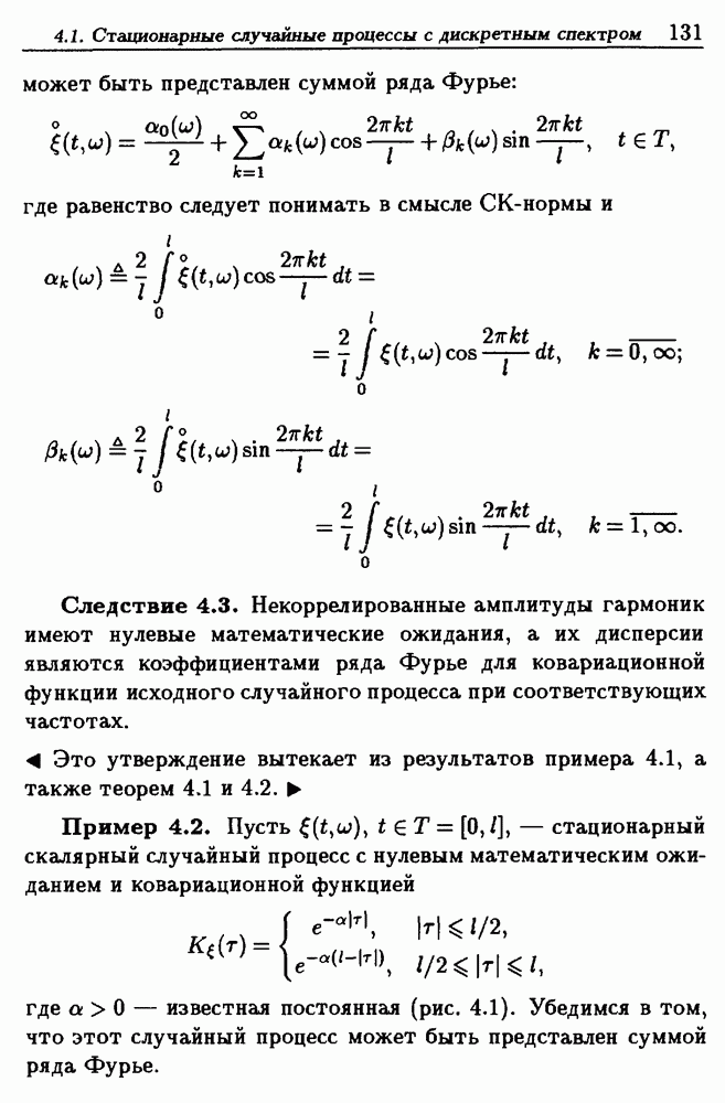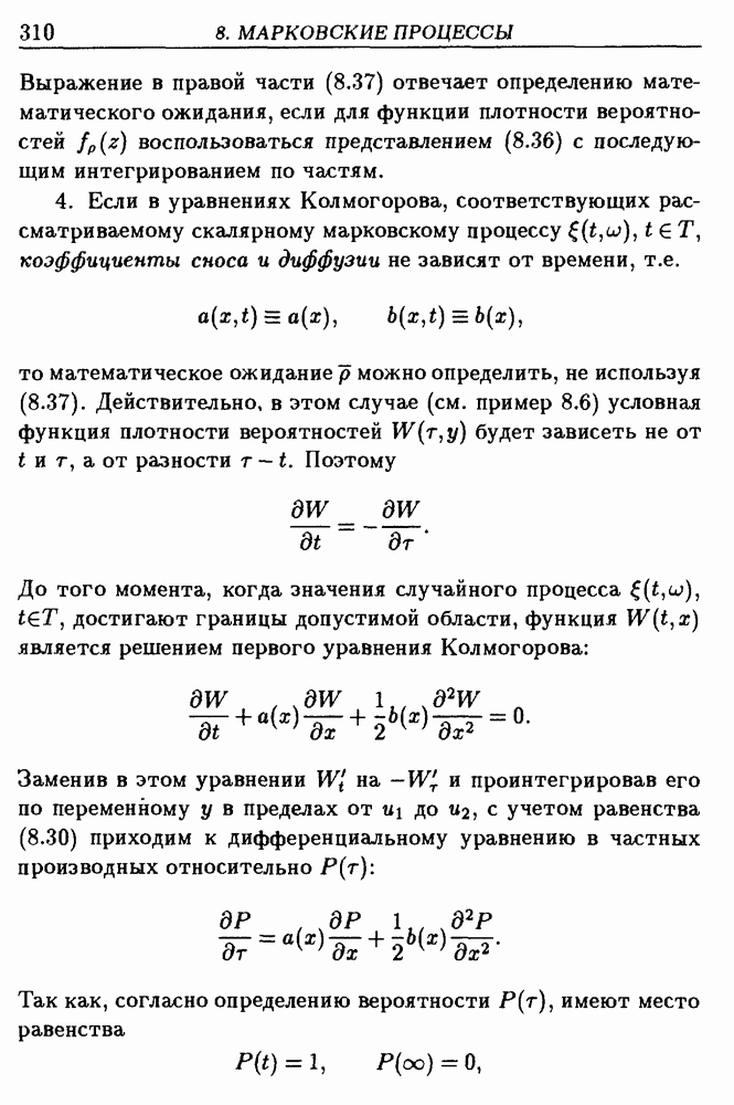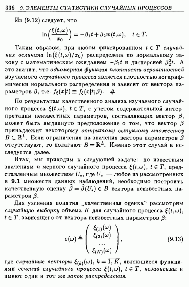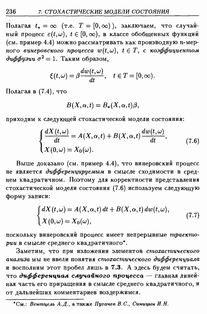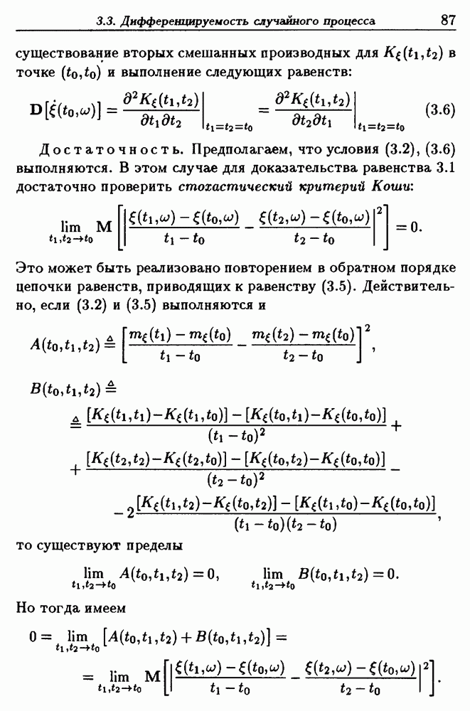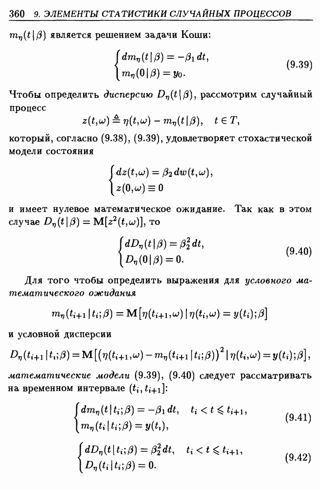 ВВЕДЕНИЕСодержание выпуска относится к одному из специальных курсов высшей математики, который является составной частью теории вероятностей. В процессе развития теории вероятностей как науки можно условно выделить три этапа, первый из которых связан с понятием случайного события, второй — с понятием случайной величины, а третий — с понятием случайной функции. При этом начало первого этапа относится к середине XVII в., второго — к середине XIX в., а третьего — к 20-30 гг. XX в., и начало каждого следующего этапа, в принципе, не связано с завершением предыдущего. Теория случайных процессов возникла вследствие практической необходимости математического моделирования реальных процессов различной природы, состояние каждого из которых в любой фиксированный момент времени представляет собой случайный вектор соответствующей размерности. Примером случайного процесса является процесс изменения во времени пространственных координат частицы, совершающей броуновское движение. Другими примерами случайных процессов являются: процесс стабилизации полета самолета в реальных условиях, когда он находится под постоянным воздействием случайных изменений вектора скорости ветра и других параметров турбулентной атмосферы; процесс развития неоднородной популяции с несколькими типами индивидуумов; процессы спроса и предложения на рынке товаров и т.д. Фактически теория случайных процессов занимается изучением различных семейств случайных величин, эволюционирующих во времени. При этом логически корректное определение основных понятий теории случайных процессов в рамках аксиоматики теории вероятностей создавало и создает много трудностей теоретико-множественного характера. Они связаны, например, с определениями непрерывности, дифференцируемости, интегрируемости и других свойств случайных процессов. Именно поэтому в монографиях по теории случайных процессов значительное место занимает анализ развития теоретикомножественных конструкций. Они написаны на высоком теоретическом уровне и, как правило, сложны для понимания специалистов, занимающихся прикладными проблемами в различных областях человеческой деятельности, решение которых предполагает широкое использование методов теории случайных процессов. А так как литература по прикладным аспектам теории случайных процессов, доступная для понимания широкому кругу студентов, аспирантов и научных работников, имеющих математическую подготовку в объеме стандартного курса высшей математики, весьма немногочисленна, то возникла необходимость в написании этой книги. Основной целью написания предлагаемого учебника явилось систематическое изложение элементов теории случайных процессов, усвоение которых должно способствовать активному овладению ее прикладными методами при решении практических задач. Различный уровень общей математической подготовки читателей и разнообразие их запросов авторы попытались учесть компоновкой материала по разделам с возрастающими уровнями сложности. Все основные понятия и методы иллюстрированы примерами, а в конце каждой главы приведены контрольные вопросы и упражнения. Отметим, что учебник не содержит библиографии по теории случайных процессов и ее приложениям. В списке рекомендуемой литературы указаны лишь те источники, обращение к ко