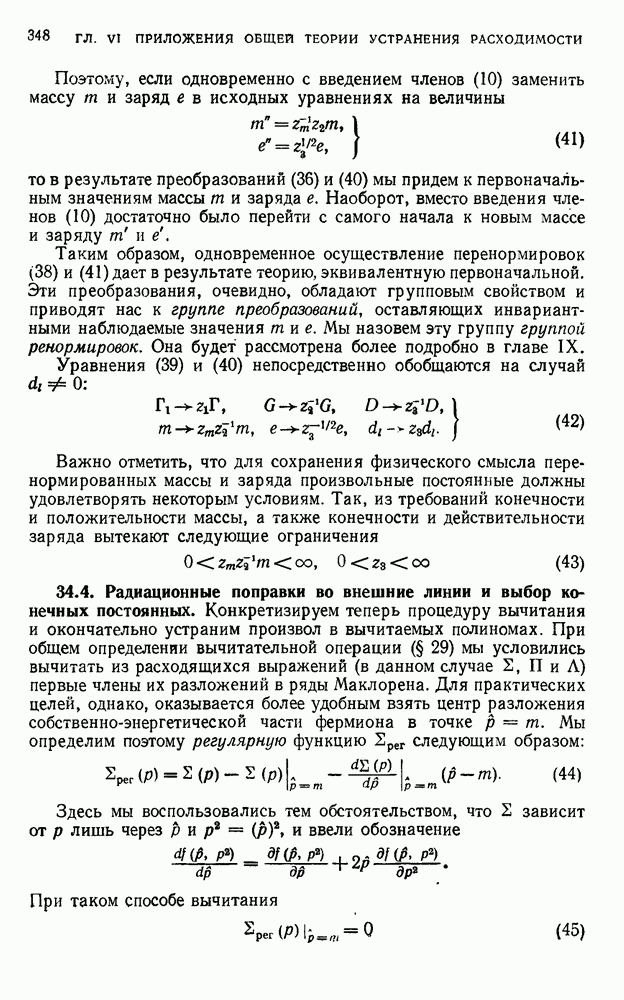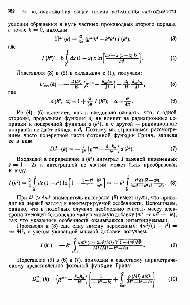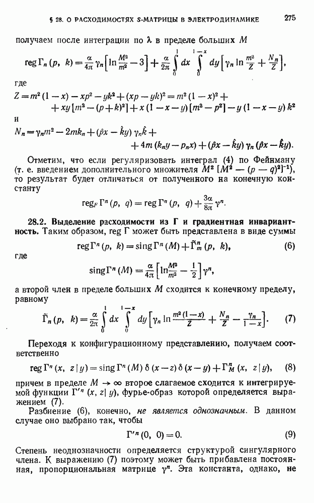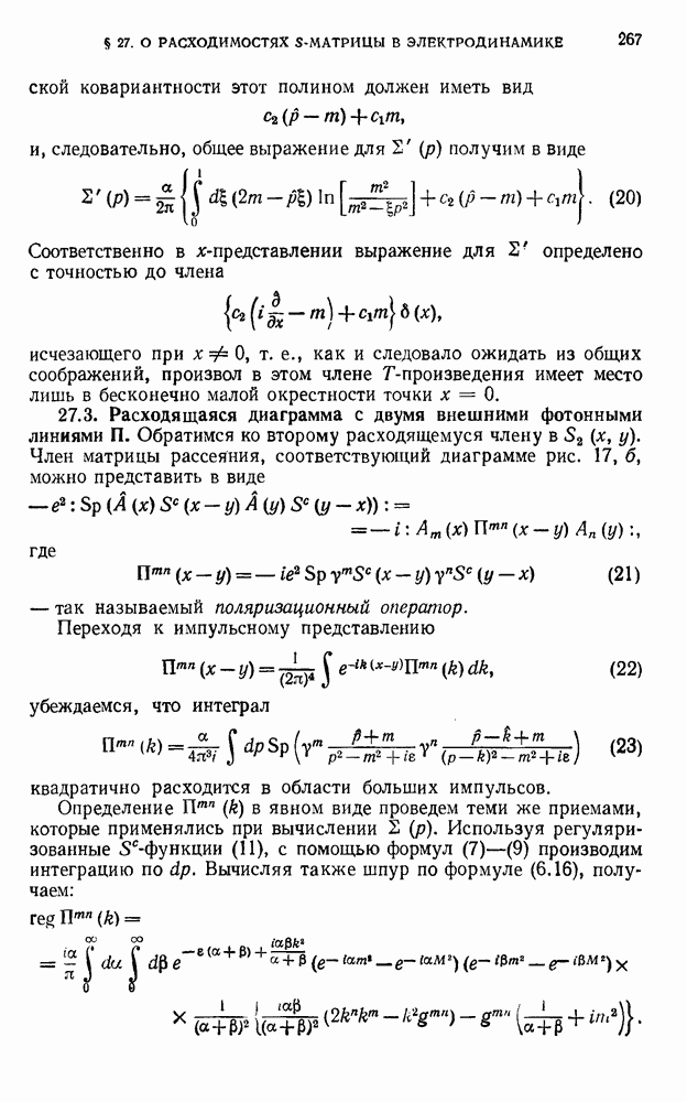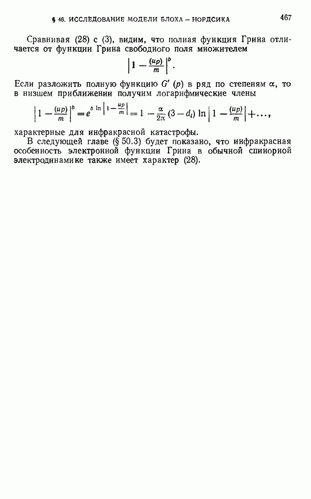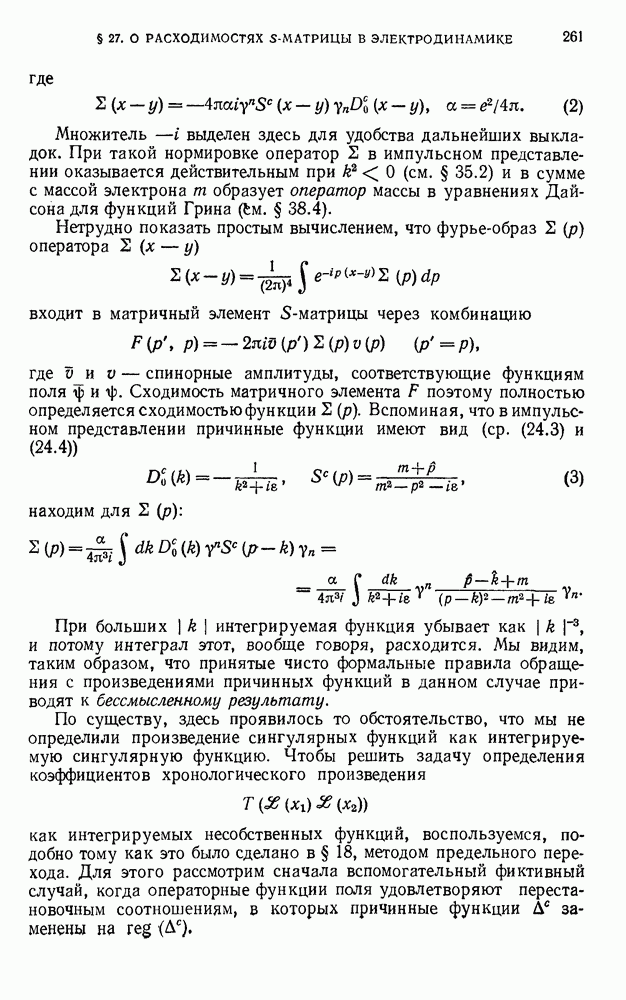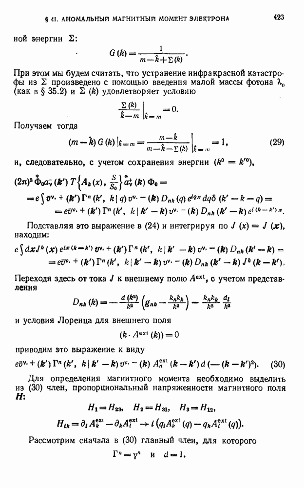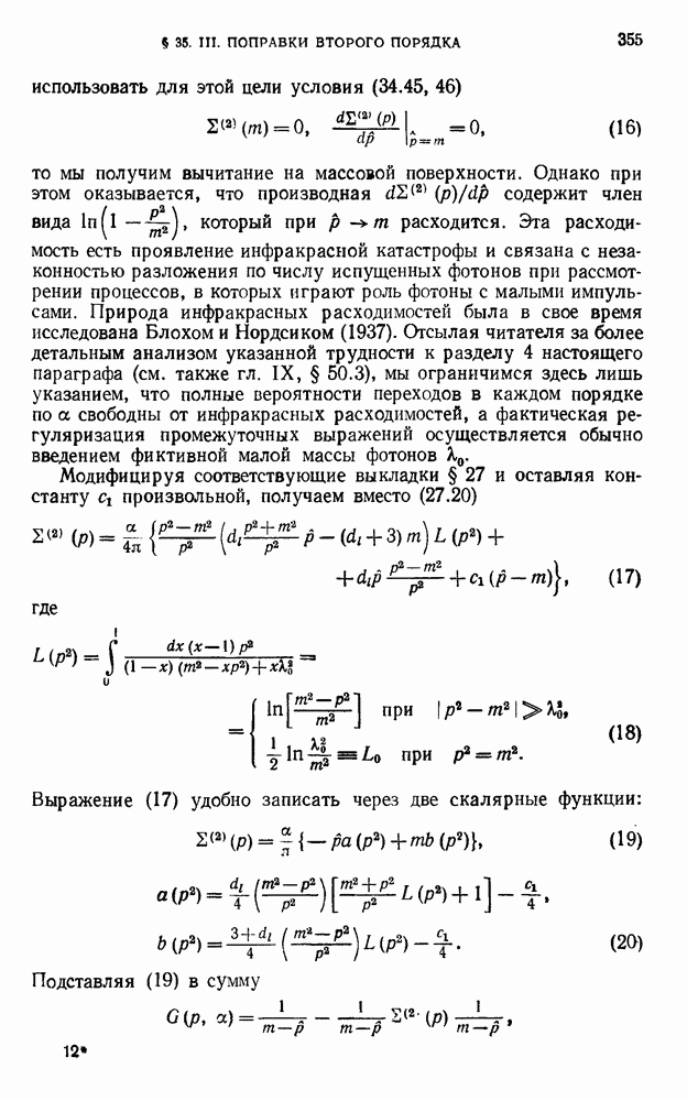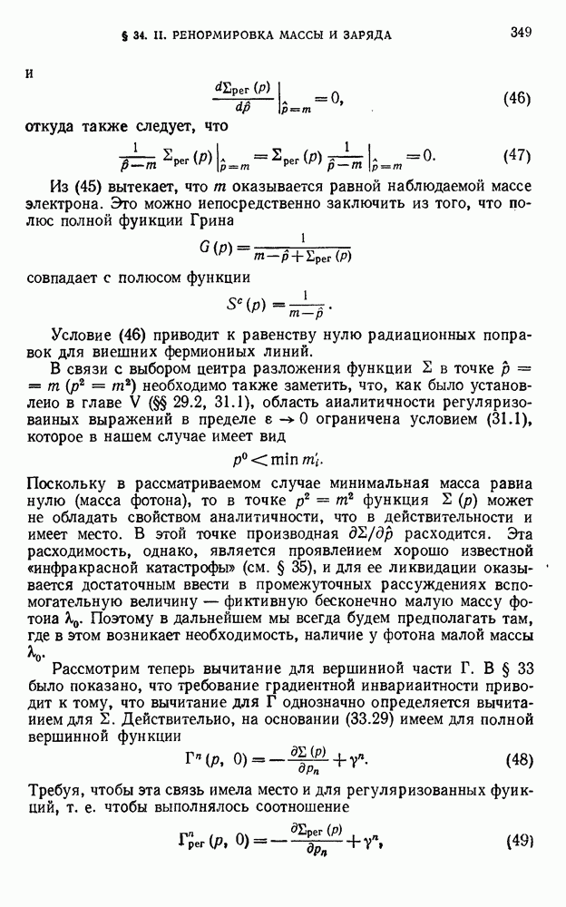 расходится. Эта расходимость есть проявление инфракрасной катастрофы и связана с незаконностью разложения по числу испущенных фотонов при рассмотрении процессов, в которых играют роль фотоны с малыми импульсами. Природа инфракрасных расходимостей была в свое время исследована Блохом и Нордсиком (1937). Отсылая читателя за более детальным анализом указанной трудности к разделу 4 настоящего параграфа (см. также гл. IX, § 50.3), мы ограничимся здесь лишь указанием, что полные вероятности переходов в каждом порядке по а свободны от инфракрасных расходимостей, а фактическая регуляризация промежуточных выражений осуществляется обычно введением фиктивной малой массы фотонов