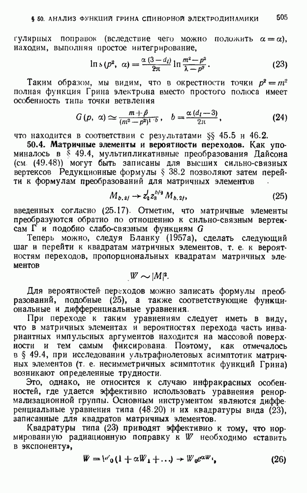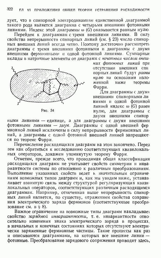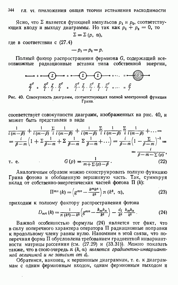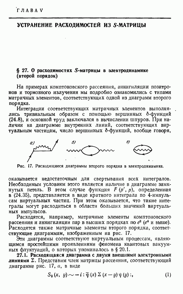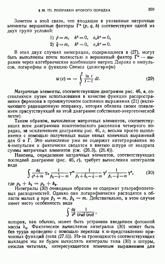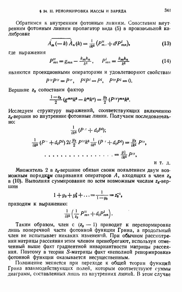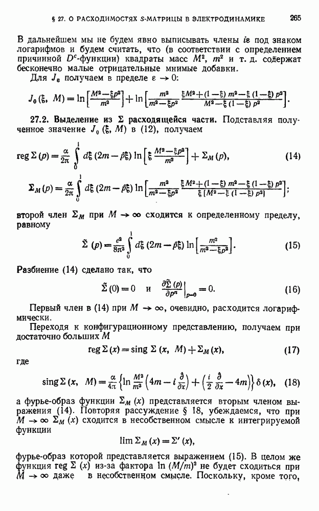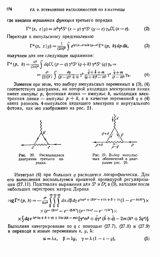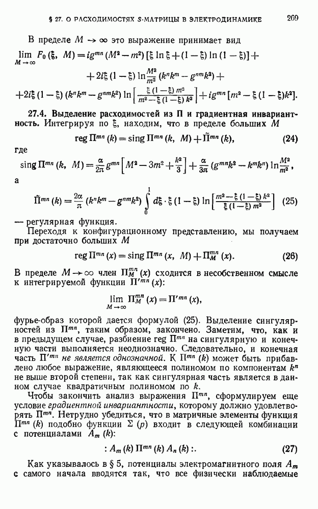 расходится. Эта расходимость есть проявление инфракрасной катастрофы и связана с незаконностью разложения по числу испущенных фотонов при рассмотрении процессов, в которых играют роль фотоны с малыми импульсами. Природа инфракрасных расходимостей была в свое время исследована Блохом и Нордсиком (1937). Отсылая читателя за более детальным анализом указанной трудности к разделу 4 настоящего параграфа (см. также гл. IX, § 50.3), мы ограничимся здесь лишь указанием, что полные вероятности переходов в каждом порядке по а свободны от инфракрасных расходимостей, а фактическая регуляризация промежуточных выражений осуществляется обычно введением фиктивной малой массы фотонов