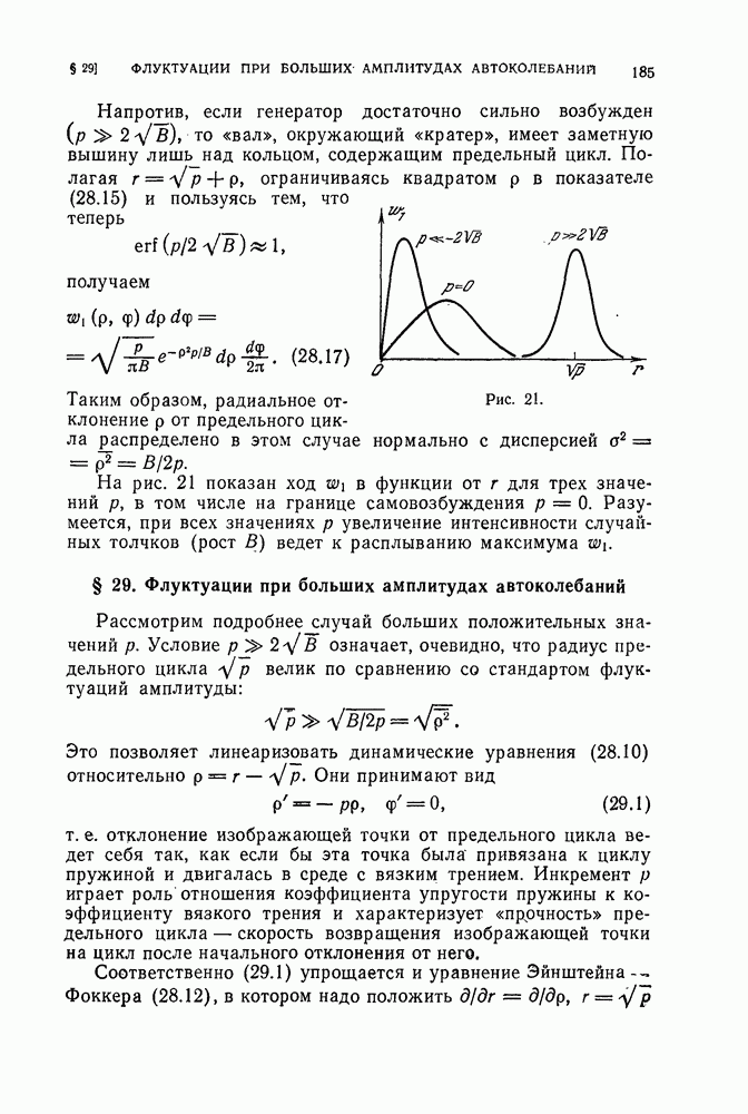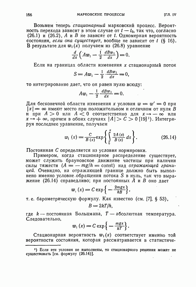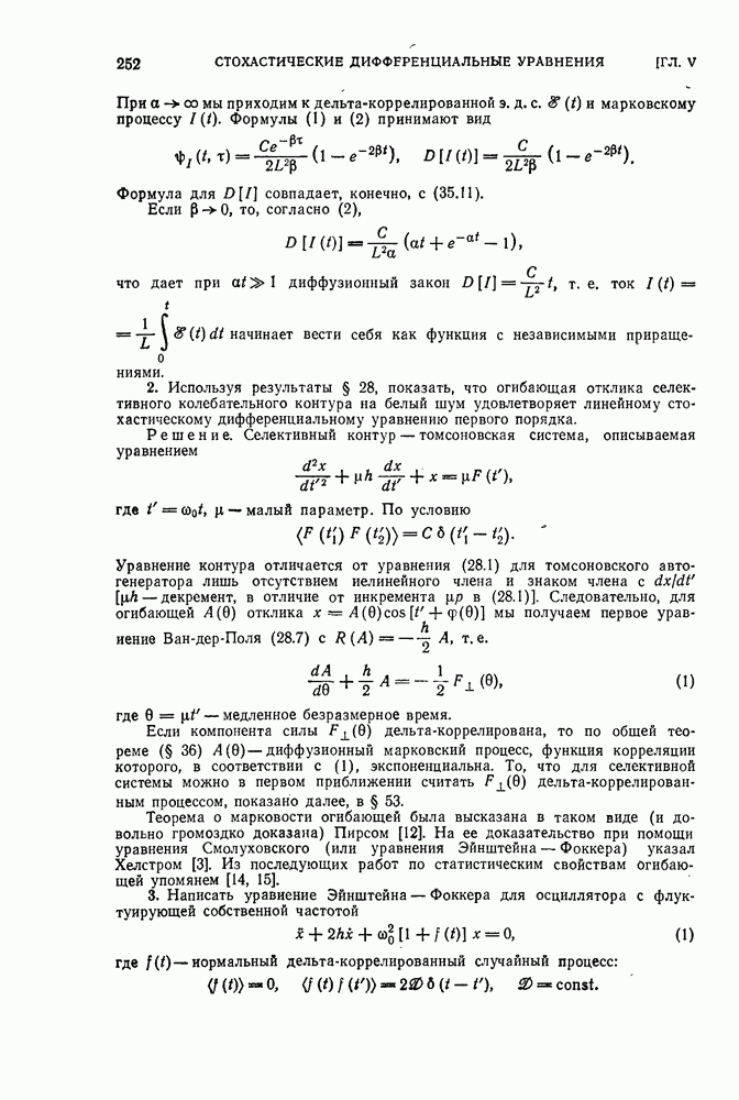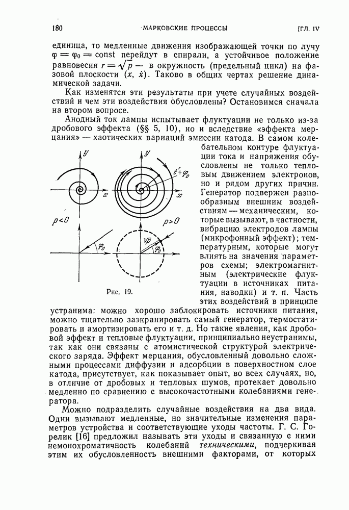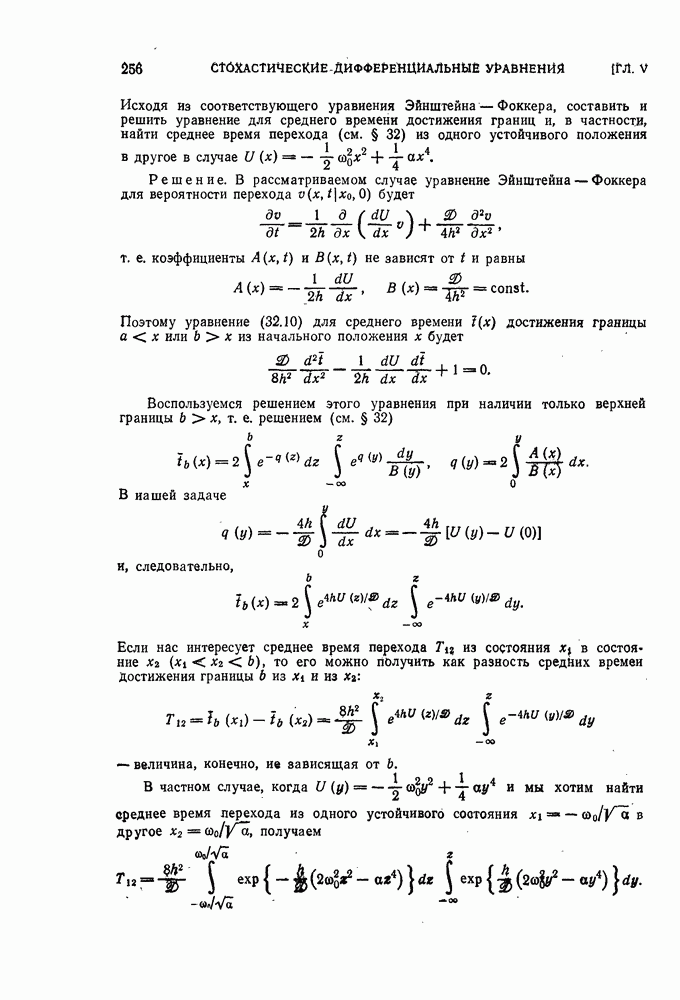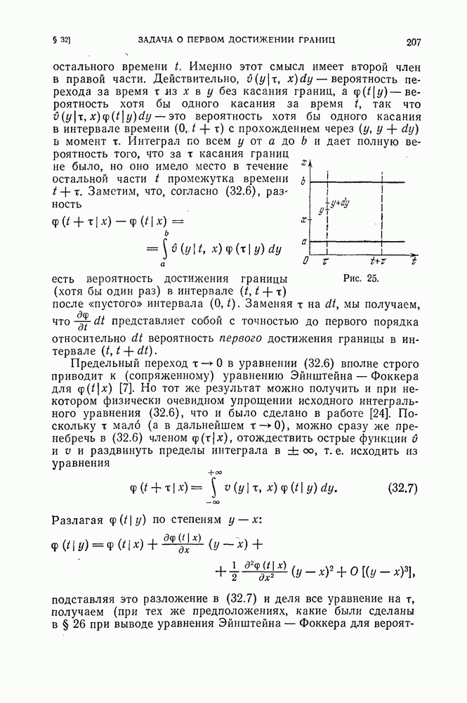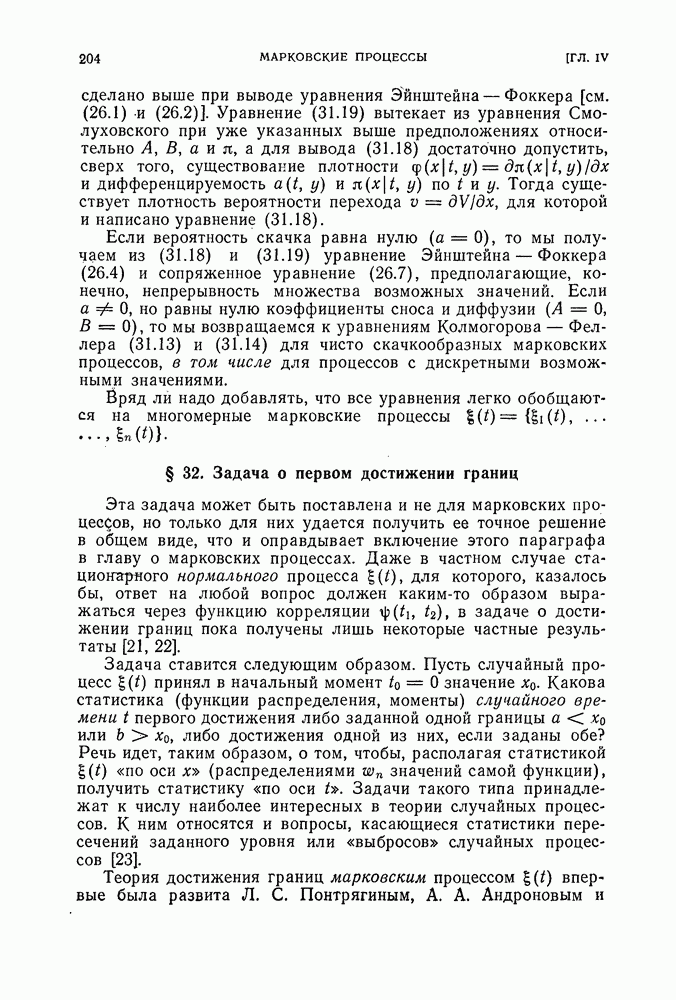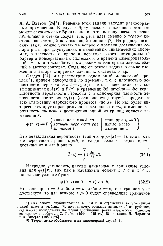 А. А. Виттом [24]. Решение этой задачи находит разнообразные применения. В случае брауновского движения примером может служить опыт Бриллюэна, в котором брауновская частица прилипает к стенке сосуда, т. е. речь идет именно о первом достижении частицей поглощающей границы [7]. Из радиофизических задач можно указать на вопрос о времени достижения сепаратрисы при флуктуациях в нелинейных динамических системах, в частности о времени перехода через потенциальный барьер в консервативных системах и о времени самопроизвольной смены автоколебательных режимов или срыва автоколебаний в автогенераторах. Сюда же относится задача о срыве слежения в авторегулируемых следящих системах и др.