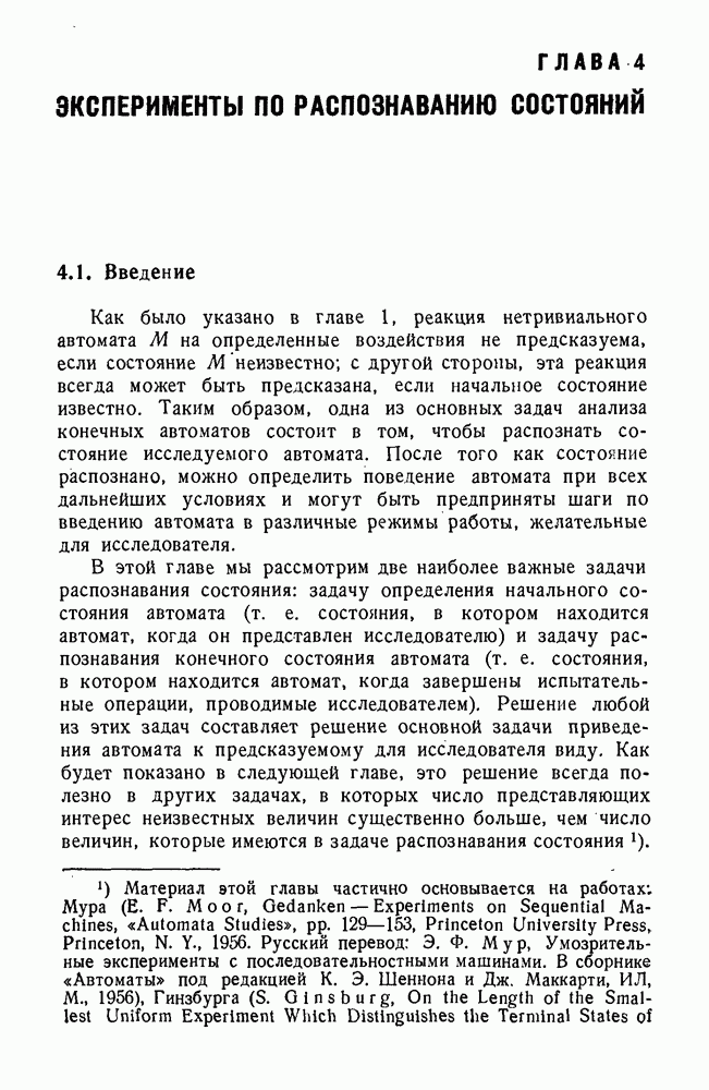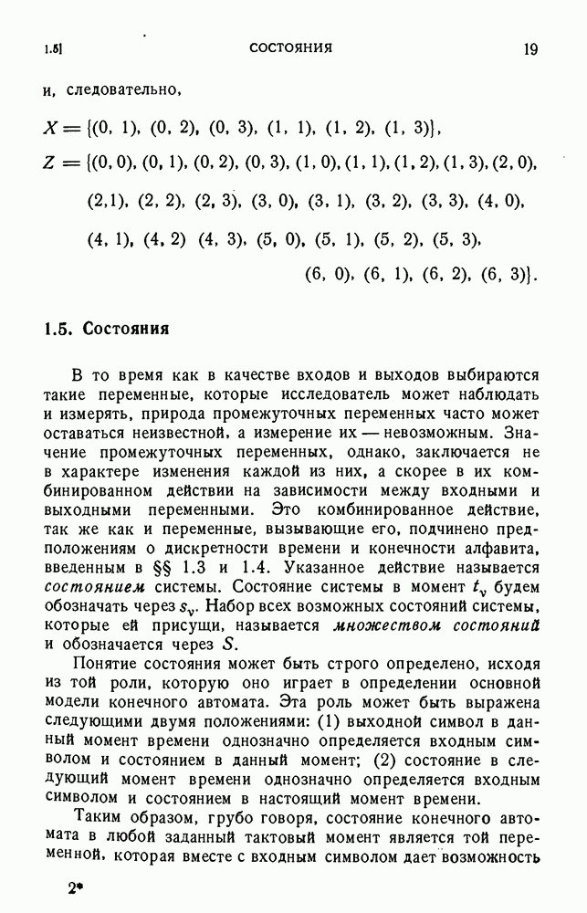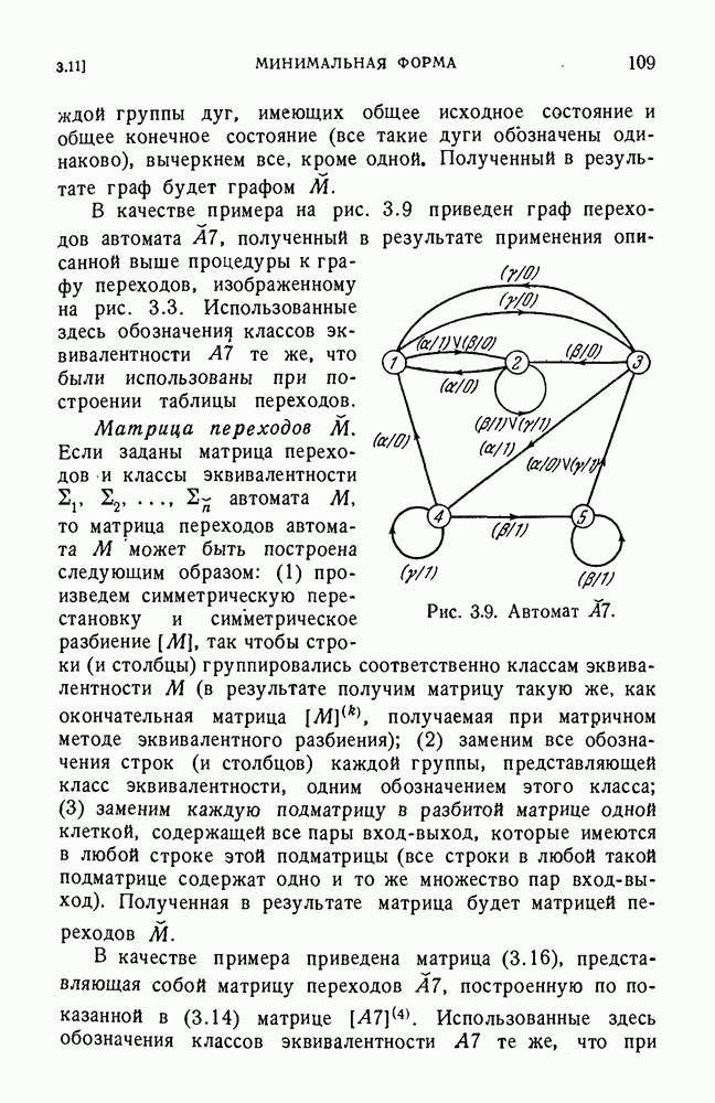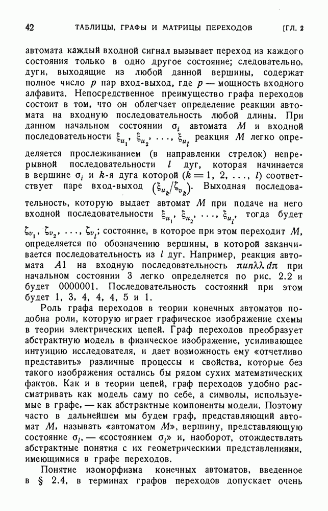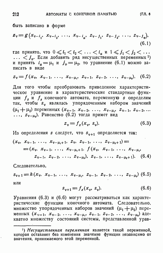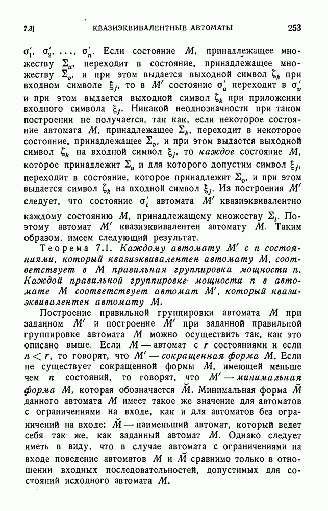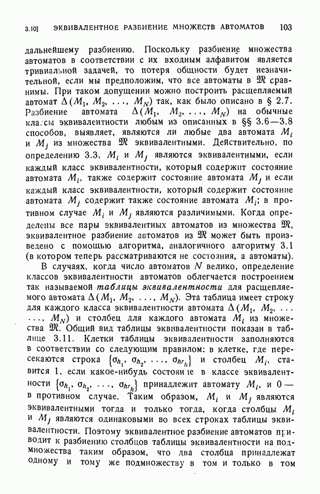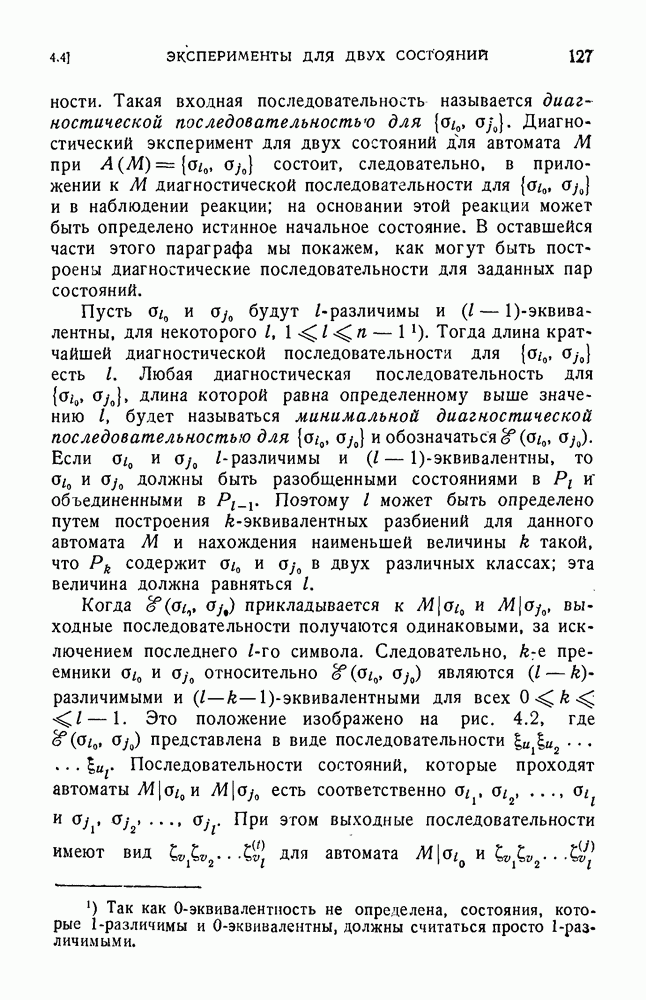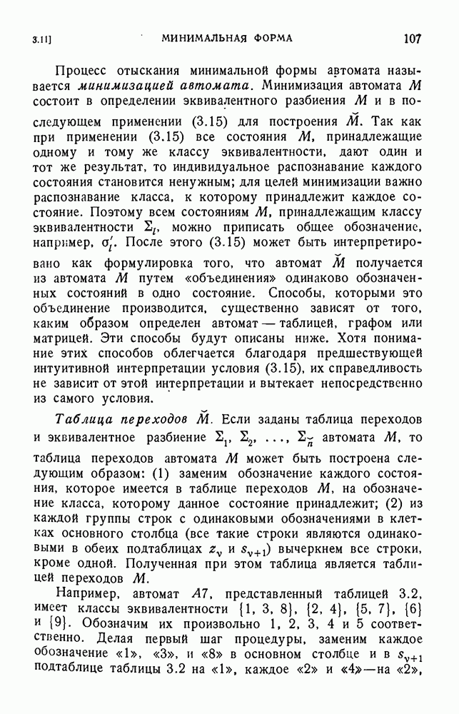 В предыдущих главах было подчеркнуто, что в конечных автоматах не нужно ни наблюдать, ни интересоваться физической природой состояний. Единственная функция состояний заключается в том, чтобы участвовать в определении зависимостей между входами и выходами автомата. Следовательно, любое множество состояний, выполняющих эту функцию, является приемлемым независимо от того, выражают эти состояния какой-либо интуитивный смысл или нет. Эта свобода выбора множества состояний весьма выгодна, поскольку она позволяет заменять одно множество другим, что может оказаться удобным для многих цеей. В частности, она позволяет найти оптимальное или минимальное, в том или другом смысле, множество состояний. При всех таких рассмотрениях понятие «эквивалентности» играет главную роль. Как станет видно из дальнейшего, это понятие не только является фундаментальным для более точного и краткого определения конечных автоматов, но проливает новый свет на всю проблему анализа конечных автоматов (так же как и синтеза).