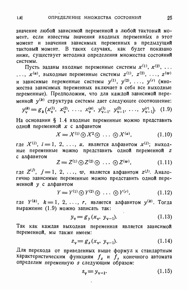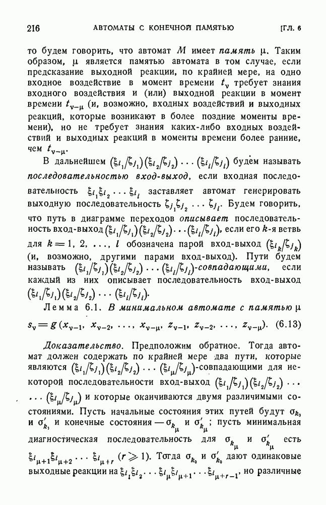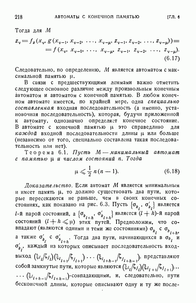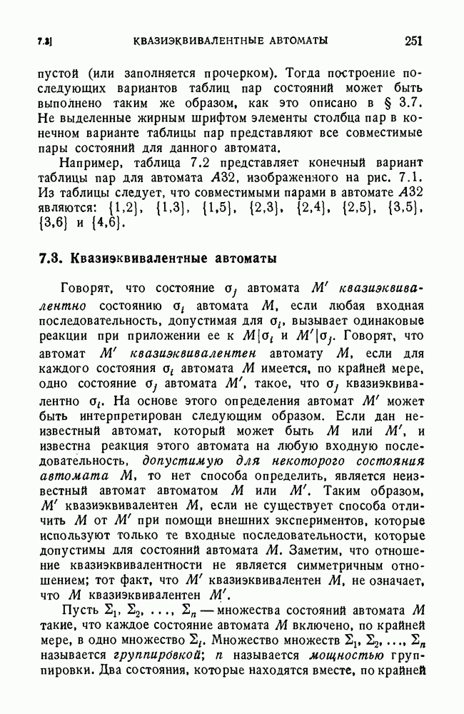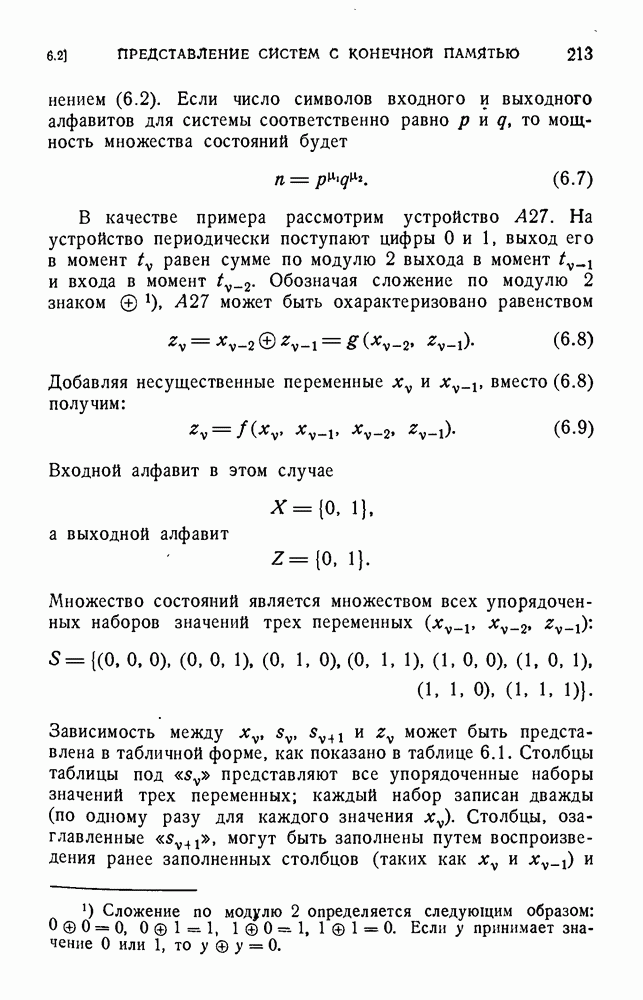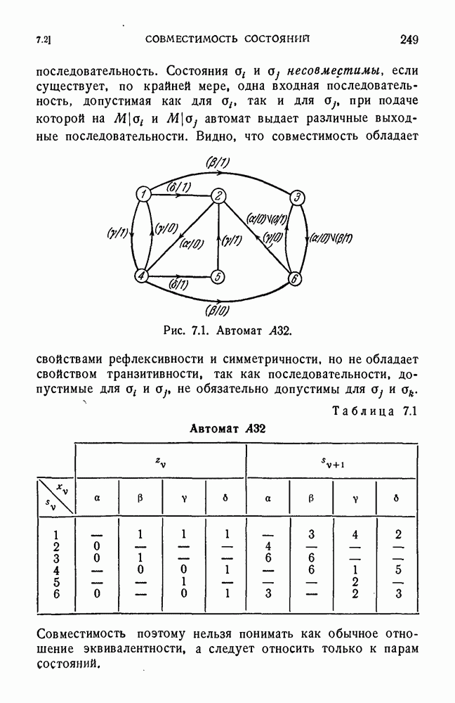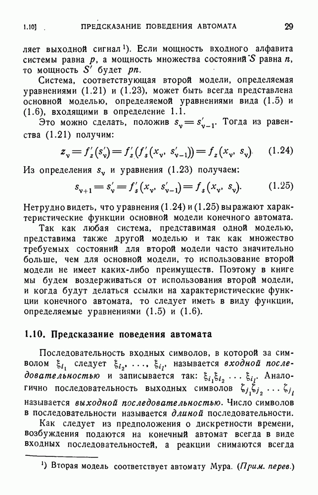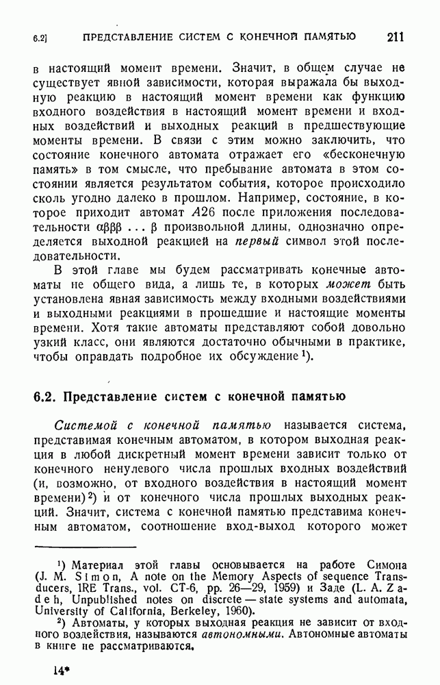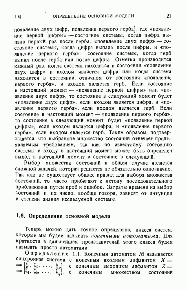 В предыдущих главах было подчеркнуто, что в конечных автоматах не нужно ни наблюдать, ни интересоваться физической природой состояний. Единственная функция состояний заключается в том, чтобы участвовать в определении зависимостей между входами и выходами автомата. Следовательно, любое множество состояний, выполняющих эту функцию, является приемлемым независимо от того, выражают эти состояния какой-либо интуитивный смысл или нет. Эта свобода выбора множества состояний весьма выгодна, поскольку она позволяет заменять одно множество другим, что может оказаться удобным для многих цеей. В частности, она позволяет найти оптимальное или минимальное, в том или другом смысле, множество состояний. При всех таких рассмотрениях понятие «эквивалентности» играет главную роль. Как станет видно из дальнейшего, это понятие не только является фундаментальным для более точного и краткого определения конечных автоматов, но проливает новый свет на всю проблему анализа конечных автоматов (так же как и синтеза).