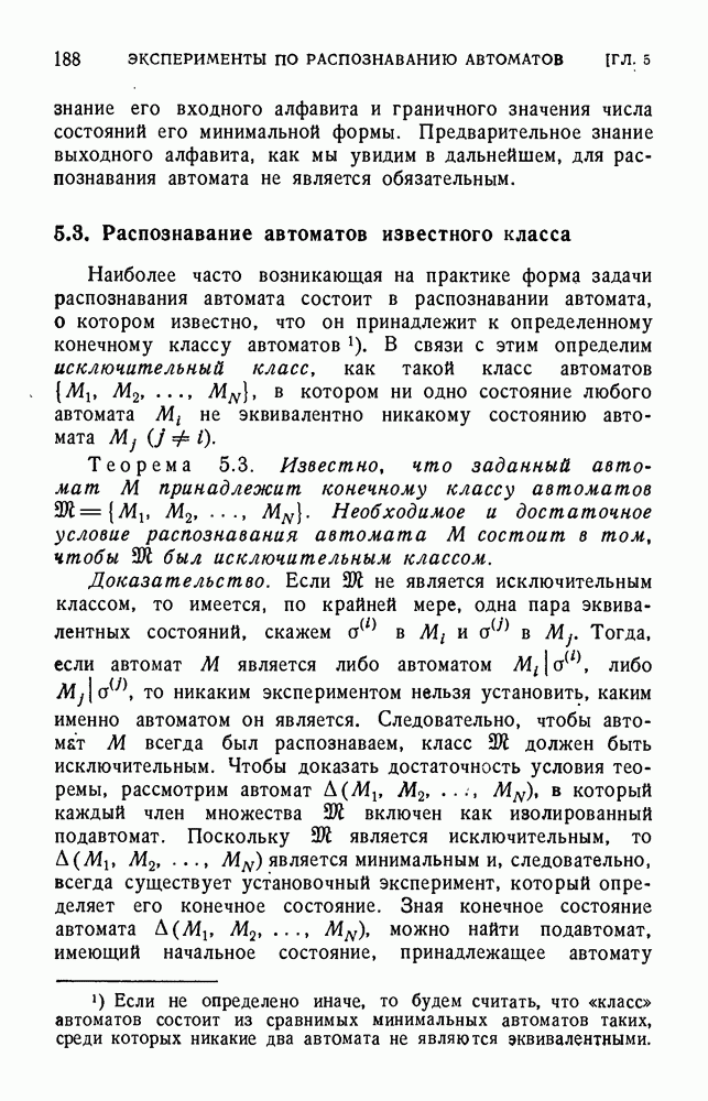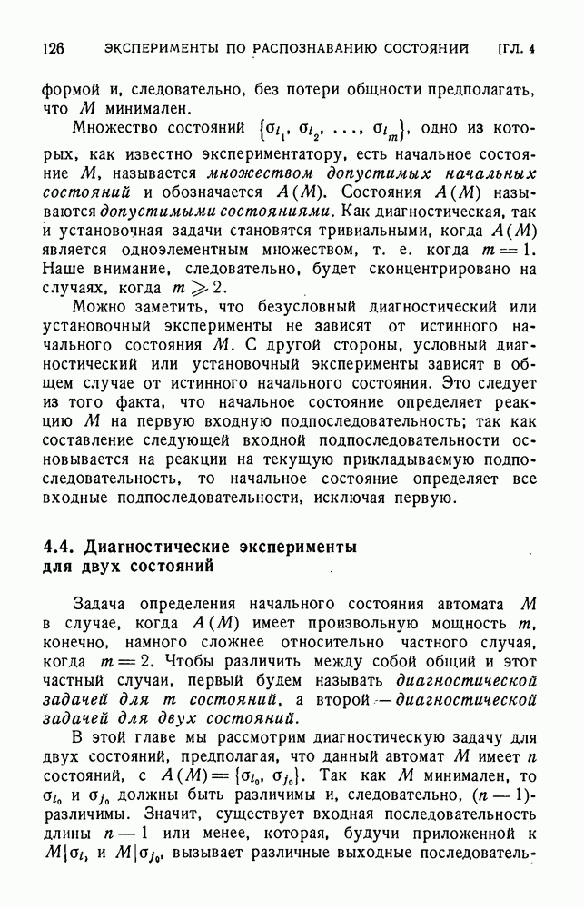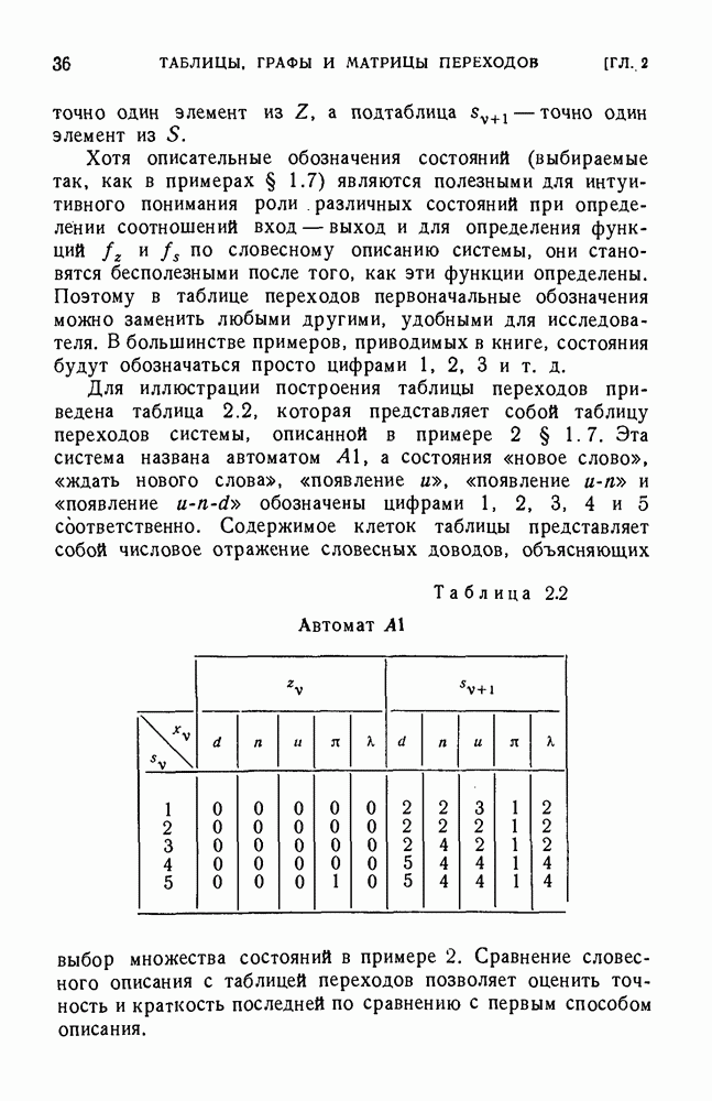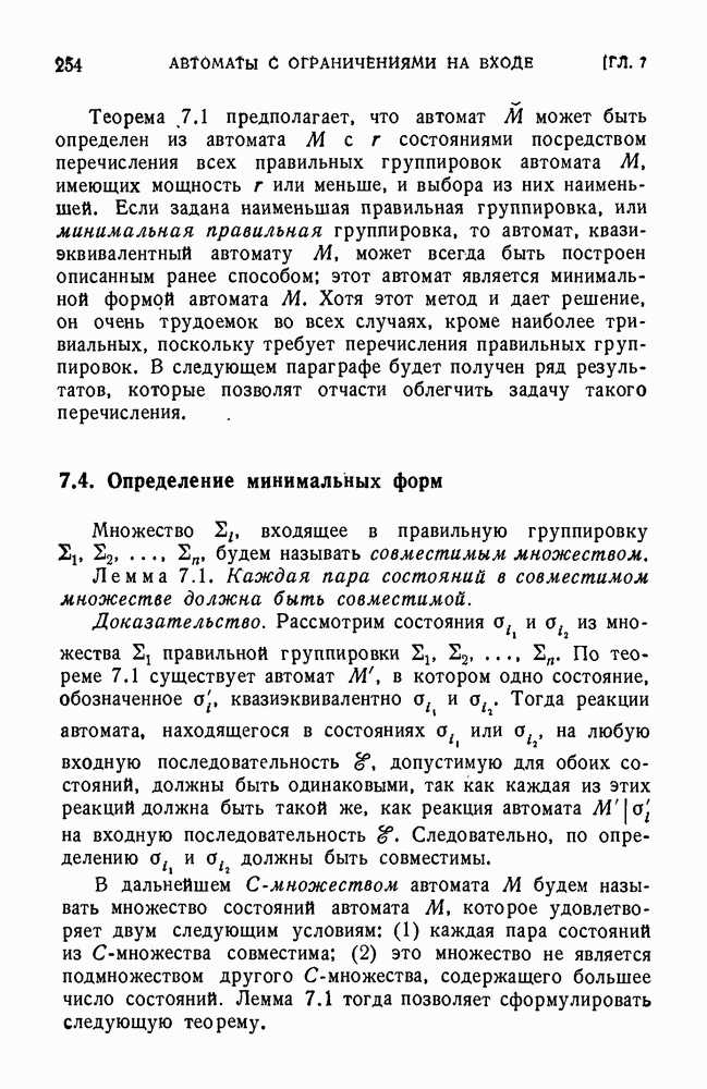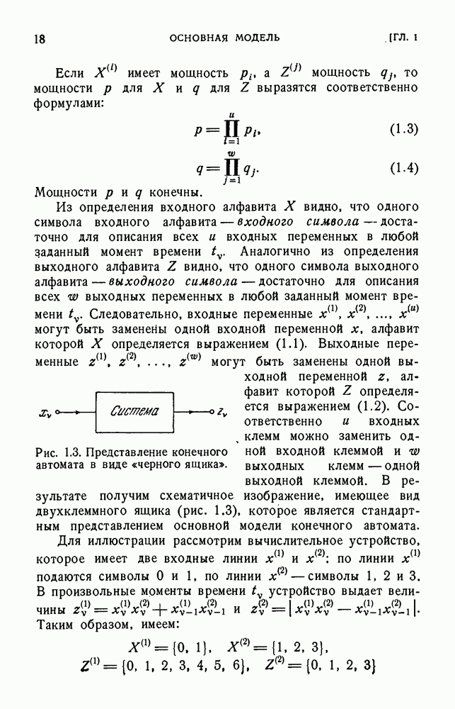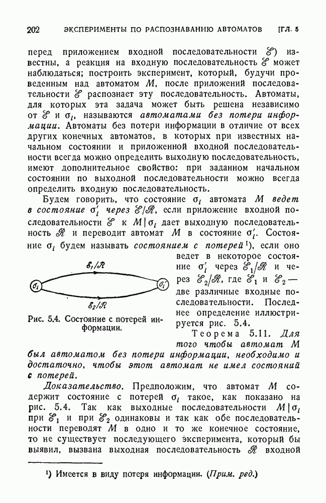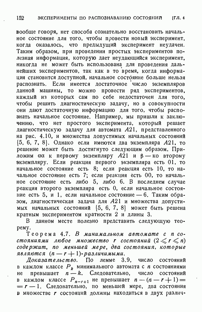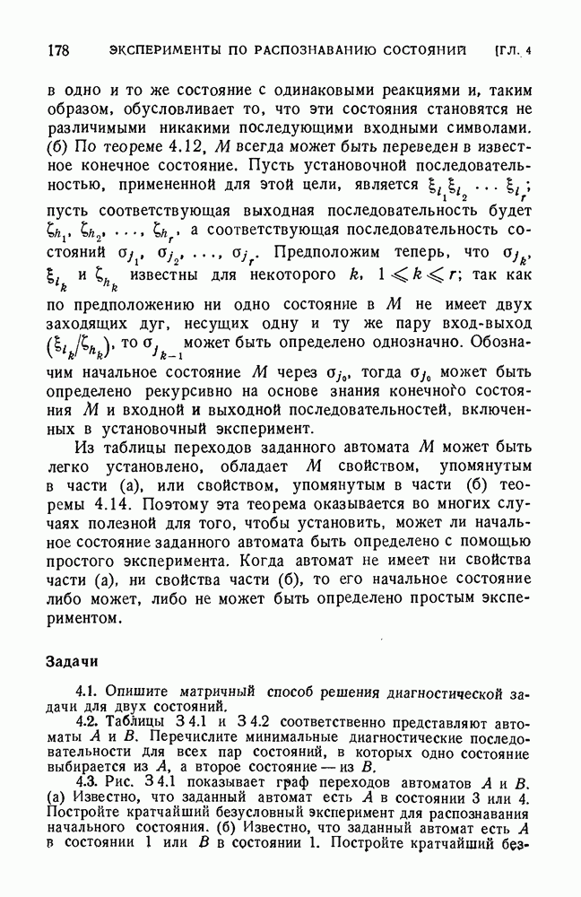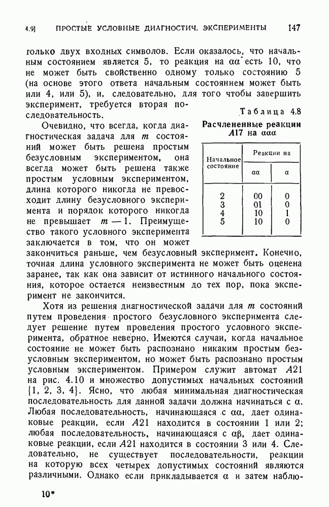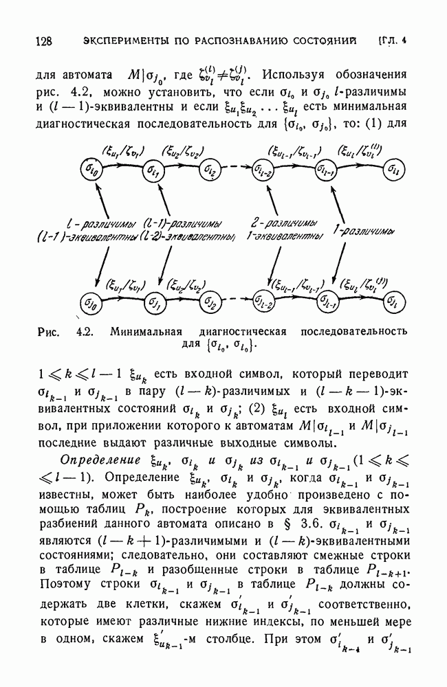 В предыдущих главах было подчеркнуто, что в конечных автоматах не нужно ни наблюдать, ни интересоваться физической природой состояний. Единственная функция состояний заключается в том, чтобы участвовать в определении зависимостей между входами и выходами автомата. Следовательно, любое множество состояний, выполняющих эту функцию, является приемлемым независимо от того, выражают эти состояния какой-либо интуитивный смысл или нет. Эта свобода выбора множества состояний весьма выгодна, поскольку она позволяет заменять одно множество другим, что может оказаться удобным для многих цеей. В частности, она позволяет найти оптимальное или минимальное, в том или другом смысле, множество состояний. При всех таких рассмотрениях понятие «эквивалентности» играет главную роль. Как станет видно из дальнейшего, это понятие не только является фундаментальным для более точного и краткого определения конечных автоматов, но проливает новый свет на всю проблему анализа конечных автоматов (так же как и синтеза).