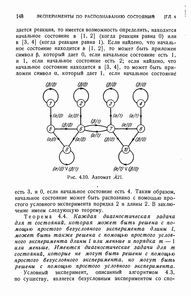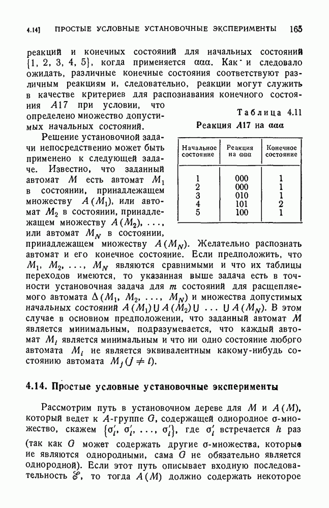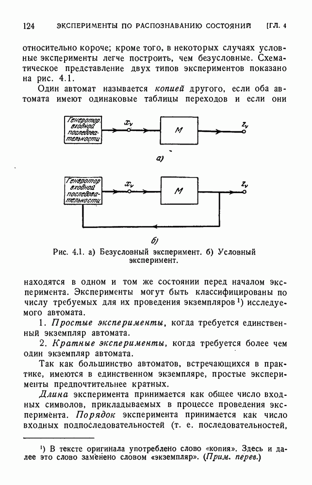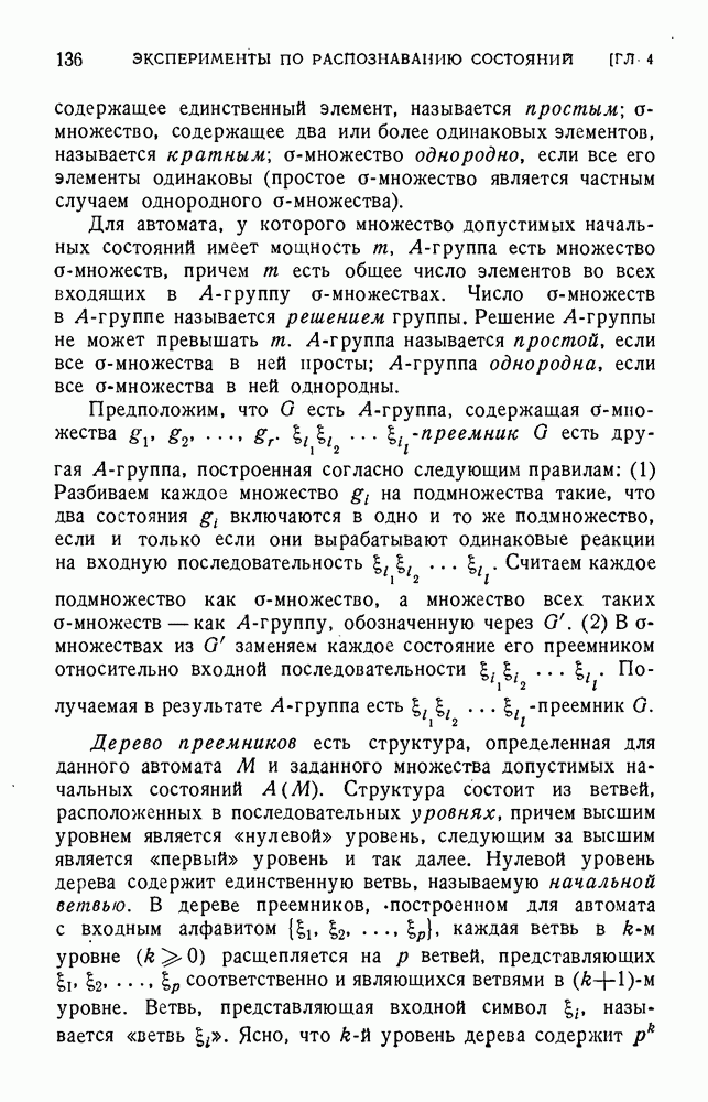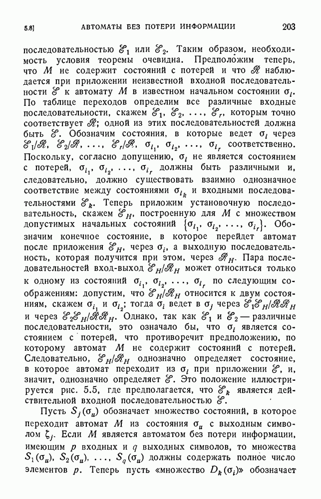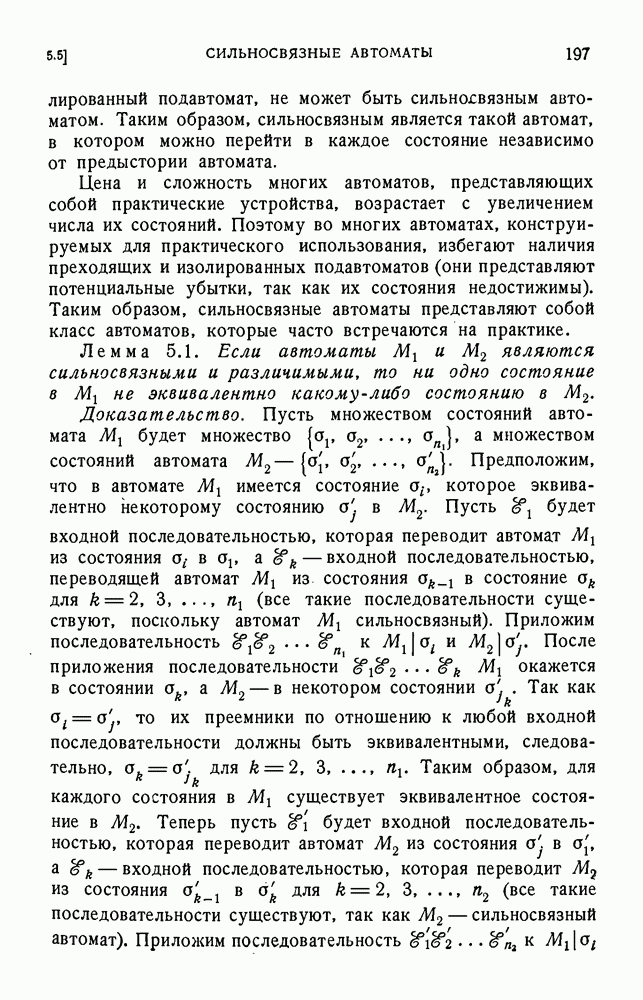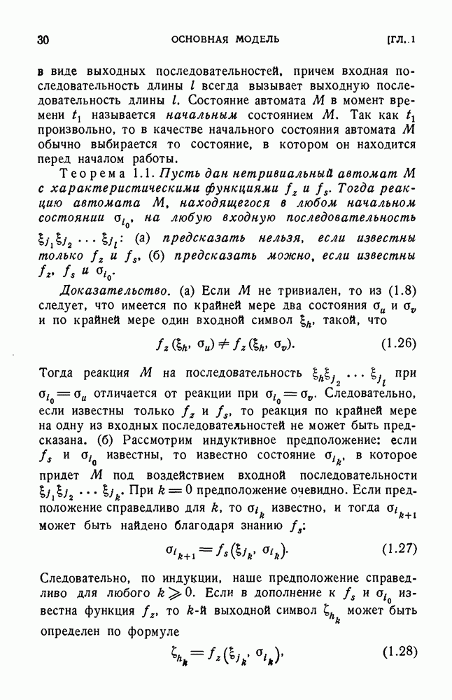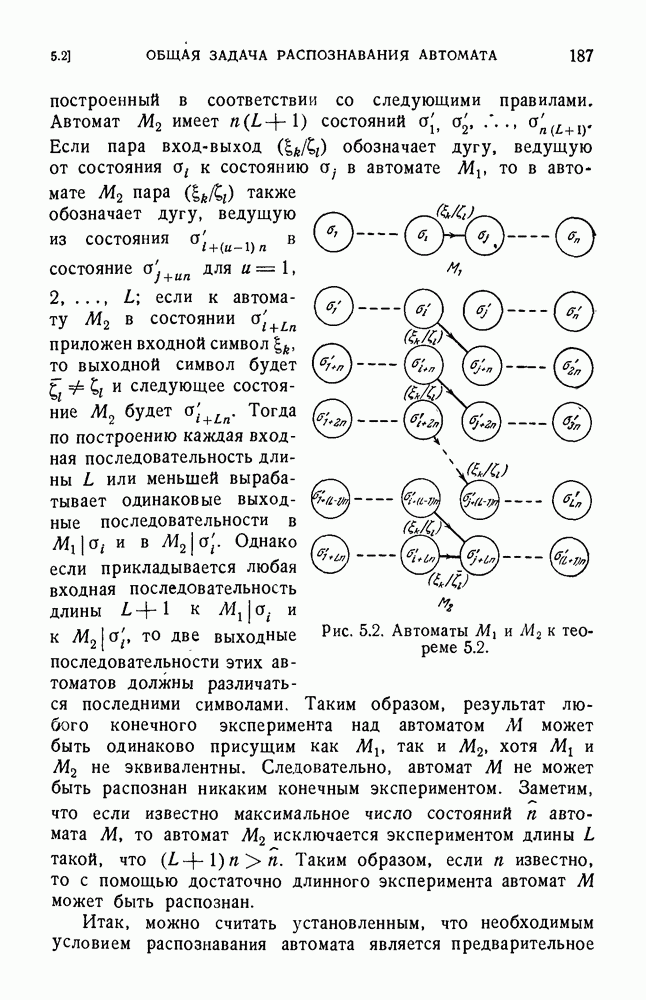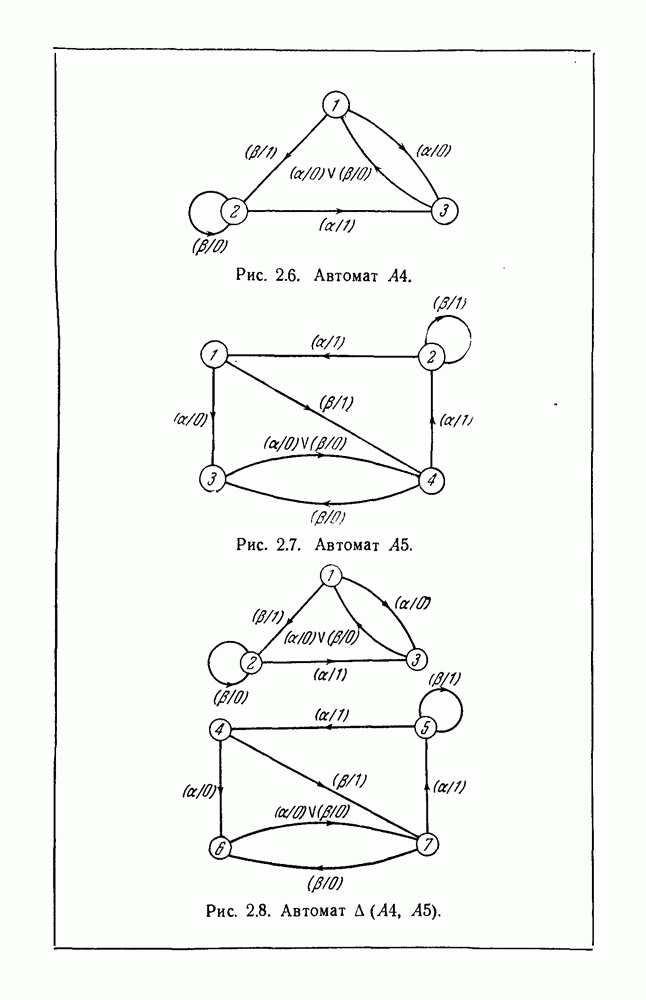 В предыдущих главах было подчеркнуто, что в конечных автоматах не нужно ни наблюдать, ни интересоваться физической природой состояний. Единственная функция состояний заключается в том, чтобы участвовать в определении зависимостей между входами и выходами автомата. Следовательно, любое множество состояний, выполняющих эту функцию, является приемлемым независимо от того, выражают эти состояния какой-либо интуитивный смысл или нет. Эта свобода выбора множества состояний весьма выгодна, поскольку она позволяет заменять одно множество другим, что может оказаться удобным для многих цеей. В частности, она позволяет найти оптимальное или минимальное, в том или другом смысле, множество состояний. При всех таких рассмотрениях понятие «эквивалентности» играет главную роль. Как станет видно из дальнейшего, это понятие не только является фундаментальным для более точного и краткого определения конечных автоматов, но проливает новый свет на всю проблему анализа конечных автоматов (так же как и синтеза).