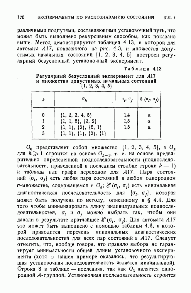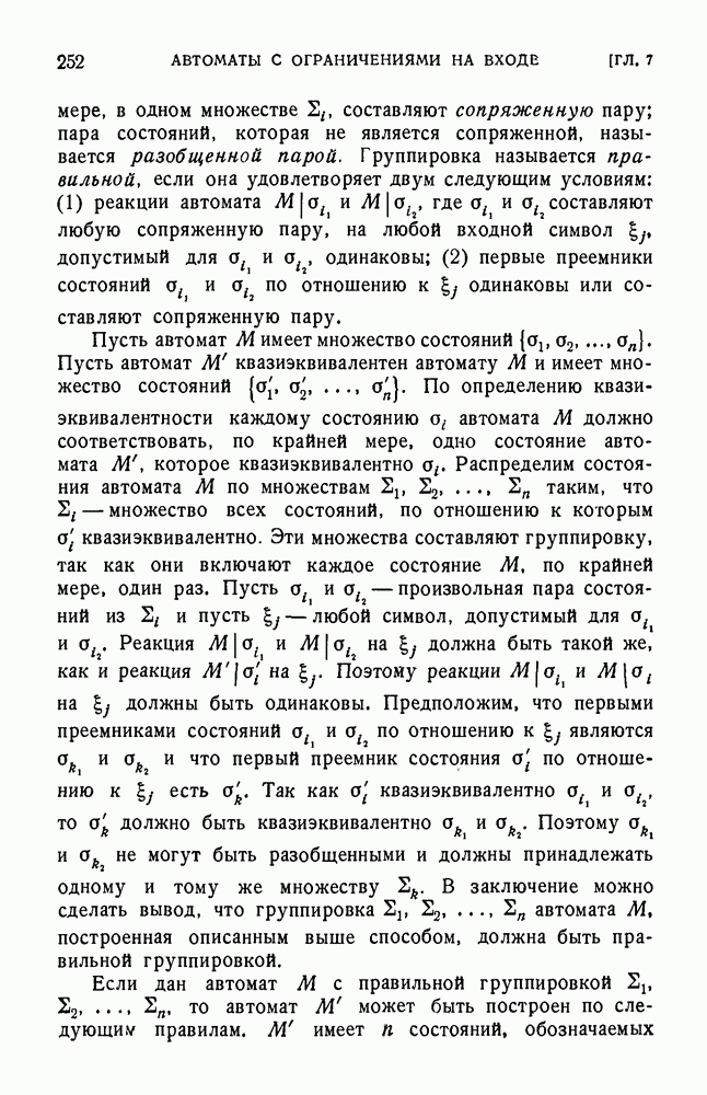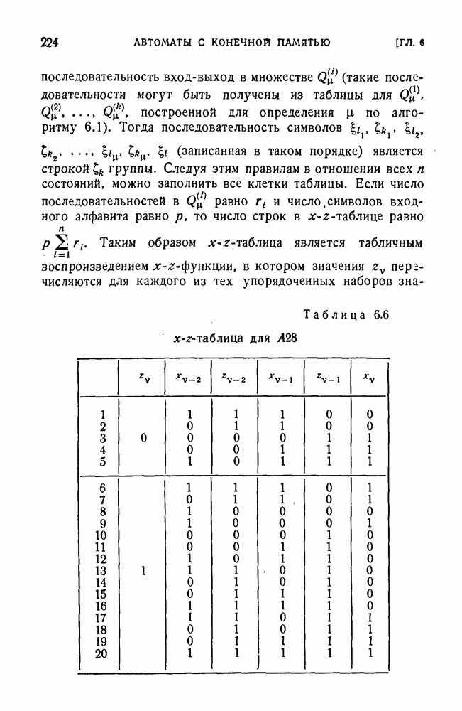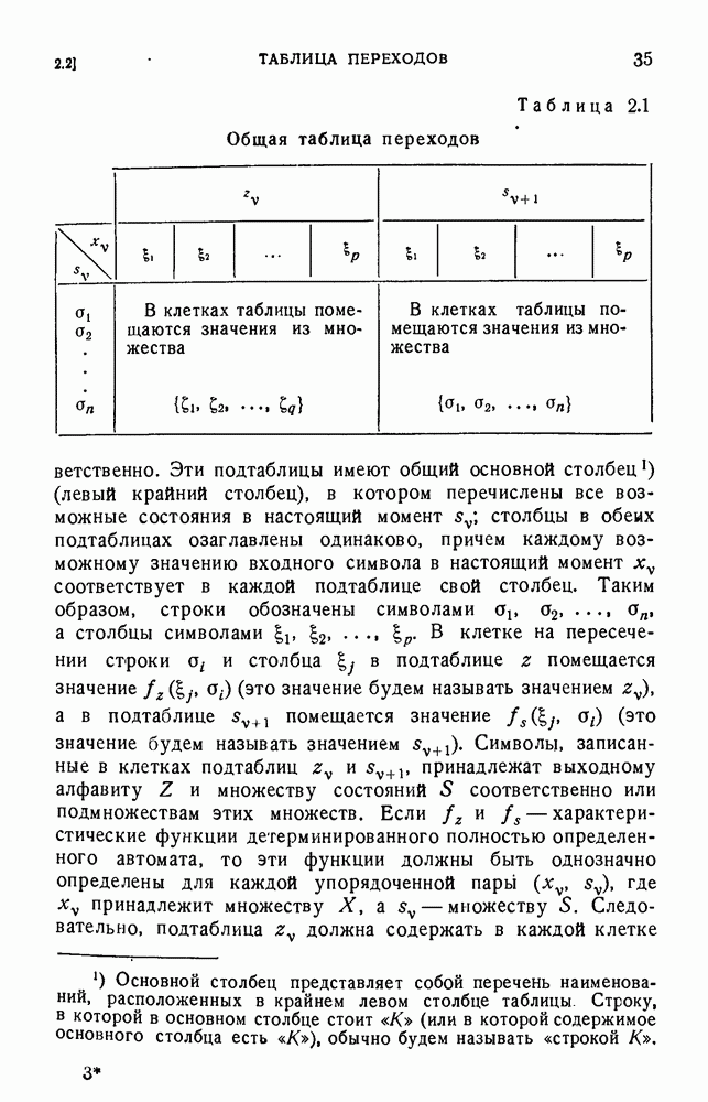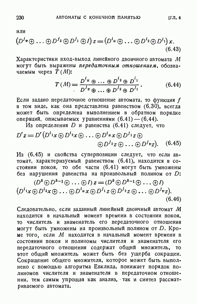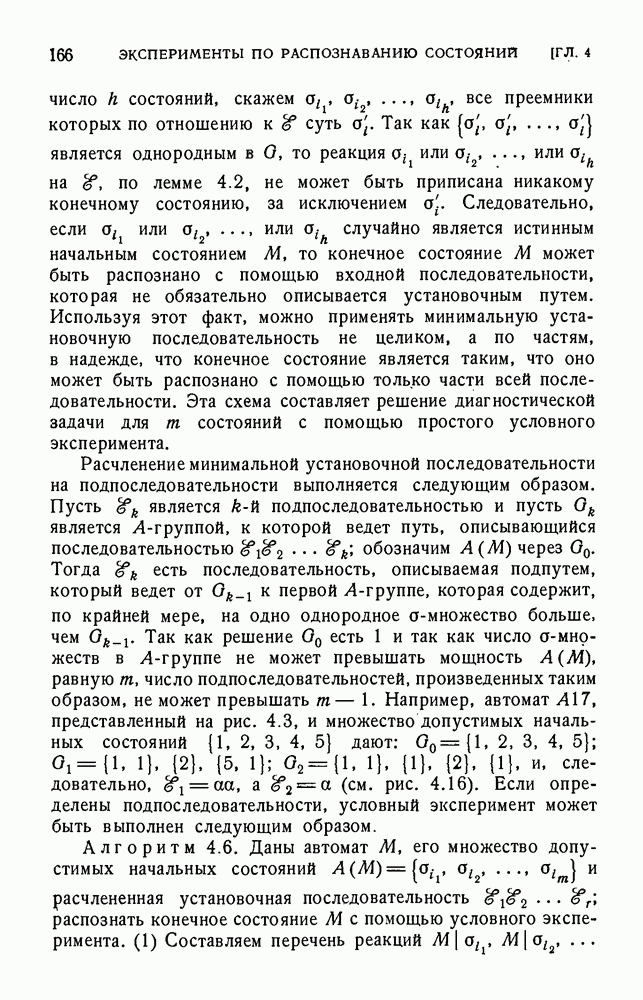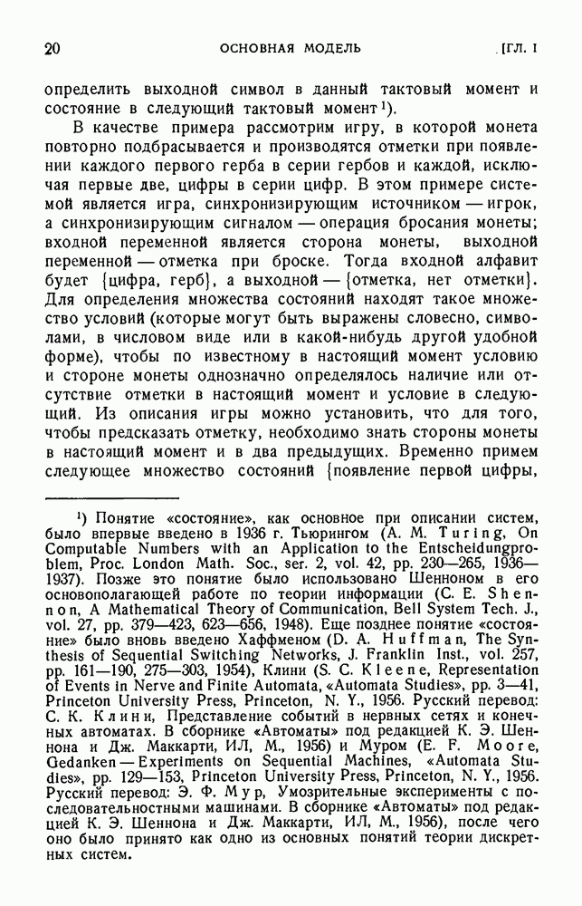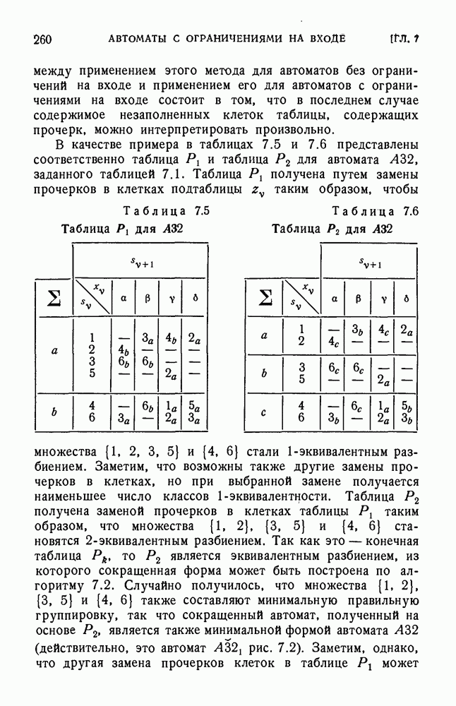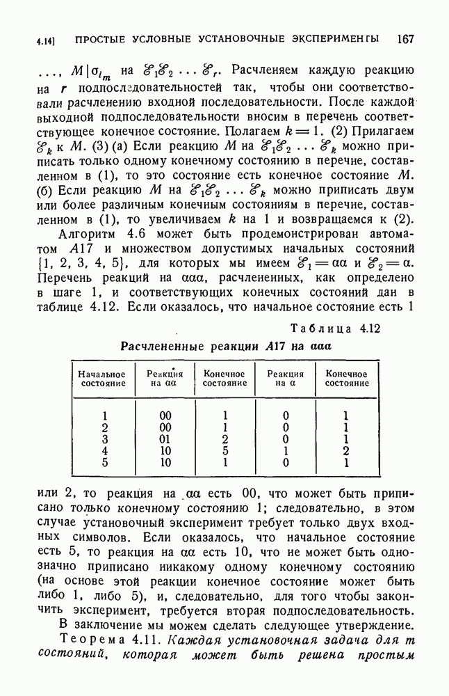 В предыдущих главах было подчеркнуто, что в конечных автоматах не нужно ни наблюдать, ни интересоваться физической природой состояний. Единственная функция состояний заключается в том, чтобы участвовать в определении зависимостей между входами и выходами автомата. Следовательно, любое множество состояний, выполняющих эту функцию, является приемлемым независимо от того, выражают эти состояния какой-либо интуитивный смысл или нет. Эта свобода выбора множества состояний весьма выгодна, поскольку она позволяет заменять одно множество другим, что может оказаться удобным для многих цеей. В частности, она позволяет найти оптимальное или минимальное, в том или другом смысле, множество состояний. При всех таких рассмотрениях понятие «эквивалентности» играет главную роль. Как станет видно из дальнейшего, это понятие не только является фундаментальным для более точного и краткого определения конечных автоматов, но проливает новый свет на всю проблему анализа конечных автоматов (так же как и синтеза).