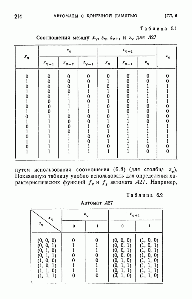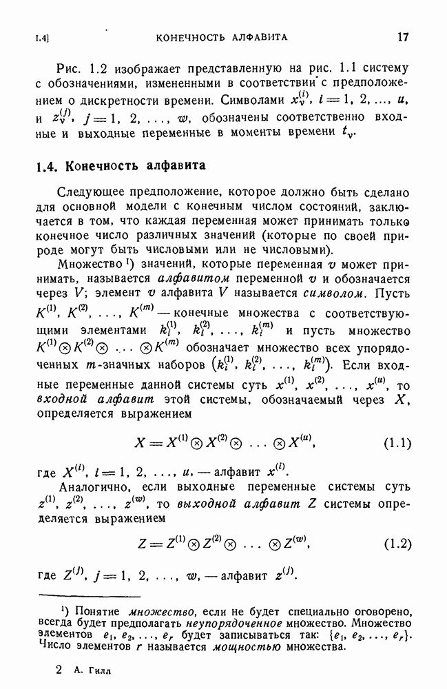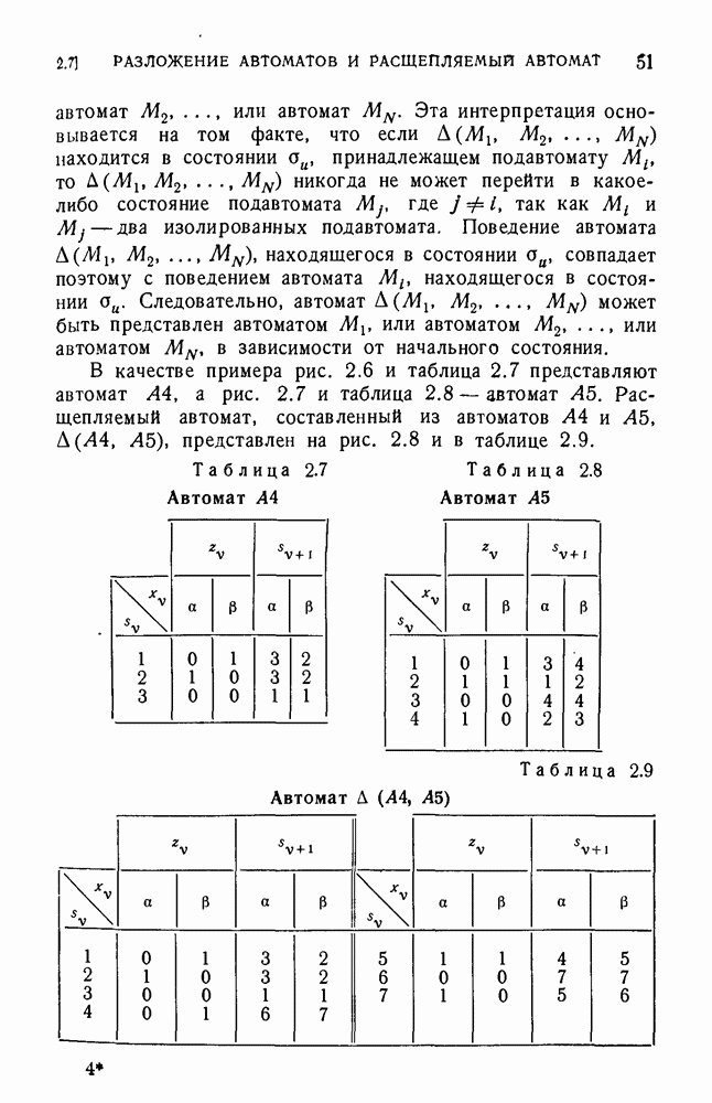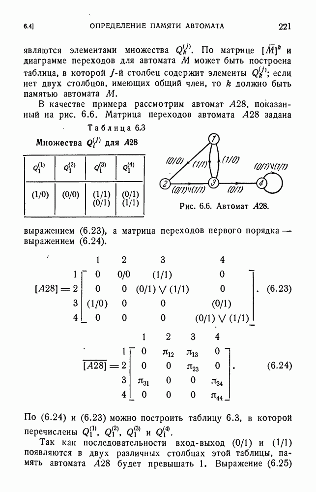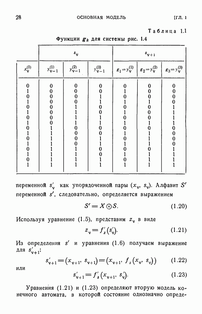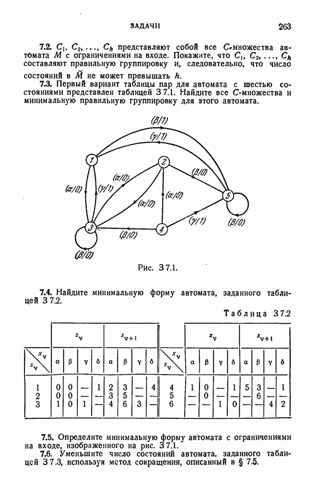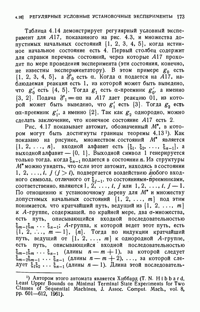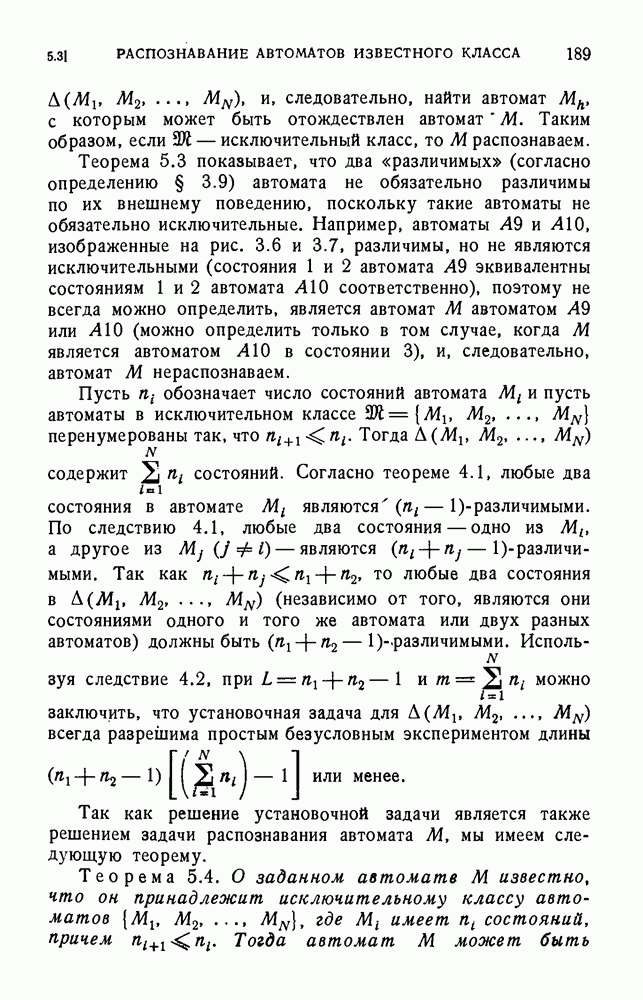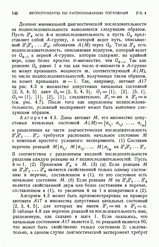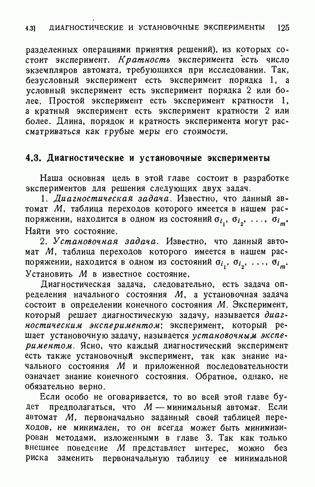 В предыдущих главах было подчеркнуто, что в конечных автоматах не нужно ни наблюдать, ни интересоваться физической природой состояний. Единственная функция состояний заключается в том, чтобы участвовать в определении зависимостей между входами и выходами автомата. Следовательно, любое множество состояний, выполняющих эту функцию, является приемлемым независимо от того, выражают эти состояния какой-либо интуитивный смысл или нет. Эта свобода выбора множества состояний весьма выгодна, поскольку она позволяет заменять одно множество другим, что может оказаться удобным для многих цеей. В частности, она позволяет найти оптимальное или минимальное, в том или другом смысле, множество состояний. При всех таких рассмотрениях понятие «эквивалентности» играет главную роль. Как станет видно из дальнейшего, это понятие не только является фундаментальным для более точного и краткого определения конечных автоматов, но проливает новый свет на всю проблему анализа конечных автоматов (так же как и синтеза).