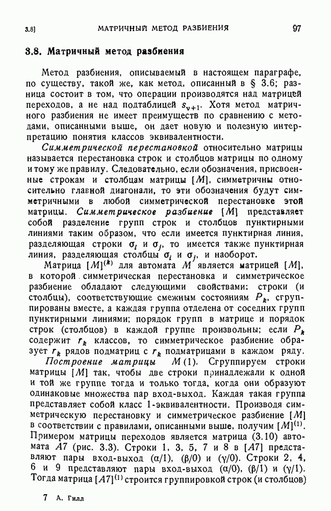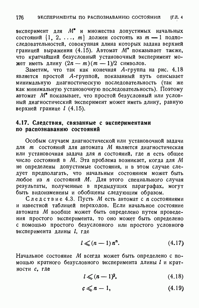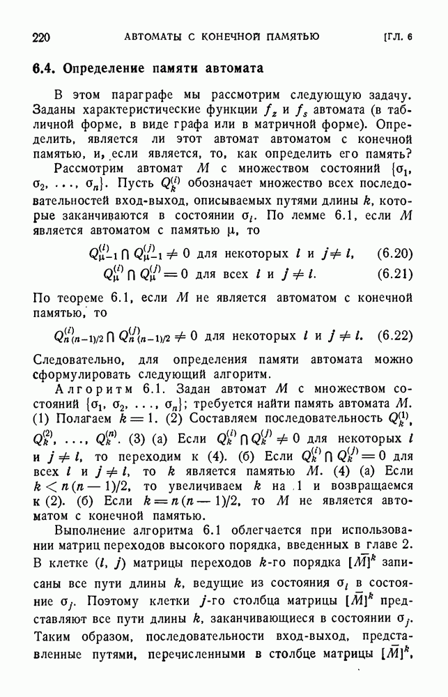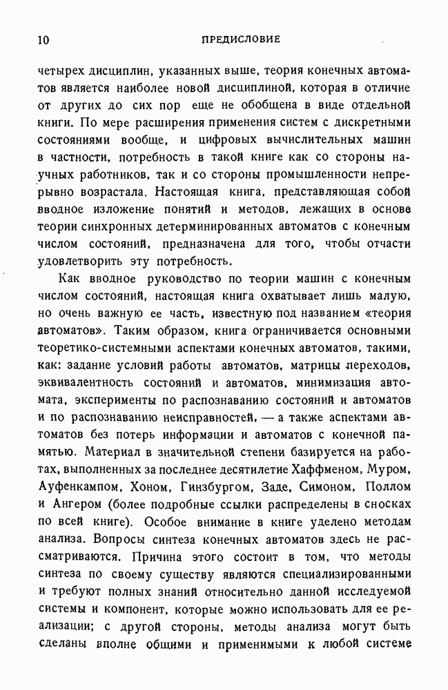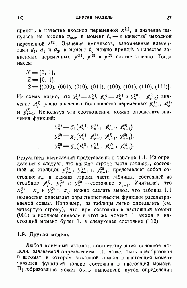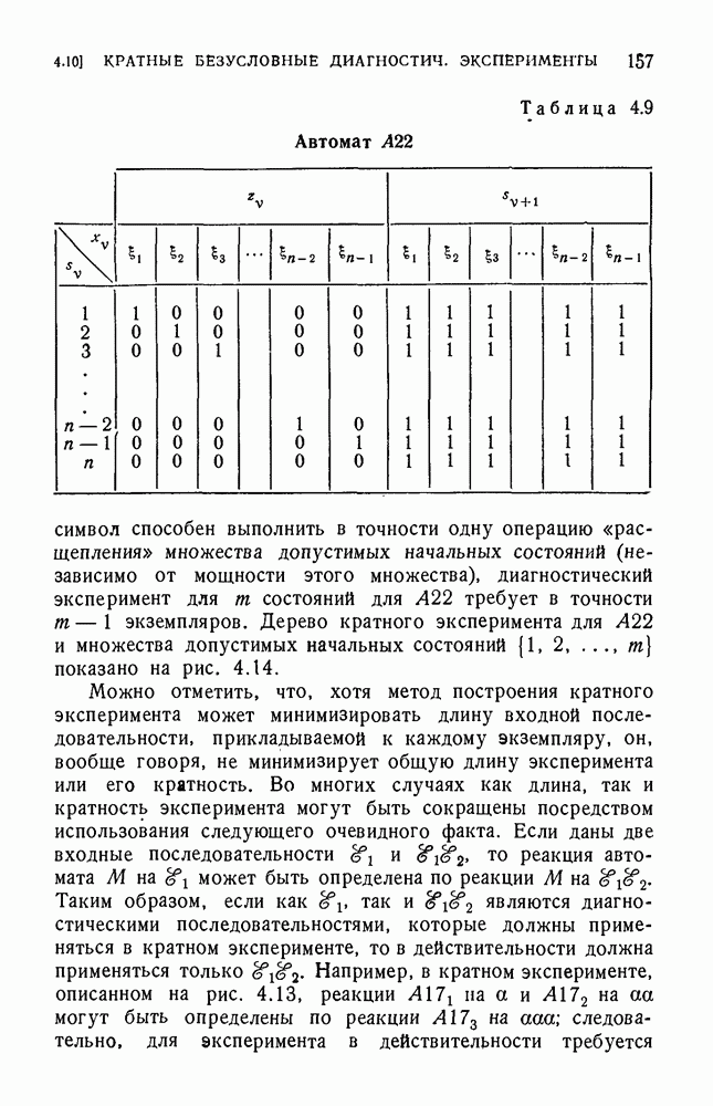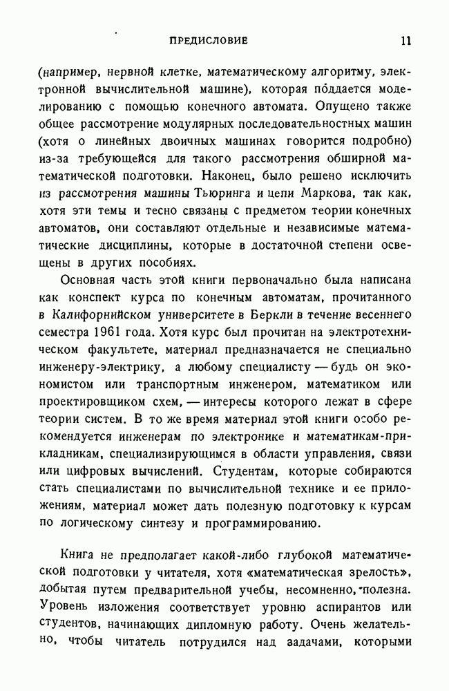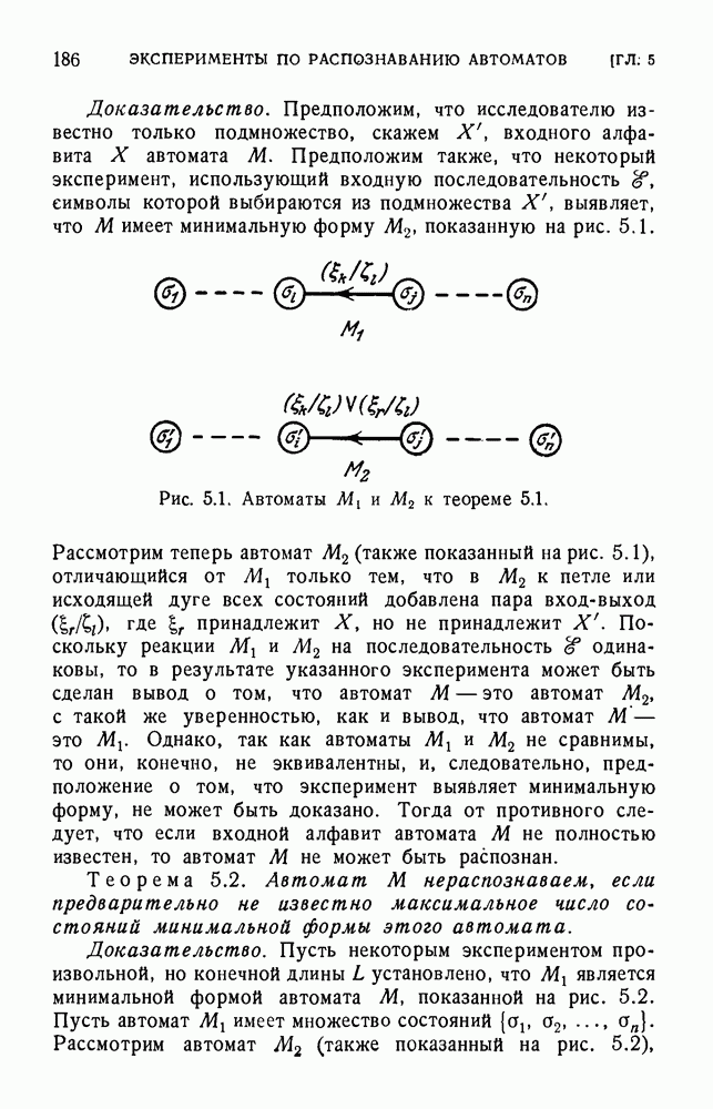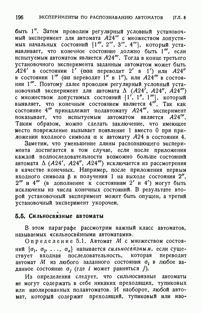 В предыдущих главах было подчеркнуто, что в конечных автоматах не нужно ни наблюдать, ни интересоваться физической природой состояний. Единственная функция состояний заключается в том, чтобы участвовать в определении зависимостей между входами и выходами автомата. Следовательно, любое множество состояний, выполняющих эту функцию, является приемлемым независимо от того, выражают эти состояния какой-либо интуитивный смысл или нет. Эта свобода выбора множества состояний весьма выгодна, поскольку она позволяет заменять одно множество другим, что может оказаться удобным для многих цеей. В частности, она позволяет найти оптимальное или минимальное, в том или другом смысле, множество состояний. При всех таких рассмотрениях понятие «эквивалентности» играет главную роль. Как станет видно из дальнейшего, это понятие не только является фундаментальным для более точного и краткого определения конечных автоматов, но проливает новый свет на всю проблему анализа конечных автоматов (так же как и синтеза).