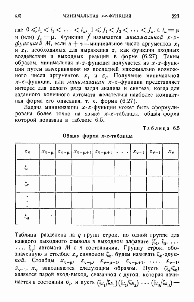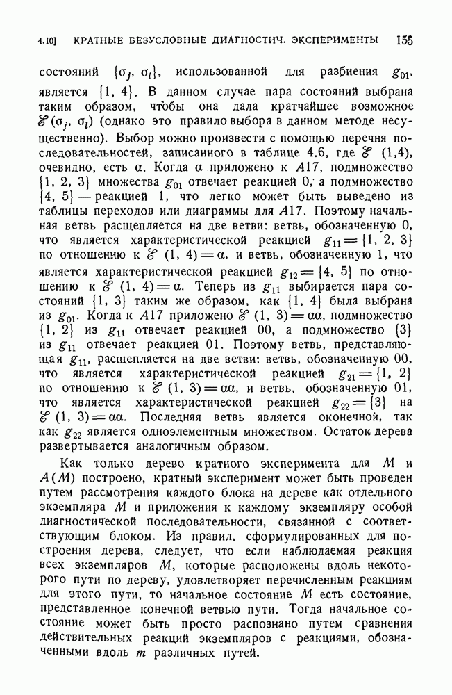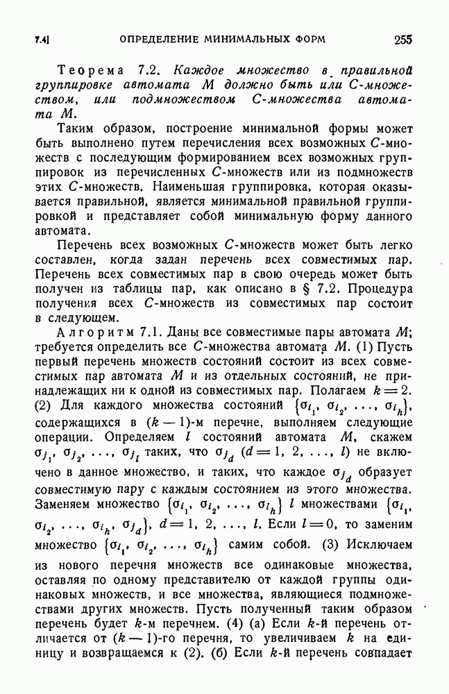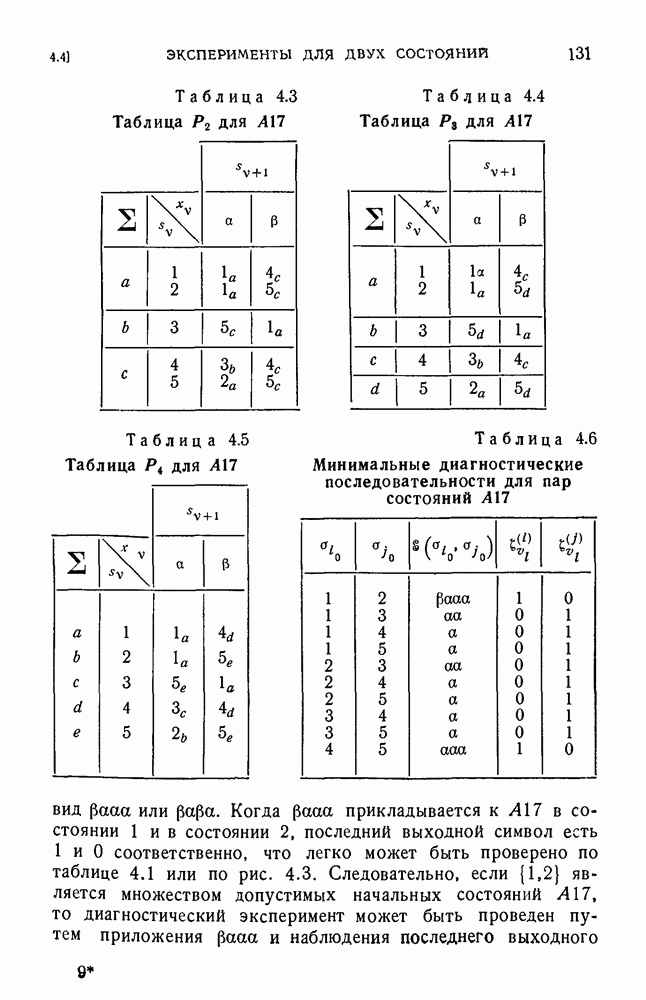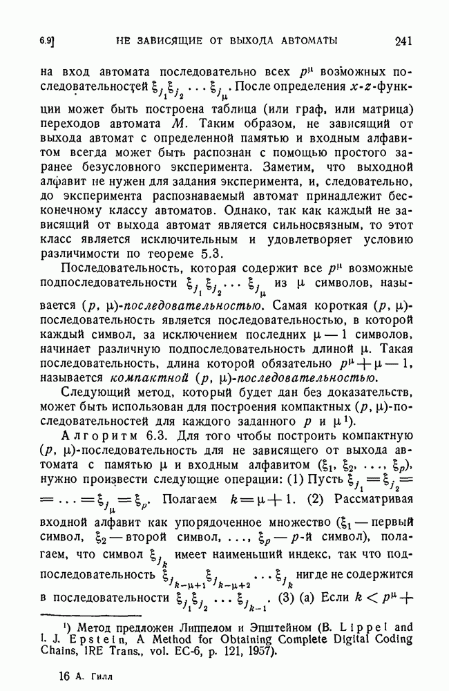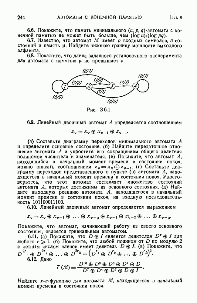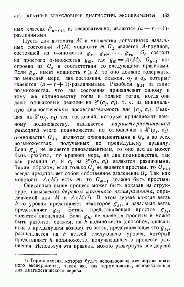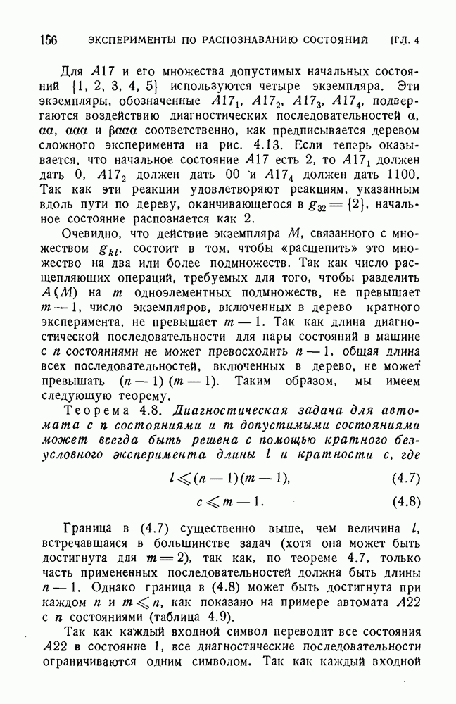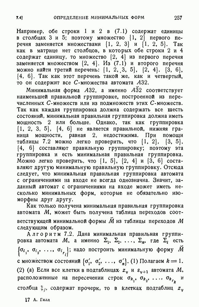 В предыдущих главах было подчеркнуто, что в конечных автоматах не нужно ни наблюдать, ни интересоваться физической природой состояний. Единственная функция состояний заключается в том, чтобы участвовать в определении зависимостей между входами и выходами автомата. Следовательно, любое множество состояний, выполняющих эту функцию, является приемлемым независимо от того, выражают эти состояния какой-либо интуитивный смысл или нет. Эта свобода выбора множества состояний весьма выгодна, поскольку она позволяет заменять одно множество другим, что может оказаться удобным для многих цеей. В частности, она позволяет найти оптимальное или минимальное, в том или другом смысле, множество состояний. При всех таких рассмотрениях понятие «эквивалентности» играет главную роль. Как станет видно из дальнейшего, это понятие не только является фундаментальным для более точного и краткого определения конечных автоматов, но проливает новый свет на всю проблему анализа конечных автоматов (так же как и синтеза).