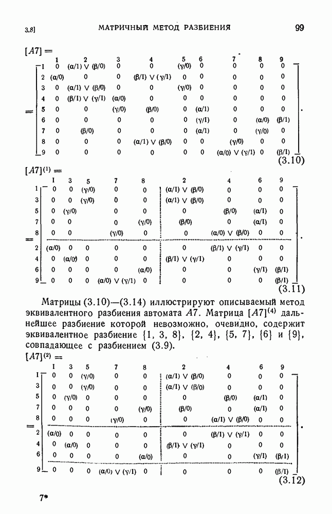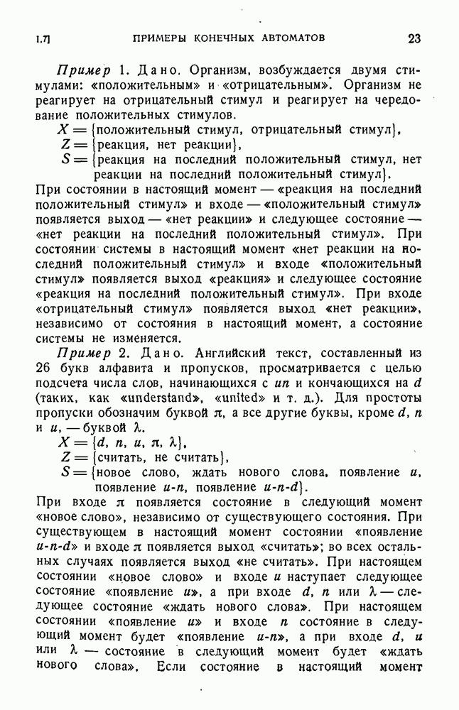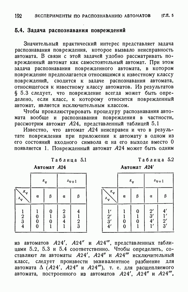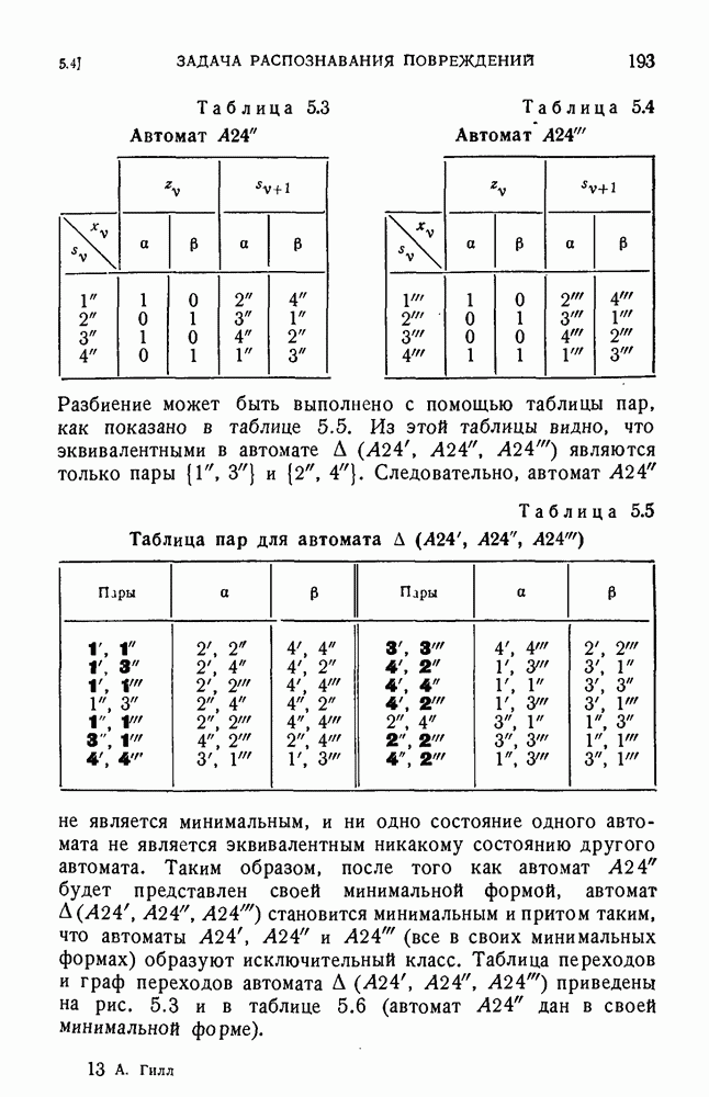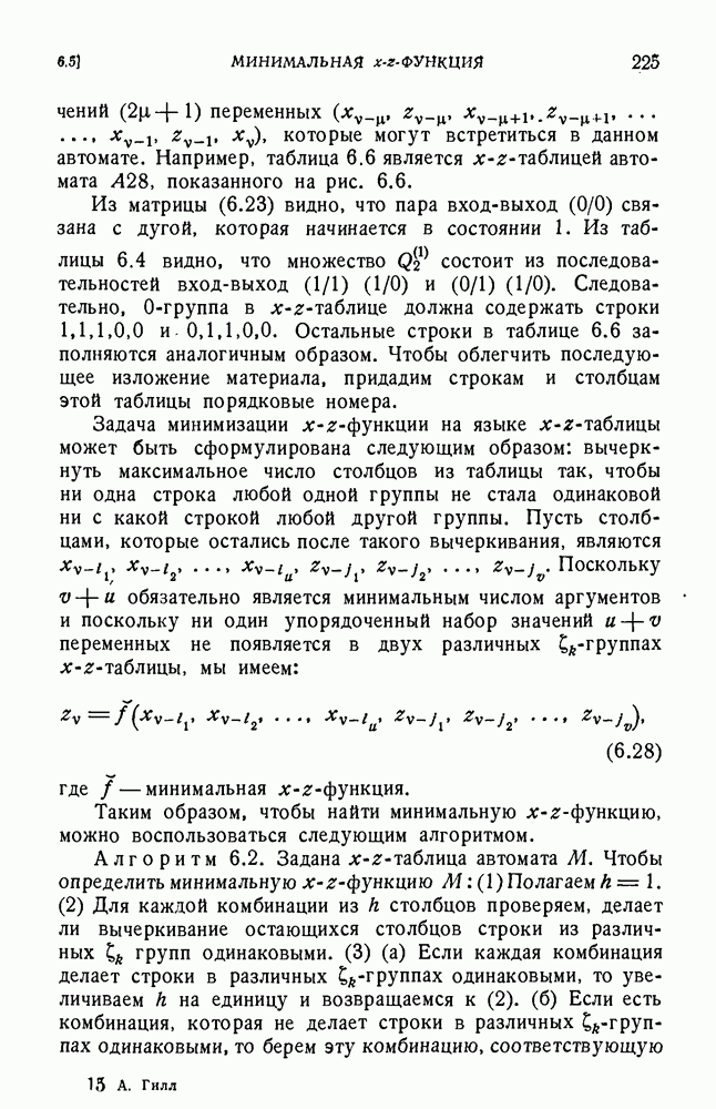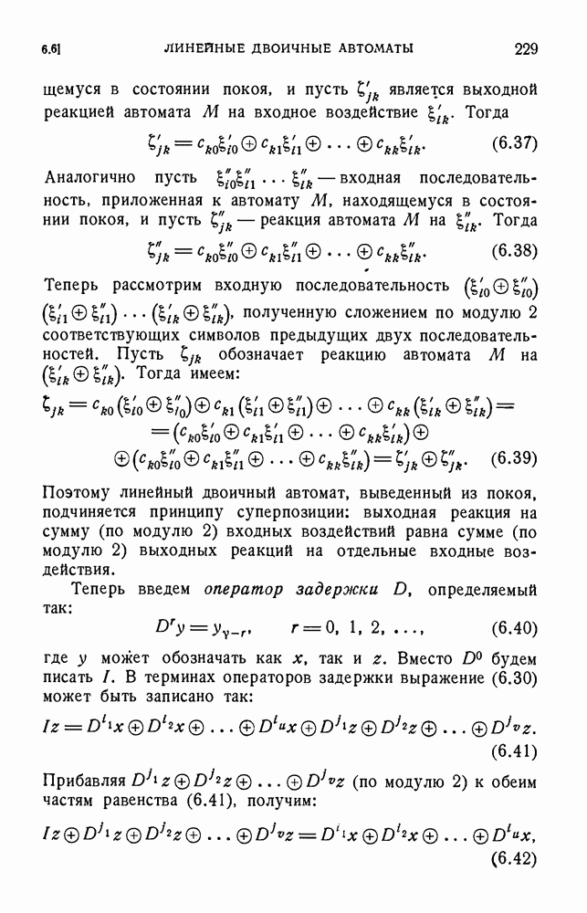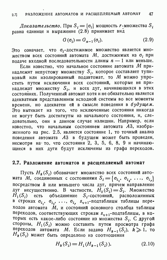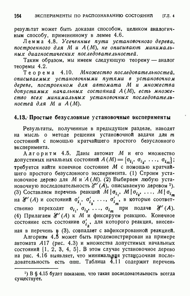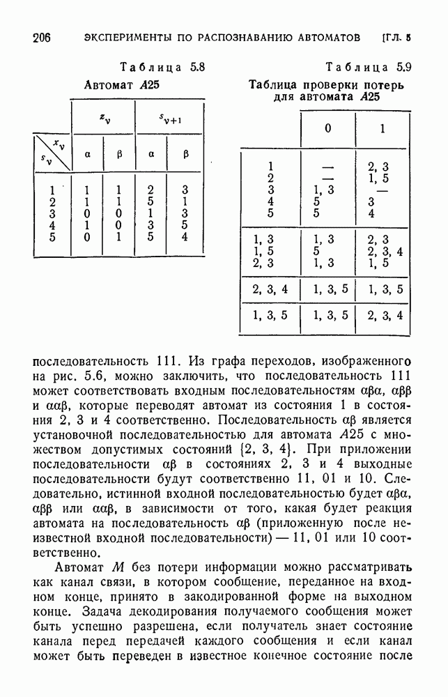 В предыдущих главах было подчеркнуто, что в конечных автоматах не нужно ни наблюдать, ни интересоваться физической природой состояний. Единственная функция состояний заключается в том, чтобы участвовать в определении зависимостей между входами и выходами автомата. Следовательно, любое множество состояний, выполняющих эту функцию, является приемлемым независимо от того, выражают эти состояния какой-либо интуитивный смысл или нет. Эта свобода выбора множества состояний весьма выгодна, поскольку она позволяет заменять одно множество другим, что может оказаться удобным для многих цеей. В частности, она позволяет найти оптимальное или минимальное, в том или другом смысле, множество состояний. При всех таких рассмотрениях понятие «эквивалентности» играет главную роль. Как станет видно из дальнейшего, это понятие не только является фундаментальным для более точного и краткого определения конечных автоматов, но проливает новый свет на всю проблему анализа конечных автоматов (так же как и синтеза).