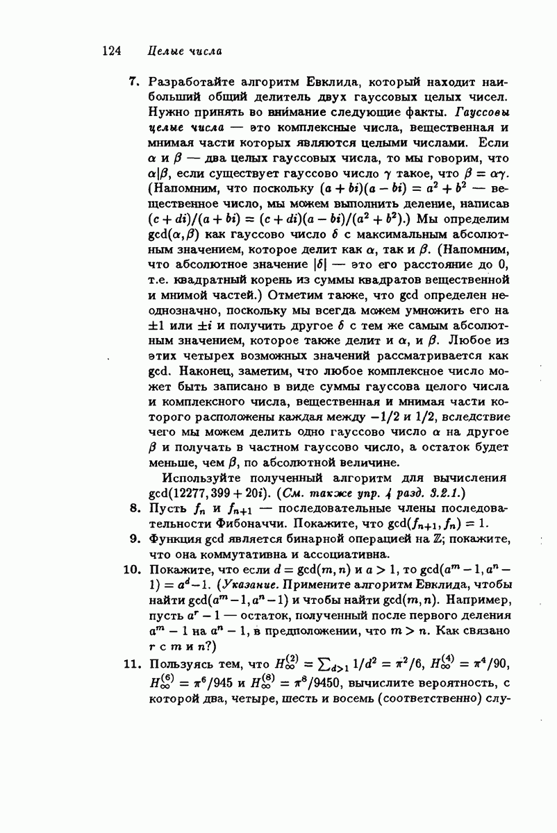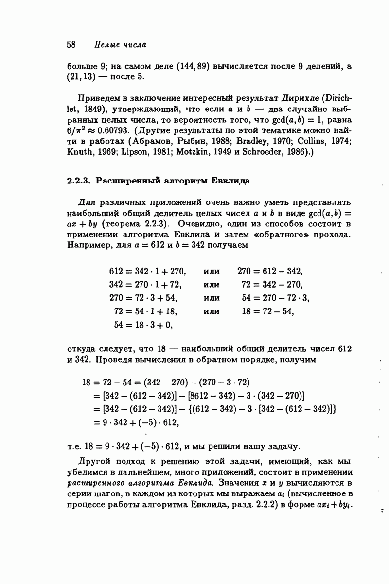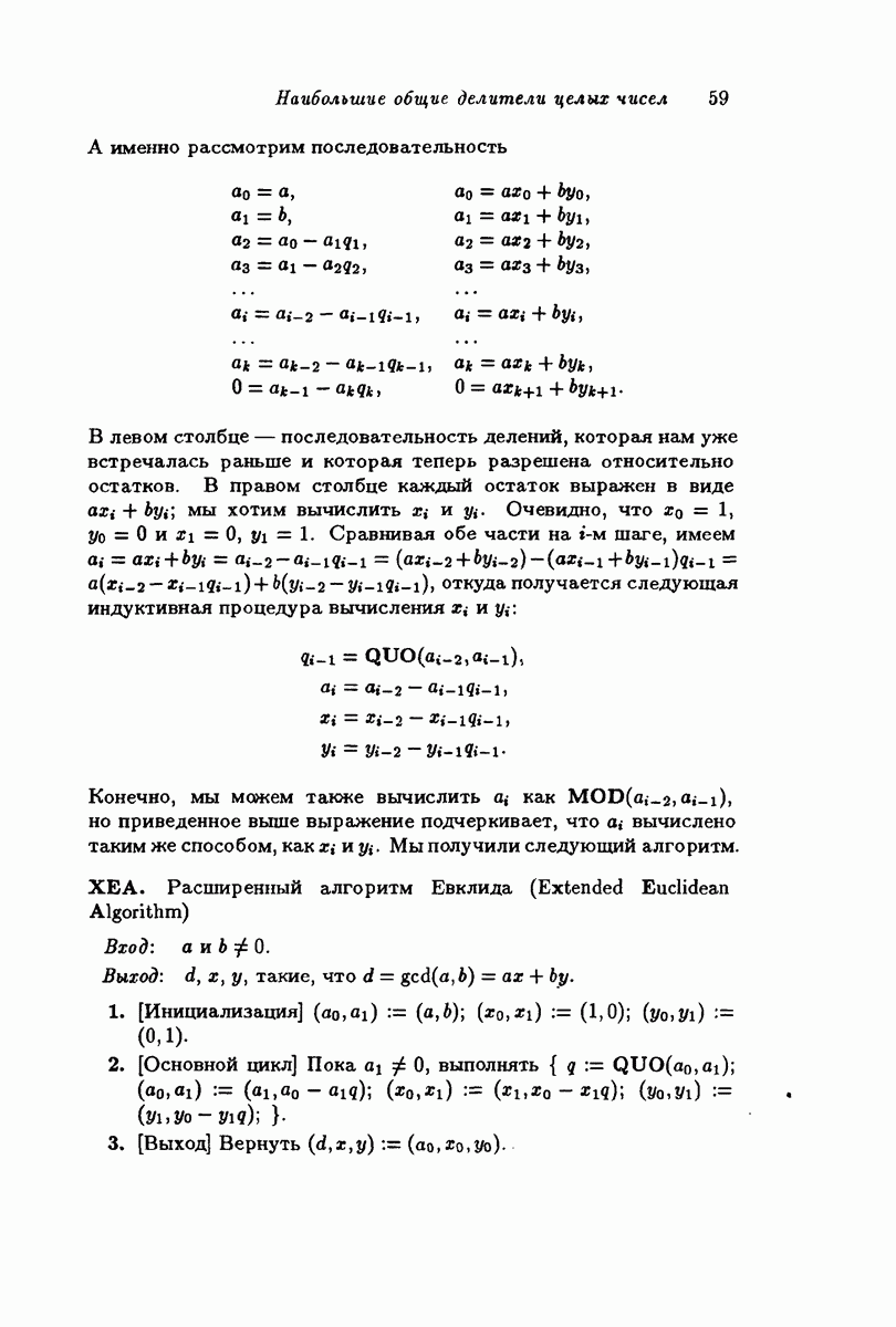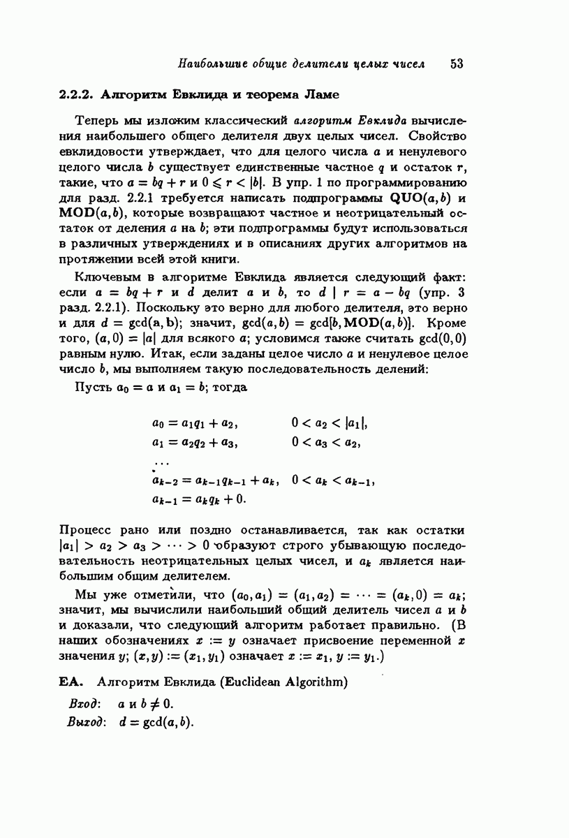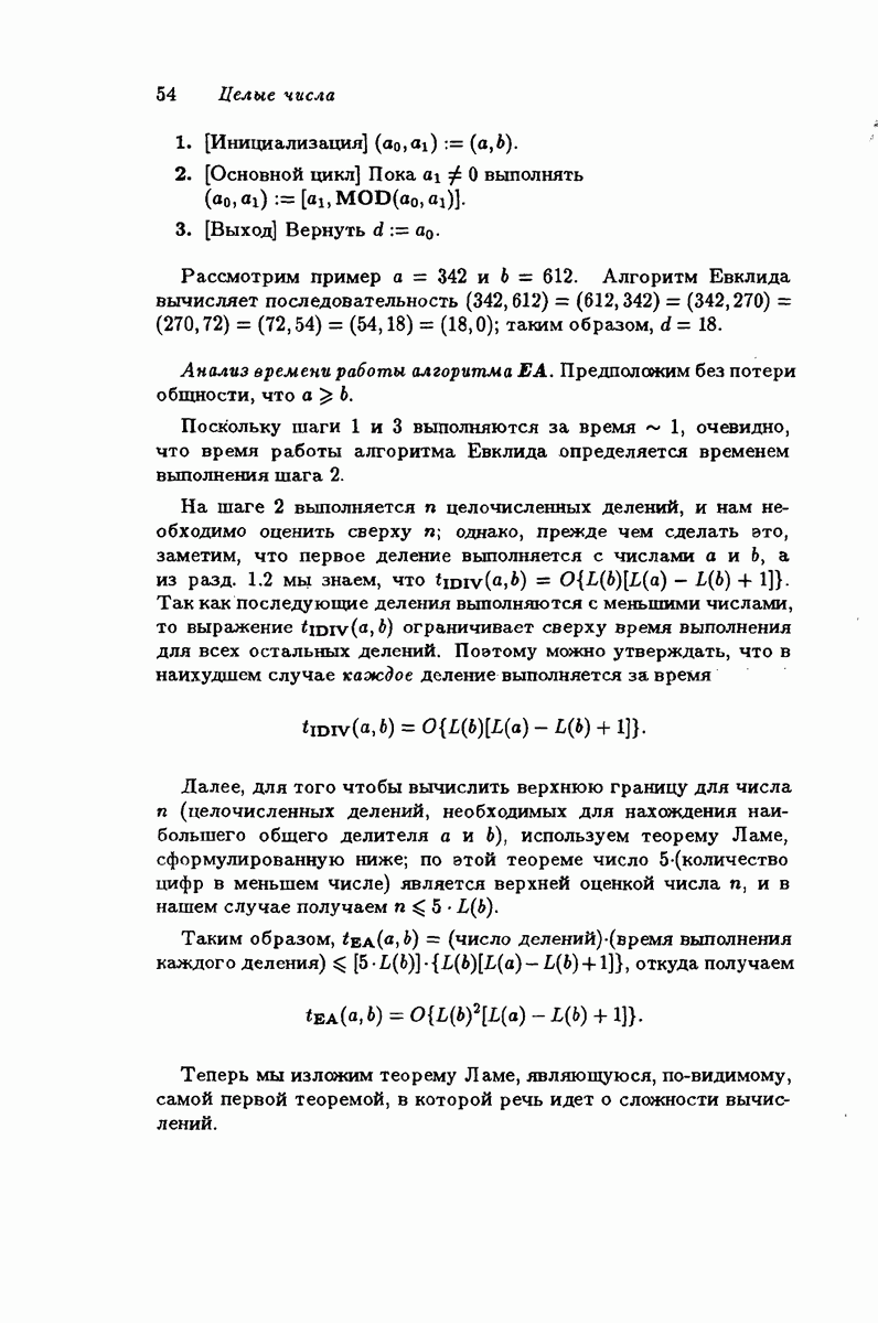 Вычисление наибольшего общего делителя целых чисел — одна из старейших задач, исследованных математиками; предложенный Евклидом метод ее решения является самым древним из существующих теоретико-числовых алгоритмов. В этом разделе мы рассмотрим алгоритм Евклида и близкие вопросы.