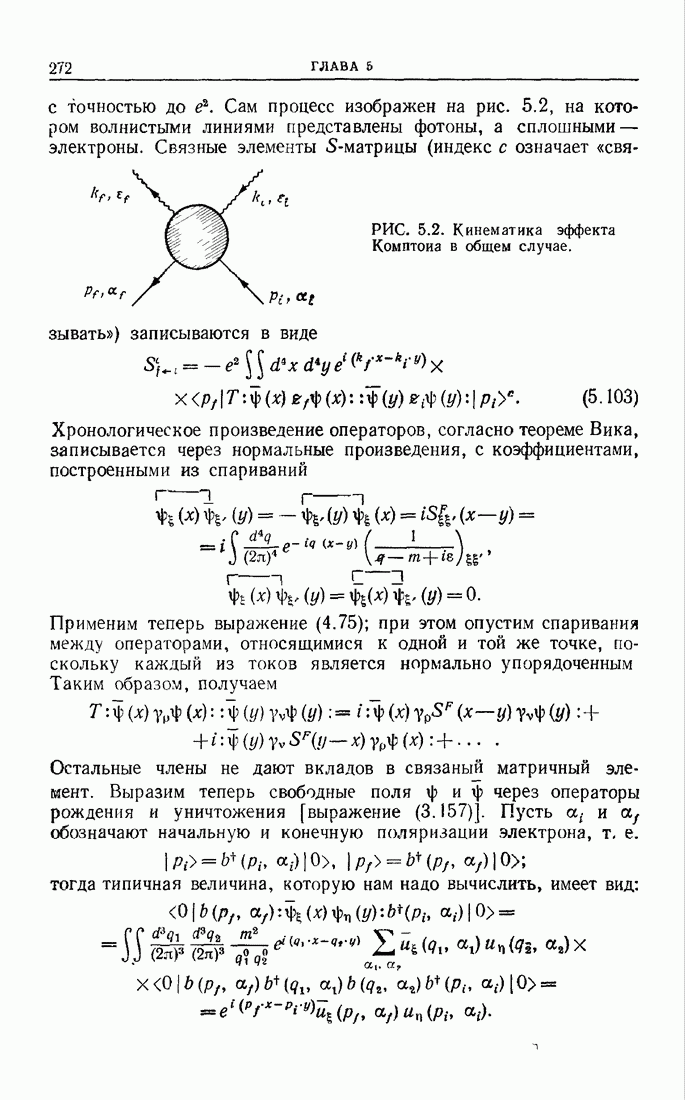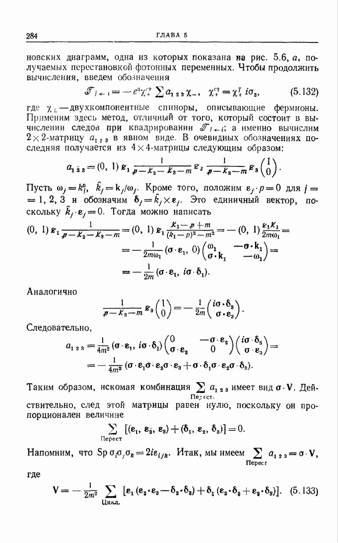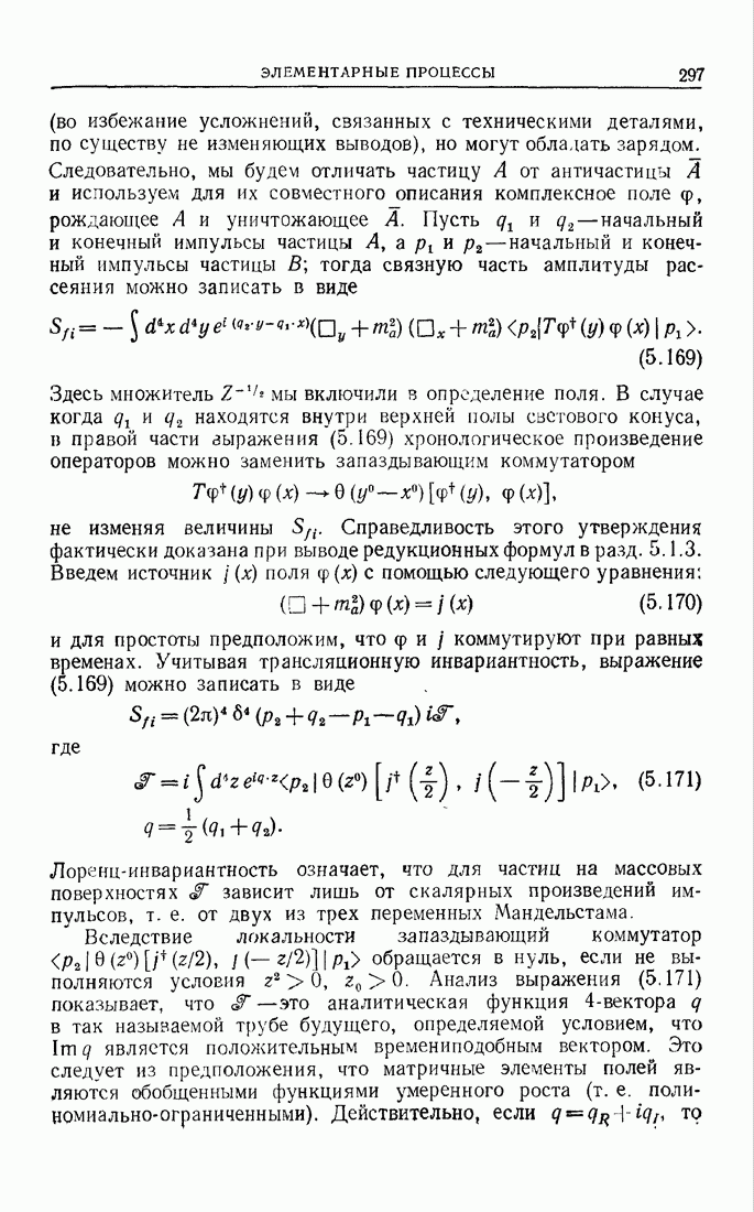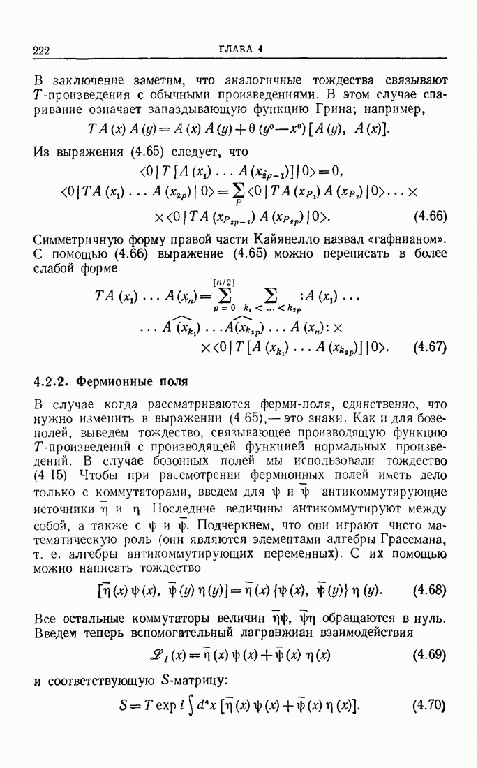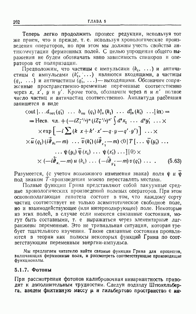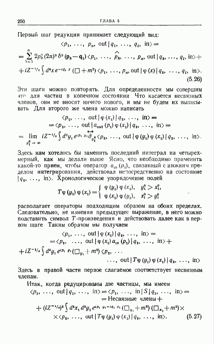 эта подстановка рассматривалась нами в случае дырочной теории (см гл. 2) Позитрон в конечном состоянии эквивалентен электрону в начальном состоянии, имеющему противоположный знак энергии и импульса. Это замечание справедливо по отношению к (5.62б) и (5.62в). Теперь легко продолжить процесс редукции, используя тот же прием, что и прежде, т. е. используя хронологические произведения операторов, но при этом мы должны учесть свойства антикоммутации фермионных полей. С целью упрощения общего выражения не будем обозначать явно зависимость спиноров и операторов от поляризации. Предположим, что частицы с импульсами