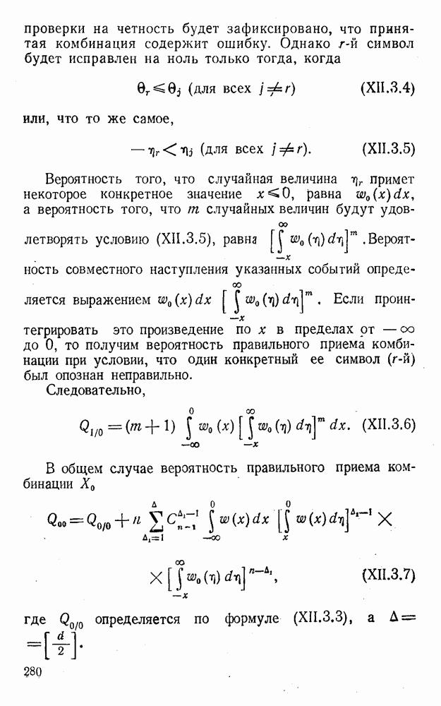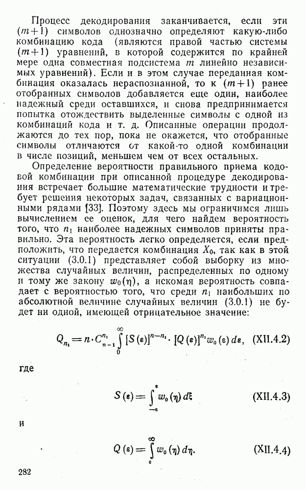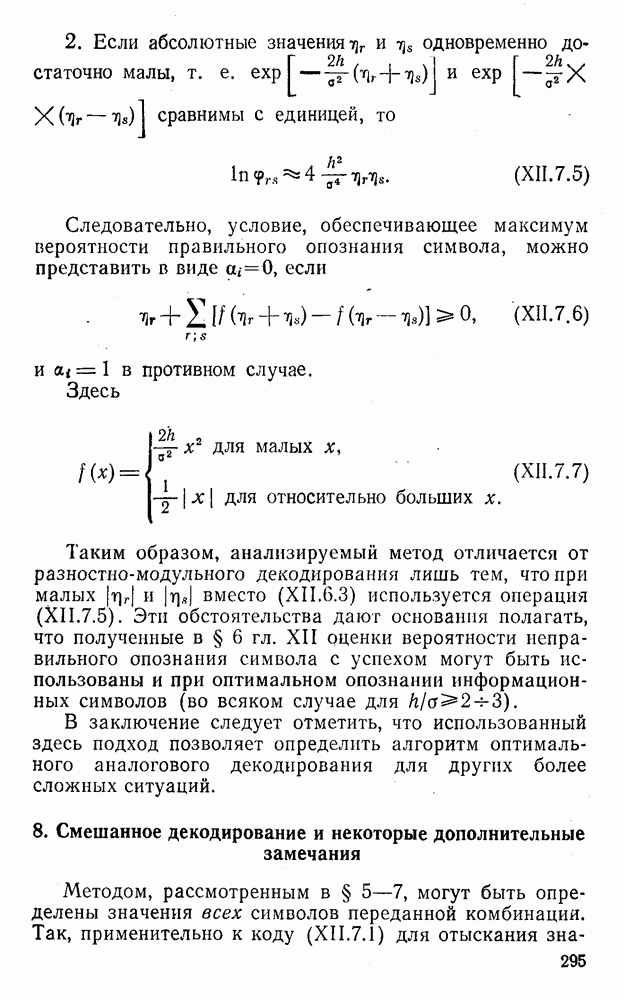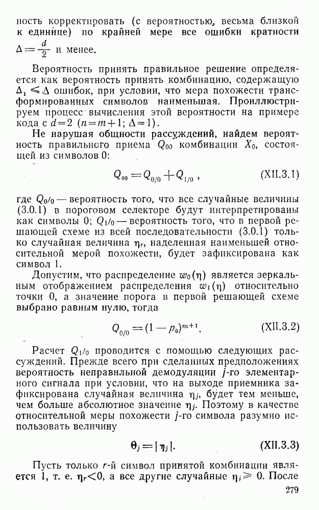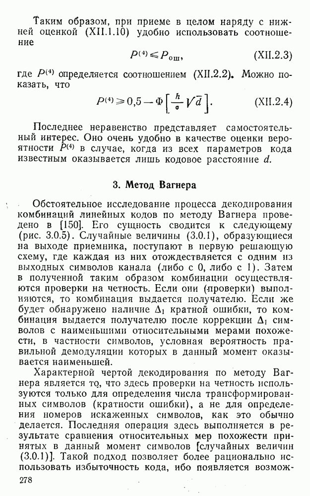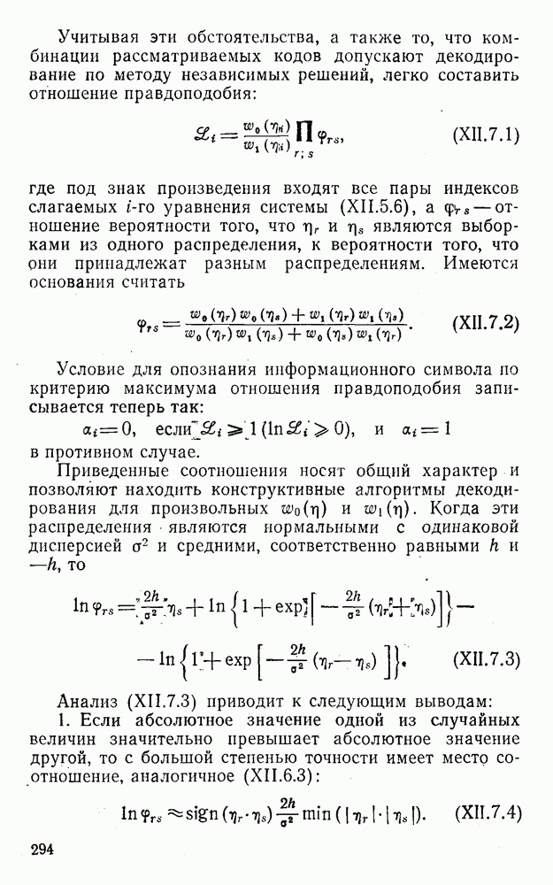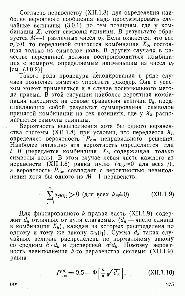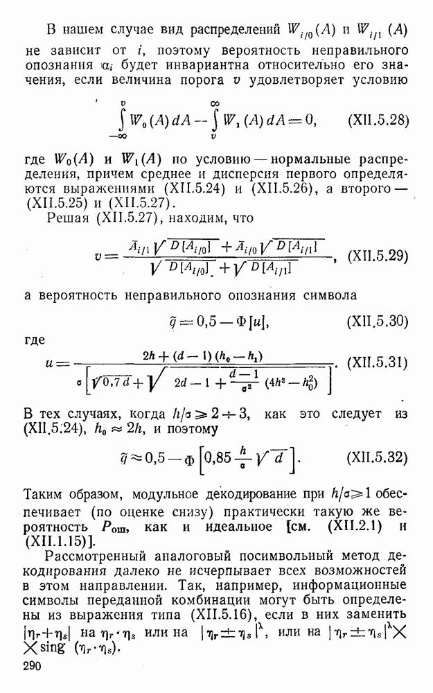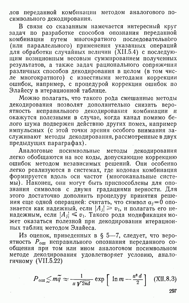 вместо (XII.6.3) используется операция (XII.7.5). Эти обстоятельства дают основания полагать, что полученные в § 6 гл. XII оценки вероятности неправильного опознания символа с успехом могут быть использованы и при оптимальном опознании информационных символов (во всяком случае для
