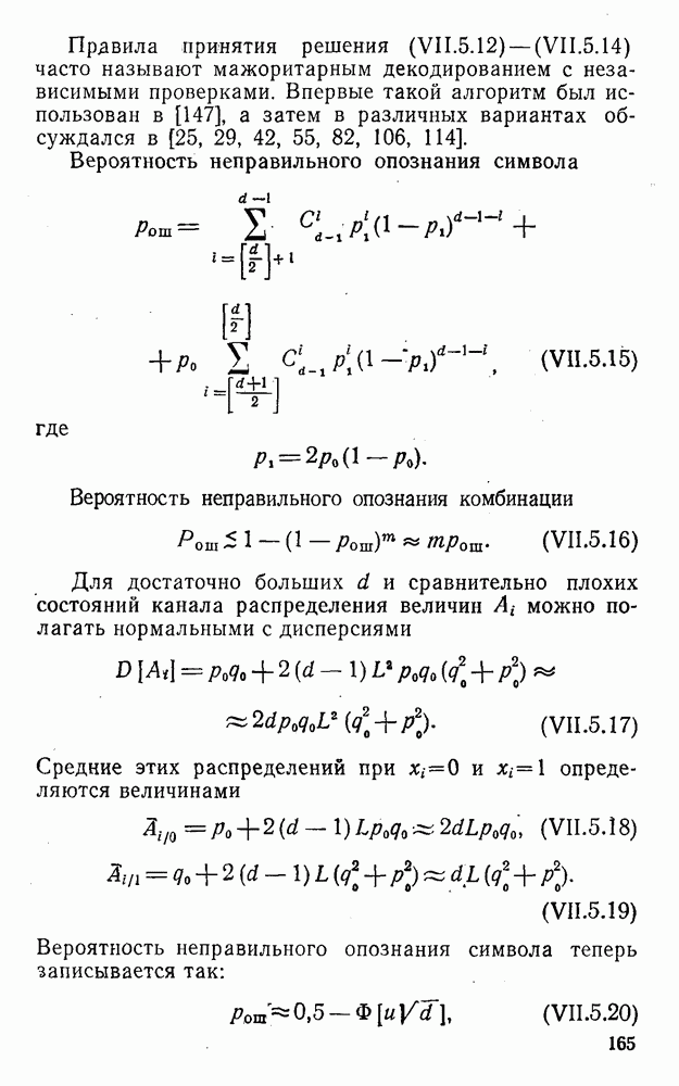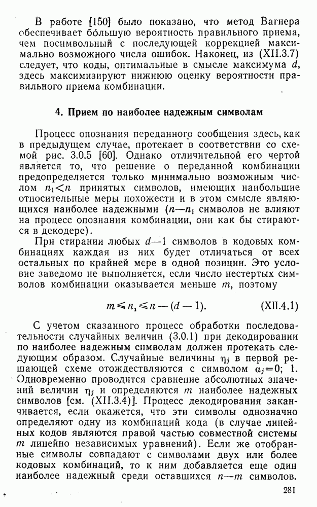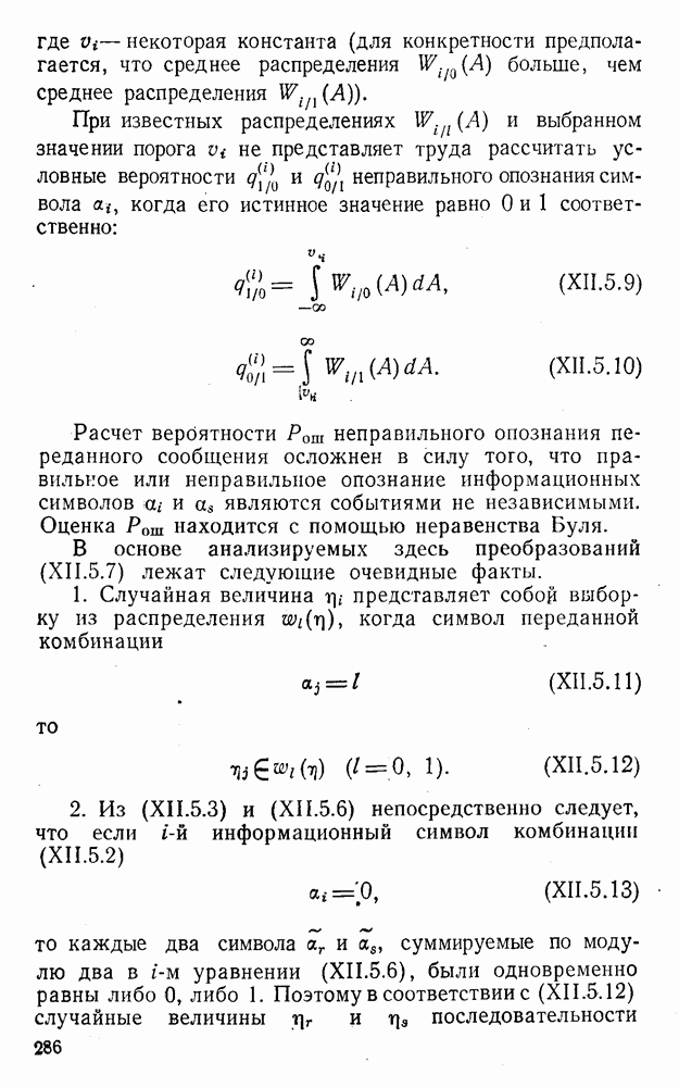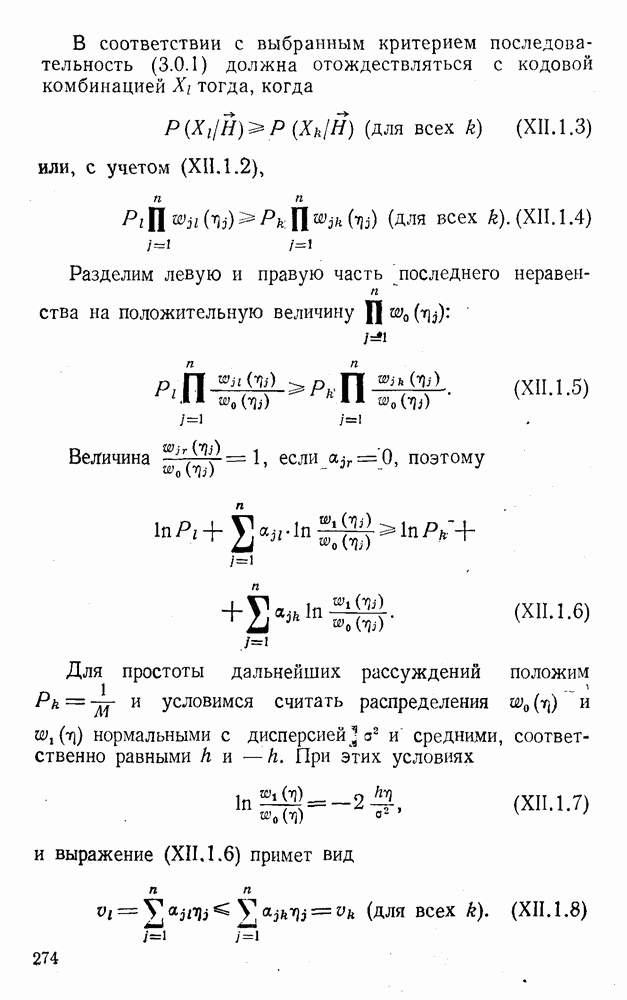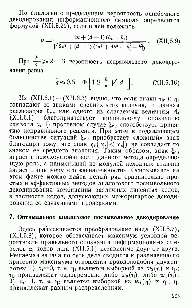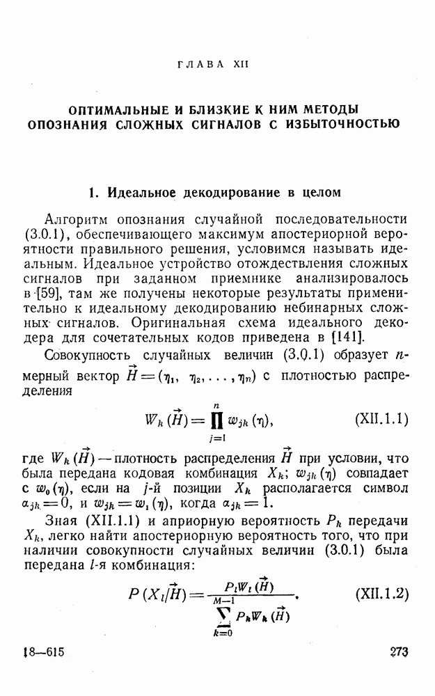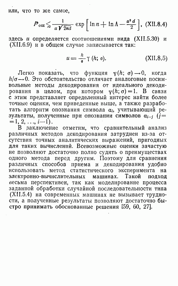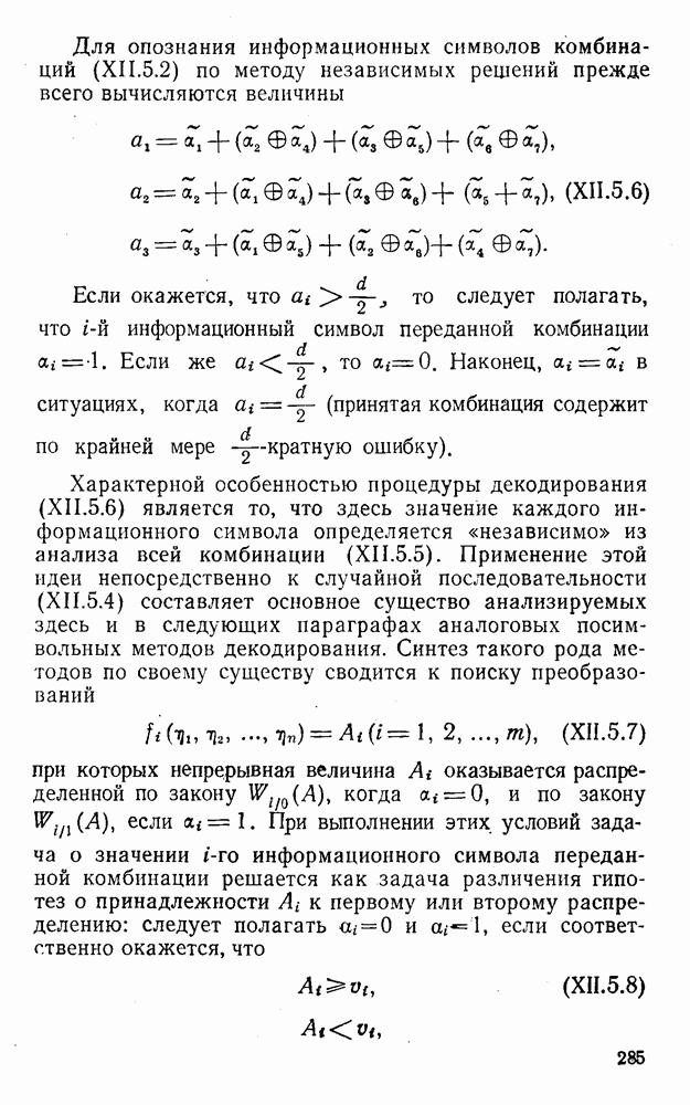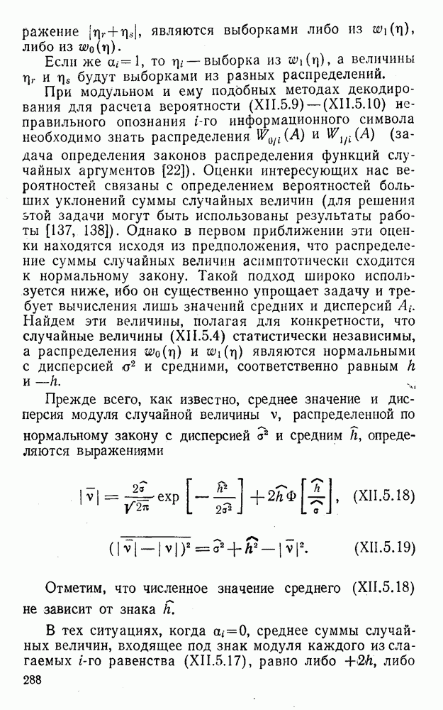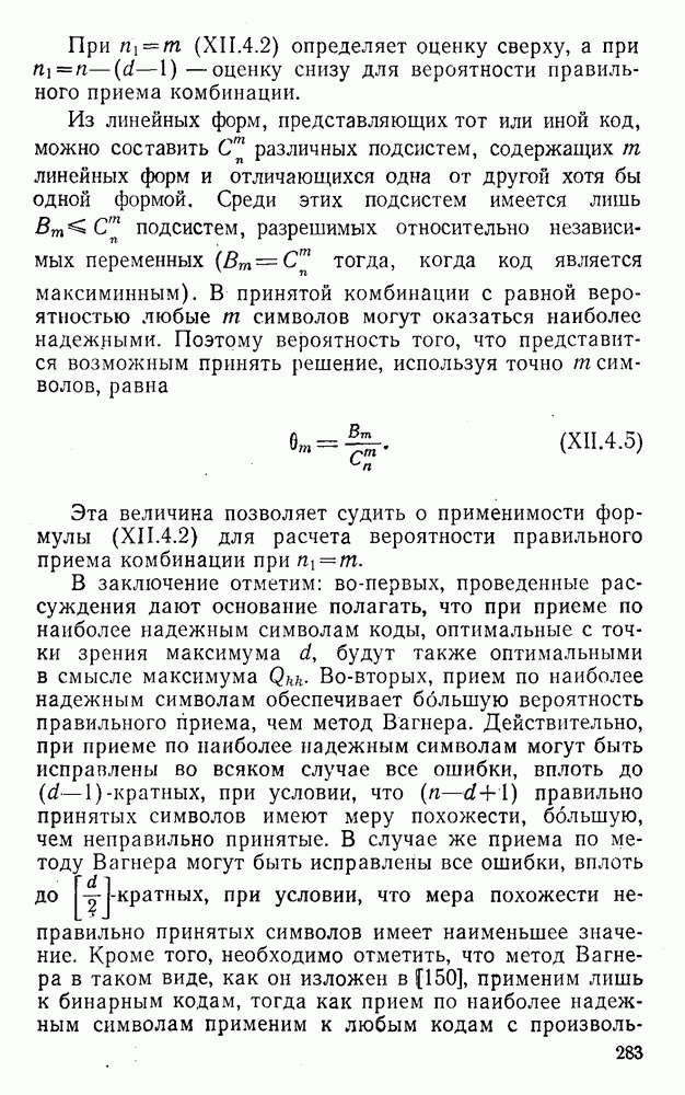 вместо (XII.6.3) используется операция (XII.7.5). Эти обстоятельства дают основания полагать, что полученные в § 6 гл. XII оценки вероятности неправильного опознания символа с успехом могут быть использованы и при оптимальном опознании информационных символов (во всяком случае для