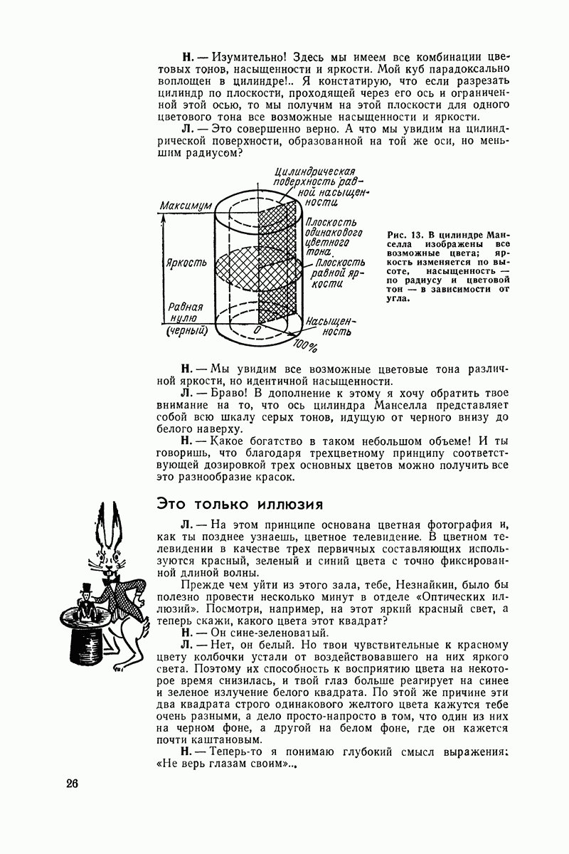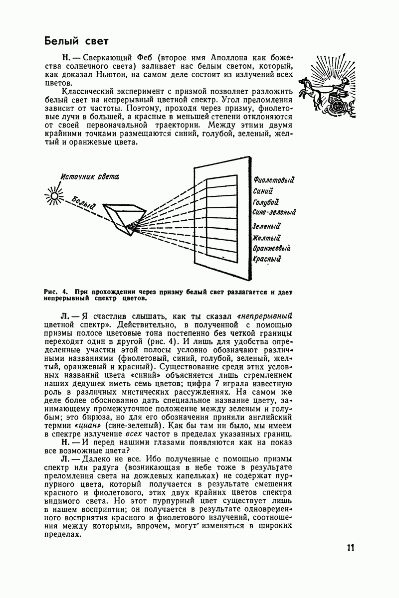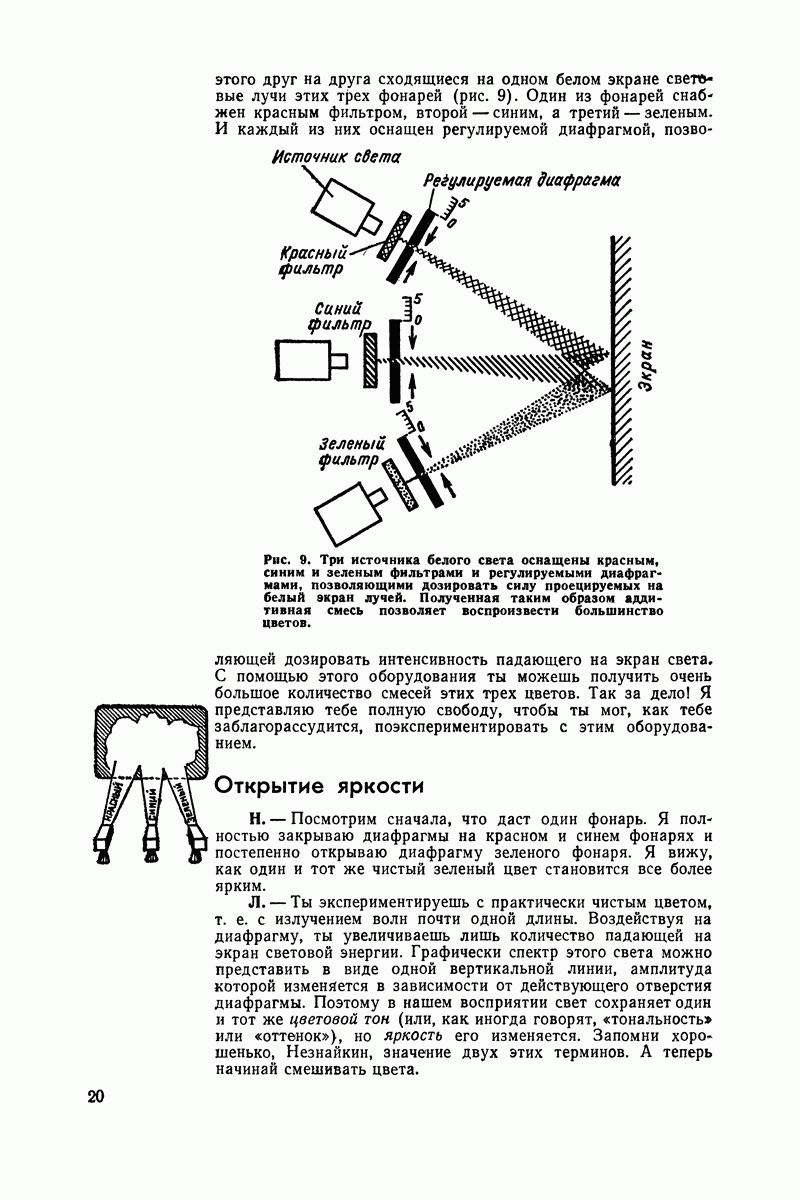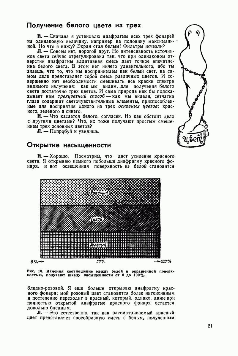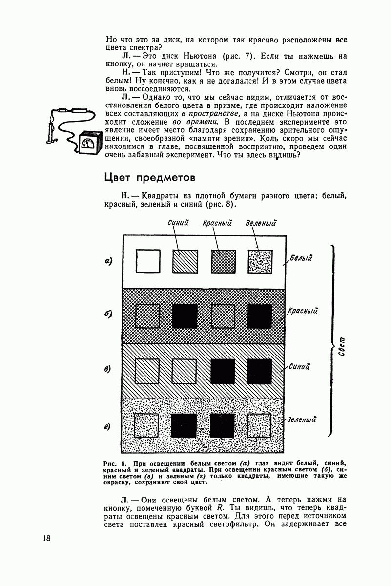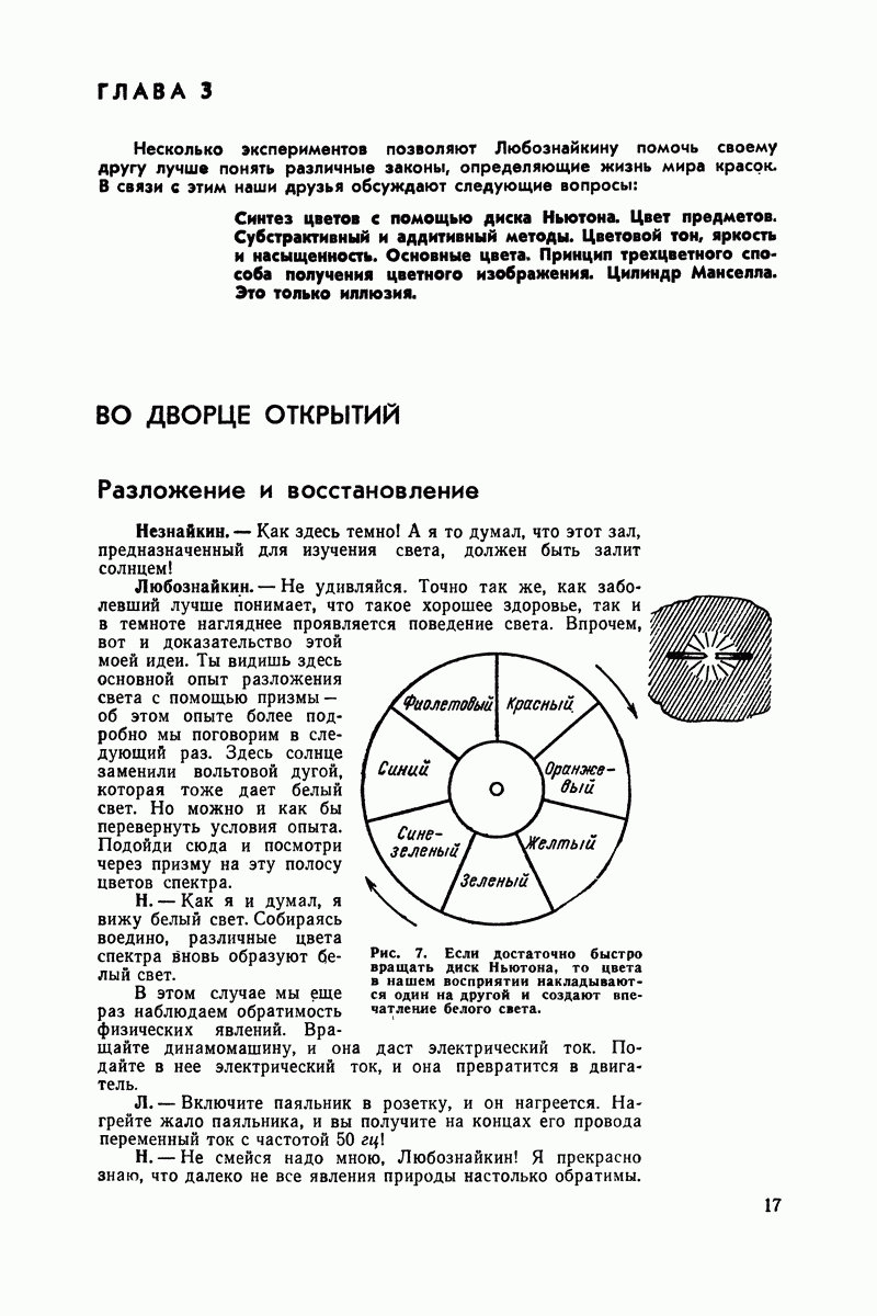 ГЛАВА 3Несколько экспериментов позволяют Любознайкину помочь своему другу лучше понять различные законы, определяющие жизнь мира красок. В связи с этим наши друзья обсуждают следующие вопросы: Синтез цветов с помощью диска Ньютона. Цвет предметов. Субстрактивный и аддитивный методы. Цветовой тон, яркость и насыщенность. Основные цвета. Принцип трехцветного способа получения цветного изображения. Цилиндр Манселла. Это только иллюзия. ВО ДВОРЦЕ ОТКРЫТИЙРазложение и восстановлениеНезнайкин. — Как здесь темно! А я то думал, что этот зал, предназначенный для изучения света, должен быть залит солнцем! Любознайкин. — Не удивляйся. Точно так же, как заболевший лучше понимает, что такое хорошее здоровье, так и в темноте нагляднее проявляется поведение света. Впрочем, вот и доказательство этой моей идеи. Ты видишь здесь основной опыт разложения света с помощью призмы — об этом опыте более подробно мы поговорим в следующий раз. Здесь солнце заменили вольтовой дугой, которая тоже дает белый свет. Но можно и как бы перевернуть условия опыта. Подойди сюда и посмотри через призму на эту полосу цветов спектра.