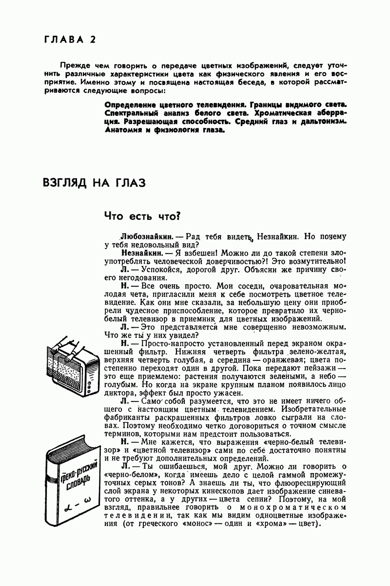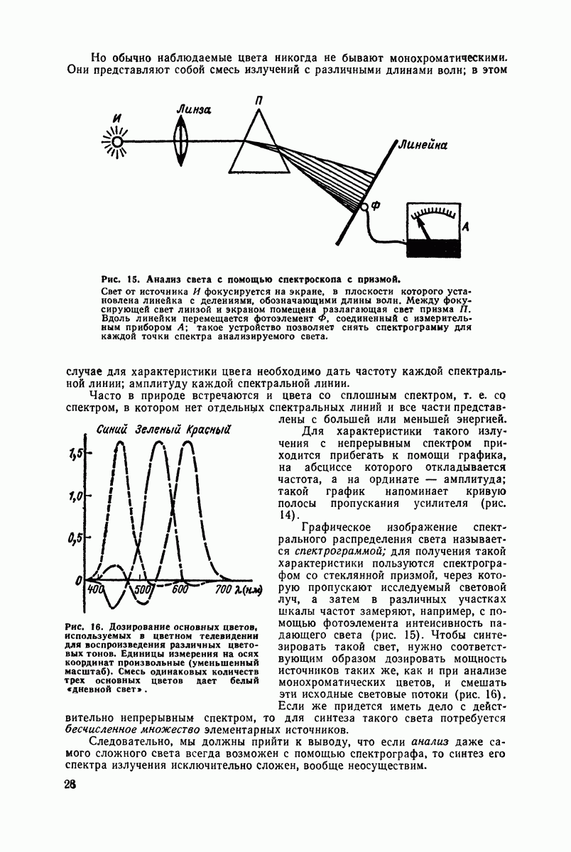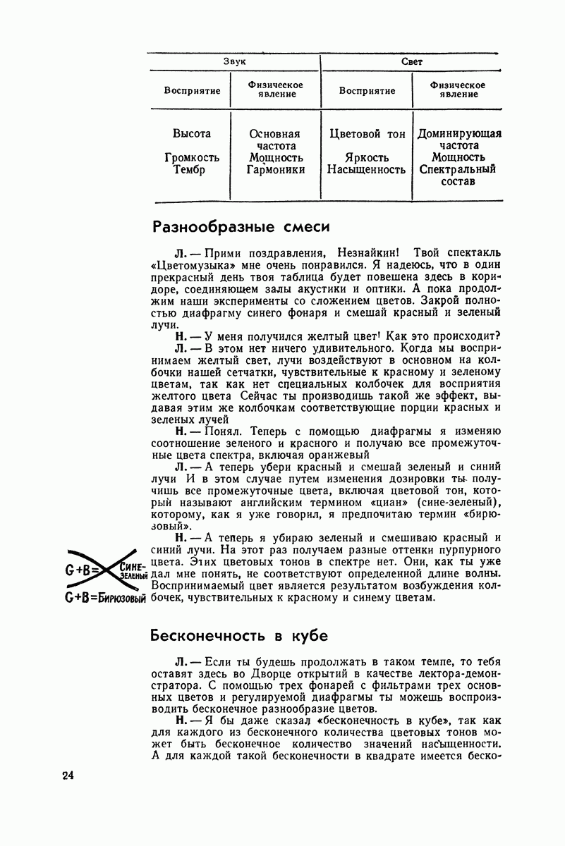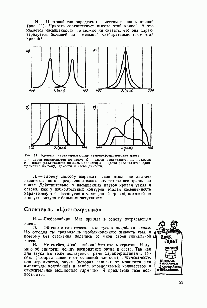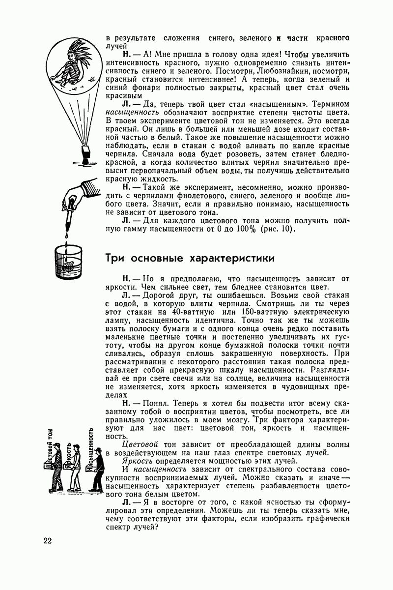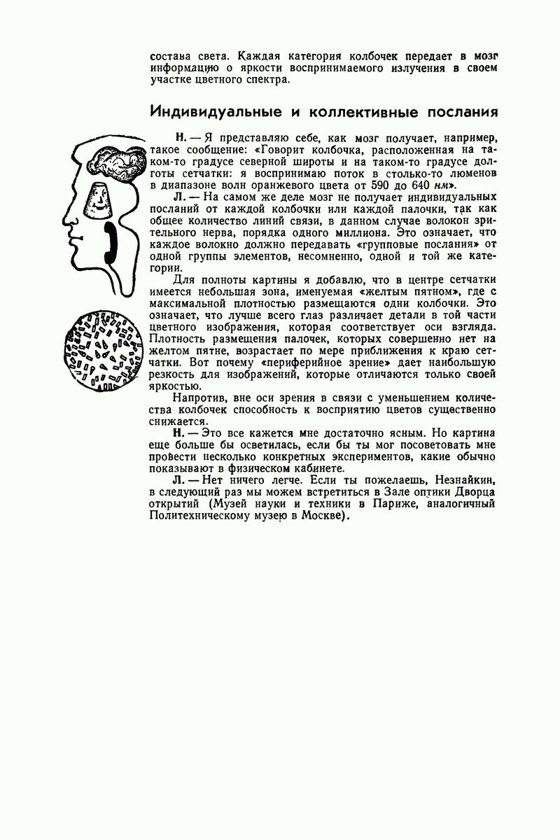 ГЛАВА 3Несколько экспериментов позволяют Любознайкину помочь своему другу лучше понять различные законы, определяющие жизнь мира красок. В связи с этим наши друзья обсуждают следующие вопросы: Синтез цветов с помощью диска Ньютона. Цвет предметов. Субстрактивный и аддитивный методы. Цветовой тон, яркость и насыщенность. Основные цвета. Принцип трехцветного способа получения цветного изображения. Цилиндр Манселла. Это только иллюзия. ВО ДВОРЦЕ ОТКРЫТИЙРазложение и восстановлениеНезнайкин. — Как здесь темно! А я то думал, что этот зал, предназначенный для изучения света, должен быть залит солнцем! Любознайкин. — Не удивляйся. Точно так же, как заболевший лучше понимает, что такое хорошее здоровье, так и в темноте нагляднее проявляется поведение света. Впрочем, вот и доказательство этой моей идеи. Ты видишь здесь основной опыт разложения света с помощью призмы — об этом опыте более подробно мы поговорим в следующий раз. Здесь солнце заменили вольтовой дугой, которая тоже дает белый свет. Но можно и как бы перевернуть условия опыта. Подойди сюда и посмотри через призму на эту полосу цветов спектра.
