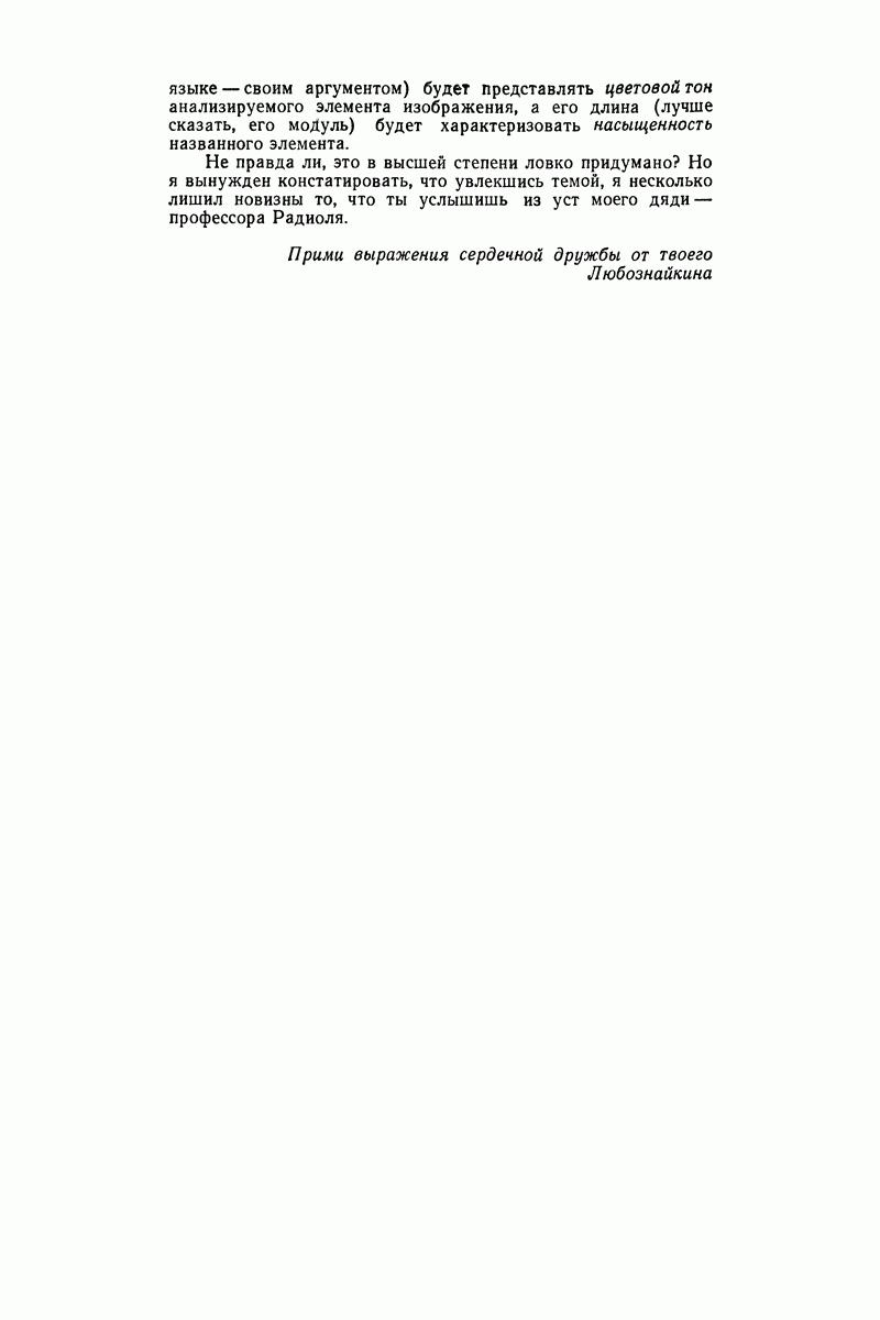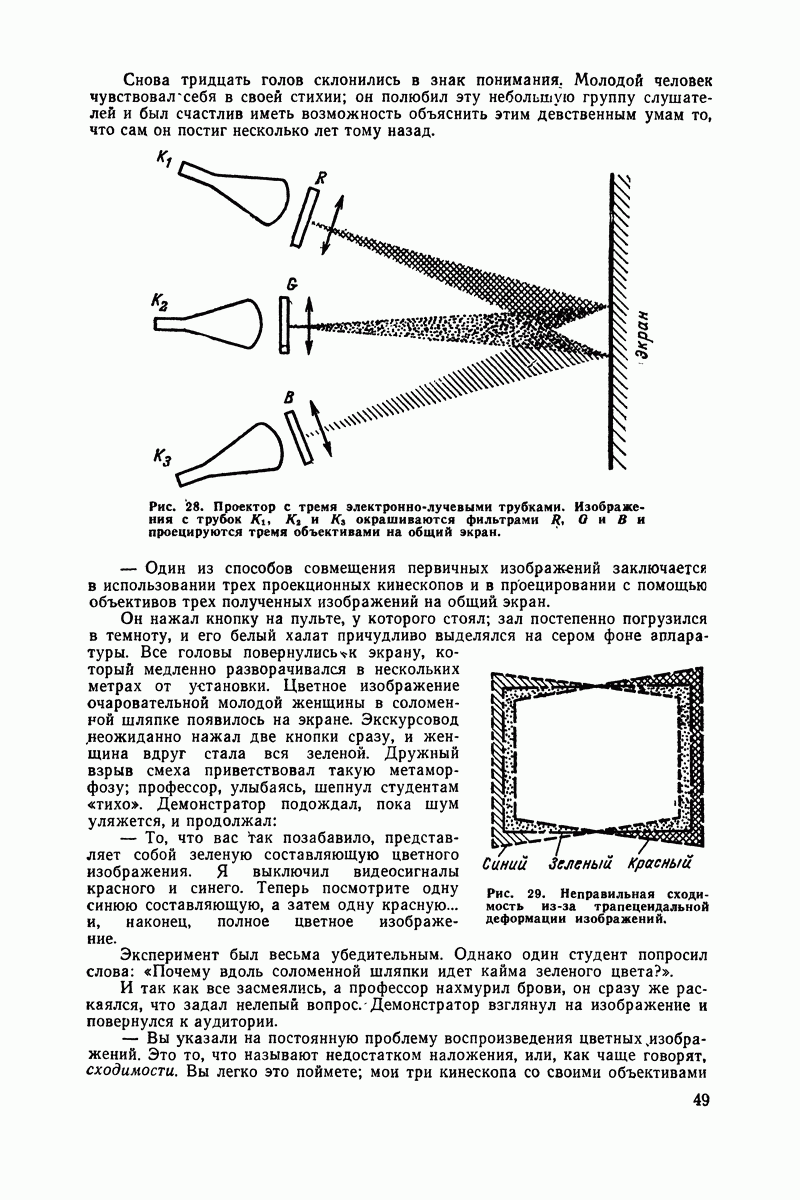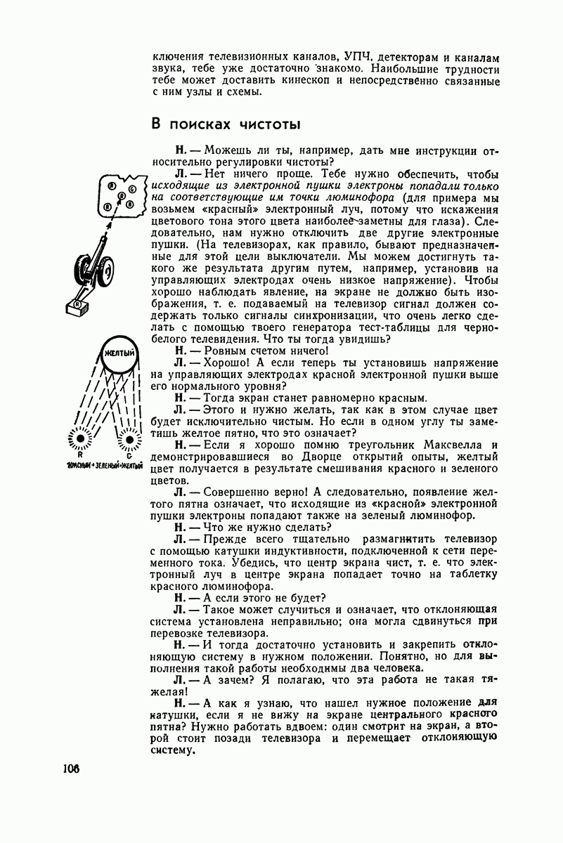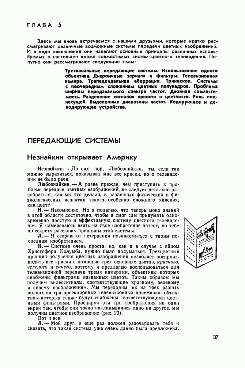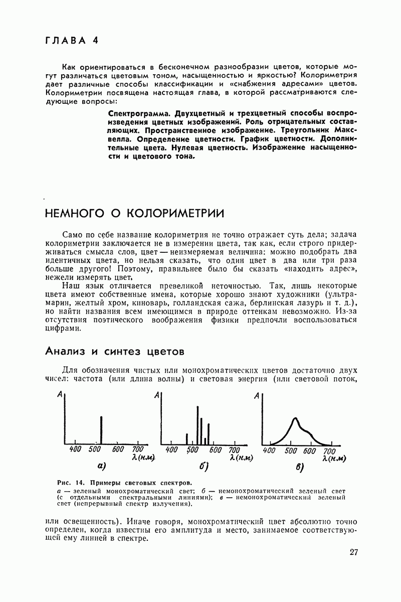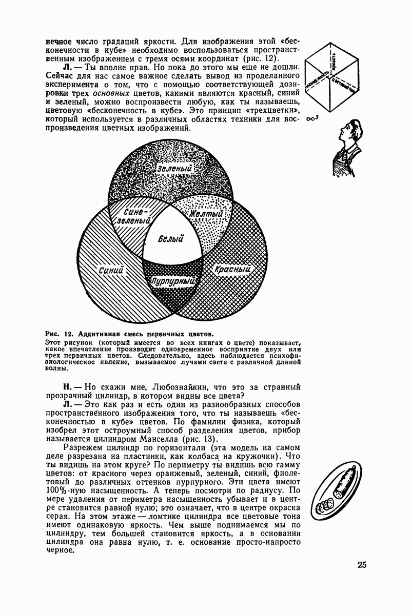 ГЛАВА 3Несколько экспериментов позволяют Любознайкину помочь своему другу лучше понять различные законы, определяющие жизнь мира красок. В связи с этим наши друзья обсуждают следующие вопросы: Синтез цветов с помощью диска Ньютона. Цвет предметов. Субстрактивный и аддитивный методы. Цветовой тон, яркость и насыщенность. Основные цвета. Принцип трехцветного способа получения цветного изображения. Цилиндр Манселла. Это только иллюзия. ВО ДВОРЦЕ ОТКРЫТИЙРазложение и восстановлениеНезнайкин. — Как здесь темно! А я то думал, что этот зал, предназначенный для изучения света, должен быть залит солнцем! Любознайкин. — Не удивляйся. Точно так же, как заболевший лучше понимает, что такое хорошее здоровье, так и в темноте нагляднее проявляется поведение света. Впрочем, вот и доказательство этой моей идеи. Ты видишь здесь основной опыт разложения света с помощью призмы — об этом опыте более подробно мы поговорим в следующий раз. Здесь солнце заменили вольтовой дугой, которая тоже дает белый свет. Но можно и как бы перевернуть условия опыта. Подойди сюда и посмотри через призму на эту полосу цветов спектра.