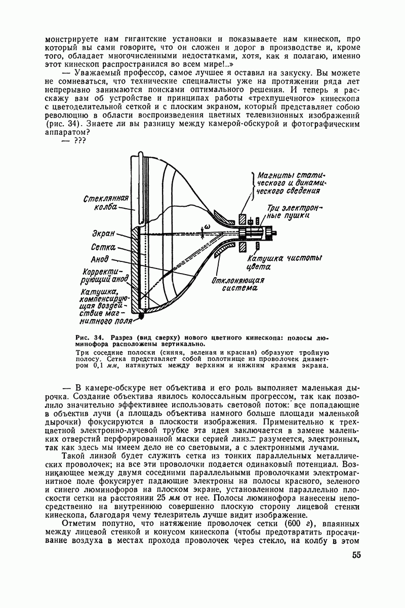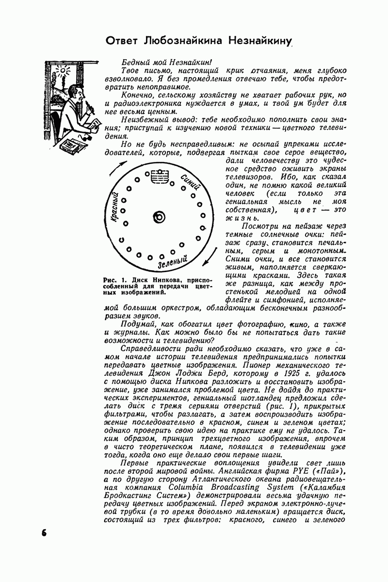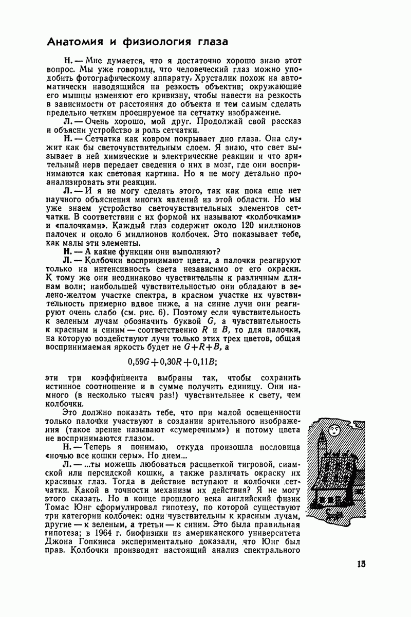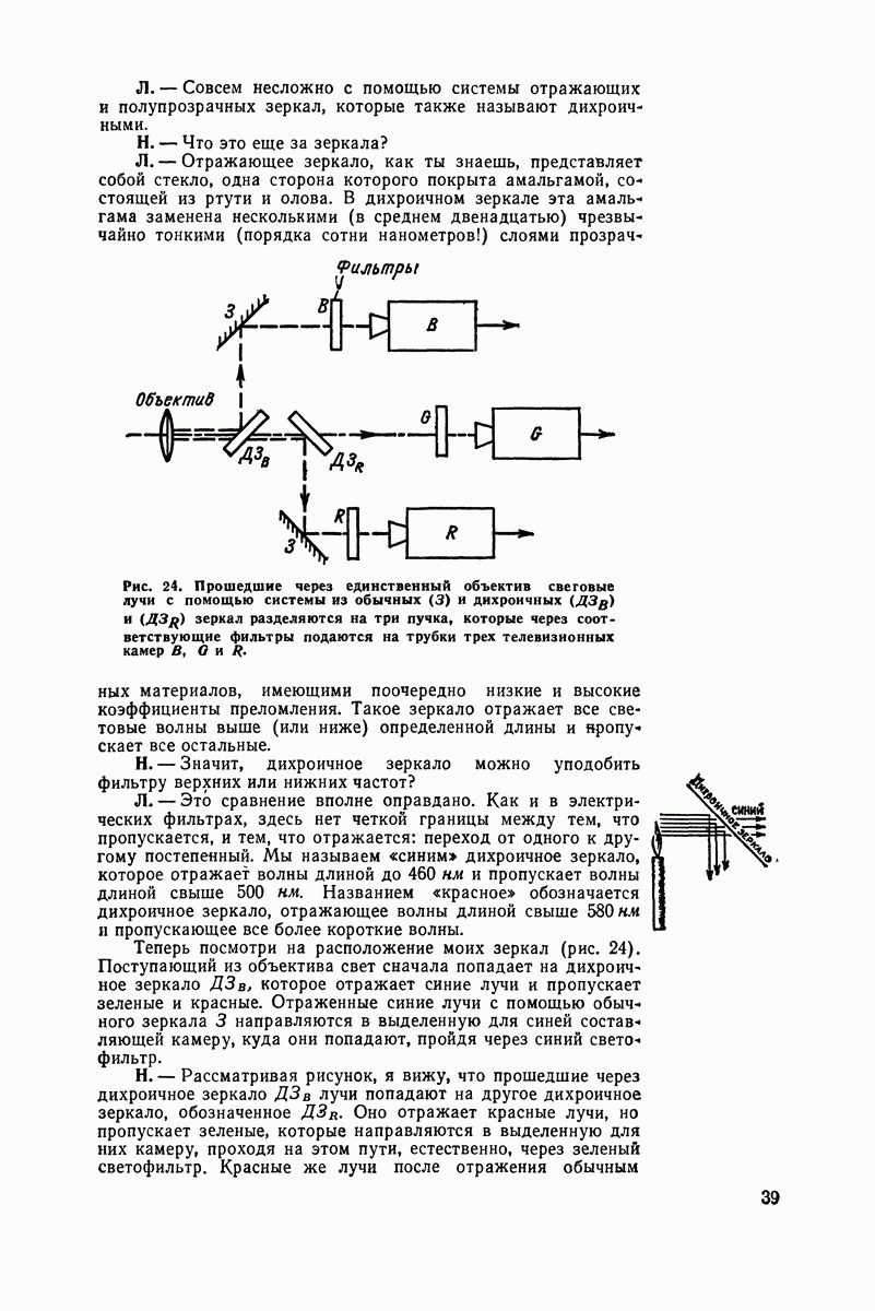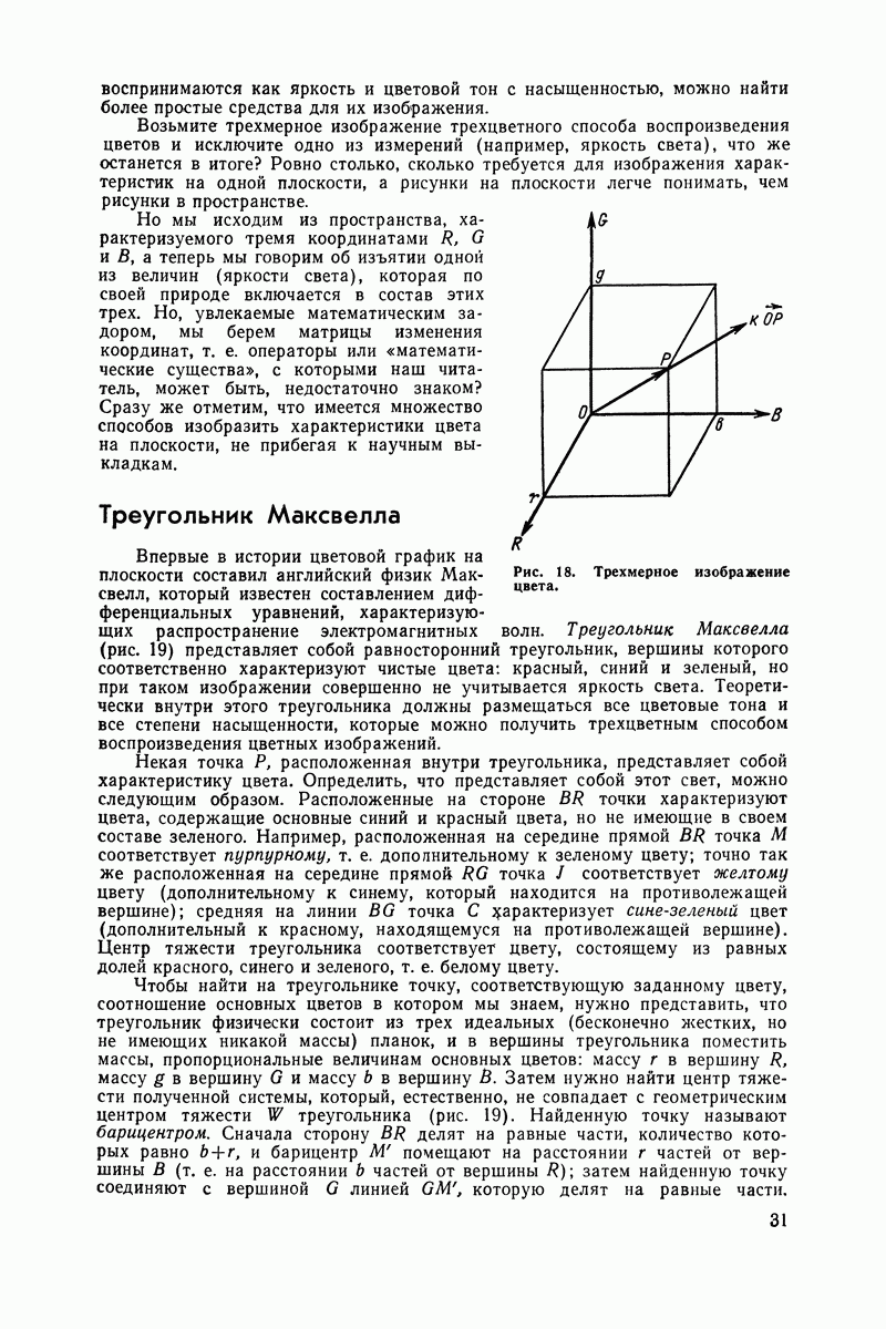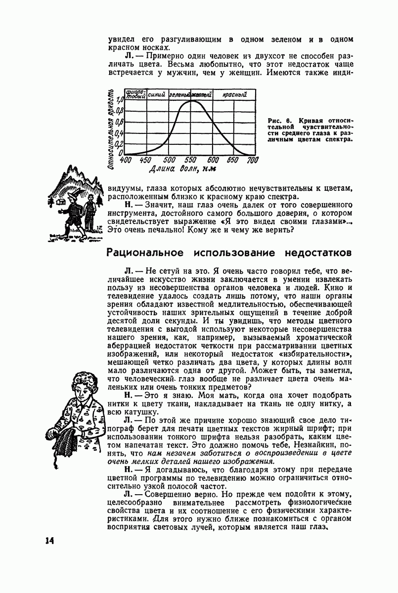 ГЛАВА 3Несколько экспериментов позволяют Любознайкину помочь своему другу лучше понять различные законы, определяющие жизнь мира красок. В связи с этим наши друзья обсуждают следующие вопросы: Синтез цветов с помощью диска Ньютона. Цвет предметов. Субстрактивный и аддитивный методы. Цветовой тон, яркость и насыщенность. Основные цвета. Принцип трехцветного способа получения цветного изображения. Цилиндр Манселла. Это только иллюзия. ВО ДВОРЦЕ ОТКРЫТИЙРазложение и восстановлениеНезнайкин. — Как здесь темно! А я то думал, что этот зал, предназначенный для изучения света, должен быть залит солнцем! Любознайкин. — Не удивляйся. Точно так же, как заболевший лучше понимает, что такое хорошее здоровье, так и в темноте нагляднее проявляется поведение света. Впрочем, вот и доказательство этой моей идеи. Ты видишь здесь основной опыт разложения света с помощью призмы — об этом опыте более подробно мы поговорим в следующий раз. Здесь солнце заменили вольтовой дугой, которая тоже дает белый свет. Но можно и как бы перевернуть условия опыта. Подойди сюда и посмотри через призму на эту полосу цветов спектра.