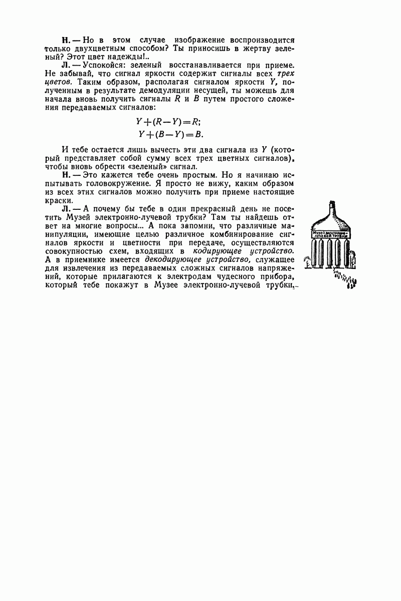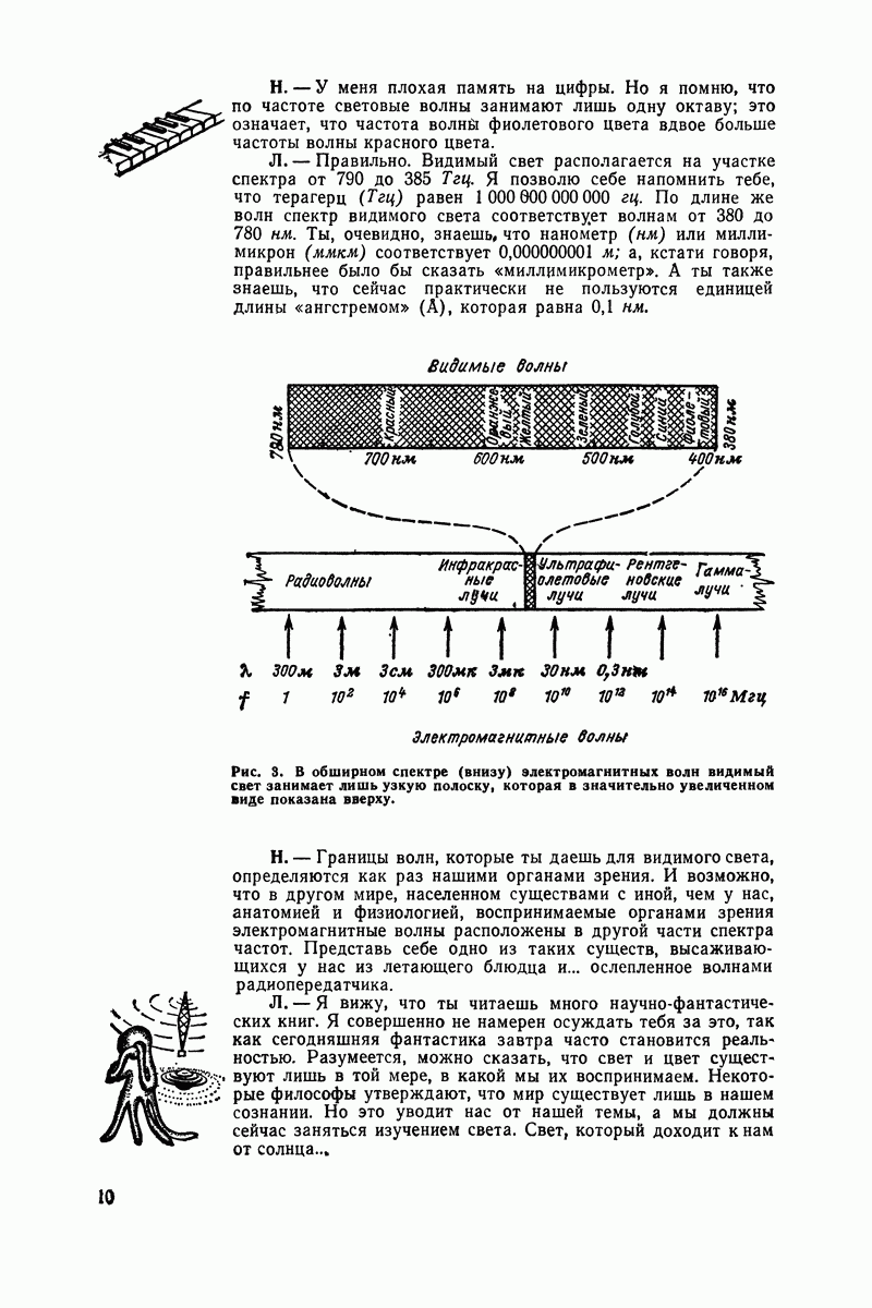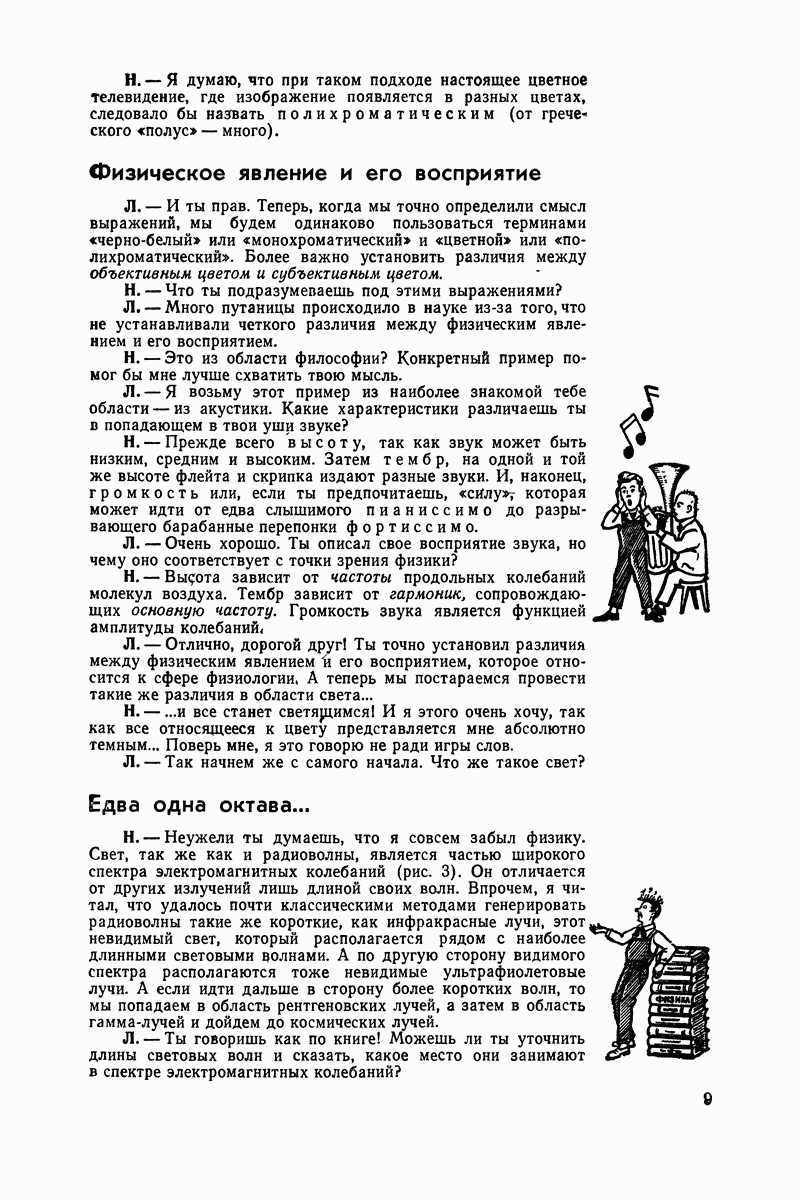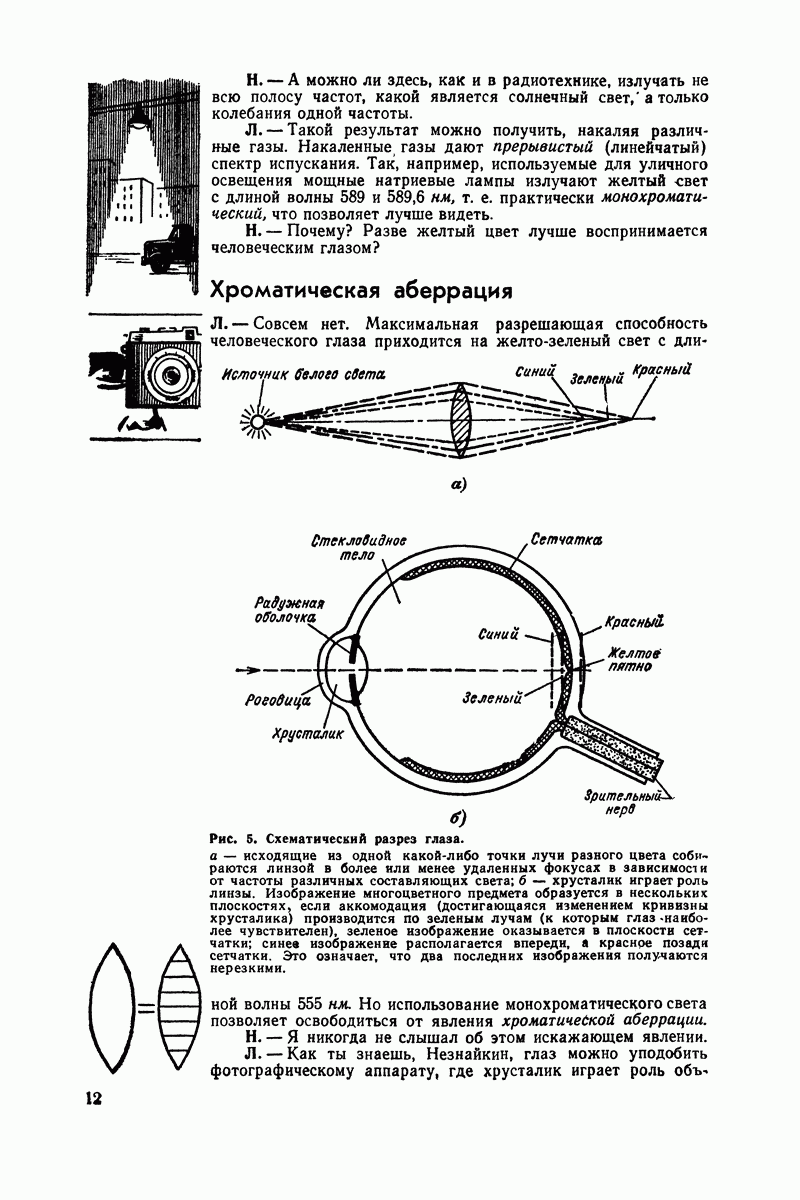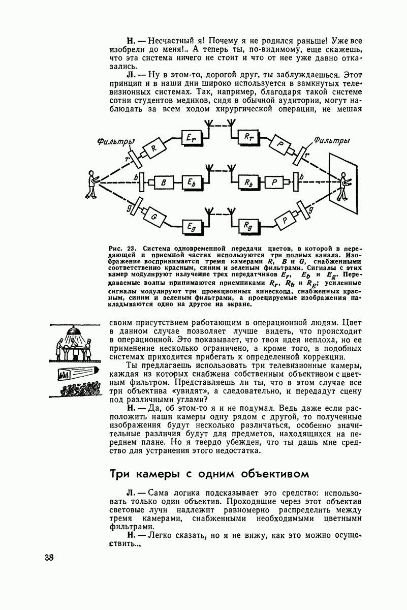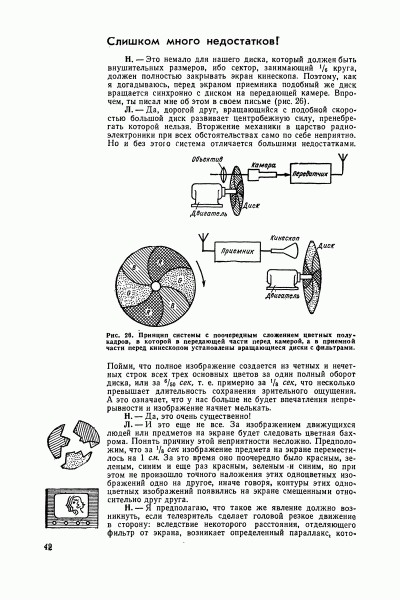 ГЛАВА 3Несколько экспериментов позволяют Любознайкину помочь своему другу лучше понять различные законы, определяющие жизнь мира красок. В связи с этим наши друзья обсуждают следующие вопросы: Синтез цветов с помощью диска Ньютона. Цвет предметов. Субстрактивный и аддитивный методы. Цветовой тон, яркость и насыщенность. Основные цвета. Принцип трехцветного способа получения цветного изображения. Цилиндр Манселла. Это только иллюзия. ВО ДВОРЦЕ ОТКРЫТИЙРазложение и восстановлениеНезнайкин. — Как здесь темно! А я то думал, что этот зал, предназначенный для изучения света, должен быть залит солнцем! Любознайкин. — Не удивляйся. Точно так же, как заболевший лучше понимает, что такое хорошее здоровье, так и в темноте нагляднее проявляется поведение света. Впрочем, вот и доказательство этой моей идеи. Ты видишь здесь основной опыт разложения света с помощью призмы — об этом опыте более подробно мы поговорим в следующий раз. Здесь солнце заменили вольтовой дугой, которая тоже дает белый свет. Но можно и как бы перевернуть условия опыта. Подойди сюда и посмотри через призму на эту полосу цветов спектра.