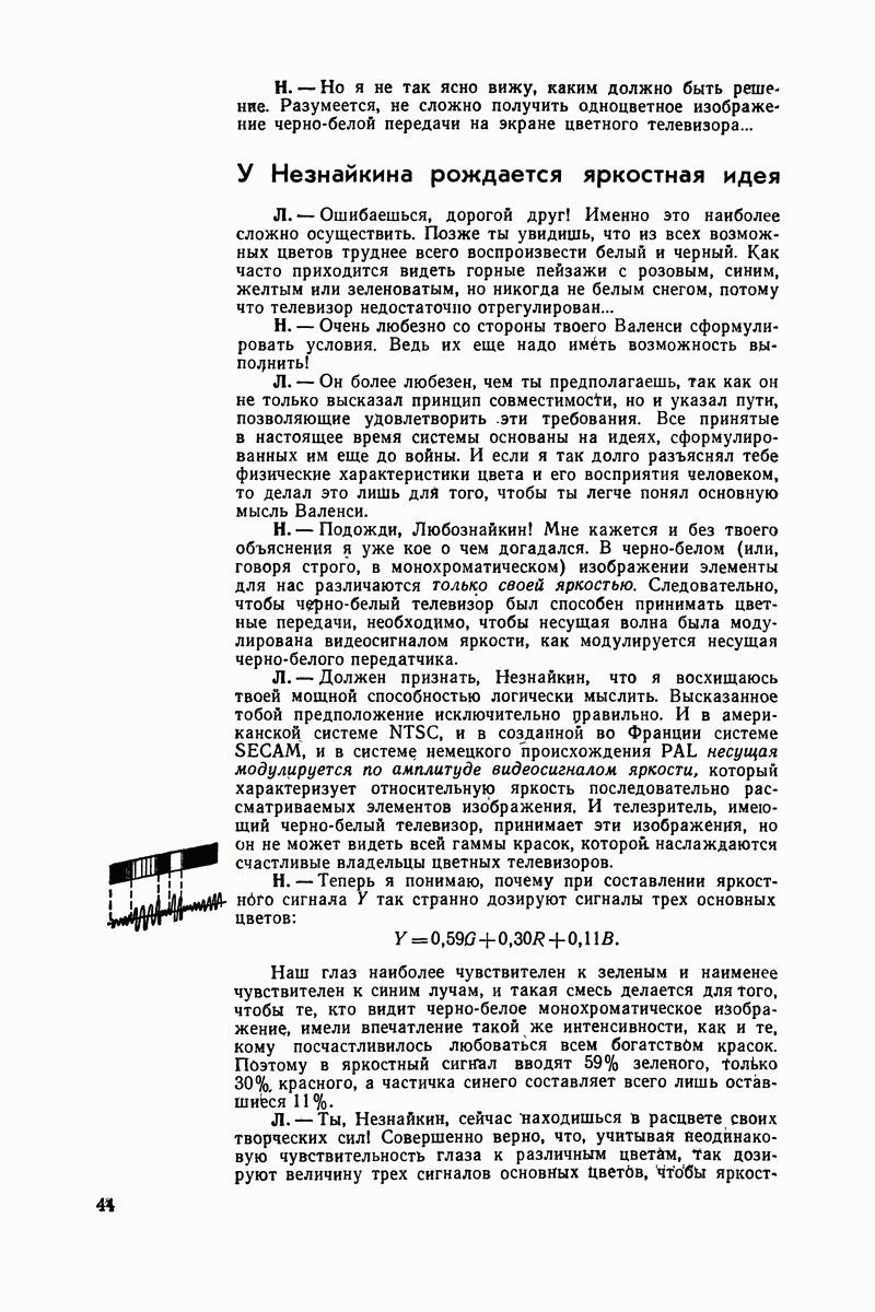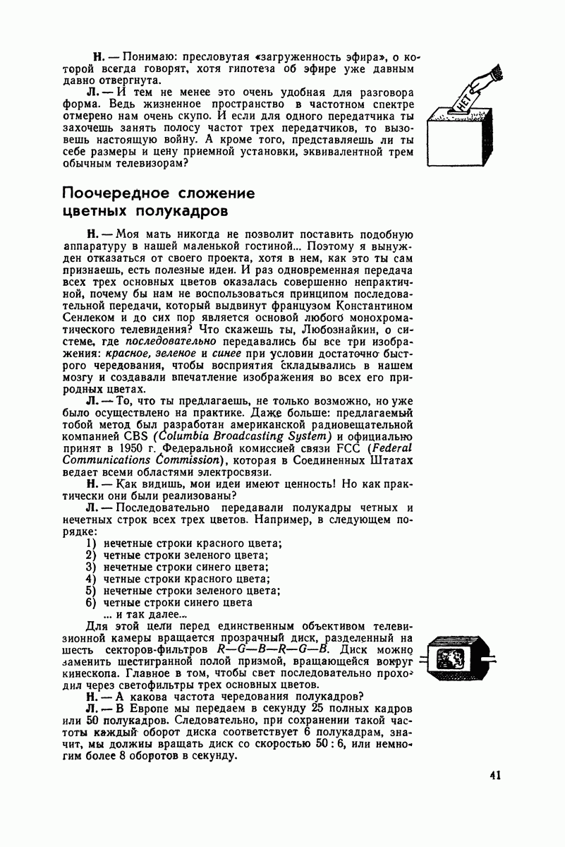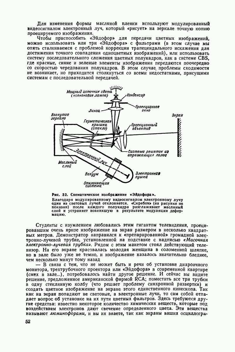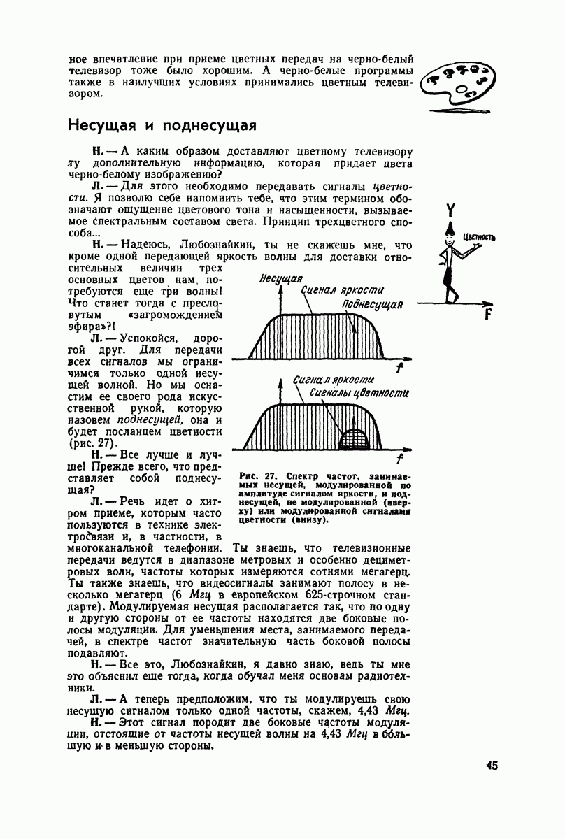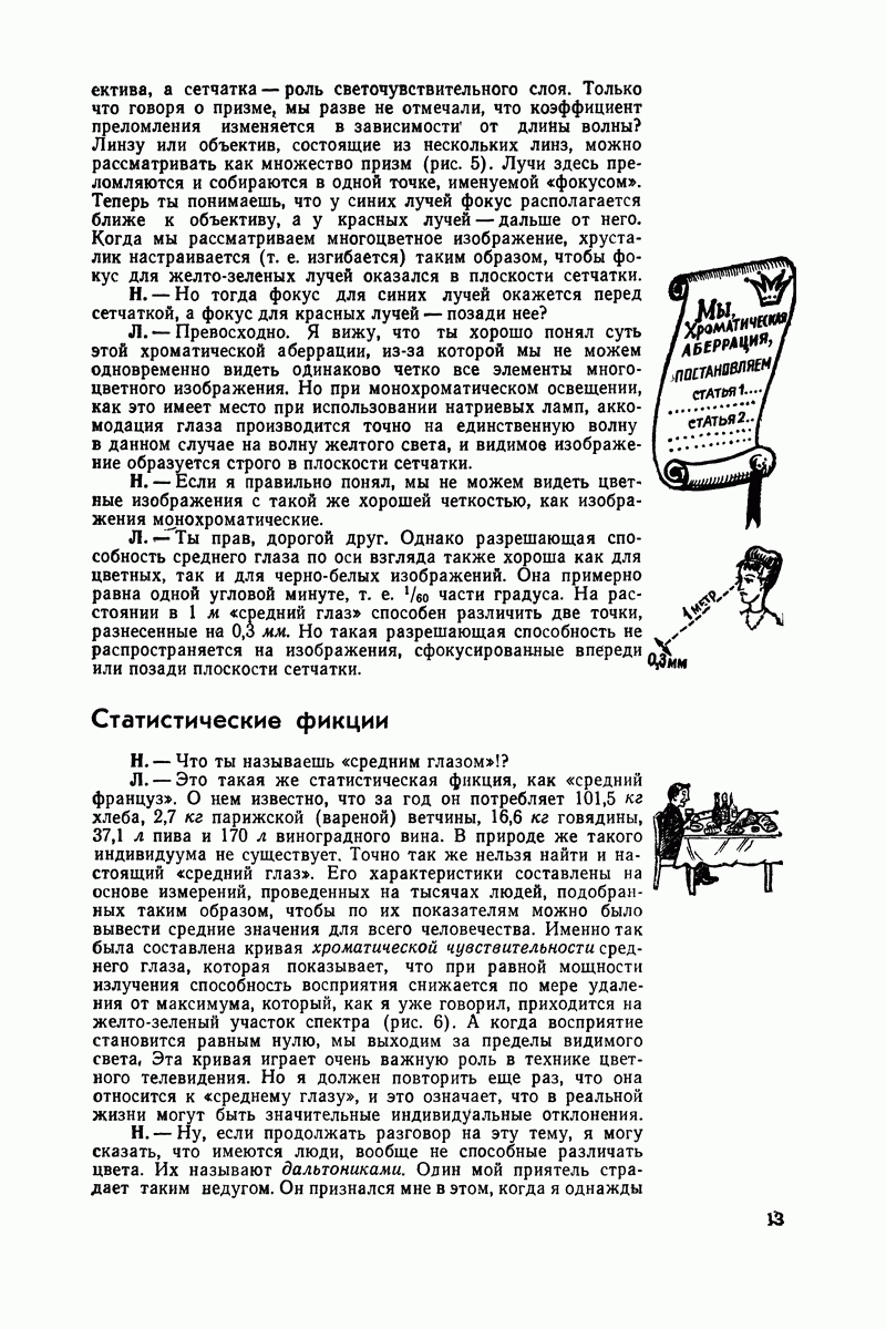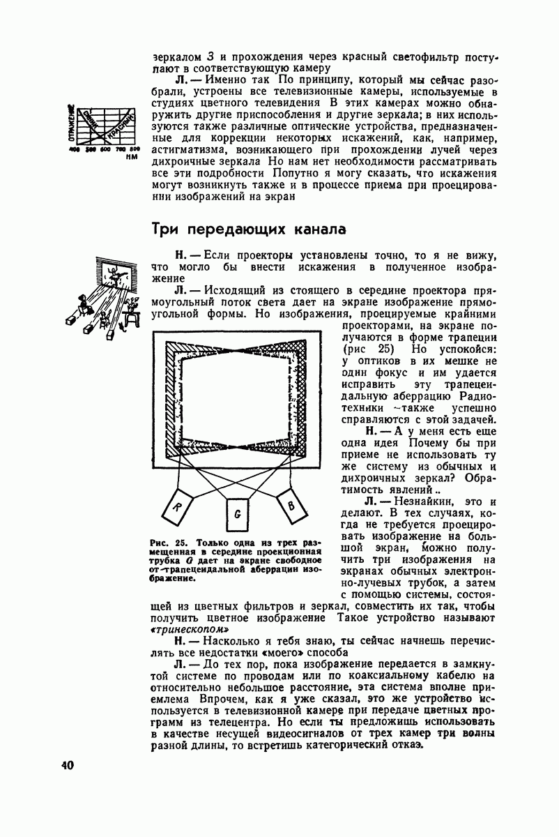 ГЛАВА 3Несколько экспериментов позволяют Любознайкину помочь своему другу лучше понять различные законы, определяющие жизнь мира красок. В связи с этим наши друзья обсуждают следующие вопросы: Синтез цветов с помощью диска Ньютона. Цвет предметов. Субстрактивный и аддитивный методы. Цветовой тон, яркость и насыщенность. Основные цвета. Принцип трехцветного способа получения цветного изображения. Цилиндр Манселла. Это только иллюзия. ВО ДВОРЦЕ ОТКРЫТИЙРазложение и восстановлениеНезнайкин. — Как здесь темно! А я то думал, что этот зал, предназначенный для изучения света, должен быть залит солнцем! Любознайкин. — Не удивляйся. Точно так же, как заболевший лучше понимает, что такое хорошее здоровье, так и в темноте нагляднее проявляется поведение света. Впрочем, вот и доказательство этой моей идеи. Ты видишь здесь основной опыт разложения света с помощью призмы — об этом опыте более подробно мы поговорим в следующий раз. Здесь солнце заменили вольтовой дугой, которая тоже дает белый свет. Но можно и как бы перевернуть условия опыта. Подойди сюда и посмотри через призму на эту полосу цветов спектра.
