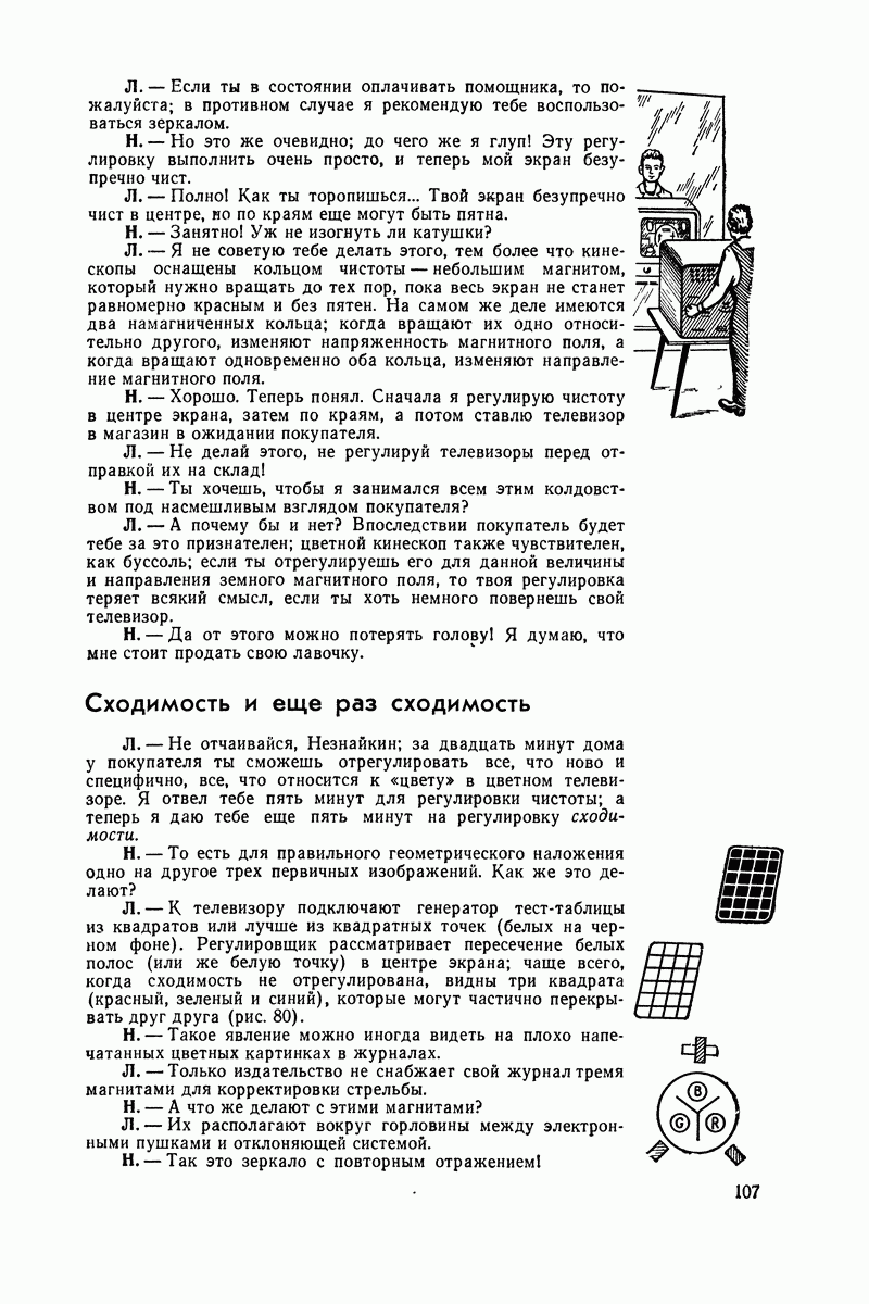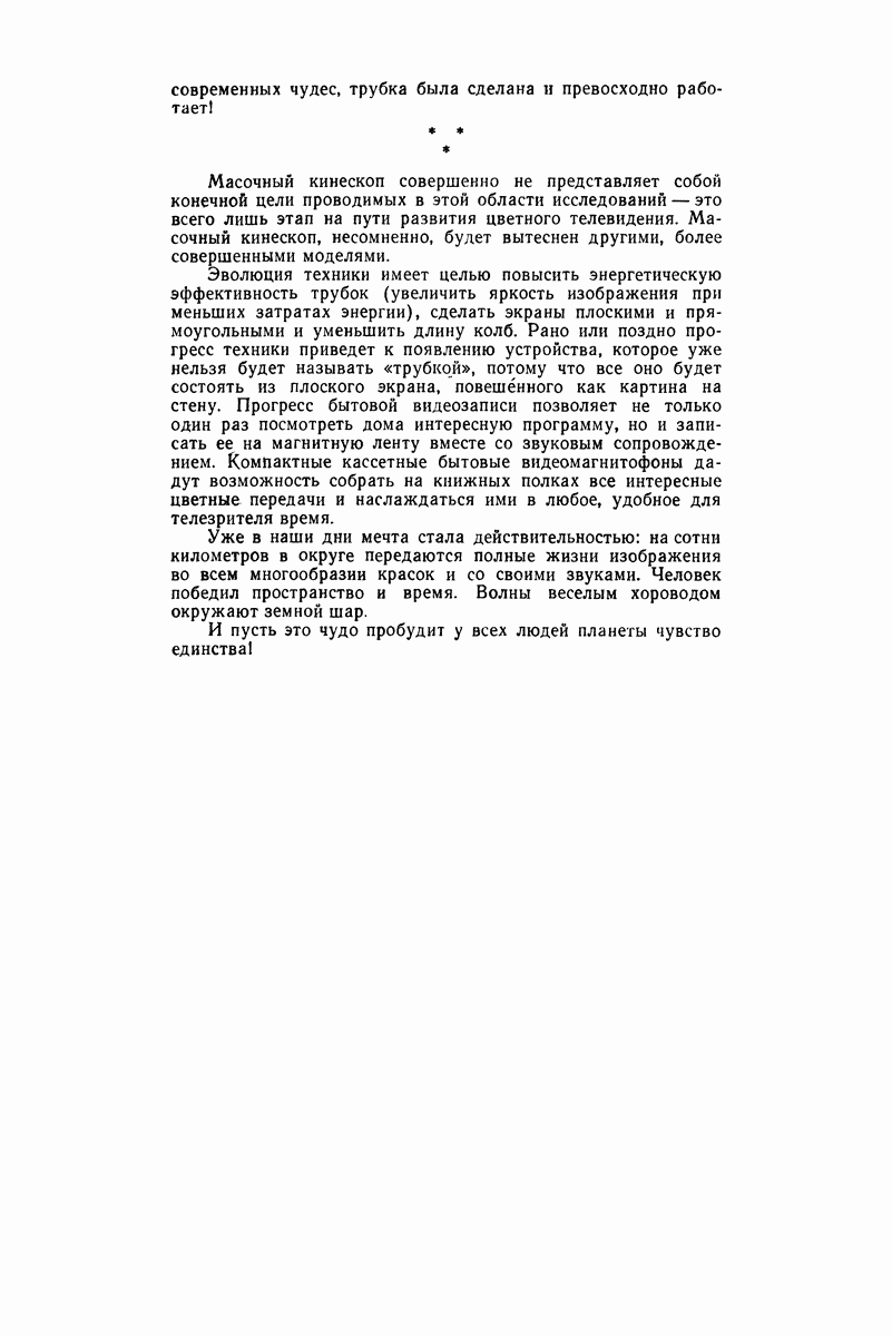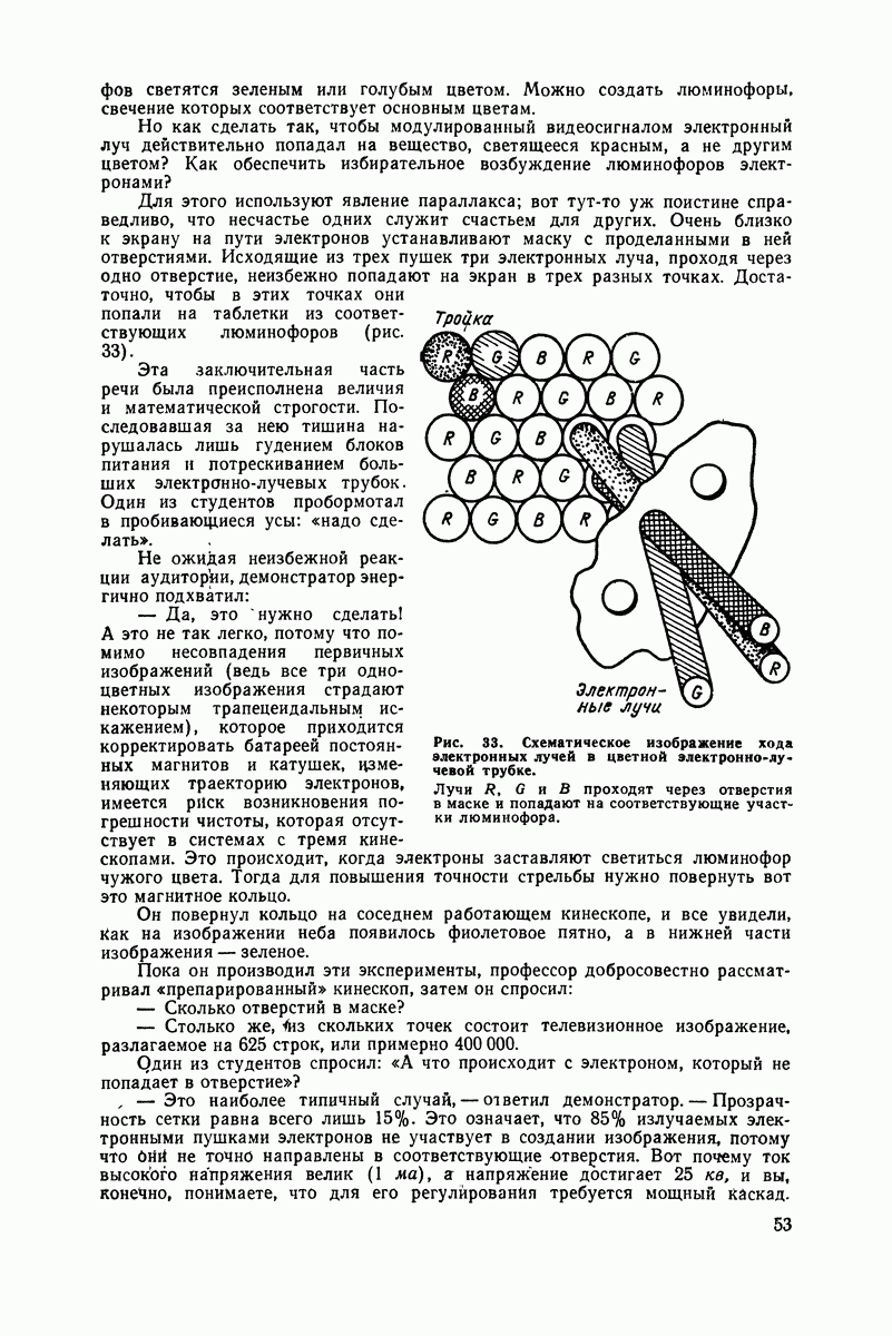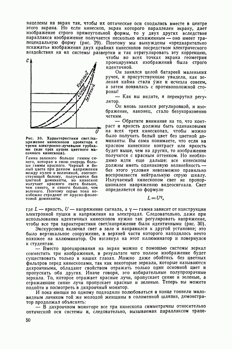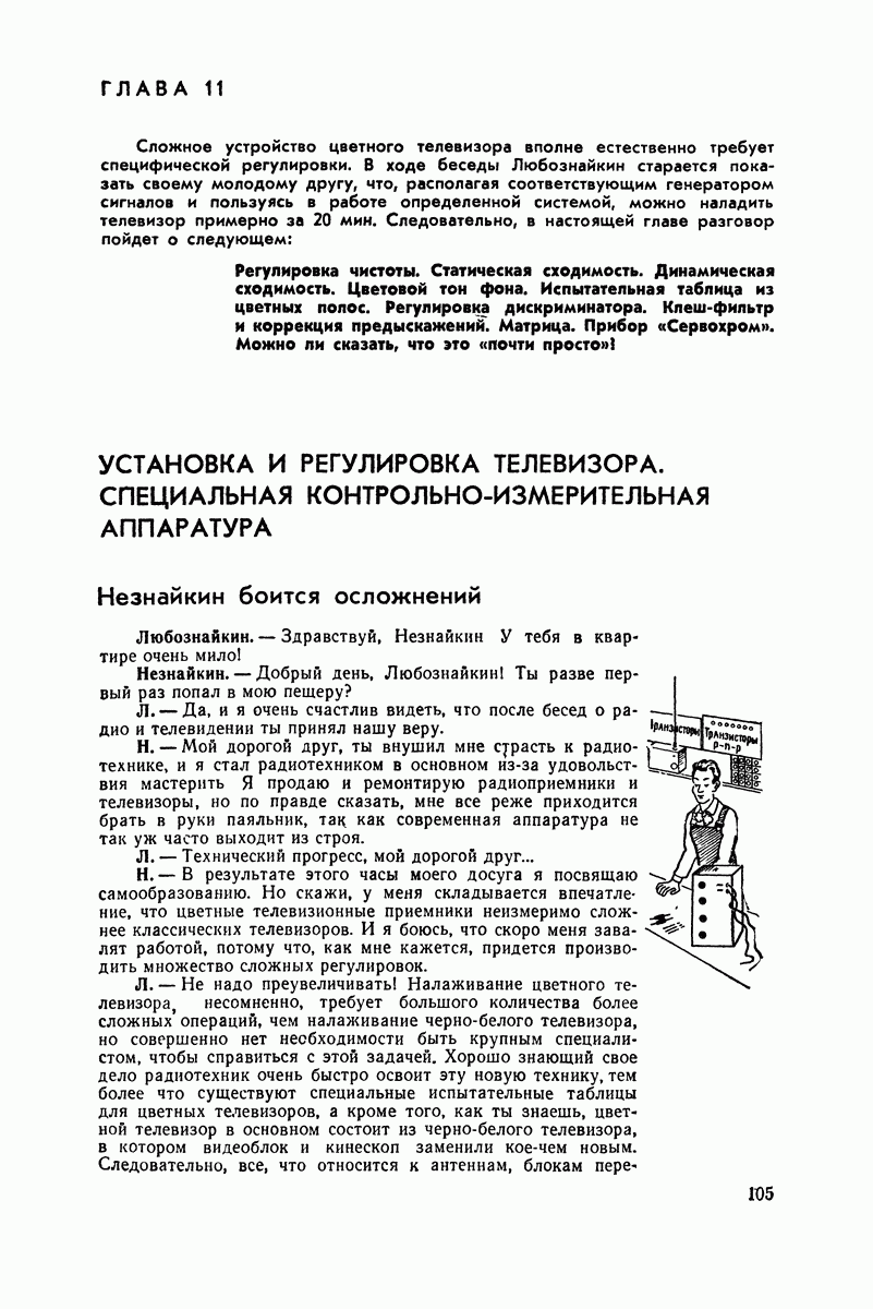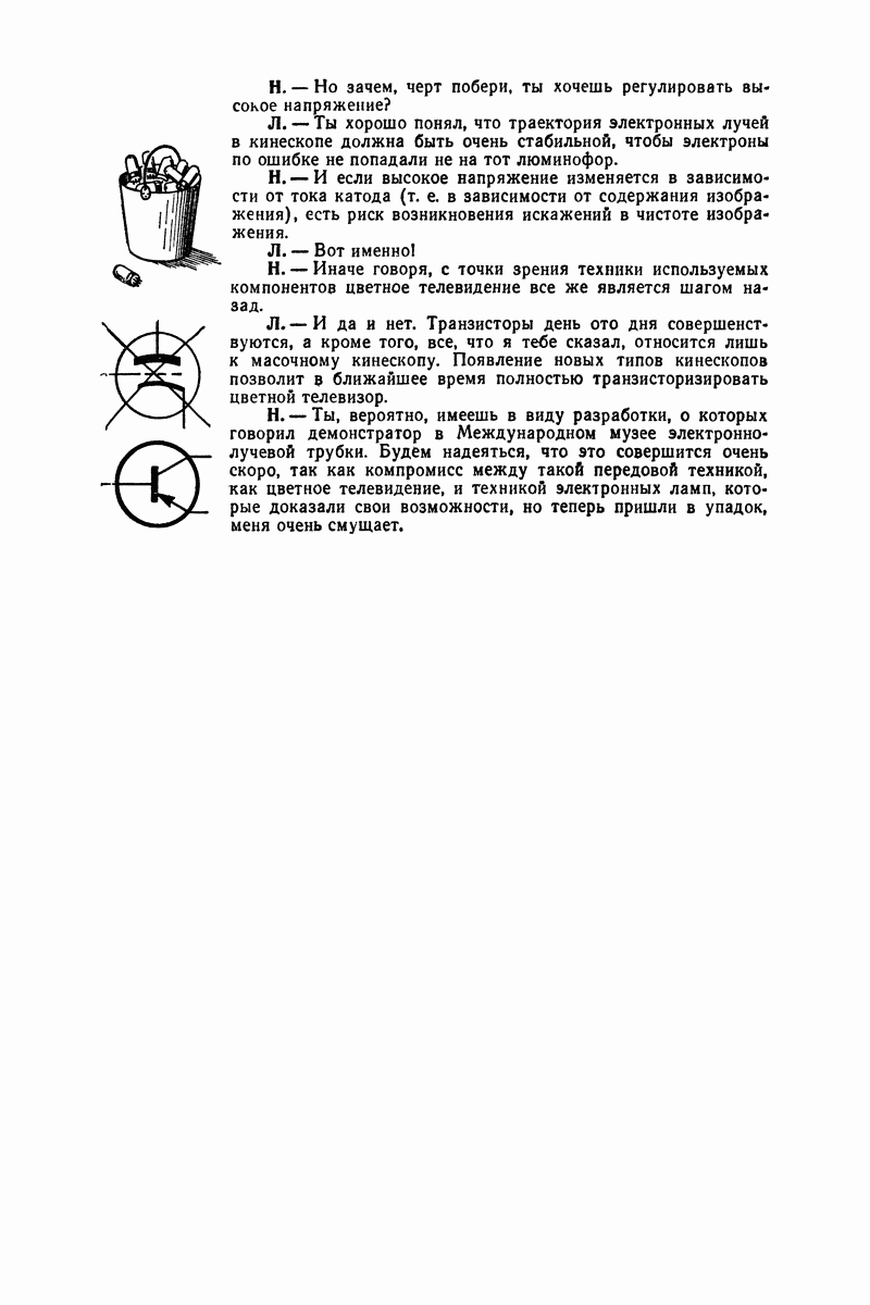ГЛАВА 3Несколько экспериментов позволяют Любознайкину помочь своему другу лучше понять различные законы, определяющие жизнь мира красок. В связи с этим наши друзья обсуждают следующие вопросы: Синтез цветов с помощью диска Ньютона. Цвет предметов. Субстрактивный и аддитивный методы. Цветовой тон, яркость и насыщенность. Основные цвета. Принцип трехцветного способа получения цветного изображения. Цилиндр Манселла. Это только иллюзия. ВО ДВОРЦЕ ОТКРЫТИЙРазложение и восстановлениеНезнайкин. — Как здесь темно! А я то думал, что этот зал, предназначенный для изучения света, должен быть залит солнцем! Любознайкин. — Не удивляйся. Точно так же, как заболевший лучше понимает, что такое хорошее здоровье, так и в темноте нагляднее проявляется поведение света. Впрочем, вот и доказательство этой моей идеи. Ты видишь здесь основной опыт разложения света с помощью призмы — об этом опыте более подробно мы поговорим в следующий раз. Здесь солнце заменили вольтовой дугой, которая тоже дает белый свет. Но можно и как бы перевернуть условия опыта. Подойди сюда и посмотри через призму на эту полосу цветов спектра.