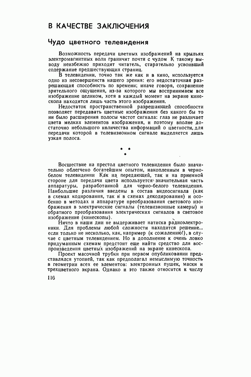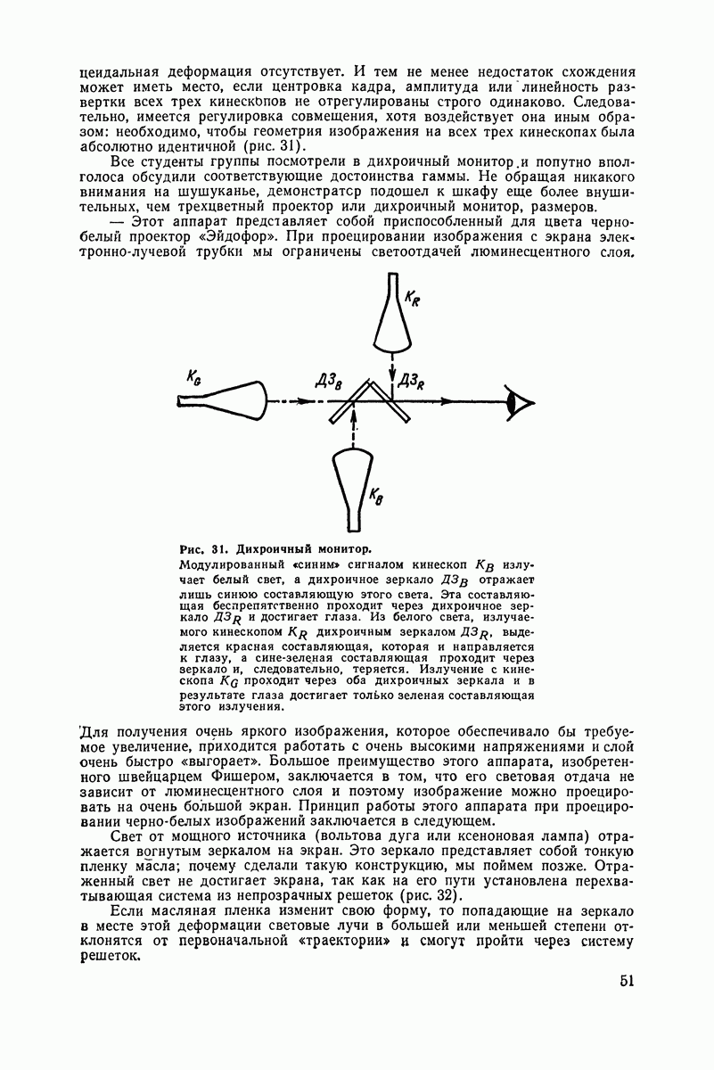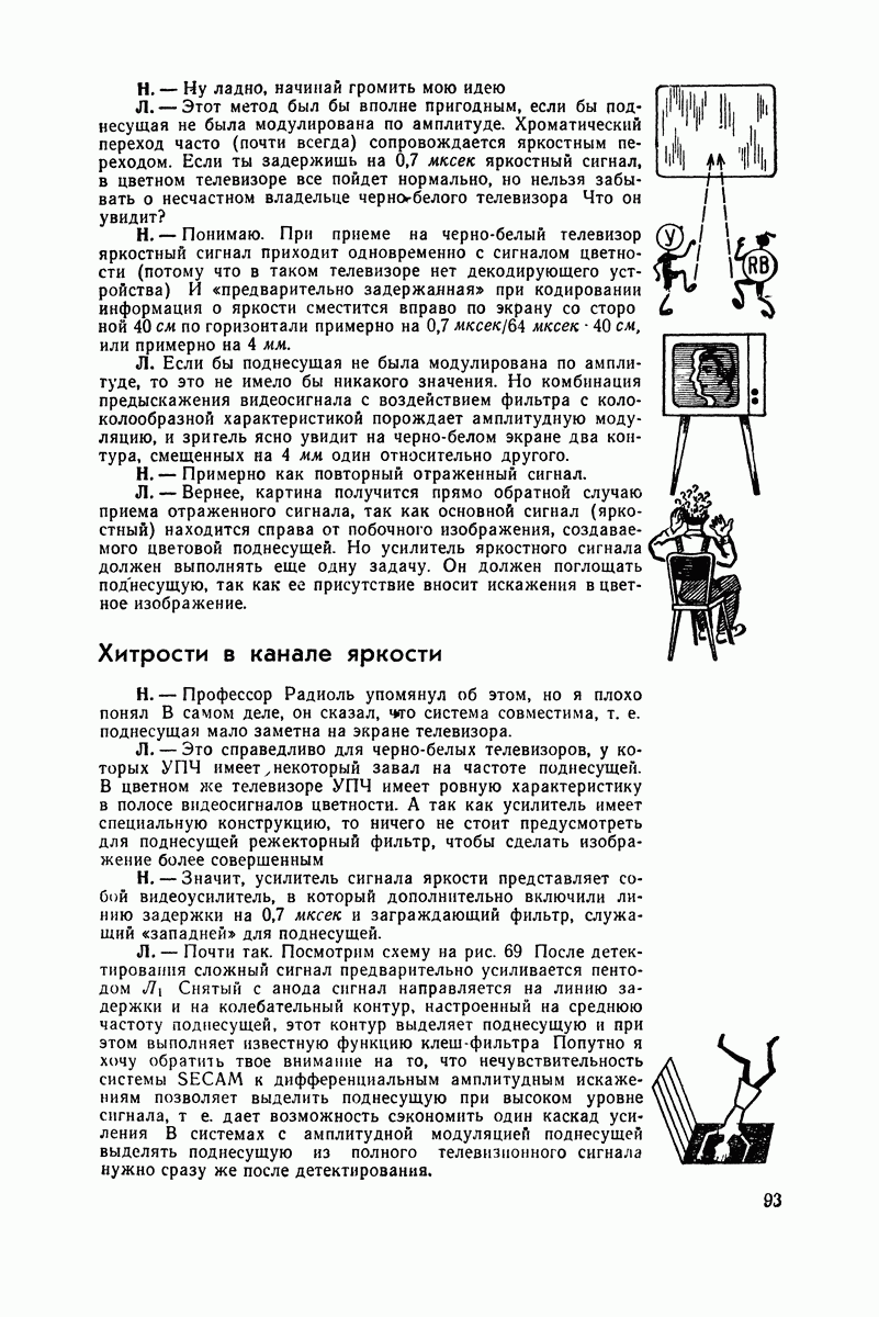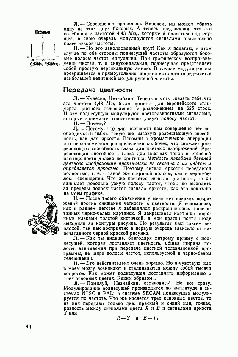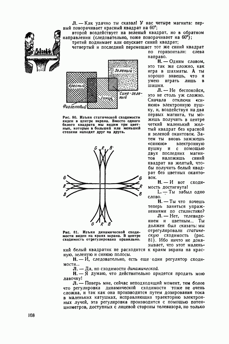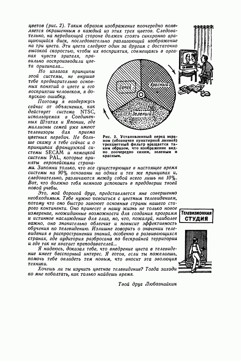 ГЛАВА 3Несколько экспериментов позволяют Любознайкину помочь своему другу лучше понять различные законы, определяющие жизнь мира красок. В связи с этим наши друзья обсуждают следующие вопросы: Синтез цветов с помощью диска Ньютона. Цвет предметов. Субстрактивный и аддитивный методы. Цветовой тон, яркость и насыщенность. Основные цвета. Принцип трехцветного способа получения цветного изображения. Цилиндр Манселла. Это только иллюзия. ВО ДВОРЦЕ ОТКРЫТИЙРазложение и восстановлениеНезнайкин. — Как здесь темно! А я то думал, что этот зал, предназначенный для изучения света, должен быть залит солнцем! Любознайкин. — Не удивляйся. Точно так же, как заболевший лучше понимает, что такое хорошее здоровье, так и в темноте нагляднее проявляется поведение света. Впрочем, вот и доказательство этой моей идеи. Ты видишь здесь основной опыт разложения света с помощью призмы — об этом опыте более подробно мы поговорим в следующий раз. Здесь солнце заменили вольтовой дугой, которая тоже дает белый свет. Но можно и как бы перевернуть условия опыта. Подойди сюда и посмотри через призму на эту полосу цветов спектра.