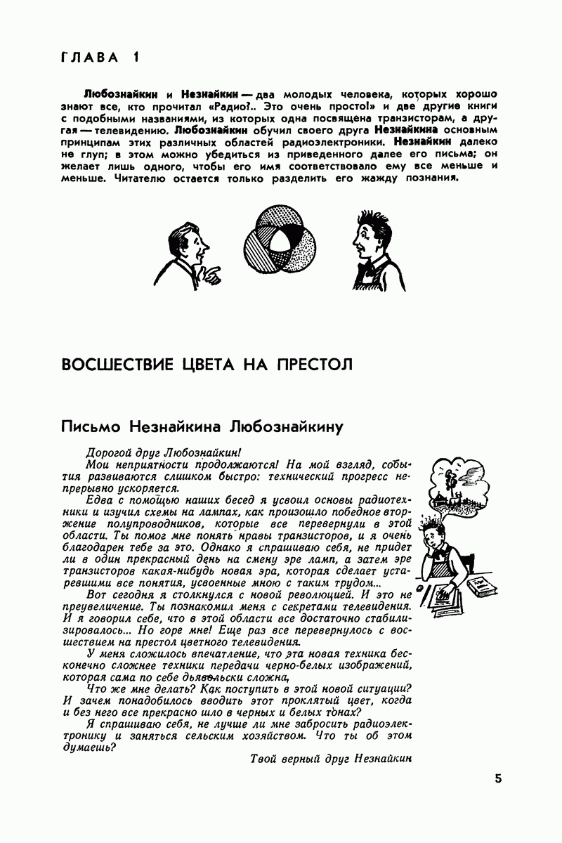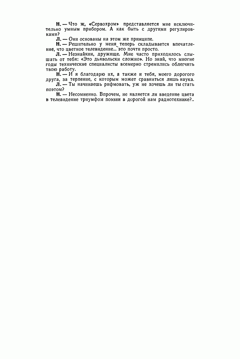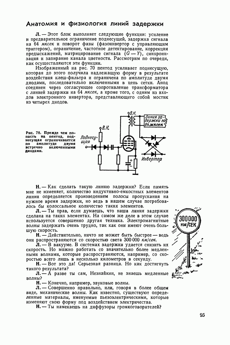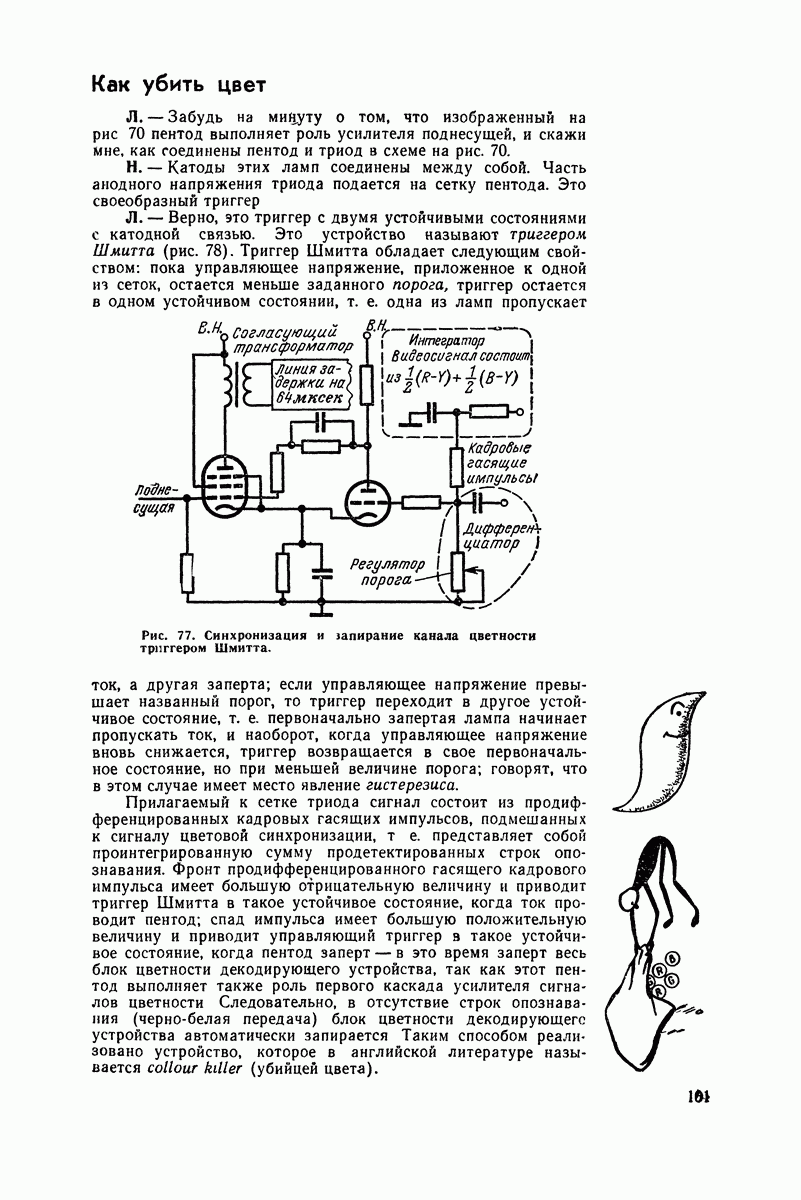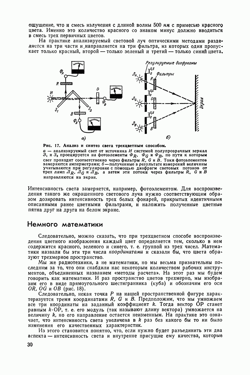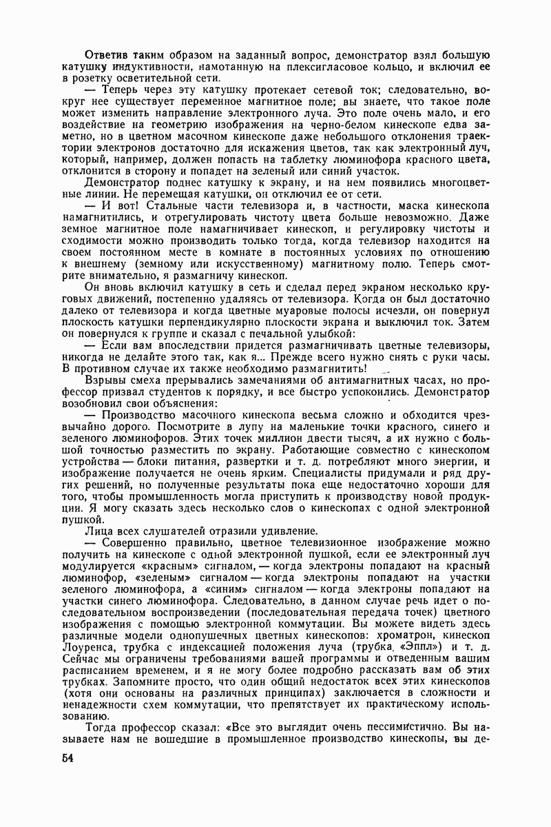 ГЛАВА 3Несколько экспериментов позволяют Любознайкину помочь своему другу лучше понять различные законы, определяющие жизнь мира красок. В связи с этим наши друзья обсуждают следующие вопросы: Синтез цветов с помощью диска Ньютона. Цвет предметов. Субстрактивный и аддитивный методы. Цветовой тон, яркость и насыщенность. Основные цвета. Принцип трехцветного способа получения цветного изображения. Цилиндр Манселла. Это только иллюзия. ВО ДВОРЦЕ ОТКРЫТИЙРазложение и восстановлениеНезнайкин. — Как здесь темно! А я то думал, что этот зал, предназначенный для изучения света, должен быть залит солнцем! Любознайкин. — Не удивляйся. Точно так же, как заболевший лучше понимает, что такое хорошее здоровье, так и в темноте нагляднее проявляется поведение света. Впрочем, вот и доказательство этой моей идеи. Ты видишь здесь основной опыт разложения света с помощью призмы — об этом опыте более подробно мы поговорим в следующий раз. Здесь солнце заменили вольтовой дугой, которая тоже дает белый свет. Но можно и как бы перевернуть условия опыта. Подойди сюда и посмотри через призму на эту полосу цветов спектра.
