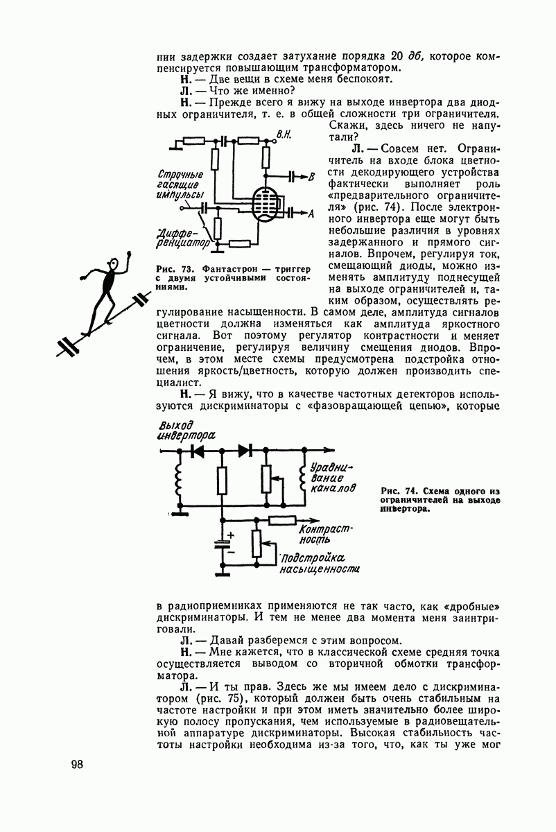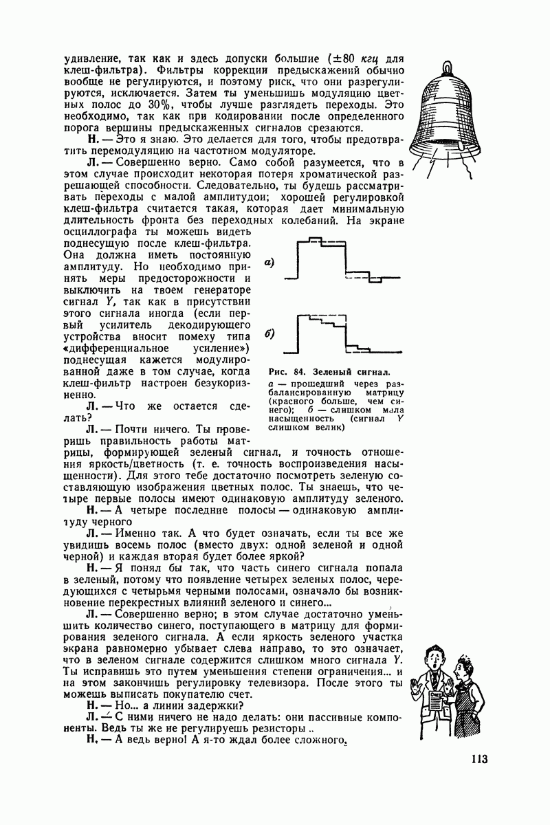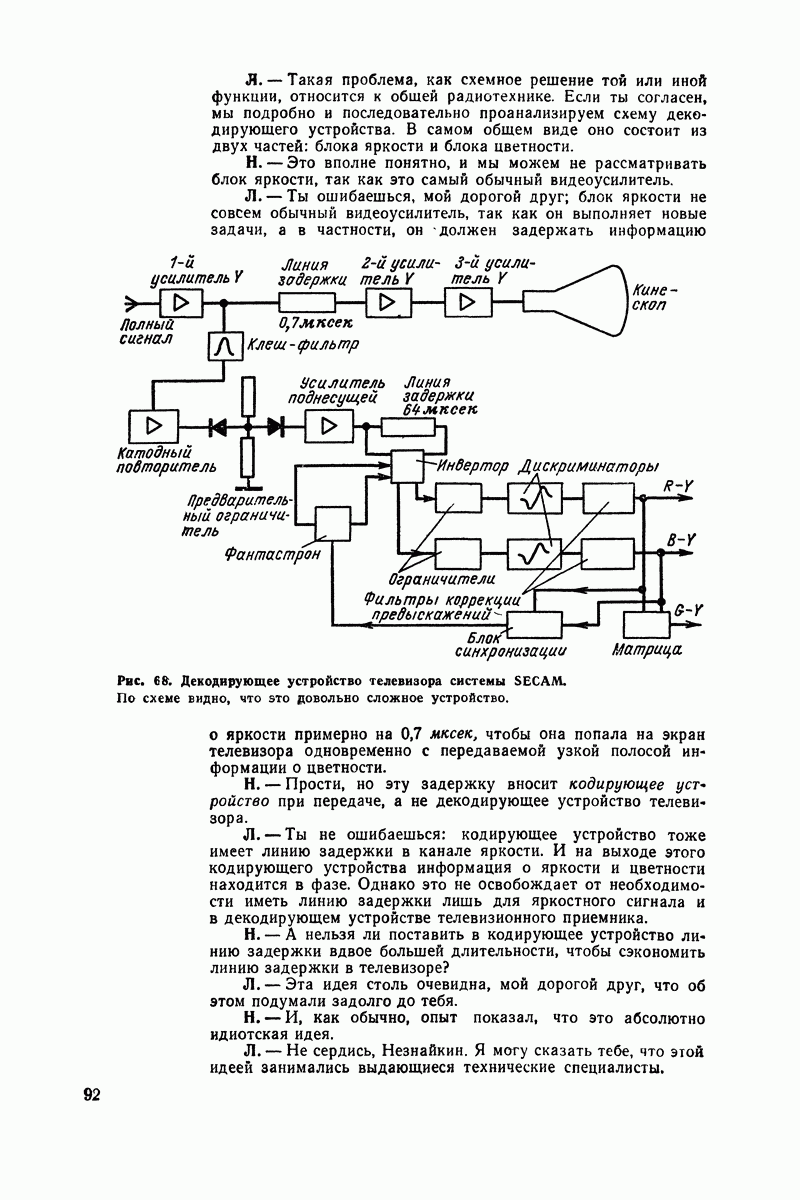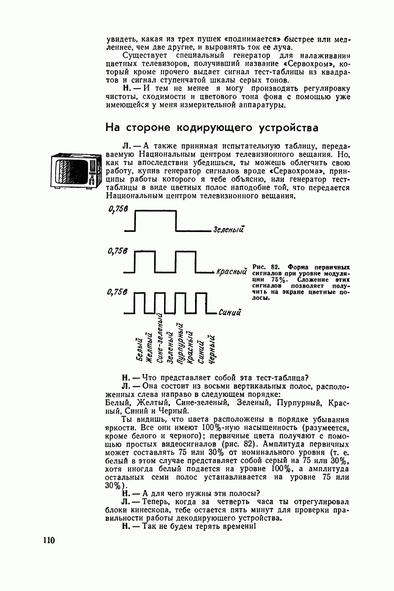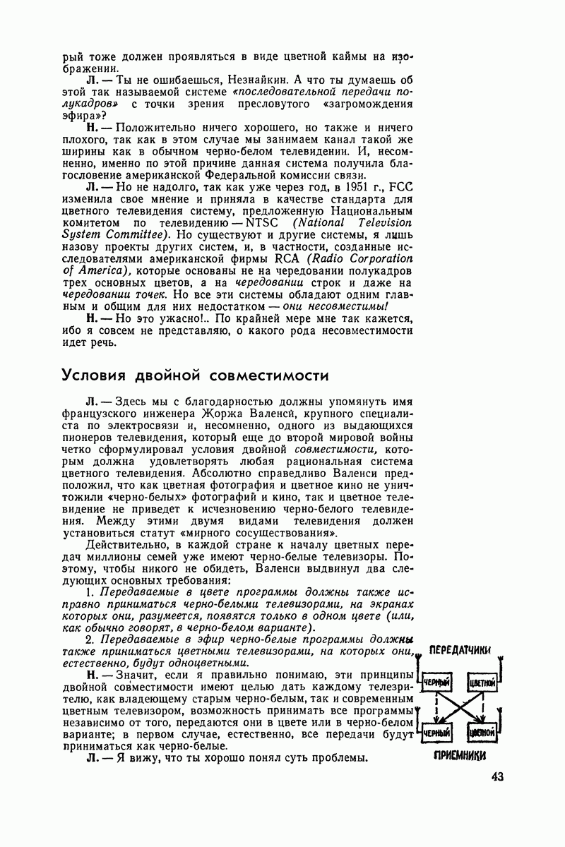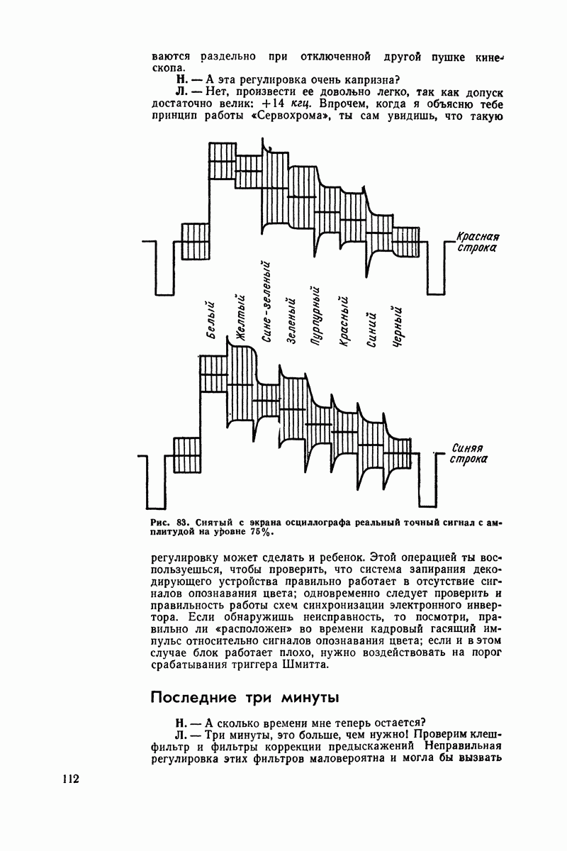ГЛАВА 3Несколько экспериментов позволяют Любознайкину помочь своему другу лучше понять различные законы, определяющие жизнь мира красок. В связи с этим наши друзья обсуждают следующие вопросы: Синтез цветов с помощью диска Ньютона. Цвет предметов. Субстрактивный и аддитивный методы. Цветовой тон, яркость и насыщенность. Основные цвета. Принцип трехцветного способа получения цветного изображения. Цилиндр Манселла. Это только иллюзия. ВО ДВОРЦЕ ОТКРЫТИЙРазложение и восстановлениеНезнайкин. — Как здесь темно! А я то думал, что этот зал, предназначенный для изучения света, должен быть залит солнцем! Любознайкин. — Не удивляйся. Точно так же, как заболевший лучше понимает, что такое хорошее здоровье, так и в темноте нагляднее проявляется поведение света. Впрочем, вот и доказательство этой моей идеи. Ты видишь здесь основной опыт разложения света с помощью призмы — об этом опыте более подробно мы поговорим в следующий раз. Здесь солнце заменили вольтовой дугой, которая тоже дает белый свет. Но можно и как бы перевернуть условия опыта. Подойди сюда и посмотри через призму на эту полосу цветов спектра.