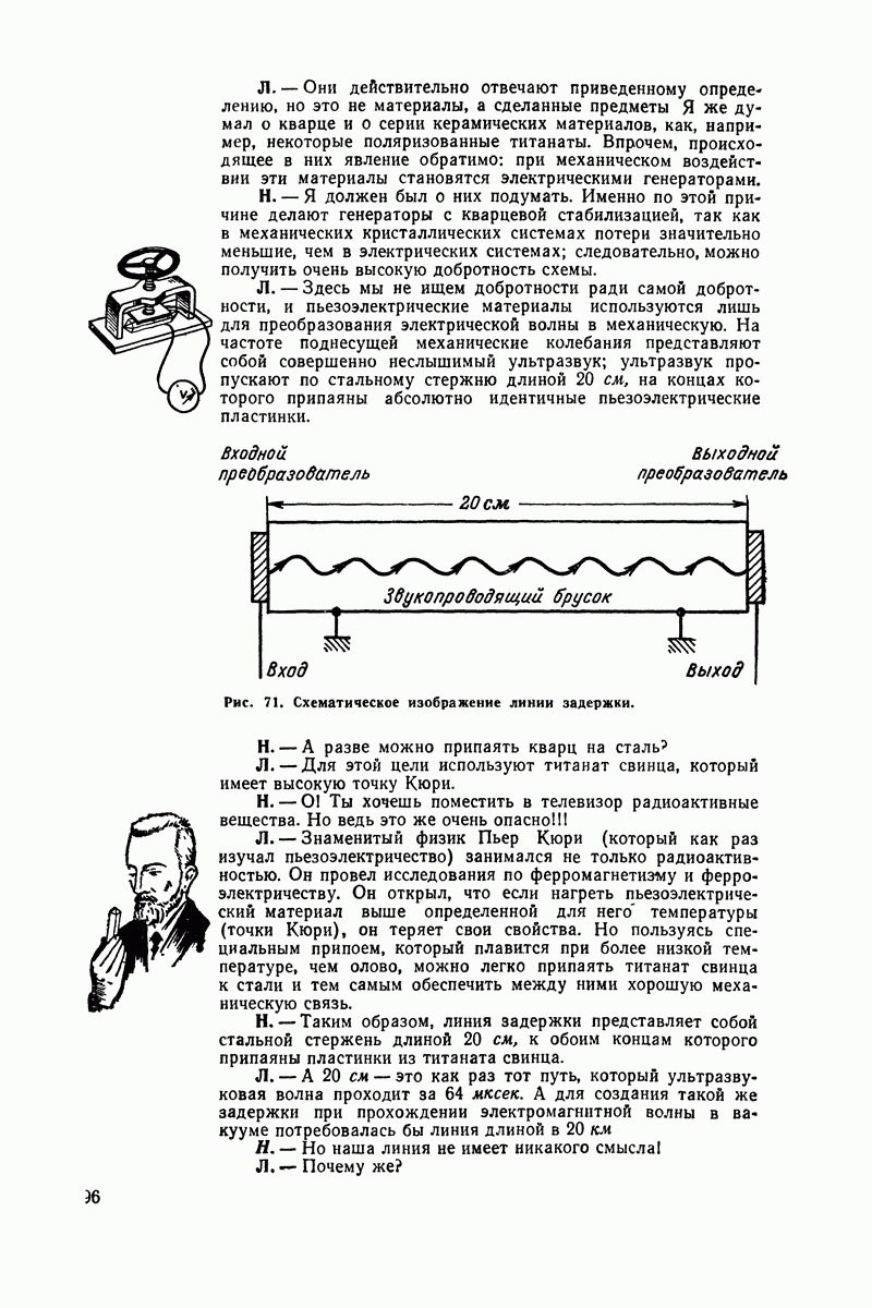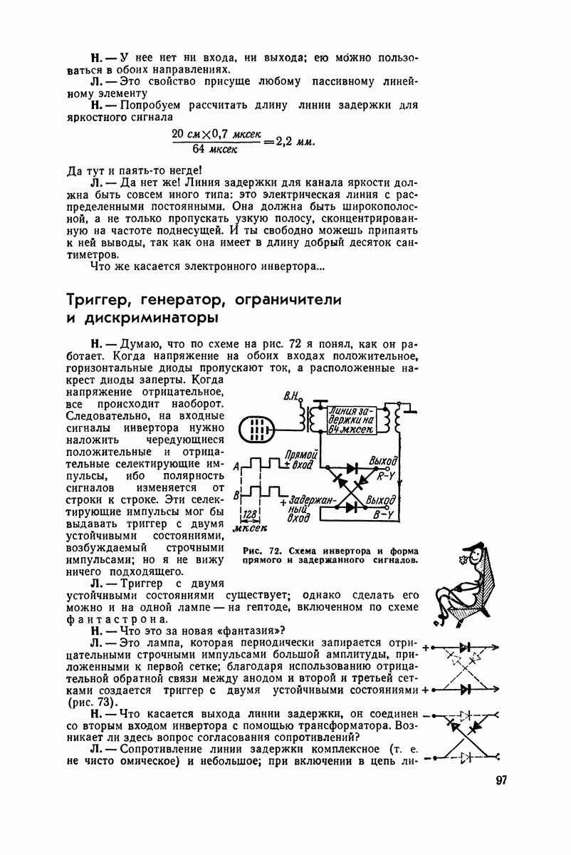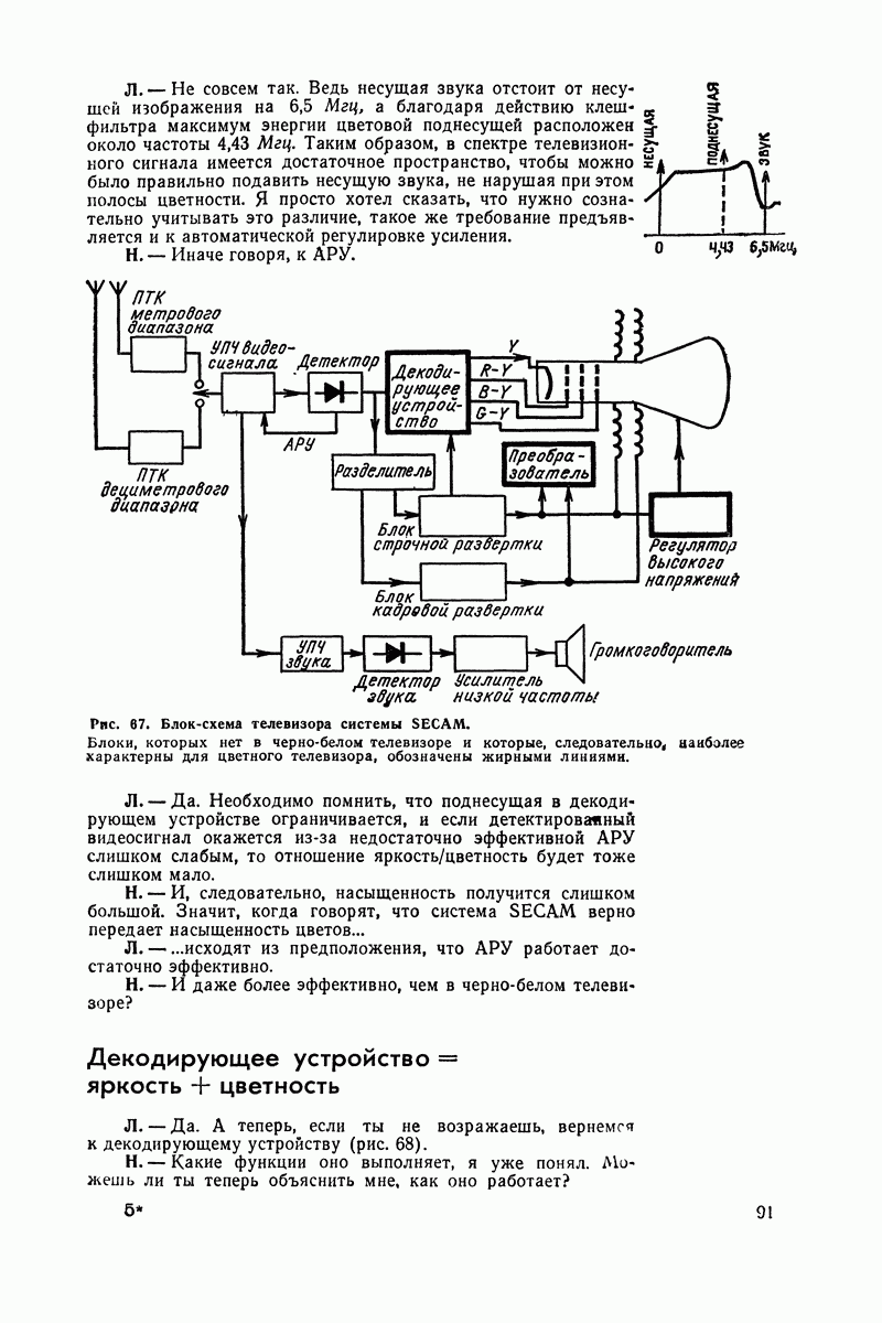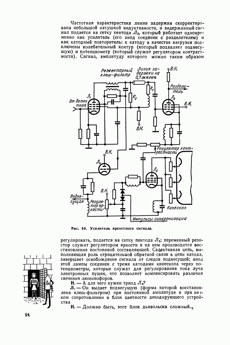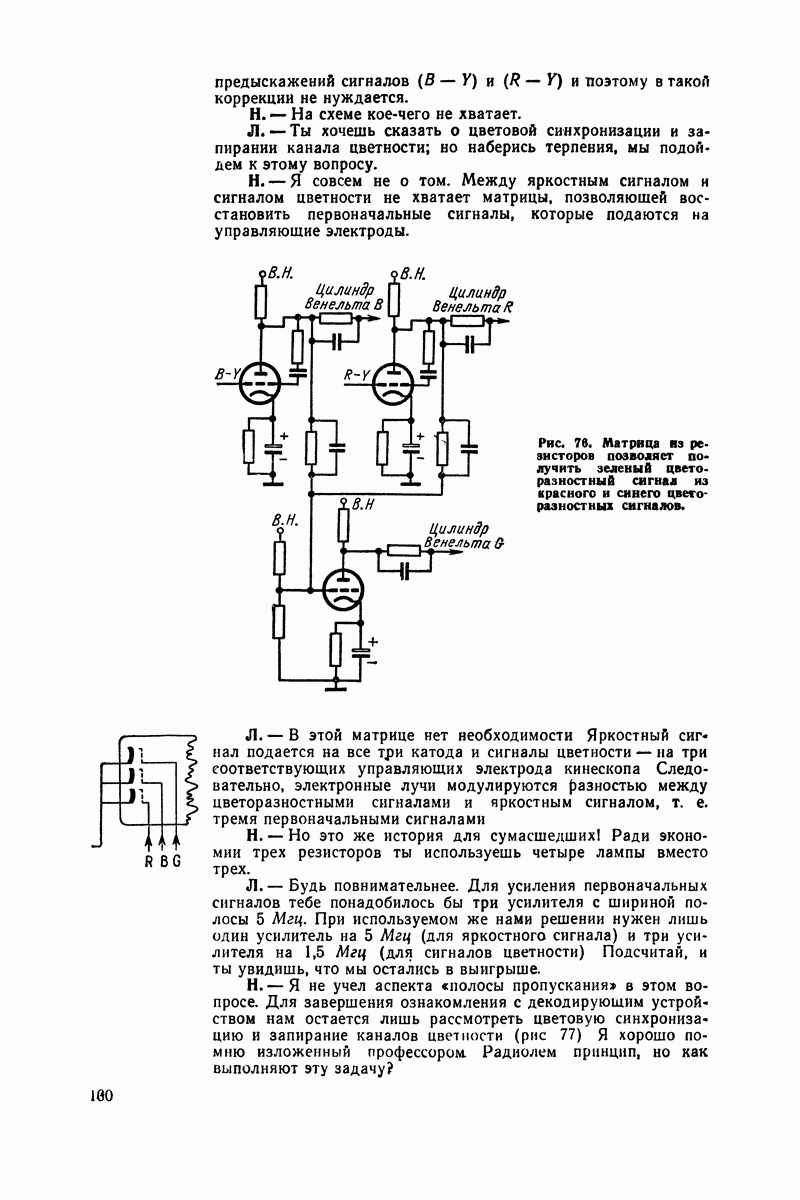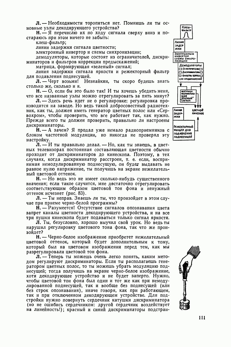 ГЛАВА 3Несколько экспериментов позволяют Любознайкину помочь своему другу лучше понять различные законы, определяющие жизнь мира красок. В связи с этим наши друзья обсуждают следующие вопросы: Синтез цветов с помощью диска Ньютона. Цвет предметов. Субстрактивный и аддитивный методы. Цветовой тон, яркость и насыщенность. Основные цвета. Принцип трехцветного способа получения цветного изображения. Цилиндр Манселла. Это только иллюзия. ВО ДВОРЦЕ ОТКРЫТИЙРазложение и восстановлениеНезнайкин. — Как здесь темно! А я то думал, что этот зал, предназначенный для изучения света, должен быть залит солнцем! Любознайкин. — Не удивляйся. Точно так же, как заболевший лучше понимает, что такое хорошее здоровье, так и в темноте нагляднее проявляется поведение света. Впрочем, вот и доказательство этой моей идеи. Ты видишь здесь основной опыт разложения света с помощью призмы — об этом опыте более подробно мы поговорим в следующий раз. Здесь солнце заменили вольтовой дугой, которая тоже дает белый свет. Но можно и как бы перевернуть условия опыта. Подойди сюда и посмотри через призму на эту полосу цветов спектра.