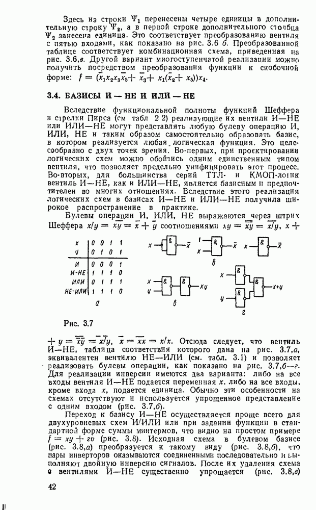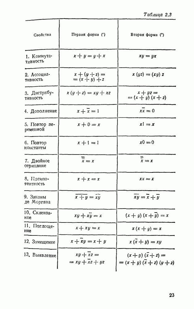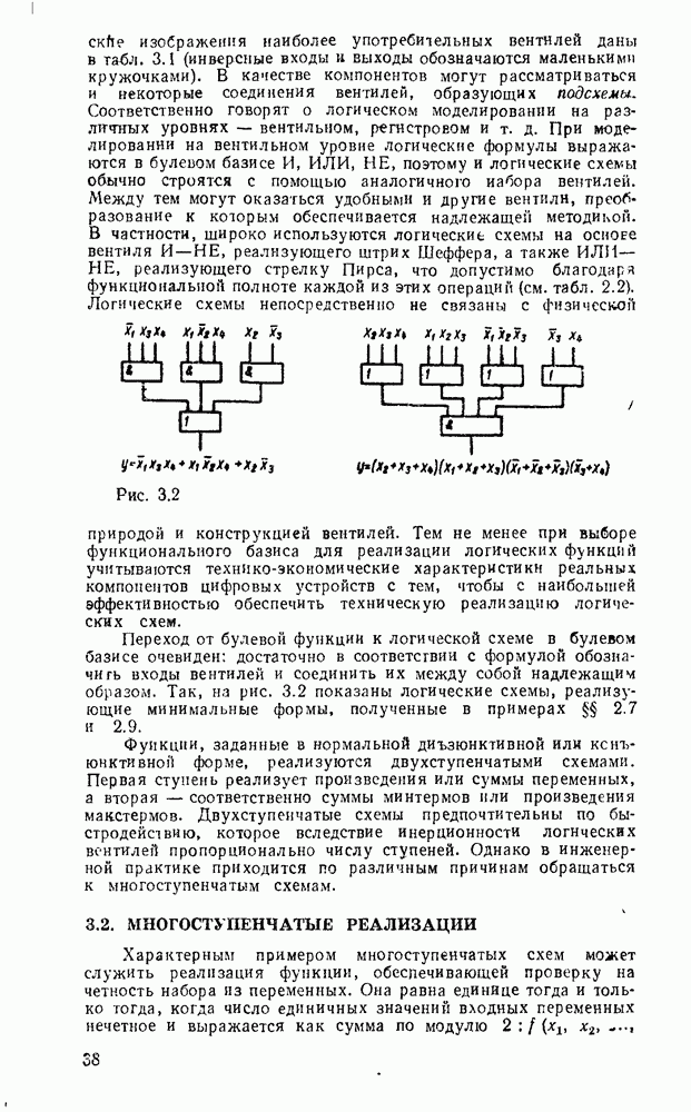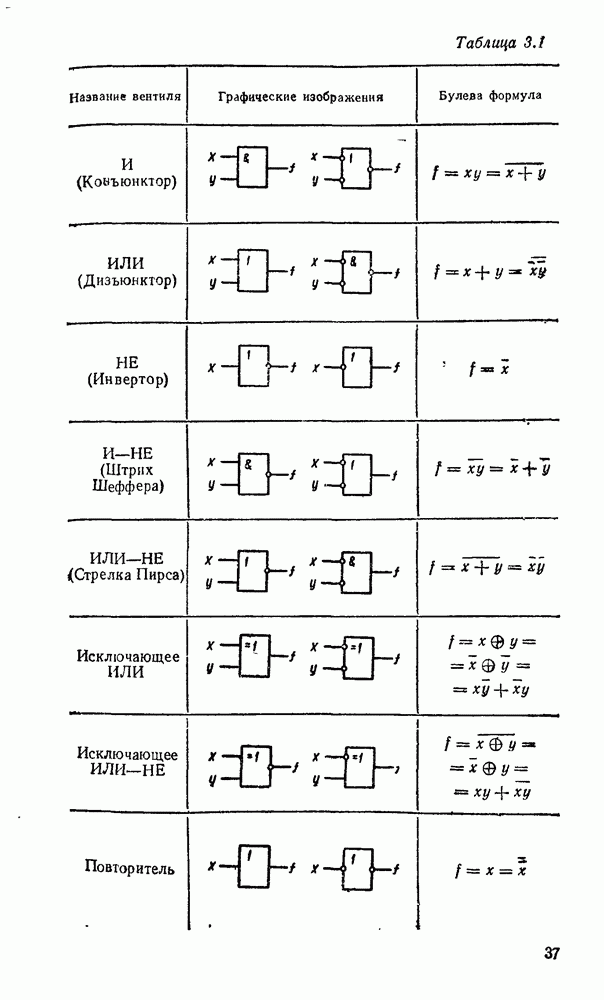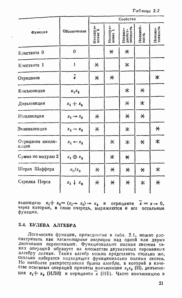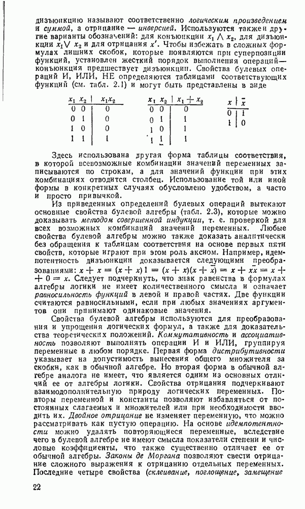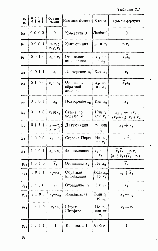 Функции Всевозможные 16 функций двух переменных приведены в табл. 2.1, где указаны наиболее употребительные обозначения и названия. Шесть из приведенных функций не зависят или от Таблица 2.1 (см. оригинал) Среди остальных 10 функций две Функции от любого числа переменных можно получить с помошью суперпозиции, т. е. замещения переменных некоторыми функциями. Например, подставляя в