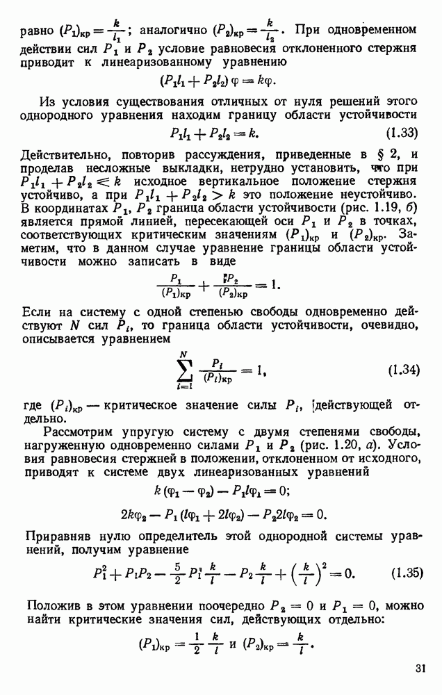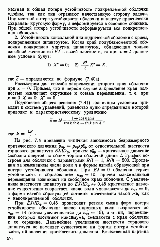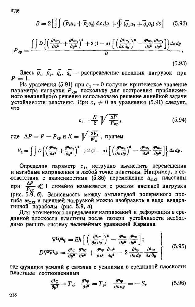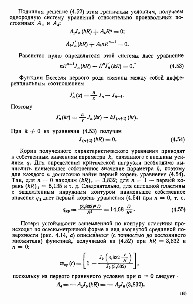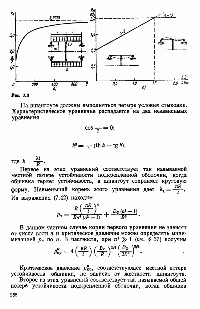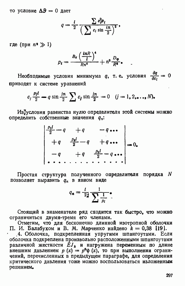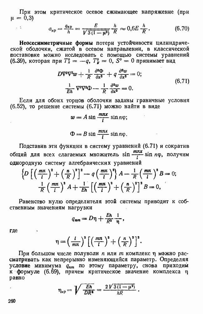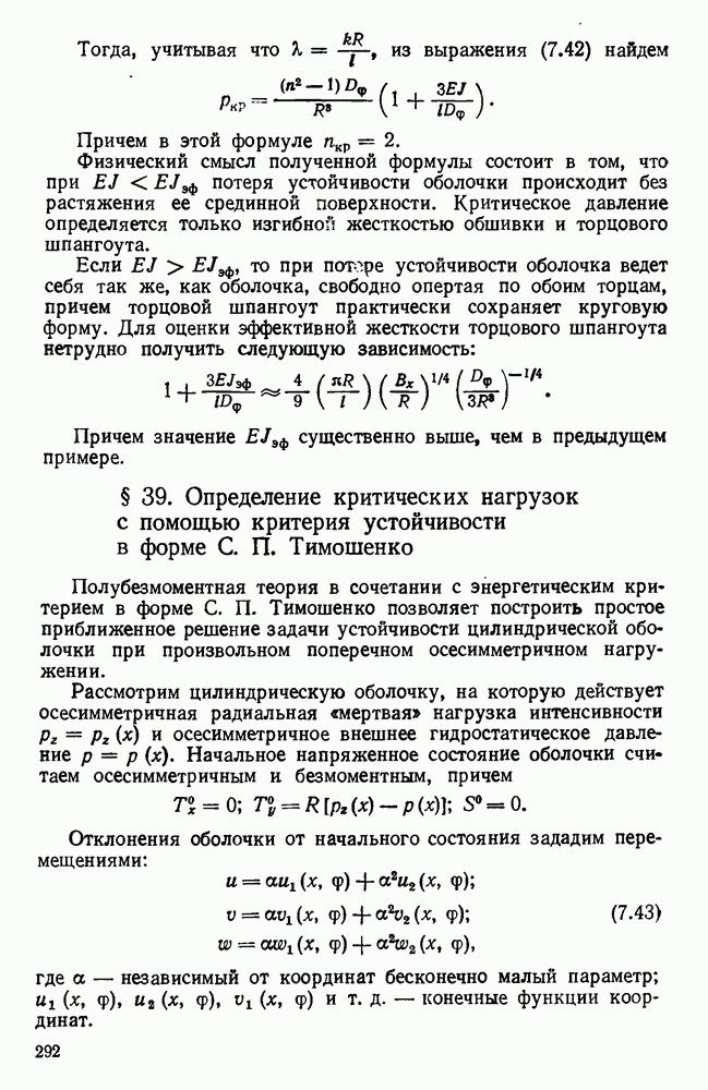 Для существования отличных от тождественного нуля решений выражение, стоящее в фигурных скобках, должно обращаться в нуль. Это условие приводит к уравнению, дающему приближенные значения критических соотношений внешних усилий:
