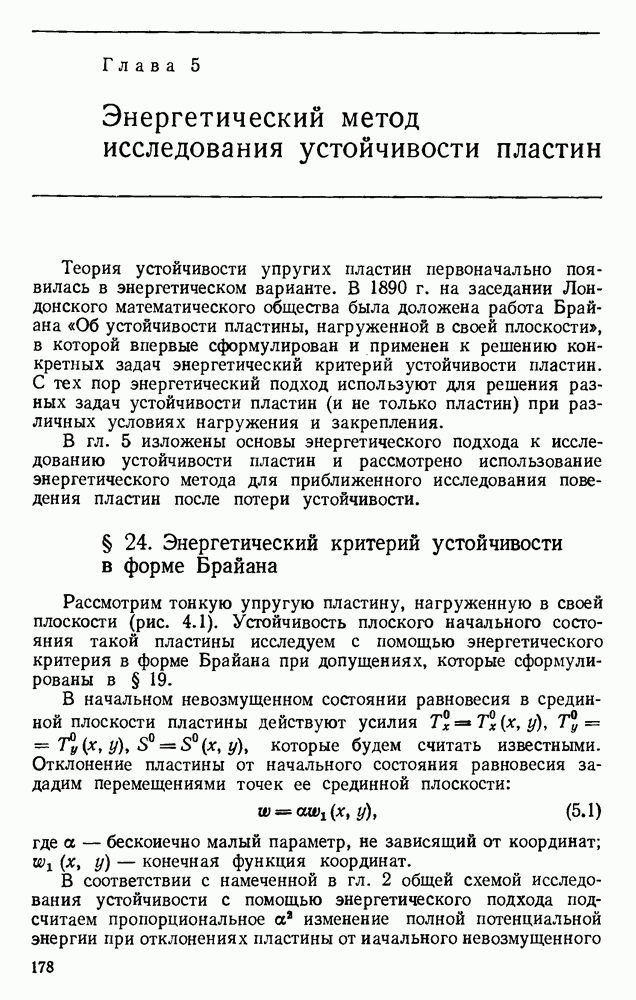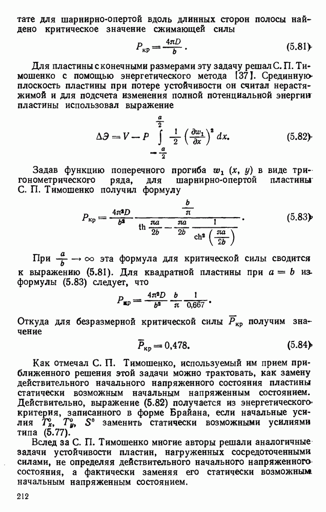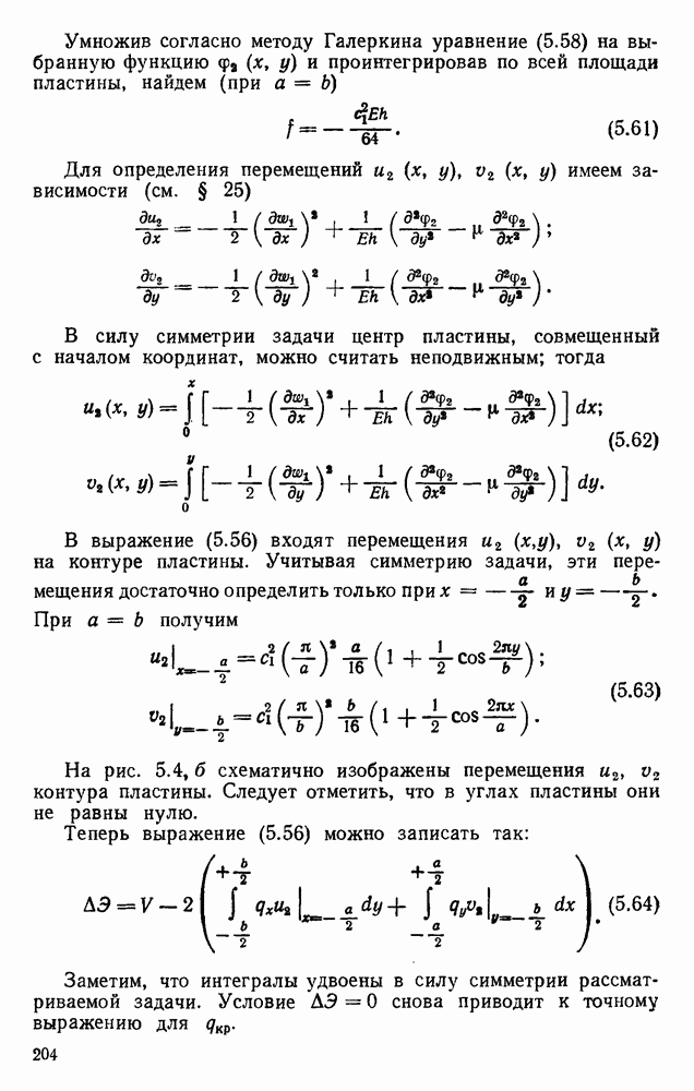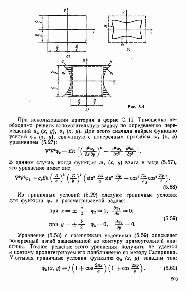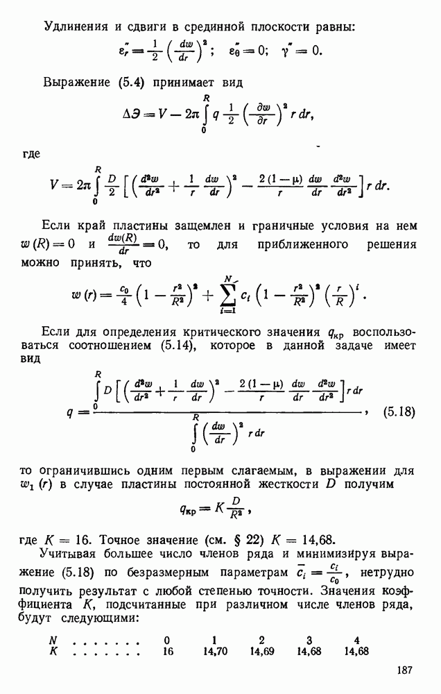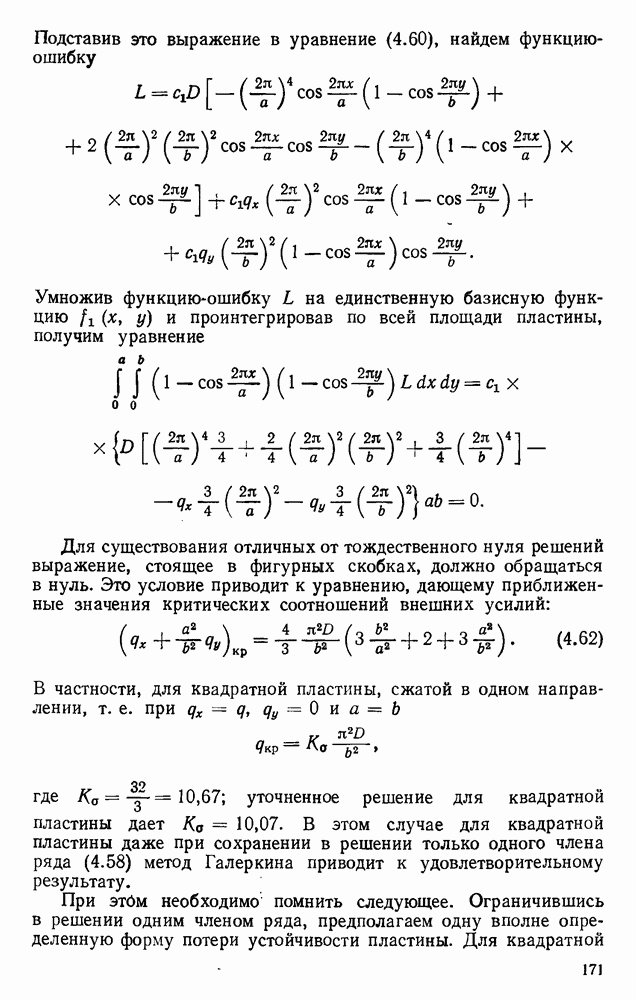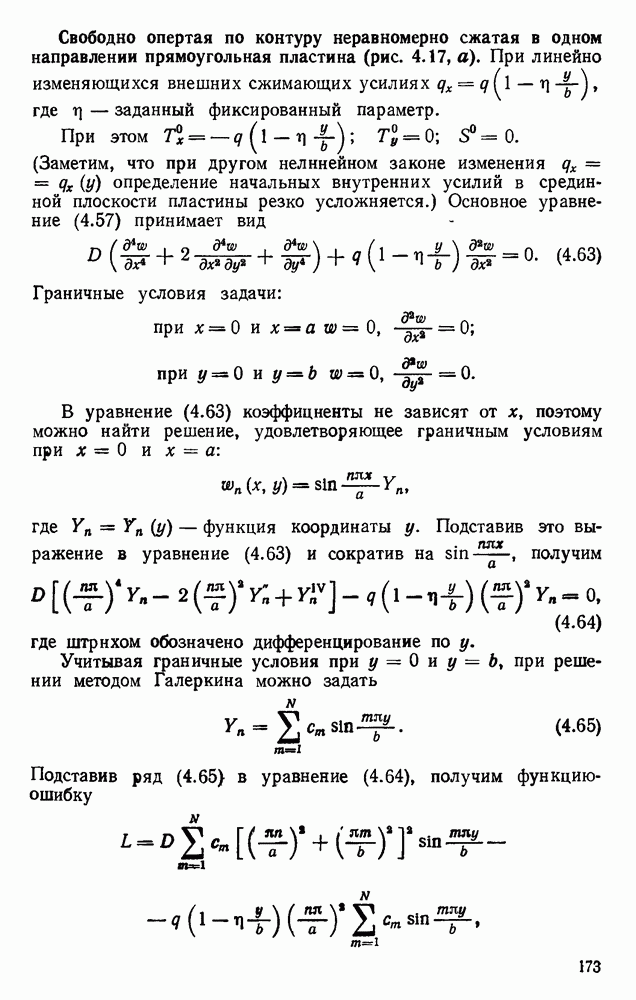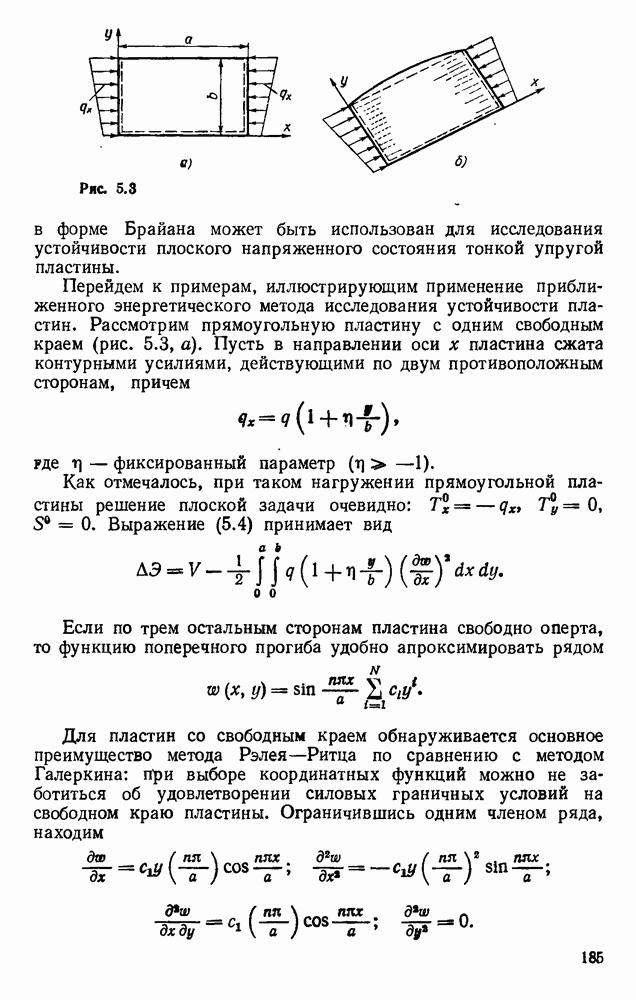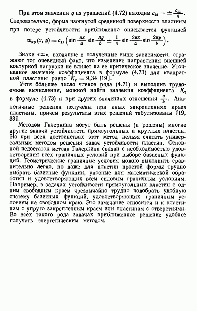 Знаки Учтя большее число членов ряда (4.71) и выполнив трудоемкие вычисления, можной найти значения коэффициента Методом Галеркина могут быть решены (и решены) многие другие задачи устойчивости прямоугольных и круглых пластин. Но при всех достоинствах этот метод нельзя считать универсальным методом решения задач устойчивости пластин. Основной недостаток метода Галеркина связан с необходимостью удовлетворения всех граничных условий при выборе базисных функций. Геометрические граничные условия можно выполнить сравнительно легко, но даже для пластин простой формы трудно выбрать базисные функции, удобные для математической обработки и удовлетворяющих всем силовым граничным условиям. Например, в задачах устойчивости прямоугольных пластин с одним свободным краем чрезвычайно трудно подобрать удобную систему базисных функций, удовлетворяющих граничным условиям на свободном краю. Это замечание относится и к пластинам с упруго закрепленным краем или пластинам с отверстиями. Во всех такого рода задачах приближенное решение удобнее получать энергетическим методом.