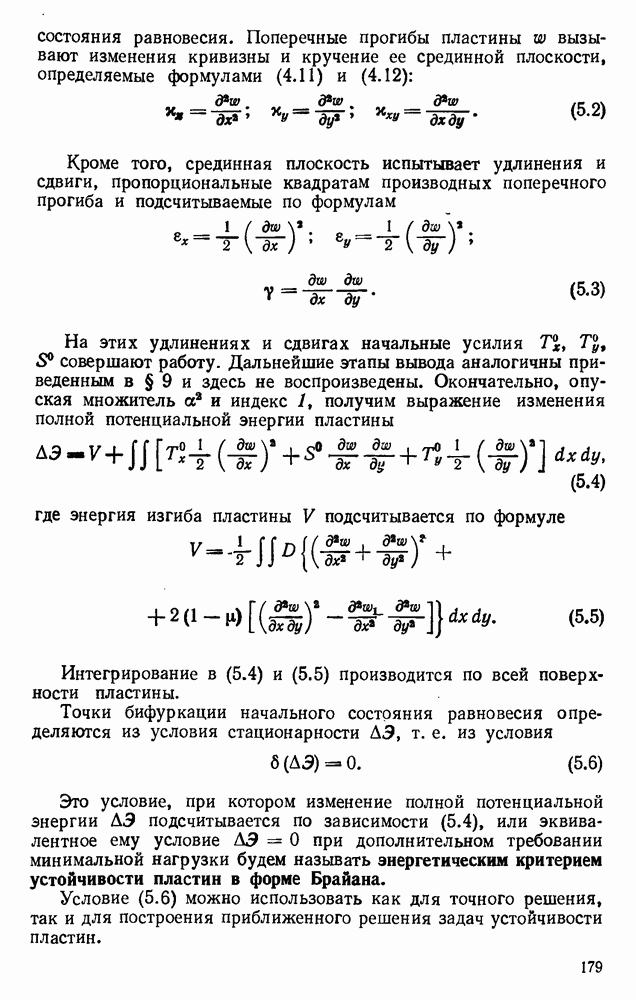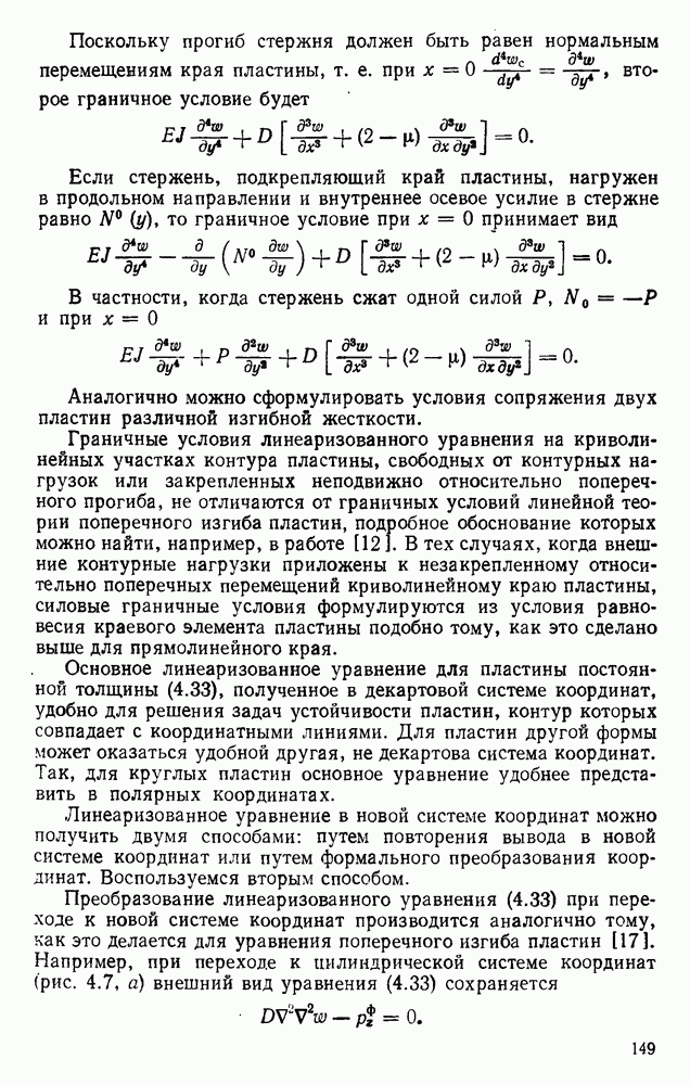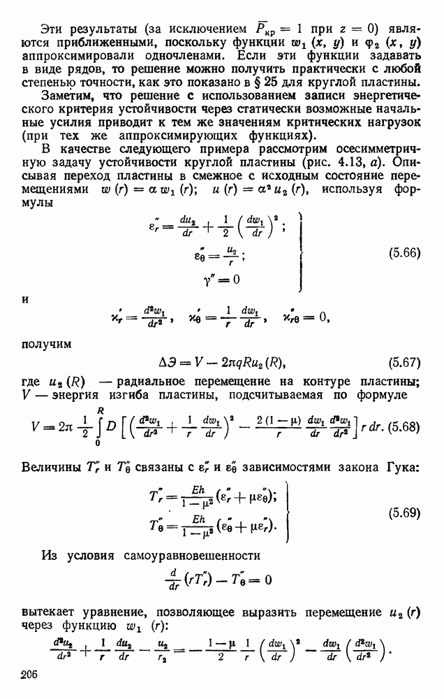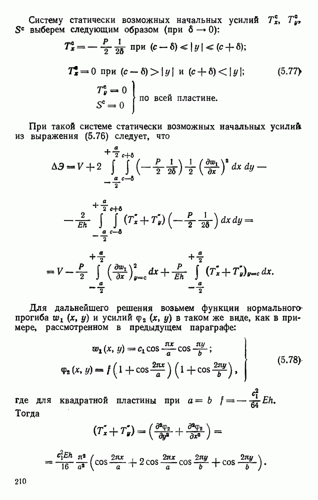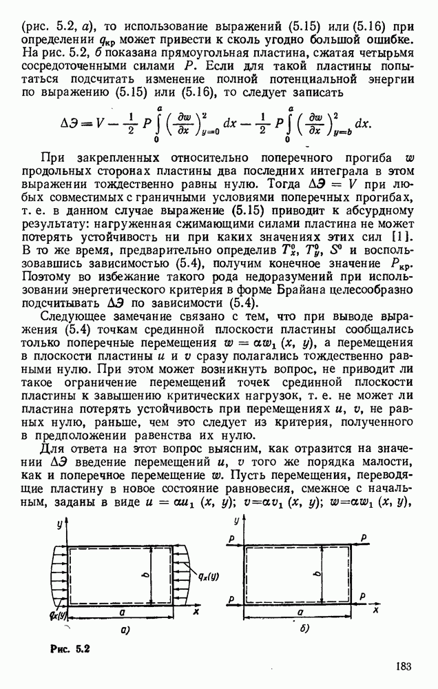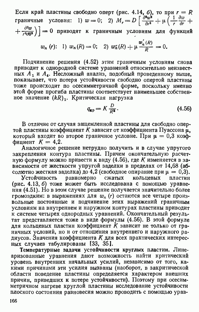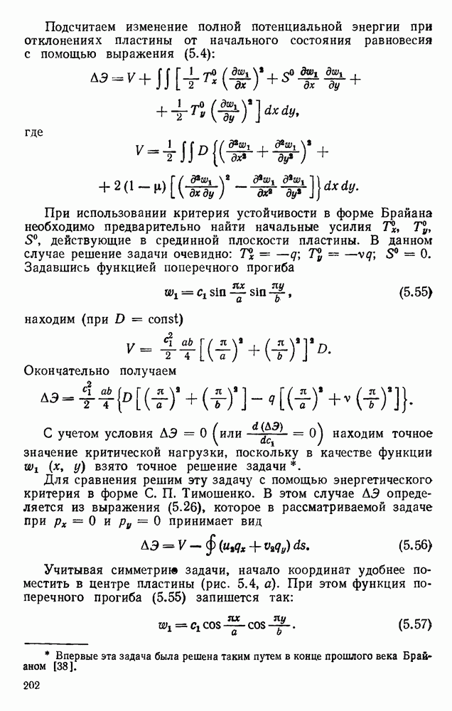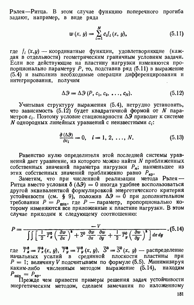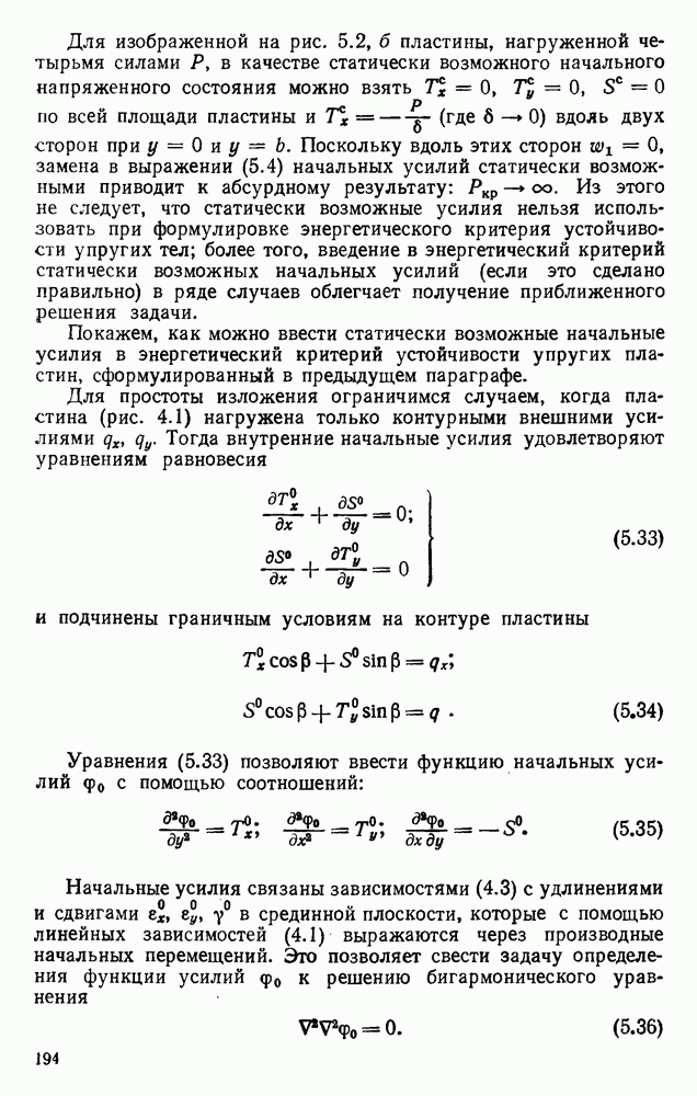 Знаки Учтя большее число членов ряда (4.71) и выполнив трудоемкие вычисления, можной найти значения коэффициента Методом Галеркина могут быть решены (и решены) многие другие задачи устойчивости прямоугольных и круглых пластин. Но при всех достоинствах этот метод нельзя считать универсальным методом решения задач устойчивости пластин. Основной недостаток метода Галеркина связан с необходимостью удовлетворения всех граничных условий при выборе базисных функций. Геометрические граничные условия можно выполнить сравнительно легко, но даже для пластин простой формы трудно выбрать базисные функции, удобные для математической обработки и удовлетворяющих всем силовым граничным условиям. Например, в задачах устойчивости прямоугольных пластин с одним свободным краем чрезвычайно трудно подобрать удобную систему базисных функций, удовлетворяющих граничным условиям на свободном краю. Это замечание относится и к пластинам с упруго закрепленным краем или пластинам с отверстиями. Во всех такого рода задачах приближенное решение удобнее получать энергетическим методом.