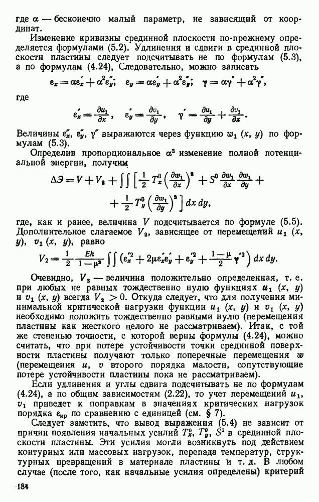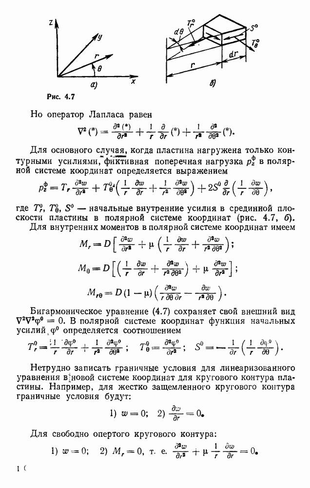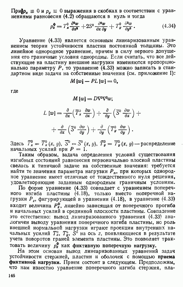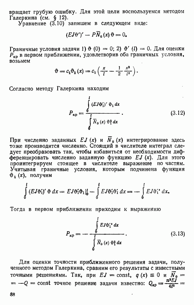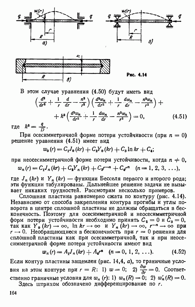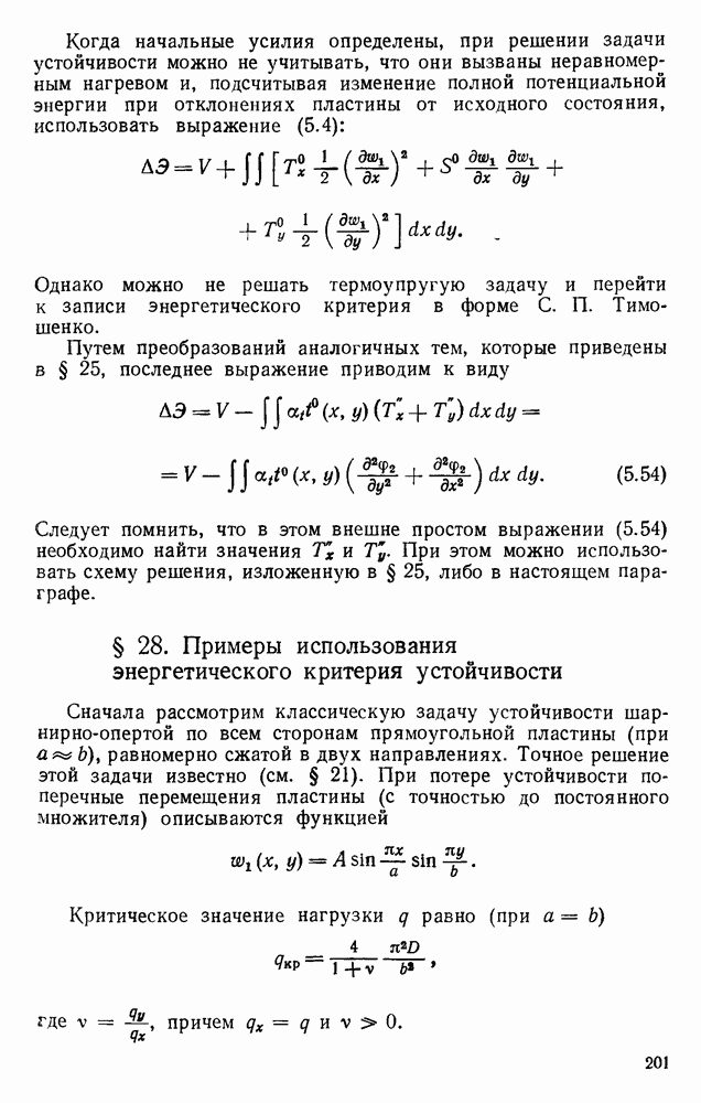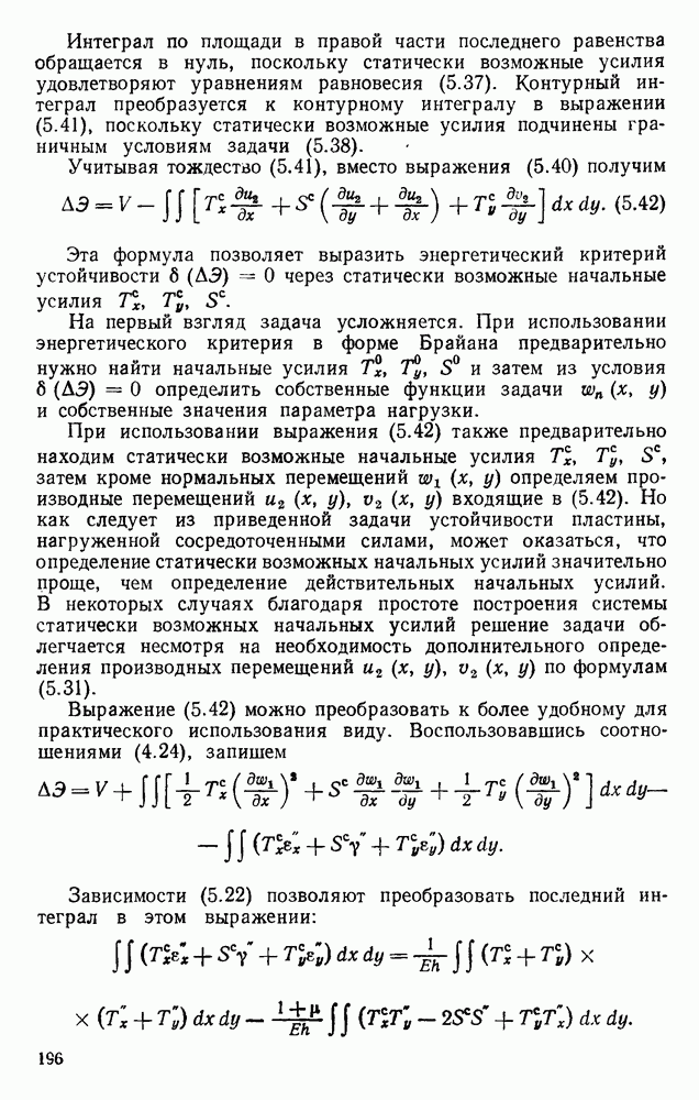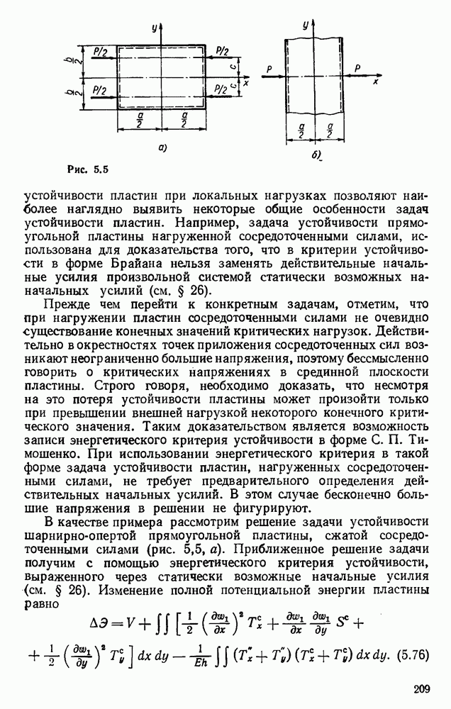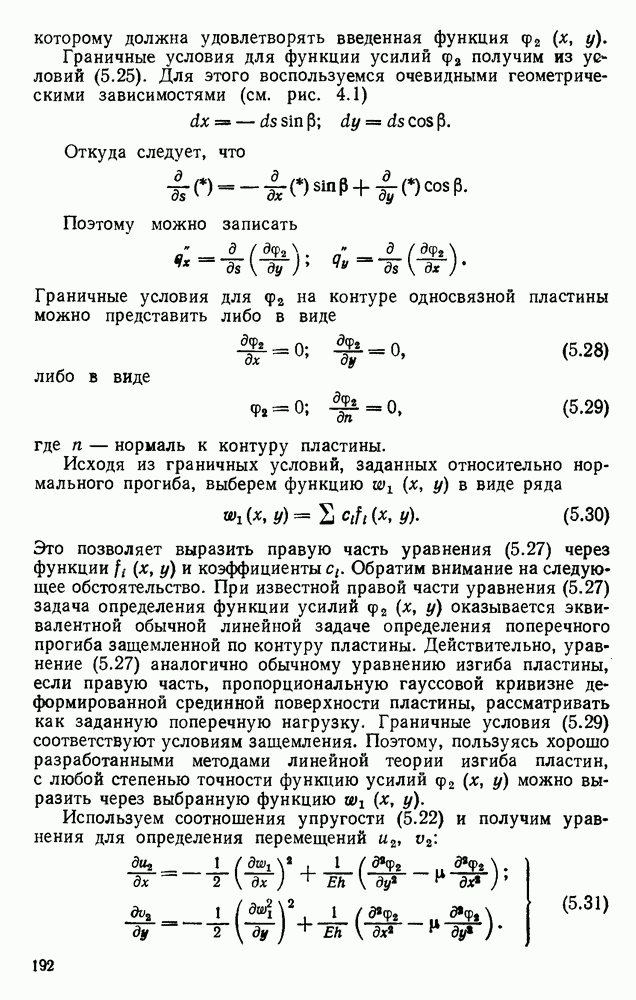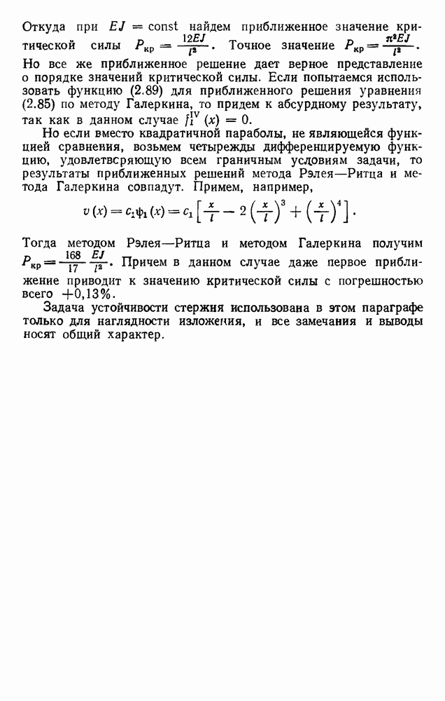 Знаки Учтя большее число членов ряда (4.71) и выполнив трудоемкие вычисления, можной найти значения коэффициента Методом Галеркина могут быть решены (и решены) многие другие задачи устойчивости прямоугольных и круглых пластин. Но при всех достоинствах этот метод нельзя считать универсальным методом решения задач устойчивости пластин. Основной недостаток метода Галеркина связан с необходимостью удовлетворения всех граничных условий при выборе базисных функций. Геометрические граничные условия можно выполнить сравнительно легко, но даже для пластин простой формы трудно выбрать базисные функции, удобные для математической обработки и удовлетворяющих всем силовым граничным условиям. Например, в задачах устойчивости прямоугольных пластин с одним свободным краем чрезвычайно трудно подобрать удобную систему базисных функций, удовлетворяющих граничным условиям на свободном краю. Это замечание относится и к пластинам с упруго закрепленным краем или пластинам с отверстиями. Во всех такого рода задачах приближенное решение удобнее получать энергетическим методом.