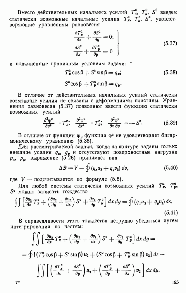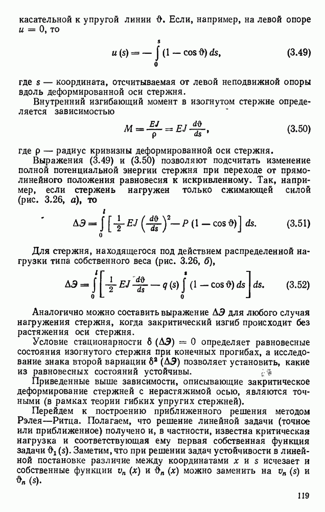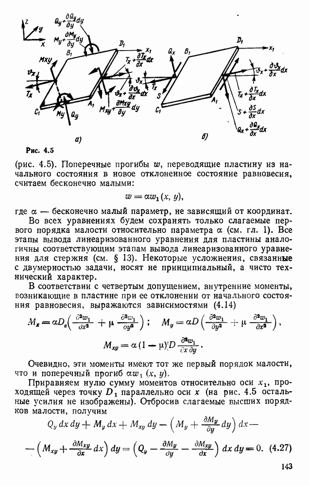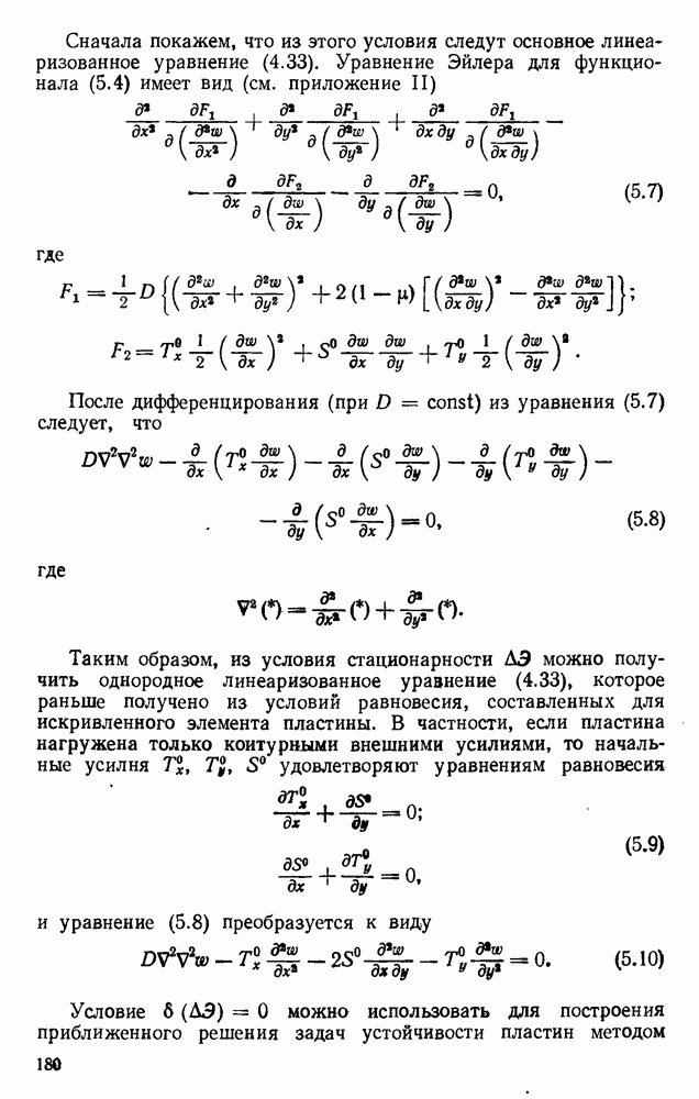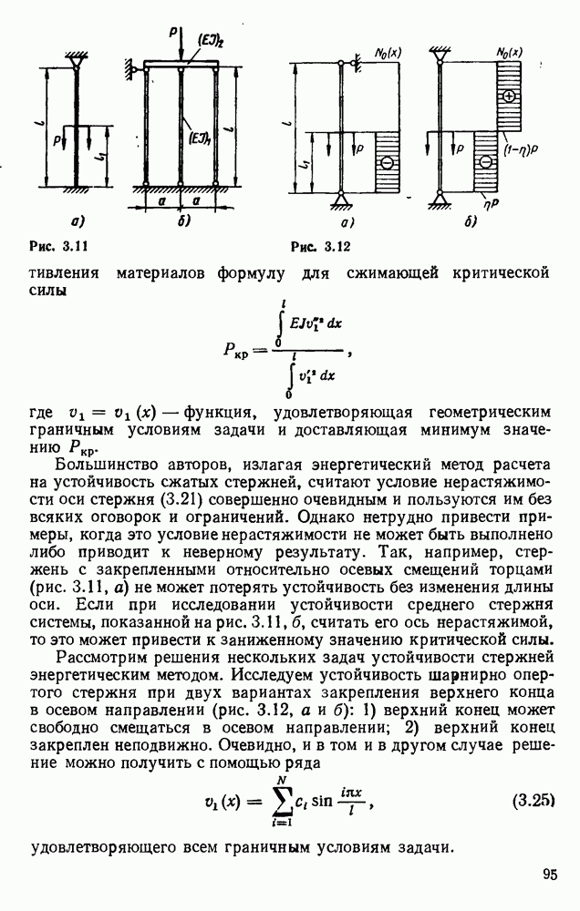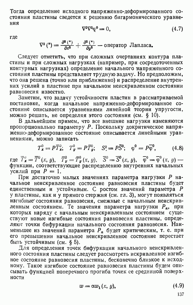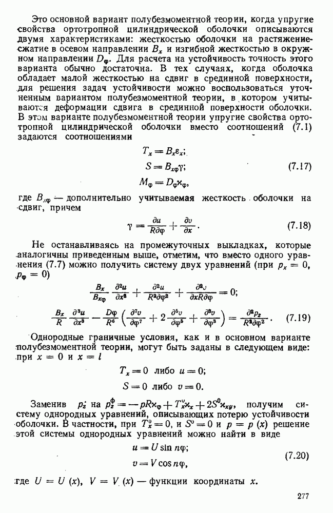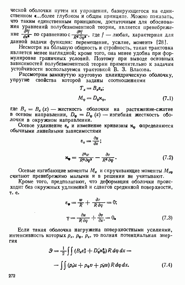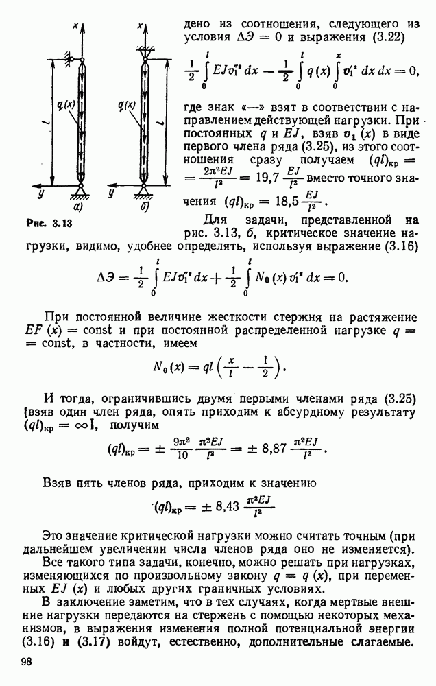 Знаки Учтя большее число членов ряда (4.71) и выполнив трудоемкие вычисления, можной найти значения коэффициента Методом Галеркина могут быть решены (и решены) многие другие задачи устойчивости прямоугольных и круглых пластин. Но при всех достоинствах этот метод нельзя считать универсальным методом решения задач устойчивости пластин. Основной недостаток метода Галеркина связан с необходимостью удовлетворения всех граничных условий при выборе базисных функций. Геометрические граничные условия можно выполнить сравнительно легко, но даже для пластин простой формы трудно выбрать базисные функции, удобные для математической обработки и удовлетворяющих всем силовым граничным условиям. Например, в задачах устойчивости прямоугольных пластин с одним свободным краем чрезвычайно трудно подобрать удобную систему базисных функций, удовлетворяющих граничным условиям на свободном краю. Это замечание относится и к пластинам с упруго закрепленным краем или пластинам с отверстиями. Во всех такого рода задачах приближенное решение удобнее получать энергетическим методом.