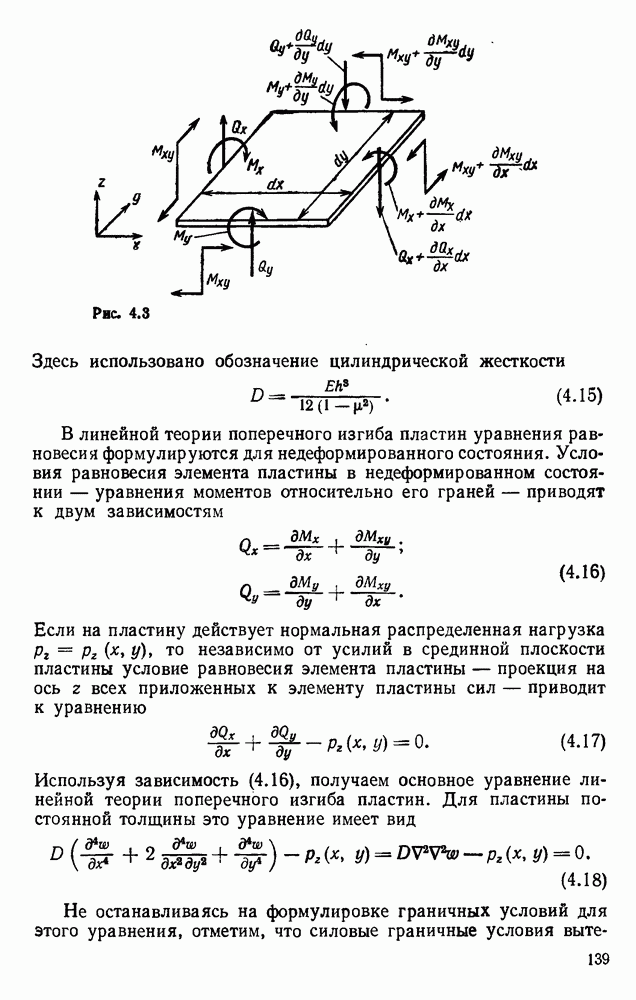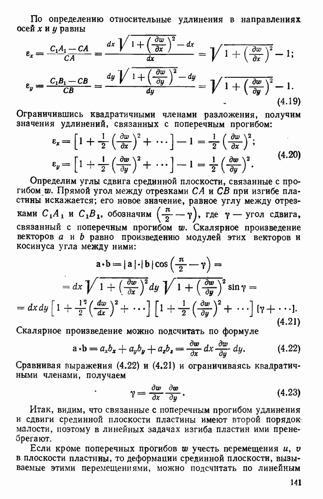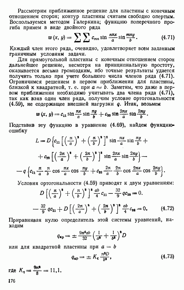 Каждый член этого ряда, очевидно, удовлетворяет всем заданным граничным условиям задачи. Для прямоугольной пластины с конечным отношением сторон дальнейшее решение, несмотря на принципиальную простоту, оказывается весьма громоздким, ибо точные результаты удается получить только при учете большого числа членов ряда (4.71). Ограничимся решением в первом приближении для пластины, близкой к квадратной, т. е. при