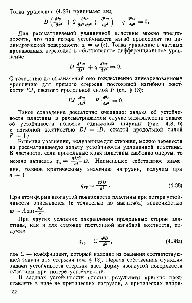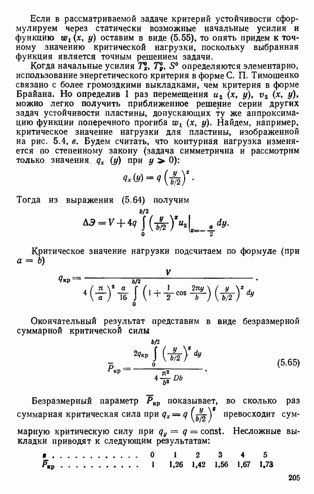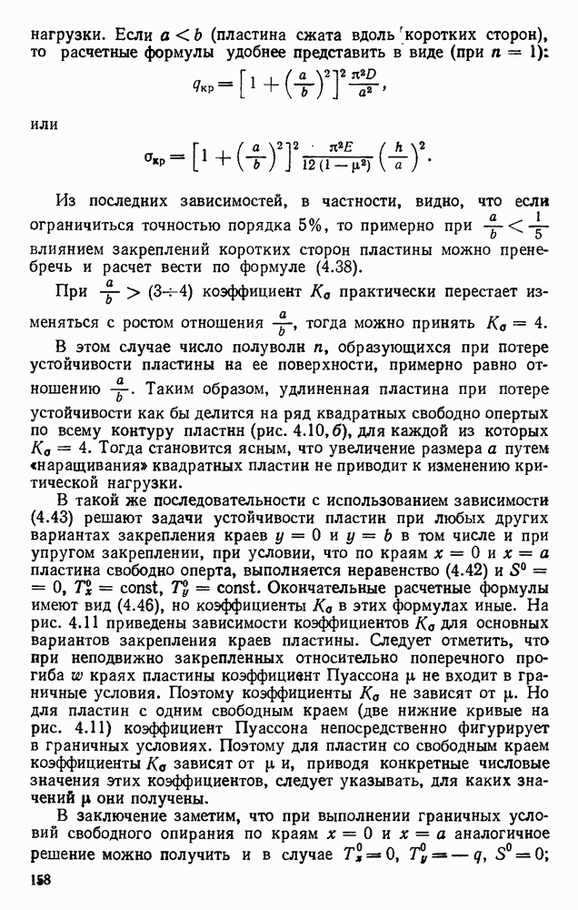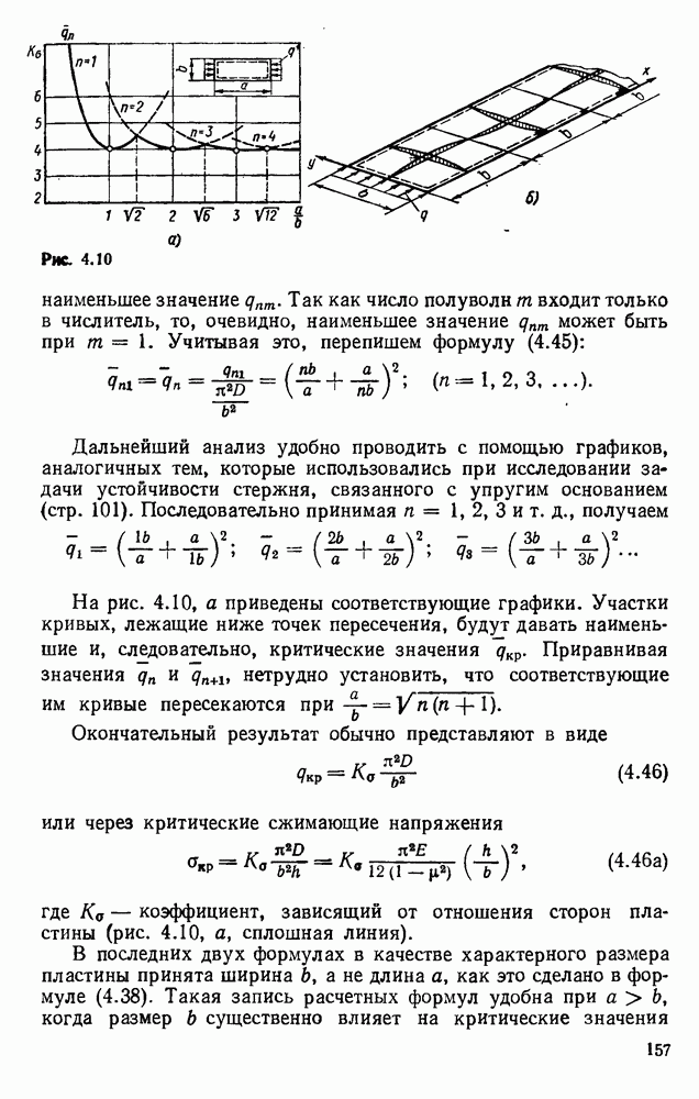 где При этом необходимо помнить следующее. Ограничившись в решении одним членом ряда, предполагаем одну вполне определенную форму потери устойчивости пластины. Для квадратной пластины эта форма близка к действительной, поэтому найденное выше приближенное собственное значение достаточно близко к наименьшему (критическому) точному собственному значению задачи. С изменением параметров упругой системы может происходить резкая качественная смена форм потери устойчивости. Выбранная для приближенного решения функция (4.61) не может отразить такую качественную смену форм потери устойчивости. Поэтому формула (4.62), соответствующая форме потери устойчивости с образованием одной выпучины, при увеличении отношения