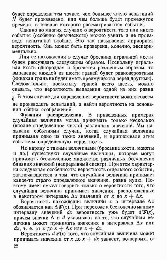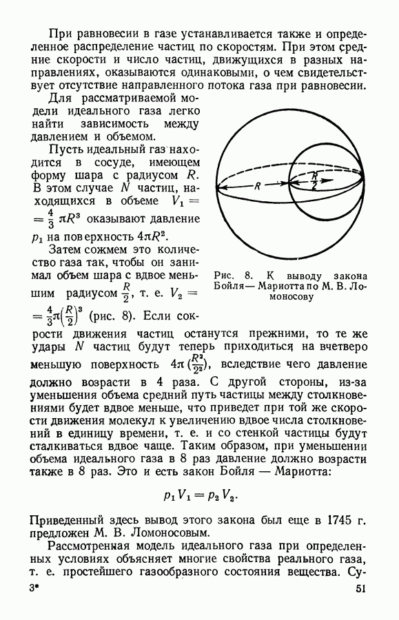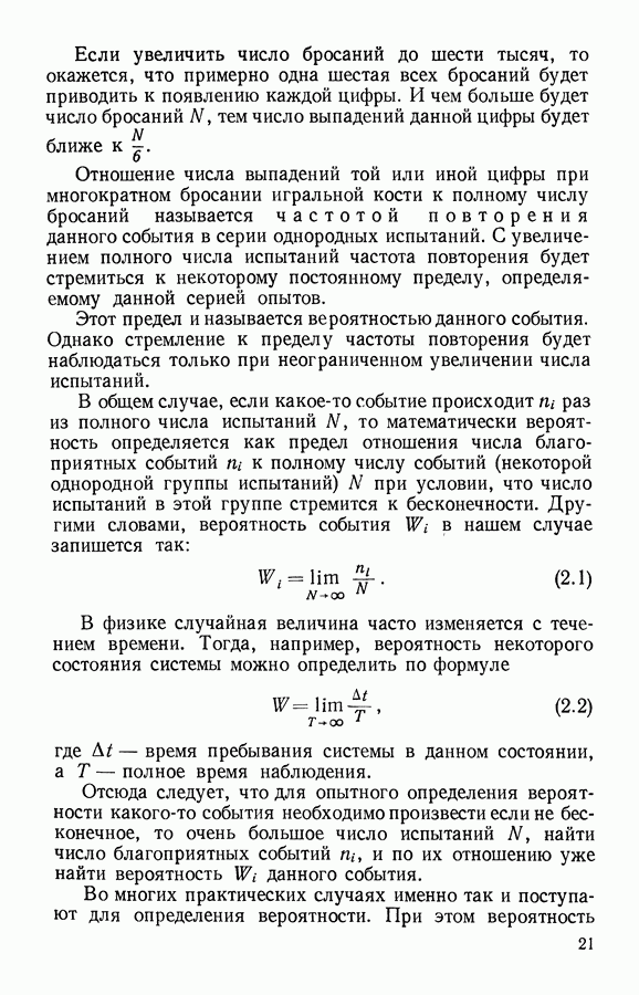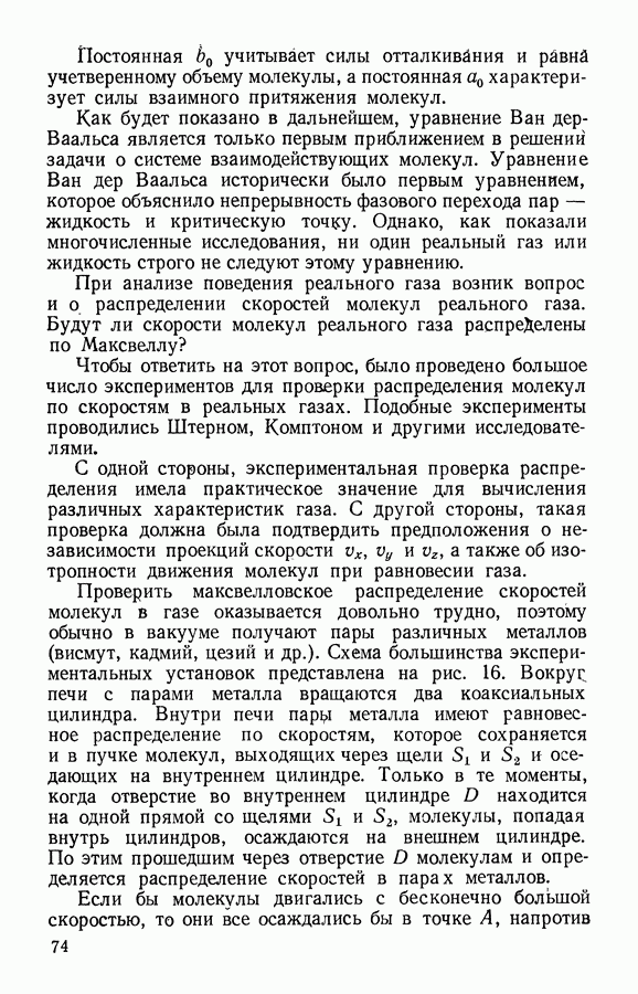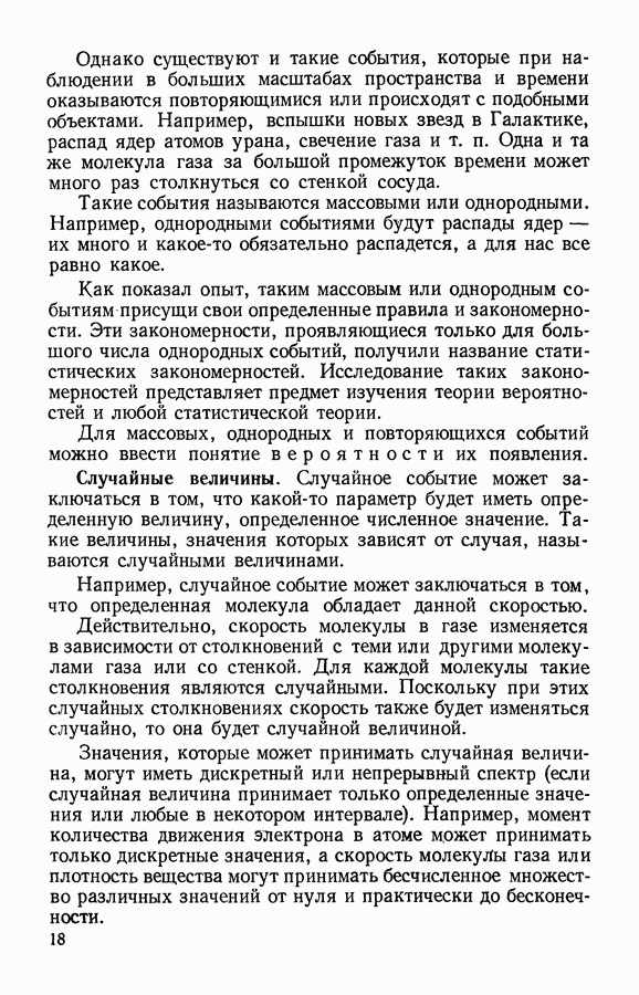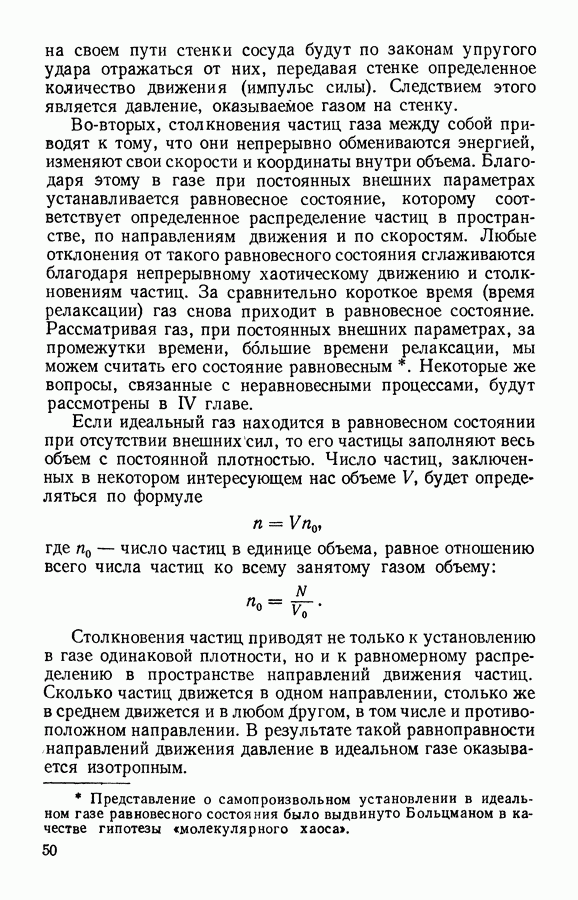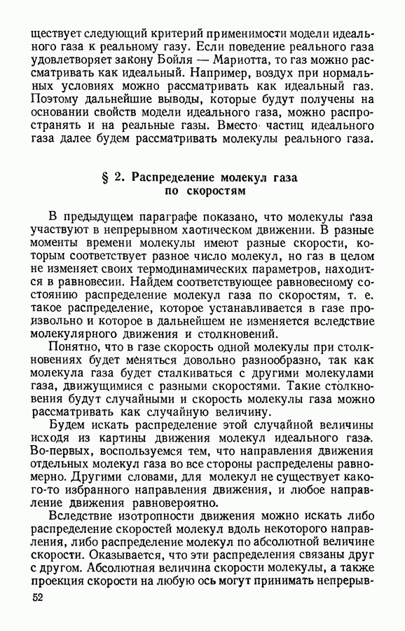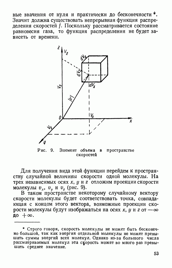 § 2. Распределение молекул газа по скоростямВ предыдущем параграфе показано, что молекулы Газа участвуют в непрерывном хаотическом движении. В разные моменты времени молекулы имеют разные скорости, которым соответствует разное число молекул, но газ в целом не изменяет своих термодинамических параметров, находится в равновесии. Найдем соответствующее равновесному состоянию распределение молекул газа по скоростям, т. е. такое распределение, которое устанавливается в газе произвольно и которое в дальнейшем не изменяется вследствие молекулярного движения и столкновений. Понятно, что в газе скорость одной молекулы при столкновениях будет меняться довольно разнообразно, так как молекула газа будет сталкиваться с другими молекулами газа, движущимися с разными скоростями. Такие столкновения будут случайными и скорость молекулы газа можно рассматривать как случайную величину. Будем искать распределение этой случайной величины исходя из картины движения молекул идеального газа. Во-первых, воспользуемся тем, что направления движения отдельных молекул газа во все стороны распределены равномерно. Другими словами, для молекул не существует какого-то избранного направления движения, и любое направление движения равновероятно. Вследствие изотропности движения можно искать либо распределение скоростей молекул вдоль некоторого направления, либо распределение молекул по абсолютной величине скорости. Оказывается, что эти распределения связаны друг с другом. Абсолютная величина скорости молекулы, а также проекция скорости на любую ось могут принимать непрерывные значения от нуля и практически до бесконечности Значит должна существовать непрерывная функция распределения скоростей