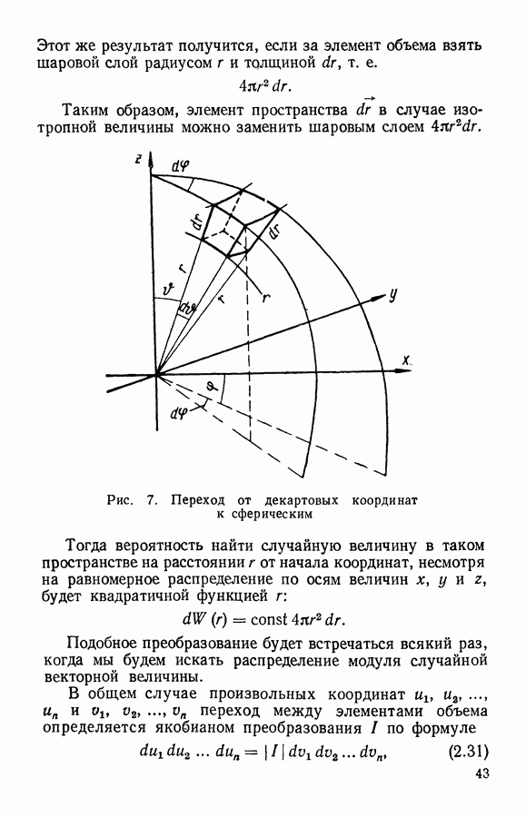 Рис. 9. Элемент объема в пространстве скоростей Для получения вида этой функции перейдем к пространству случайной величины скорости одной молекулы. На трех независимых осях  В таком пространстве некоторому случайному вектору скорости молекулы будет соответствовать точка, совпадающая с концом этого вектора, возможные проекции скорости молекулы будут изображаться на осях  Вероятность