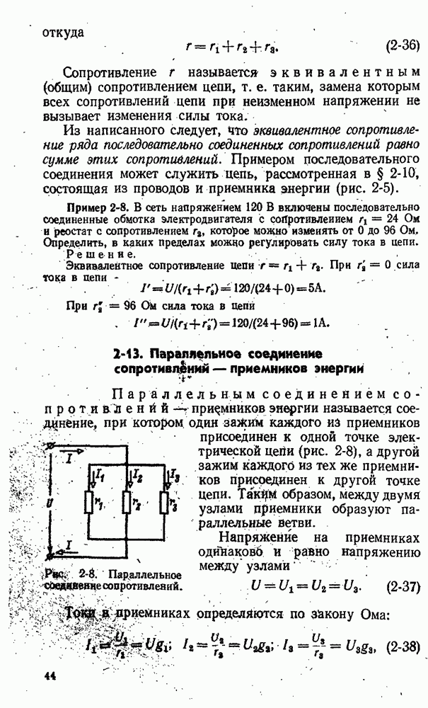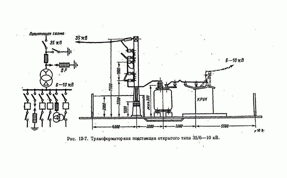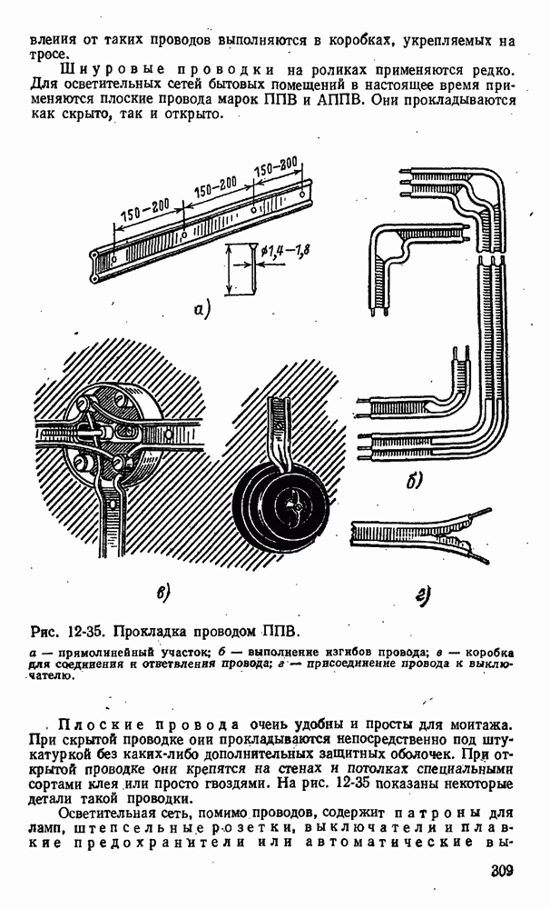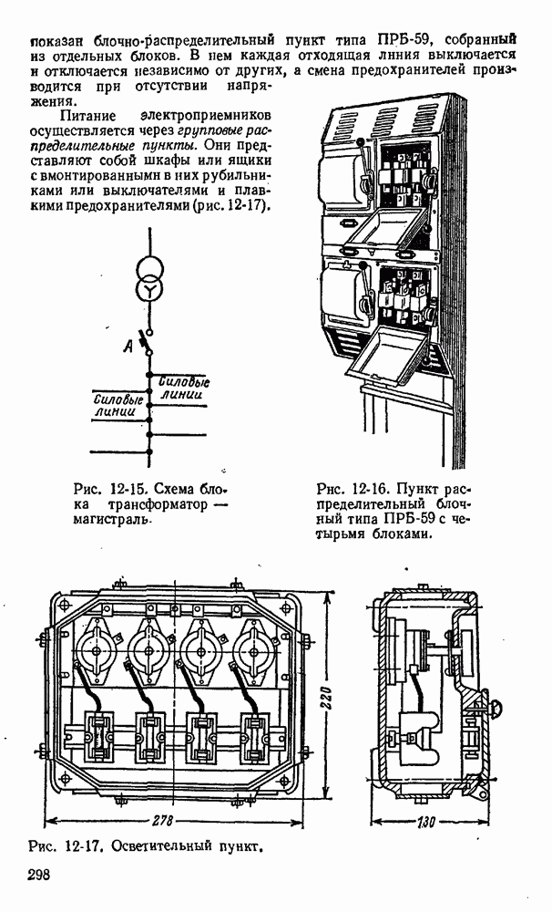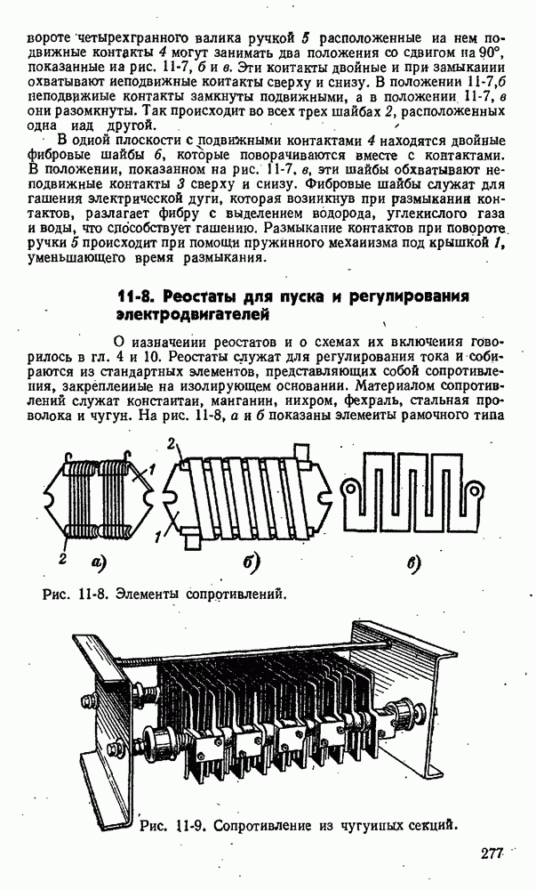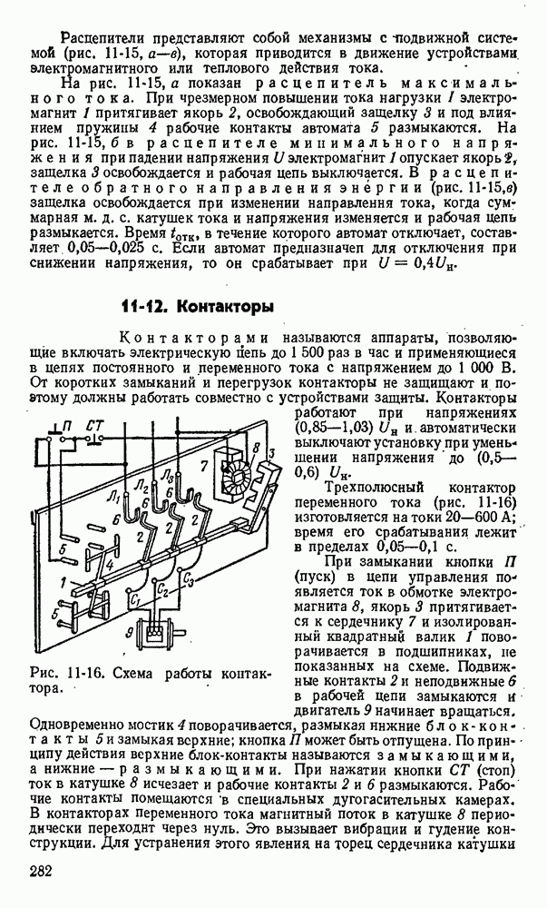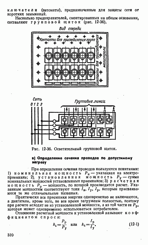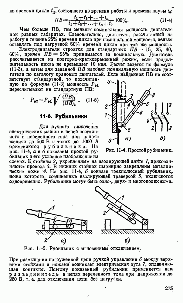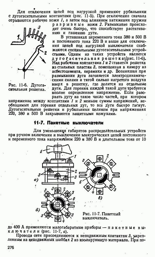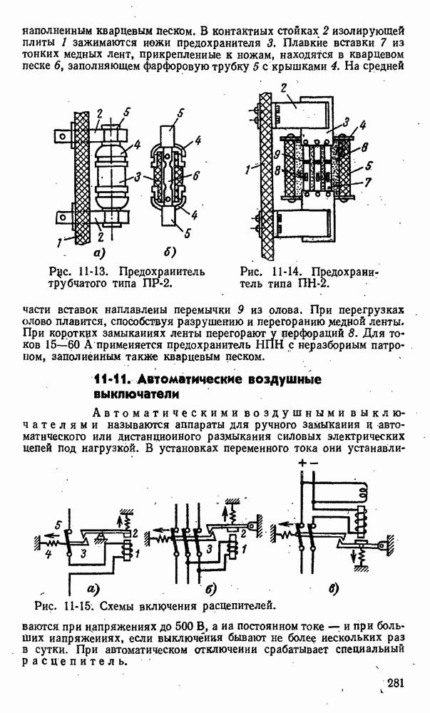 показан на рис. 11-13. На изолирующей плите 1 между контактными стойками 2 как нож рубильника вставлен предохранитель 3 в виде фибровой трубки. Эта трубка разборная, плотно закрытая латунными колпаками 4. Детали I служат для крепления плавкой вставки 6 и как ножи для включения в стойки 2. При коротком замыкании плавкая вставка плавится одшр временно в нескольких узких местах, что способствует быстрому гашению электрической дуги.