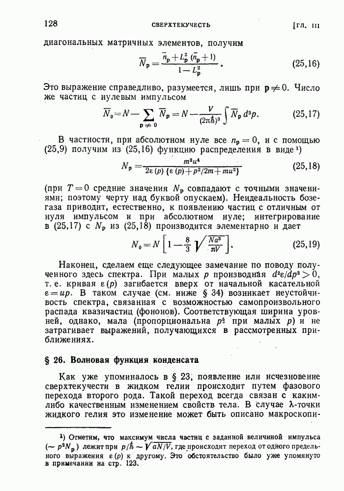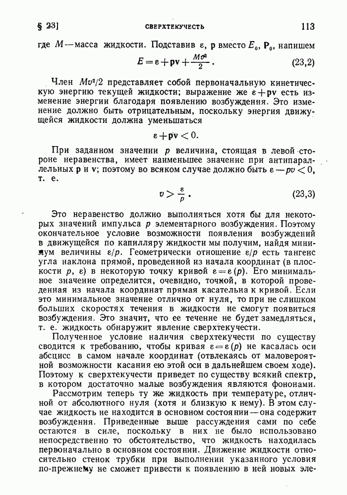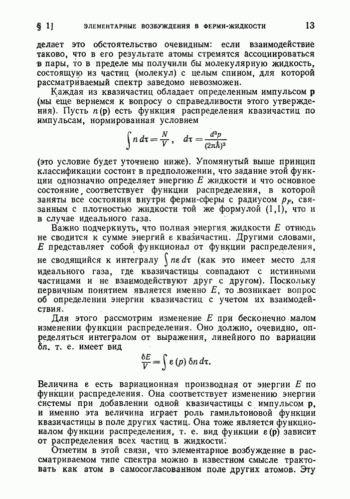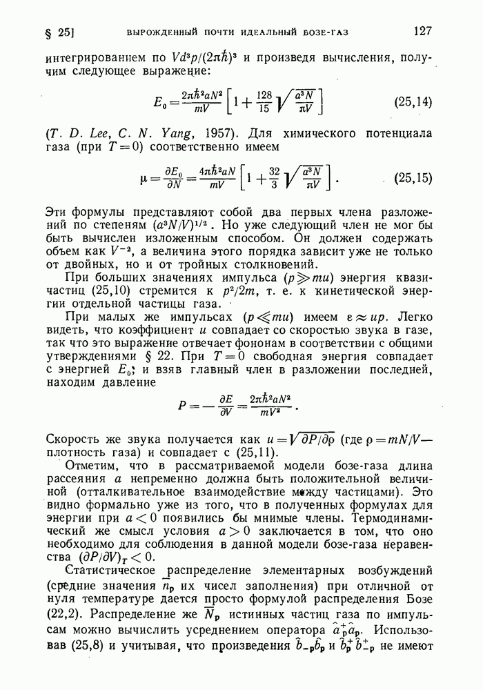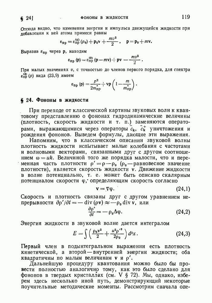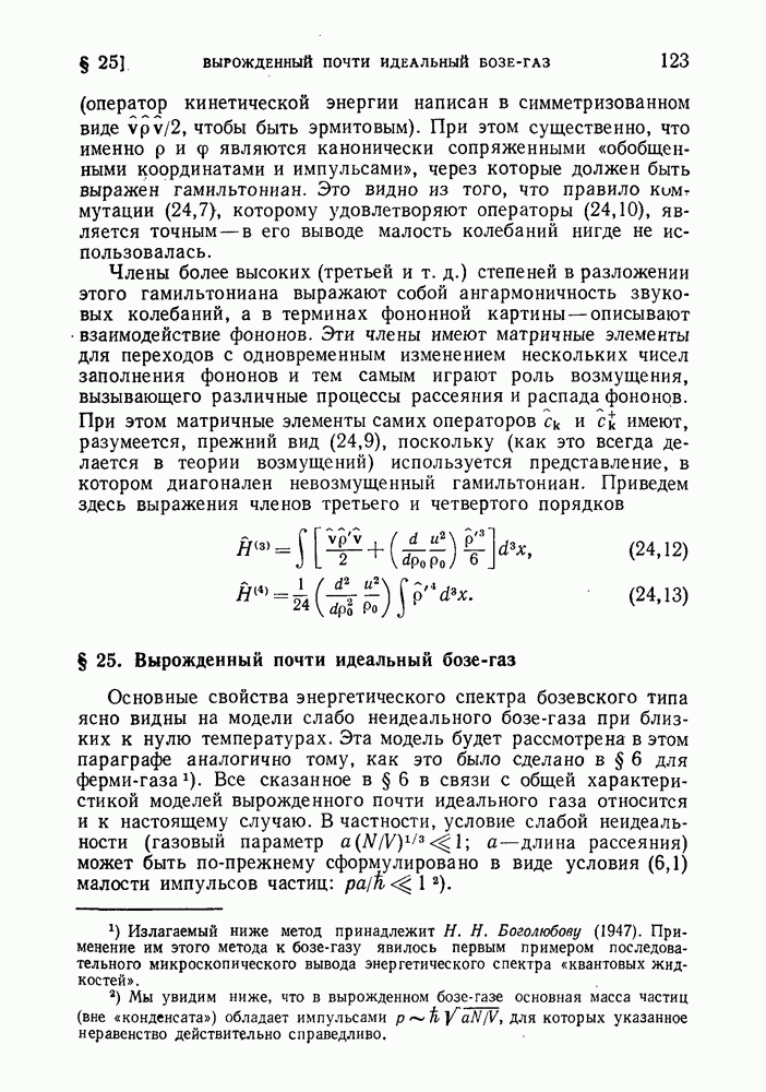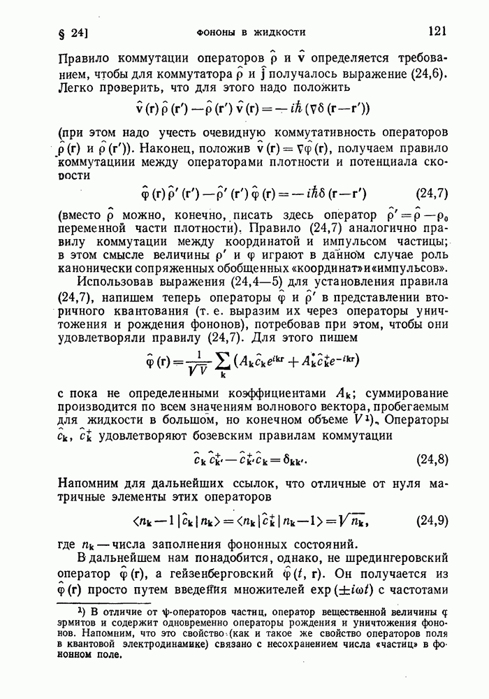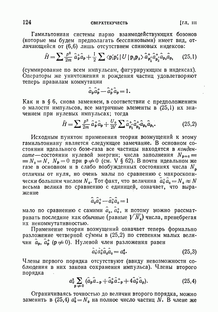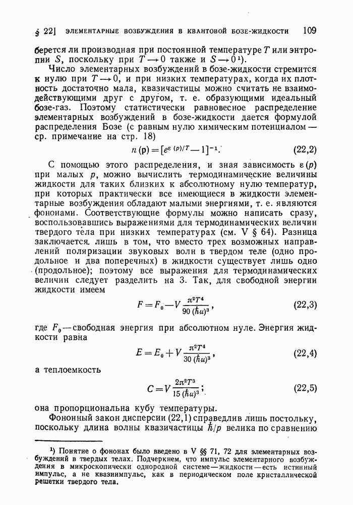 ГЛАВА III. СВЕРХТЕКУЧЕСТЬ§ 22. Элементарные возбуждения в квантовой бозе-жидкостиОбратимся теперь к изучению квантовых жидкостей с энергетическим спектром совершенно иного типа, который можно назвать бозевским. Этот спектр характеризуется тем, что элементарные возбуждения (отсутствующие в основном состоянии жидкости) могут появляться и исчезать поодиночке. Но момент импульса всякой квантовомеханической системы (в данном случае жидкости) может испытывать изменения лишь на целое число. Поэтому возникающие поодиночке элементарные возбуждения должны обладать целочисленным моментом и, следовательно, подчиняться статистике Бозе. Спектром такого типа должна во всяком случае обладать всякая квантовая жидкость, состоящая из частиц с целым спином (таков жидкий изотоп Напомним для сравнения, что в ферми-жидкости, при описании ее в терминах спектра элементарных возбуждений, отсутствующих в основном состоянии (см. конец § 1), эти возбуждения могут появляться или исчезать лишь парами. Именно с этим связана возможность элементарным возбуждениям в этом типе спектра иметь полуцелый спин. В квантовой бозе-жидкости элементарные возбуждения с малыми импульсами
