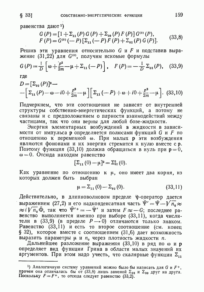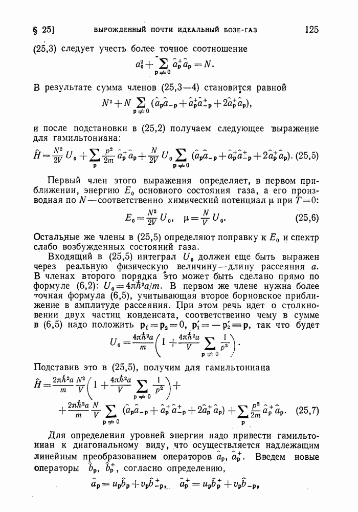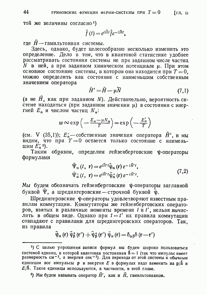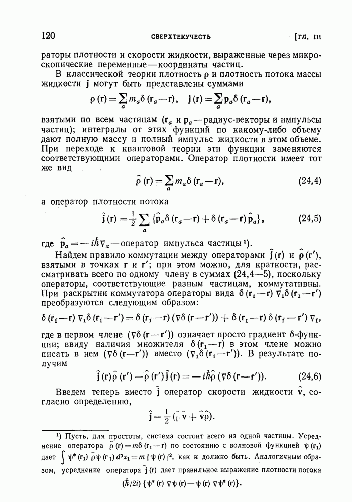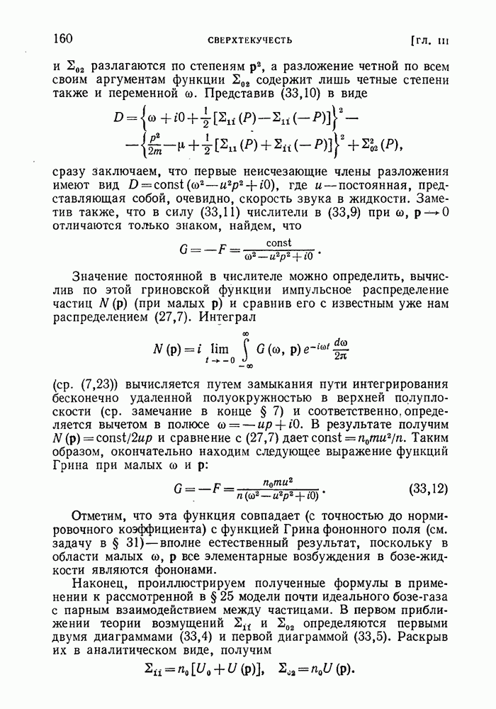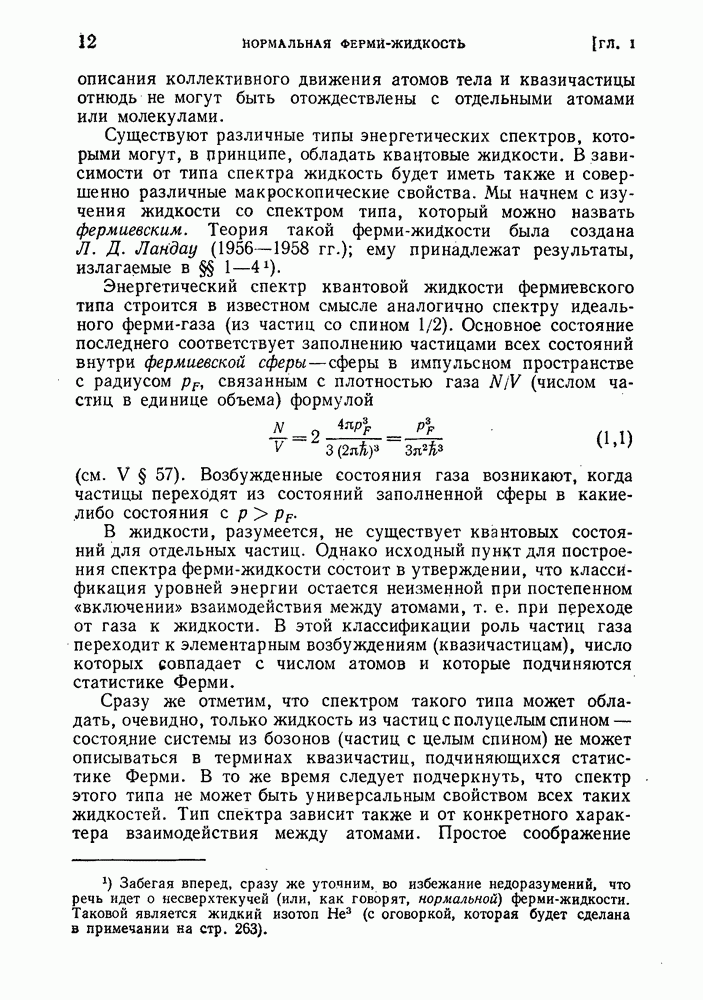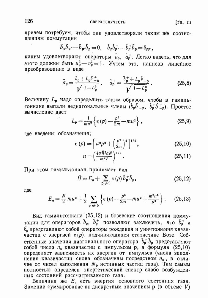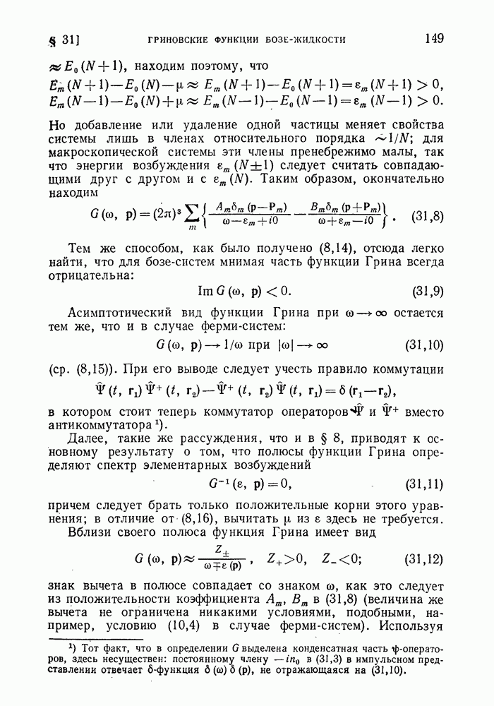 ГЛАВА III. СВЕРХТЕКУЧЕСТЬ§ 22. Элементарные возбуждения в квантовой бозе-жидкостиОбратимся теперь к изучению квантовых жидкостей с энергетическим спектром совершенно иного типа, который можно назвать бозевским. Этот спектр характеризуется тем, что элементарные возбуждения (отсутствующие в основном состоянии жидкости) могут появляться и исчезать поодиночке. Но момент импульса всякой квантовомеханической системы (в данном случае жидкости) может испытывать изменения лишь на целое число. Поэтому возникающие поодиночке элементарные возбуждения должны обладать целочисленным моментом и, следовательно, подчиняться статистике Бозе. Спектром такого типа должна во всяком случае обладать всякая квантовая жидкость, состоящая из частиц с целым спином (таков жидкий изотоп Напомним для сравнения, что в ферми-жидкости, при описании ее в терминах спектра элементарных возбуждений, отсутствующих в основном состоянии (см. конец § 1), эти возбуждения могут появляться или исчезать лишь парами. Именно с этим связана возможность элементарным возбуждениям в этом типе спектра иметь полуцелый спин. В квантовой бозе-жидкости элементарные возбуждения с малыми импульсами