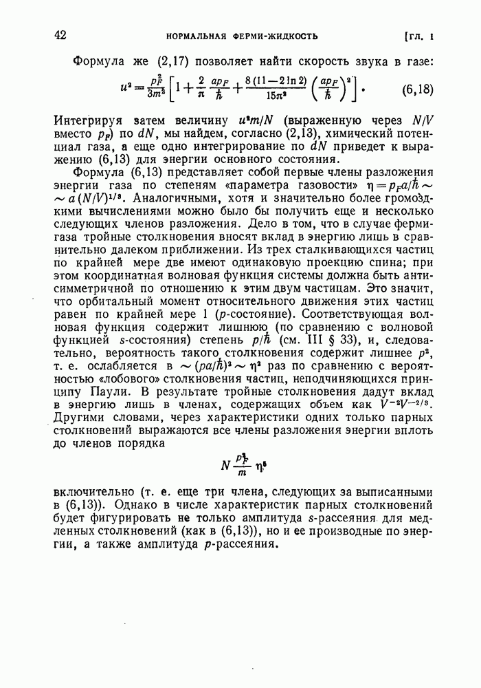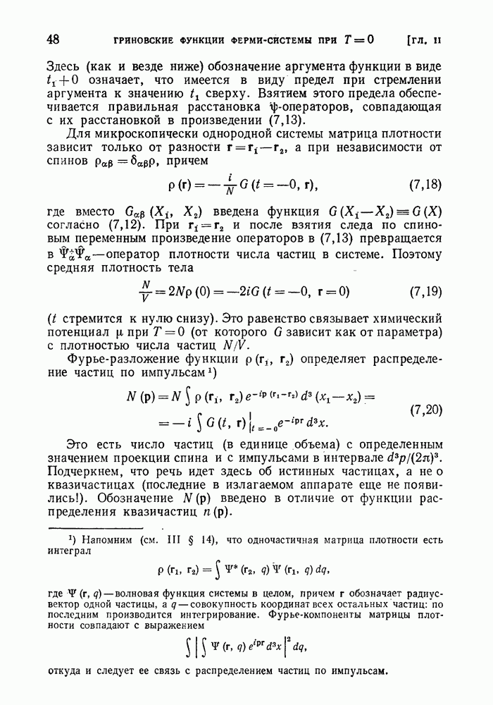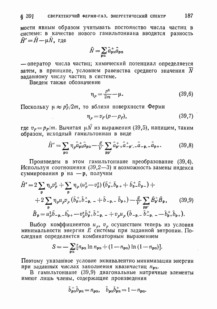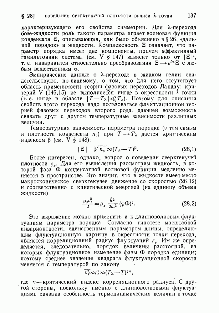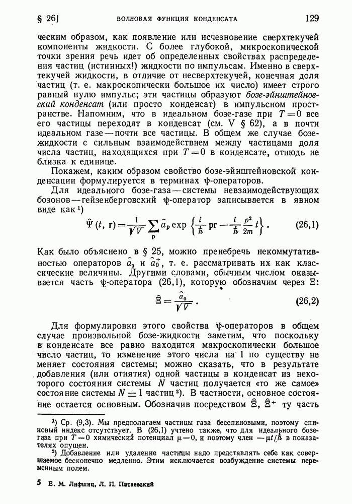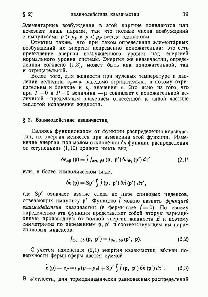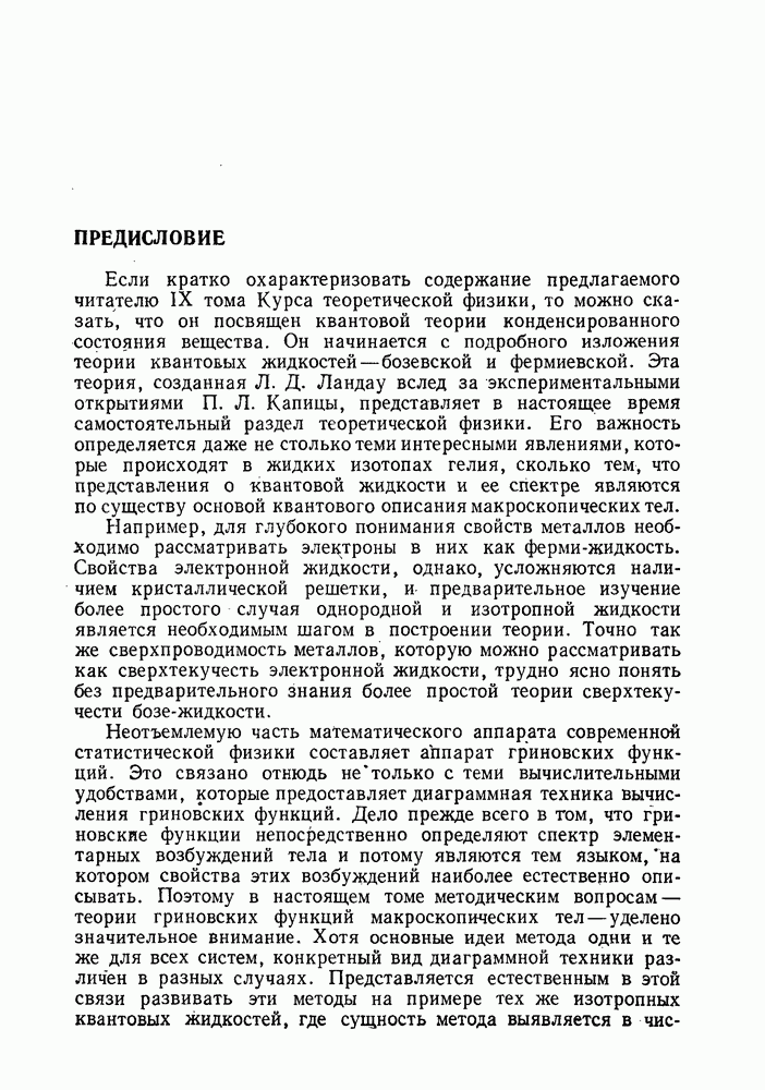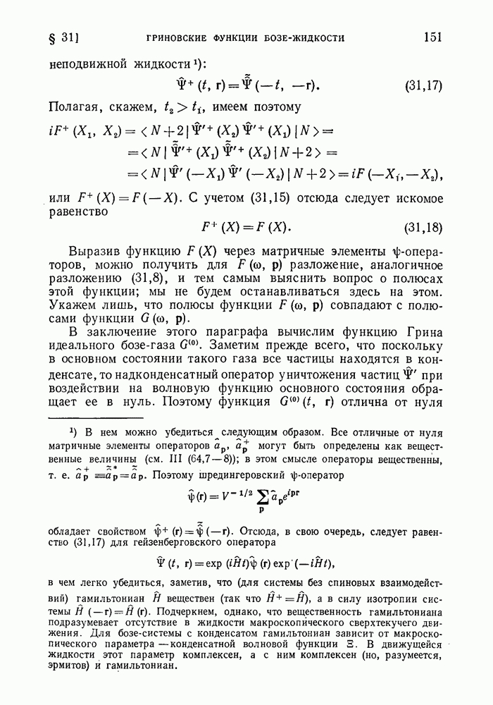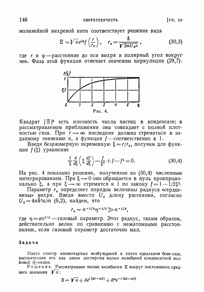 ГЛАВА III. СВЕРХТЕКУЧЕСТЬ§ 22. Элементарные возбуждения в квантовой бозе-жидкостиОбратимся теперь к изучению квантовых жидкостей с энергетическим спектром совершенно иного типа, который можно назвать бозевским. Этот спектр характеризуется тем, что элементарные возбуждения (отсутствующие в основном состоянии жидкости) могут появляться и исчезать поодиночке. Но момент импульса всякой квантовомеханической системы (в данном случае жидкости) может испытывать изменения лишь на целое число. Поэтому возникающие поодиночке элементарные возбуждения должны обладать целочисленным моментом и, следовательно, подчиняться статистике Бозе. Спектром такого типа должна во всяком случае обладать всякая квантовая жидкость, состоящая из частиц с целым спином (таков жидкий изотоп Напомним для сравнения, что в ферми-жидкости, при описании ее в терминах спектра элементарных возбуждений, отсутствующих в основном состоянии (см. конец § 1), эти возбуждения могут появляться или исчезать лишь парами. Именно с этим связана возможность элементарным возбуждениям в этом типе спектра иметь полуцелый спин. В квантовой бозе-жидкости элементарные возбуждения с малыми импульсами