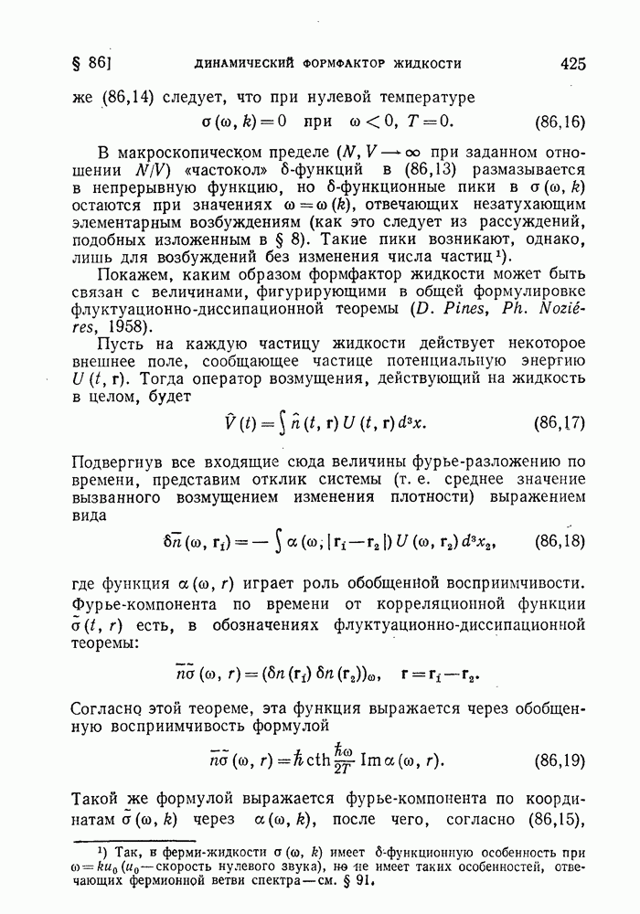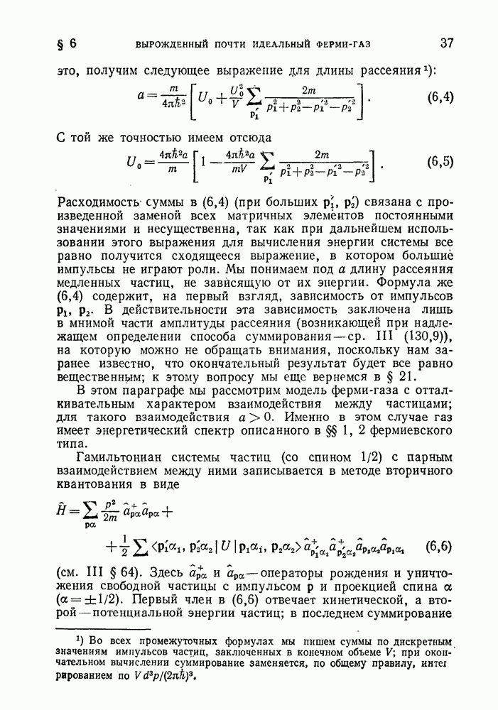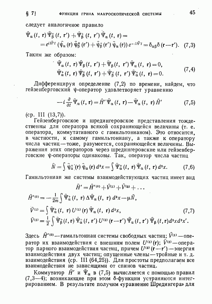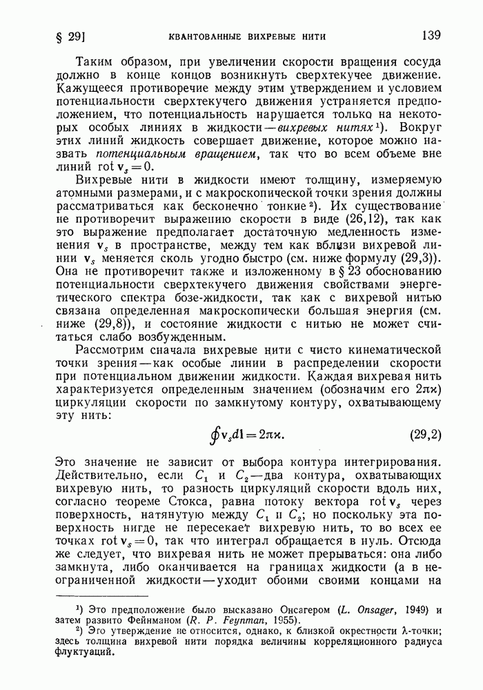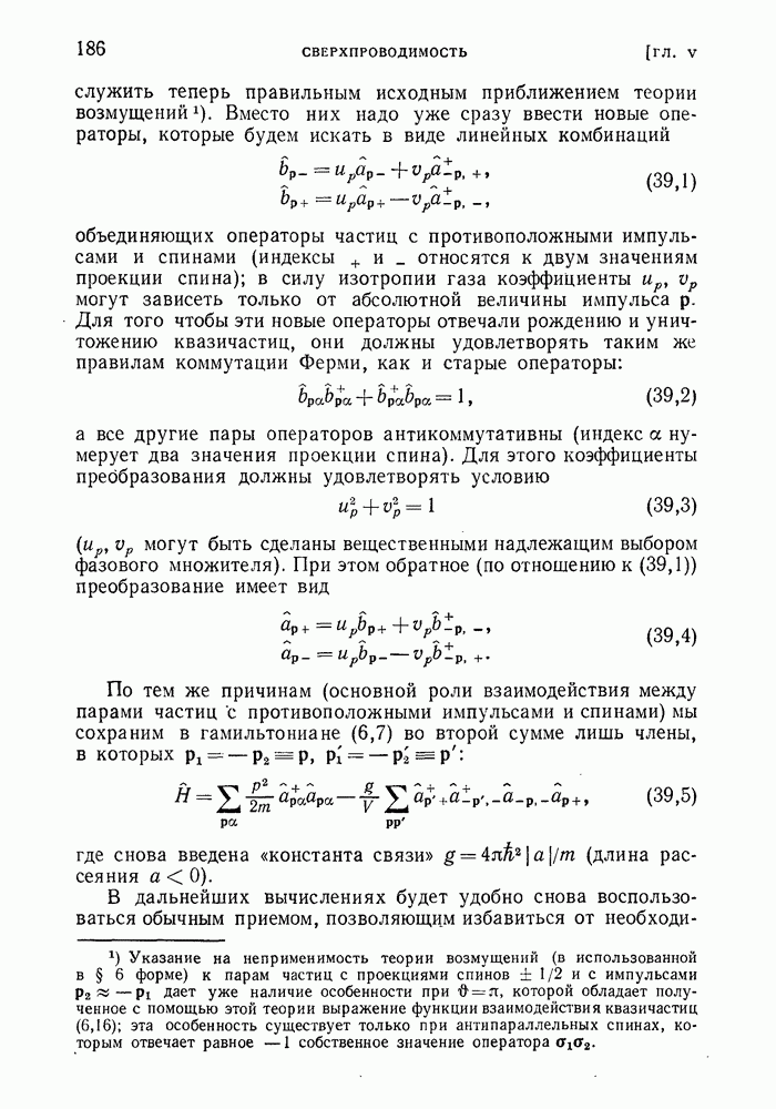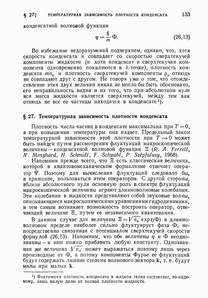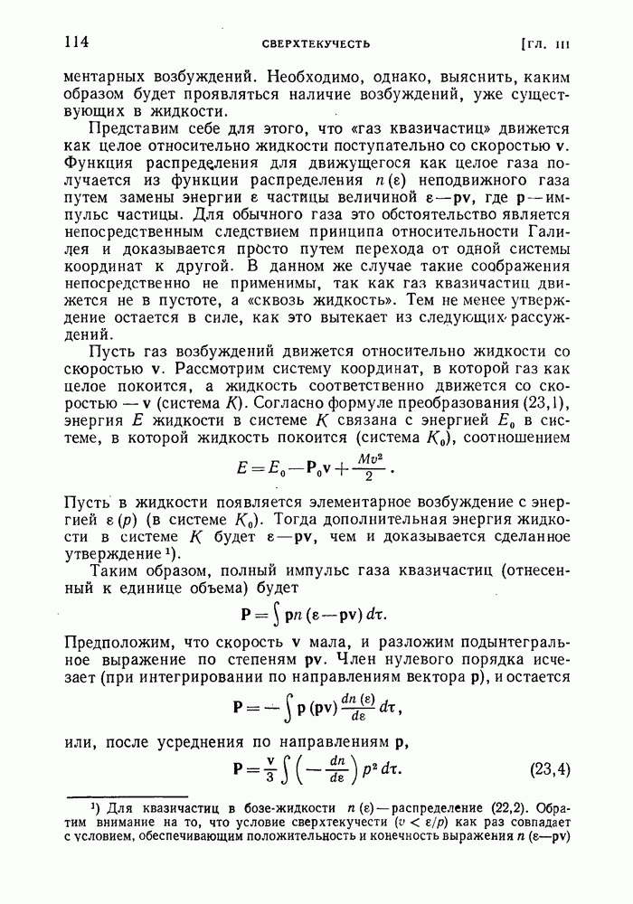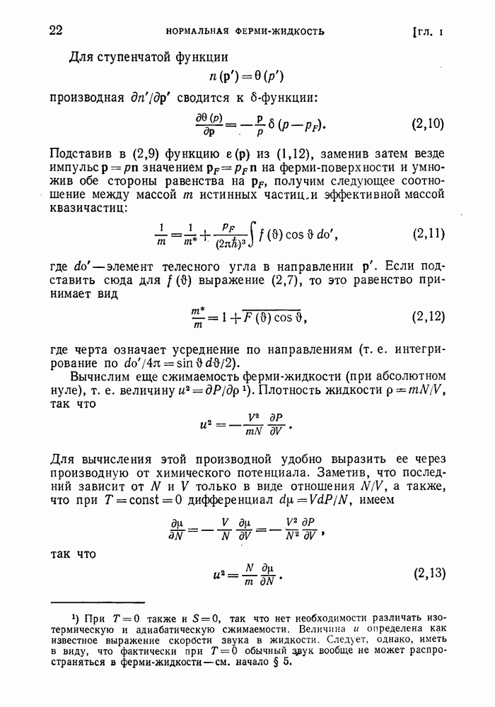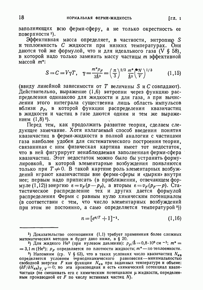 ГЛАВА III. СВЕРХТЕКУЧЕСТЬ§ 22. Элементарные возбуждения в квантовой бозе-жидкостиОбратимся теперь к изучению квантовых жидкостей с энергетическим спектром совершенно иного типа, который можно назвать бозевским. Этот спектр характеризуется тем, что элементарные возбуждения (отсутствующие в основном состоянии жидкости) могут появляться и исчезать поодиночке. Но момент импульса всякой квантовомеханической системы (в данном случае жидкости) может испытывать изменения лишь на целое число. Поэтому возникающие поодиночке элементарные возбуждения должны обладать целочисленным моментом и, следовательно, подчиняться статистике Бозе. Спектром такого типа должна во всяком случае обладать всякая квантовая жидкость, состоящая из частиц с целым спином (таков жидкий изотоп Напомним для сравнения, что в ферми-жидкости, при описании ее в терминах спектра элементарных возбуждений, отсутствующих в основном состоянии (см. конец § 1), эти возбуждения могут появляться или исчезать лишь парами. Именно с этим связана возможность элементарным возбуждениям в этом типе спектра иметь полуцелый спин. В квантовой бозе-жидкости элементарные возбуждения с малыми импульсами