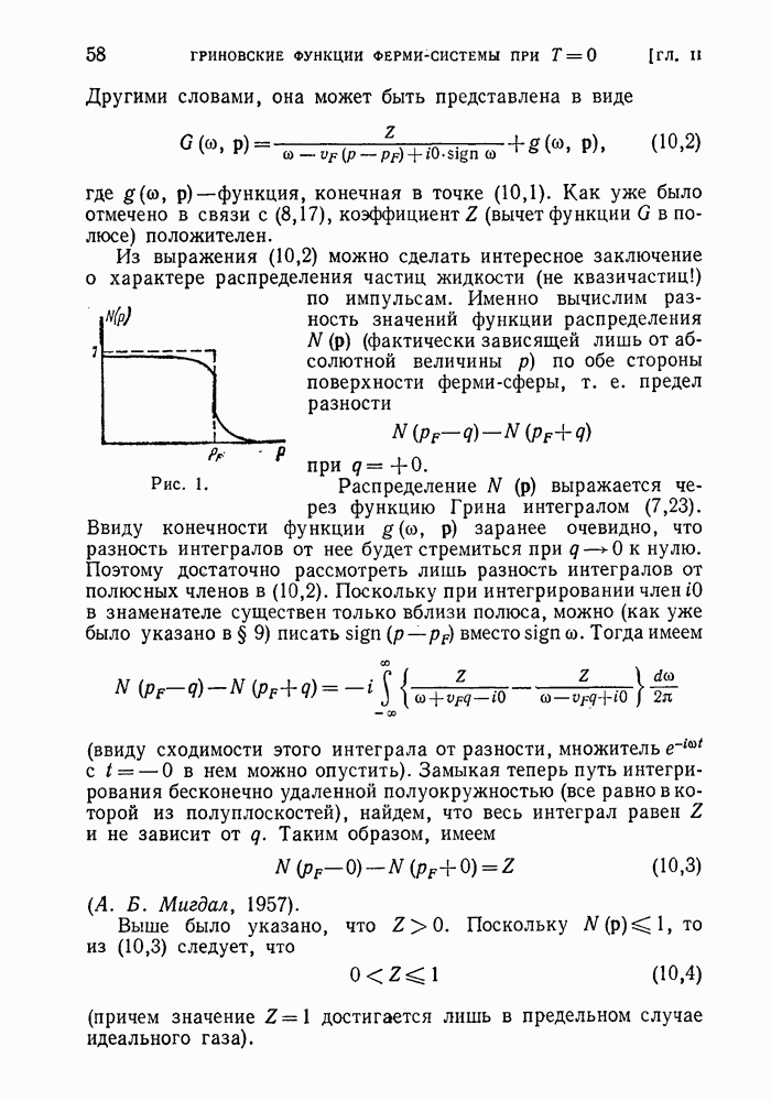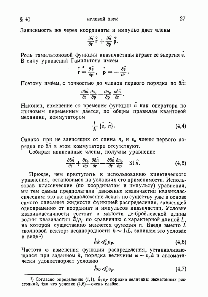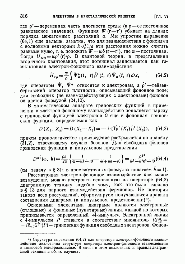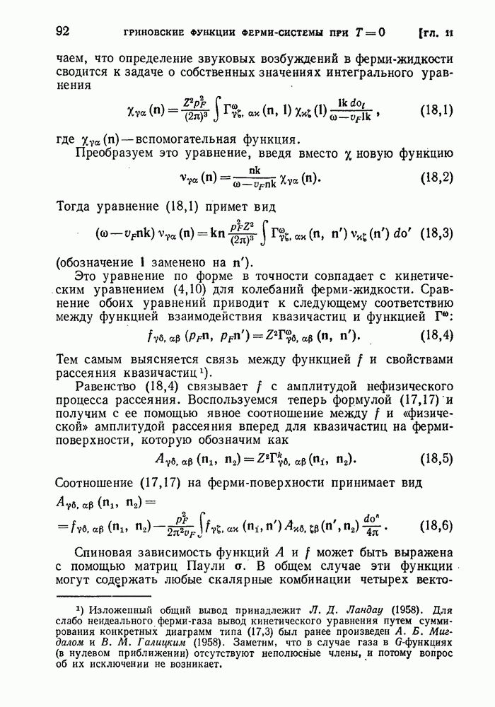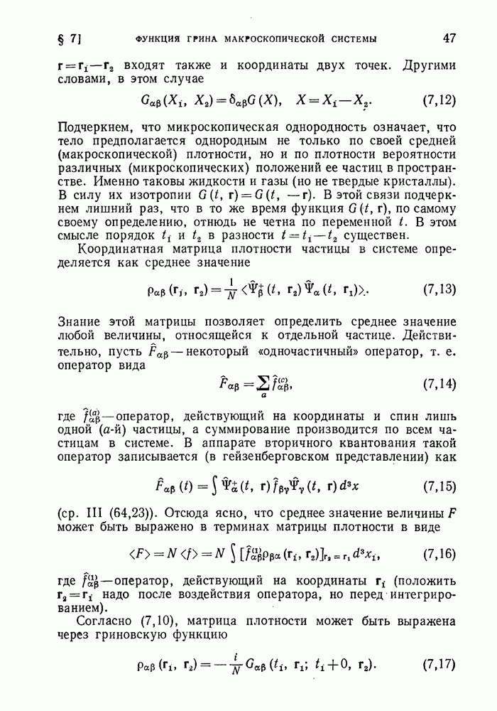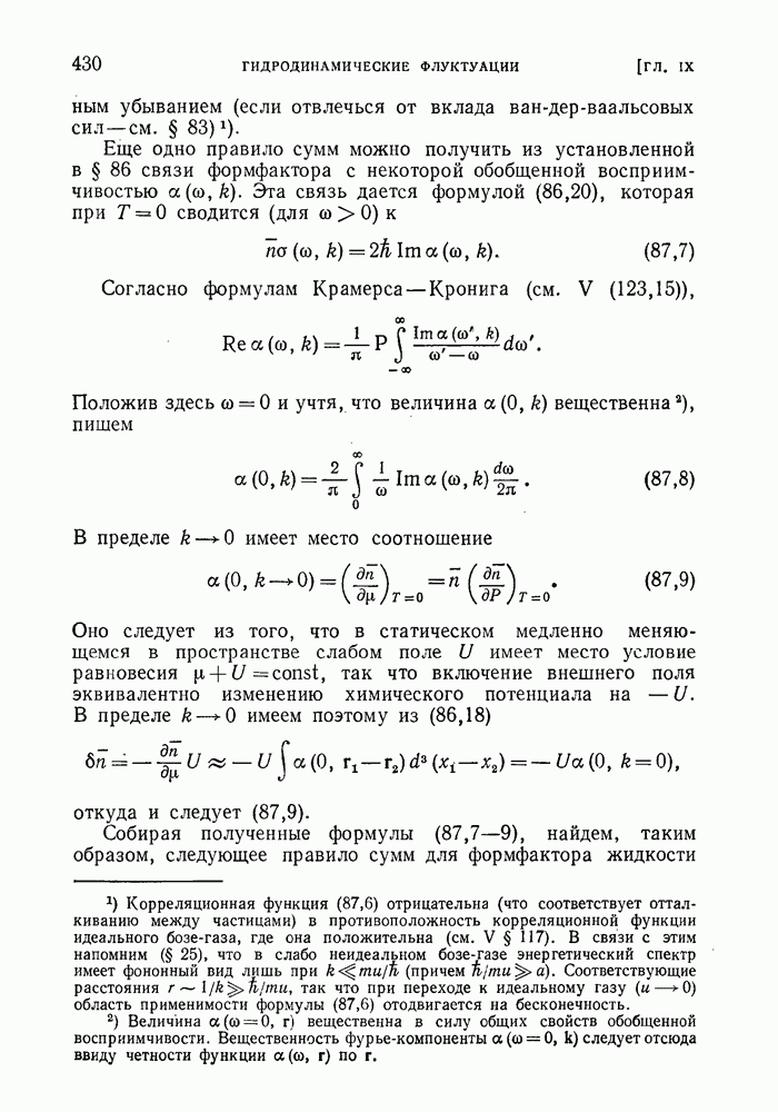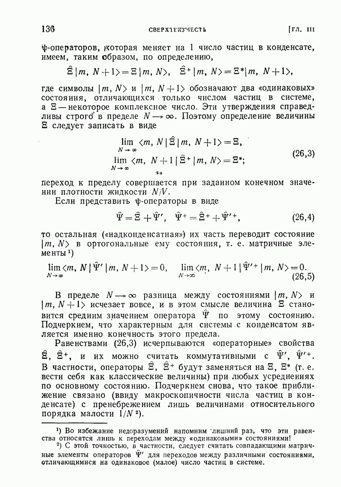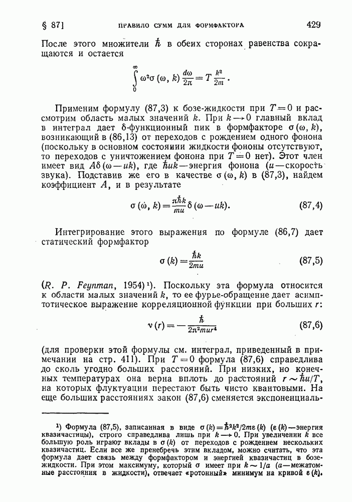 ГЛАВА III. СВЕРХТЕКУЧЕСТЬ§ 22. Элементарные возбуждения в квантовой бозе-жидкостиОбратимся теперь к изучению квантовых жидкостей с энергетическим спектром совершенно иного типа, который можно назвать бозевским. Этот спектр характеризуется тем, что элементарные возбуждения (отсутствующие в основном состоянии жидкости) могут появляться и исчезать поодиночке. Но момент импульса всякой квантовомеханической системы (в данном случае жидкости) может испытывать изменения лишь на целое число. Поэтому возникающие поодиночке элементарные возбуждения должны обладать целочисленным моментом и, следовательно, подчиняться статистике Бозе. Спектром такого типа должна во всяком случае обладать всякая квантовая жидкость, состоящая из частиц с целым спином (таков жидкий изотоп Напомним для сравнения, что в ферми-жидкости, при описании ее в терминах спектра элементарных возбуждений, отсутствующих в основном состоянии (см. конец § 1), эти возбуждения могут появляться или исчезать лишь парами. Именно с этим связана возможность элементарным возбуждениям в этом типе спектра иметь полуцелый спин. В квантовой бозе-жидкости элементарные возбуждения с малыми импульсами